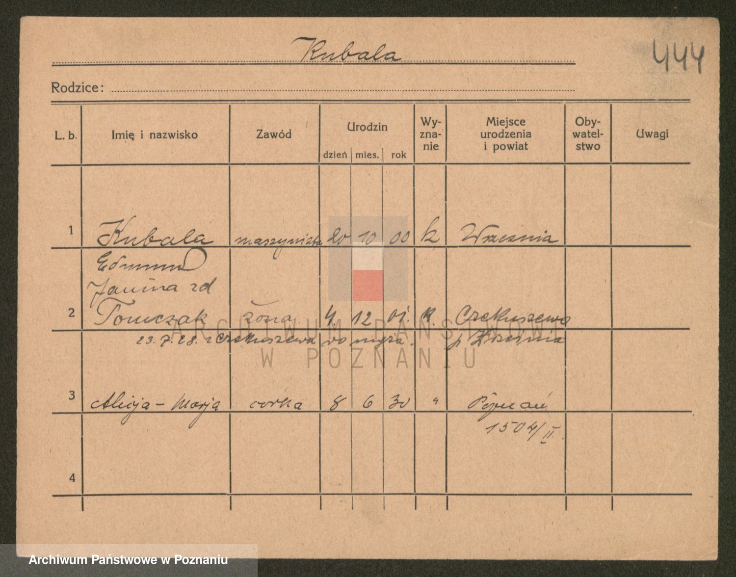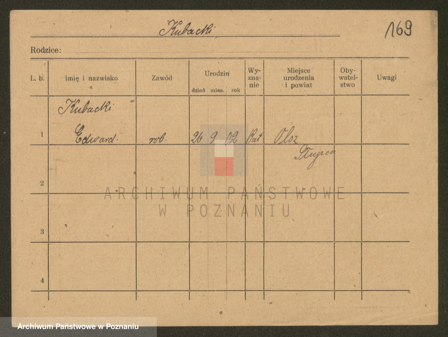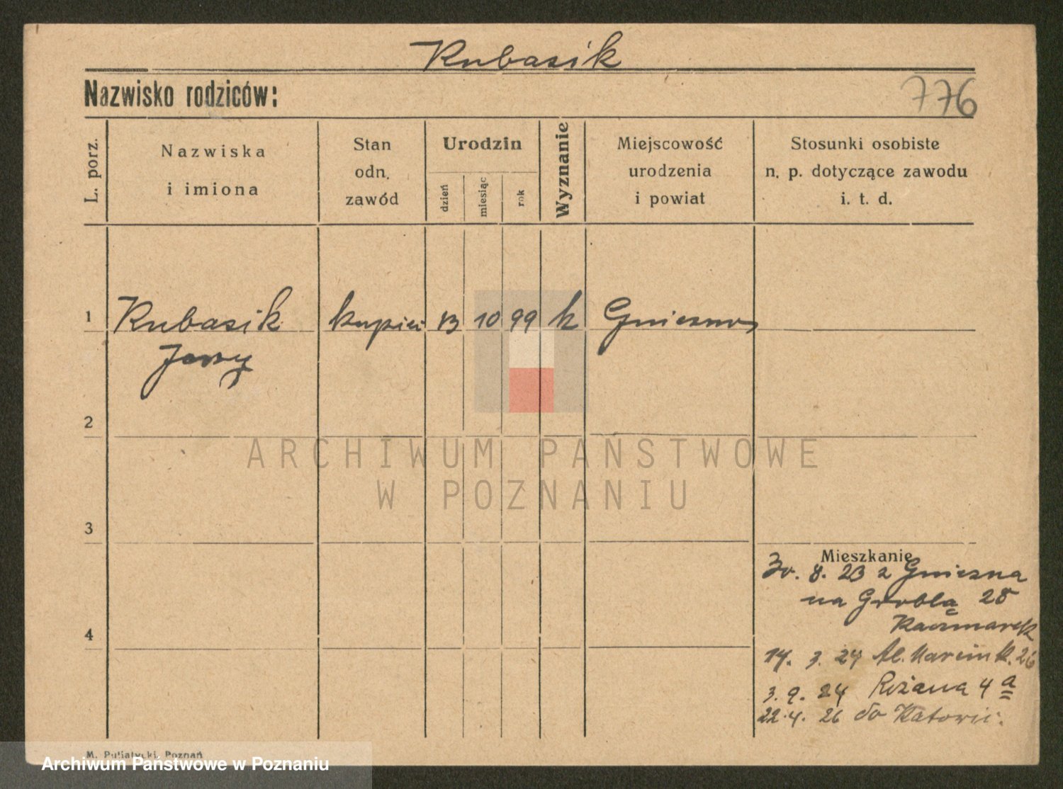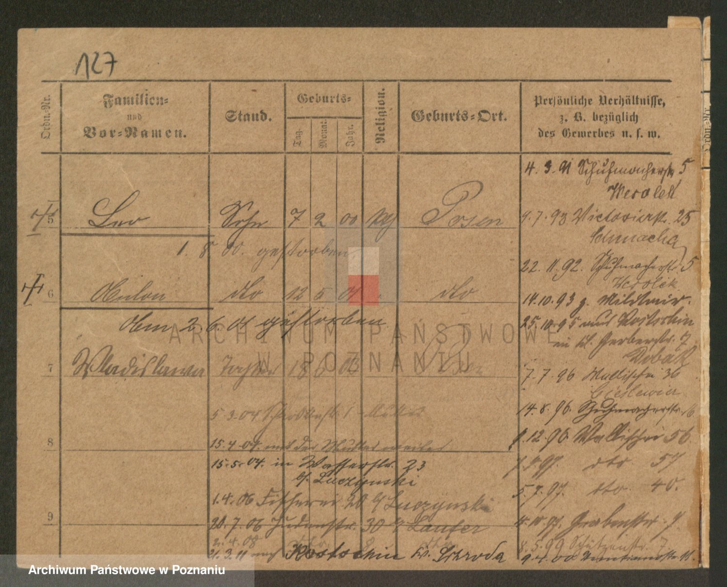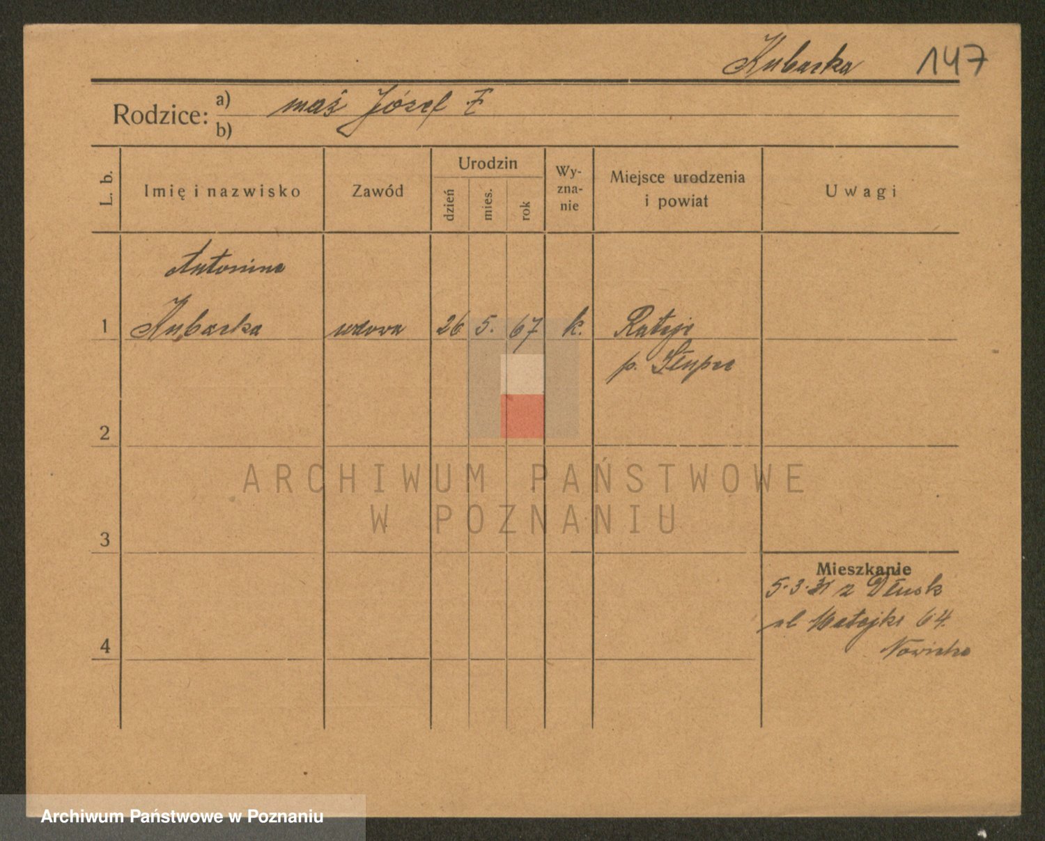 Podgląd karty osobowej dostępny jest po kliknięciu na nazwisko lub ikonkę karty. Można dokonywać powiększenia (ikony na górze) lub przechodzić między kolejnymi skanami (strzałki po bokach).