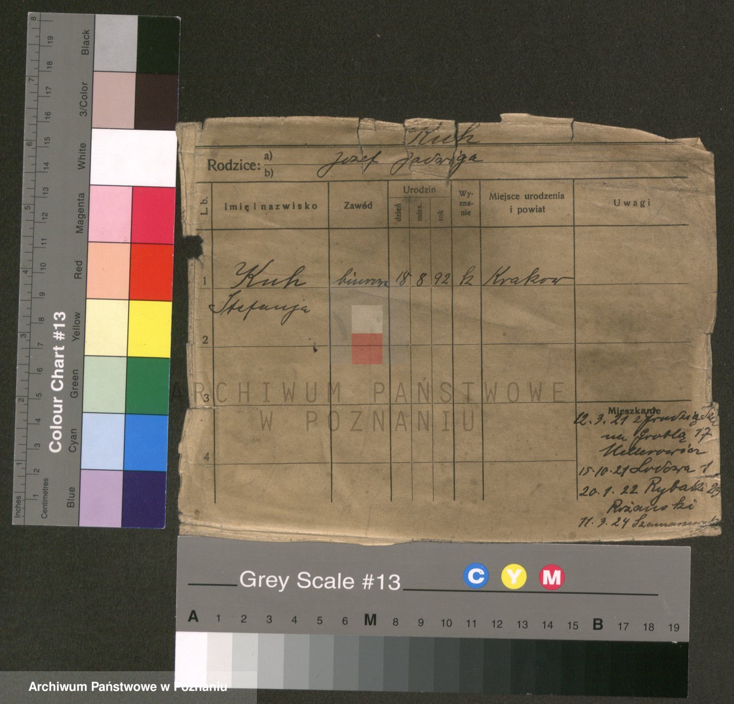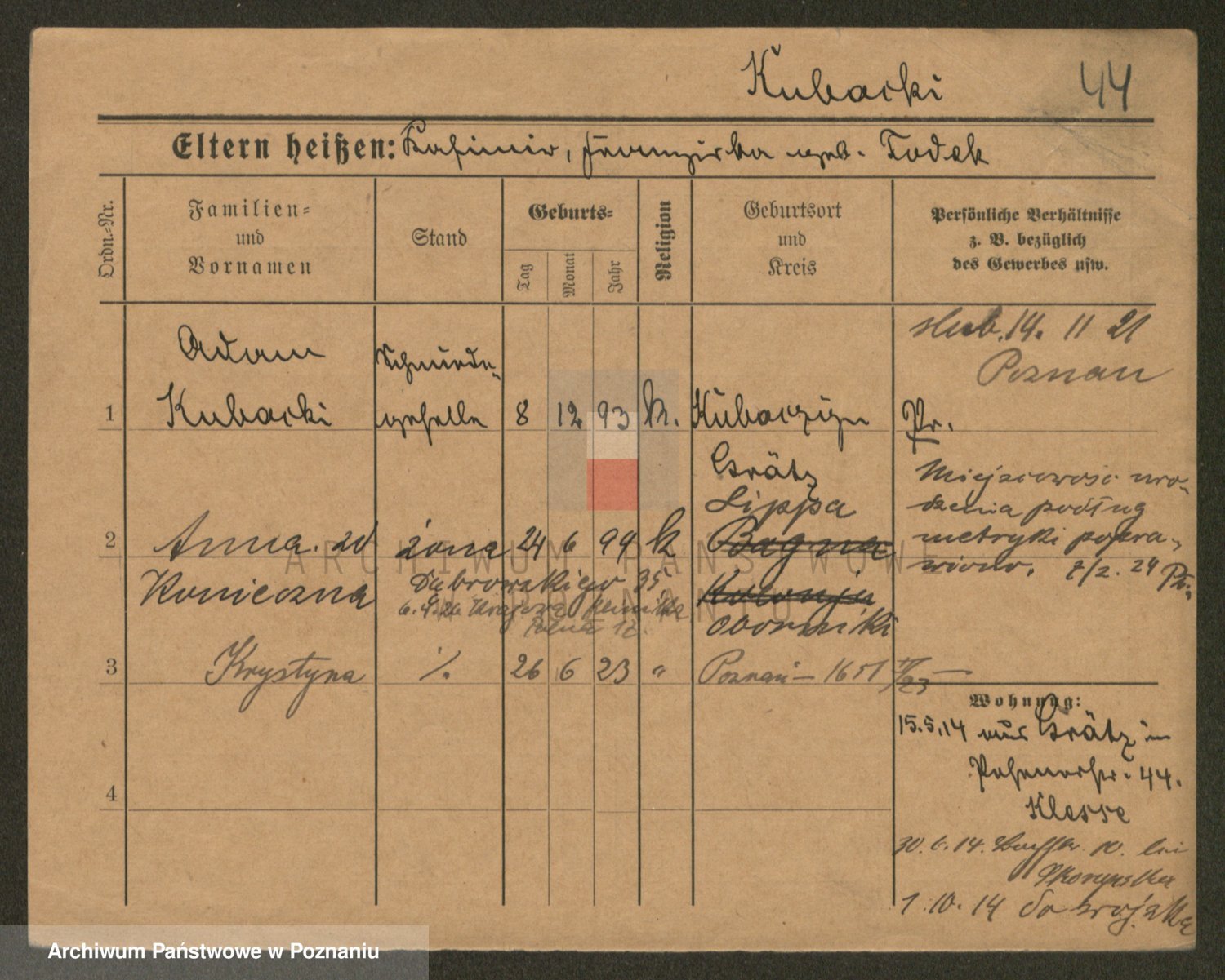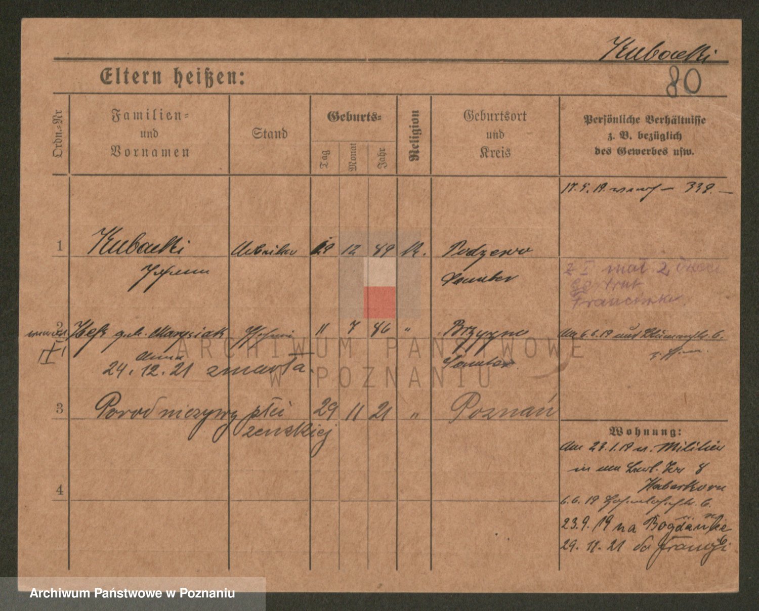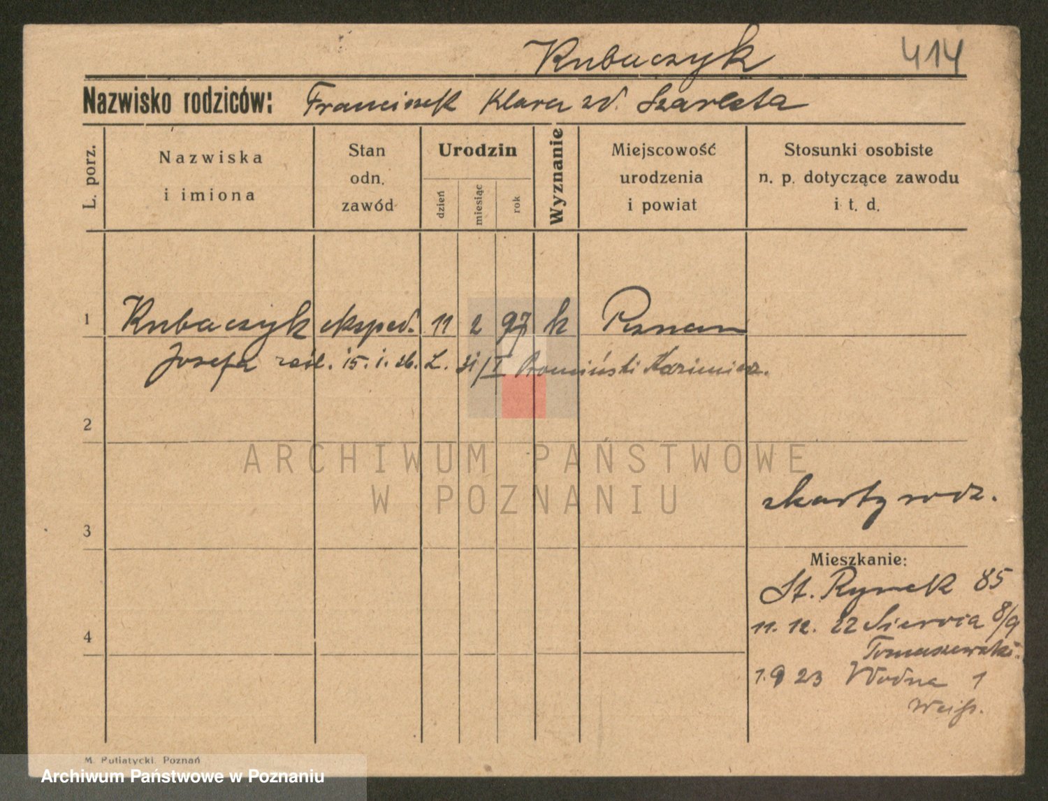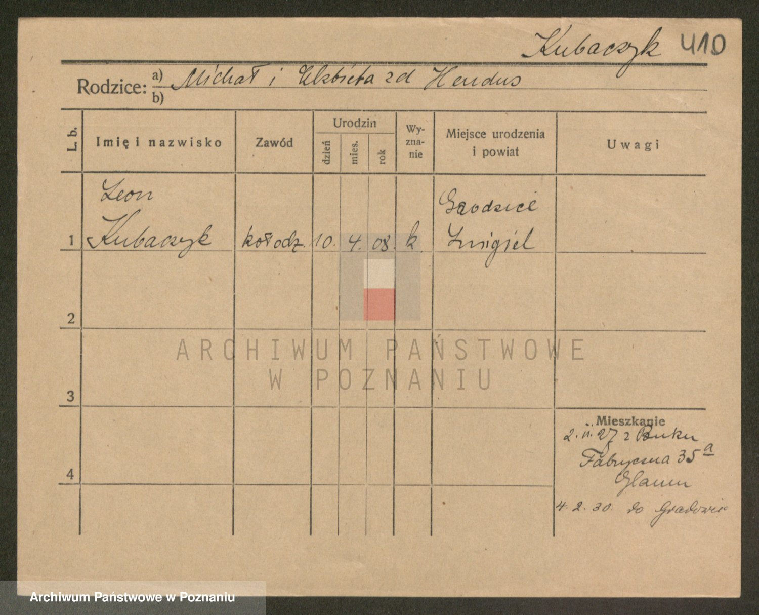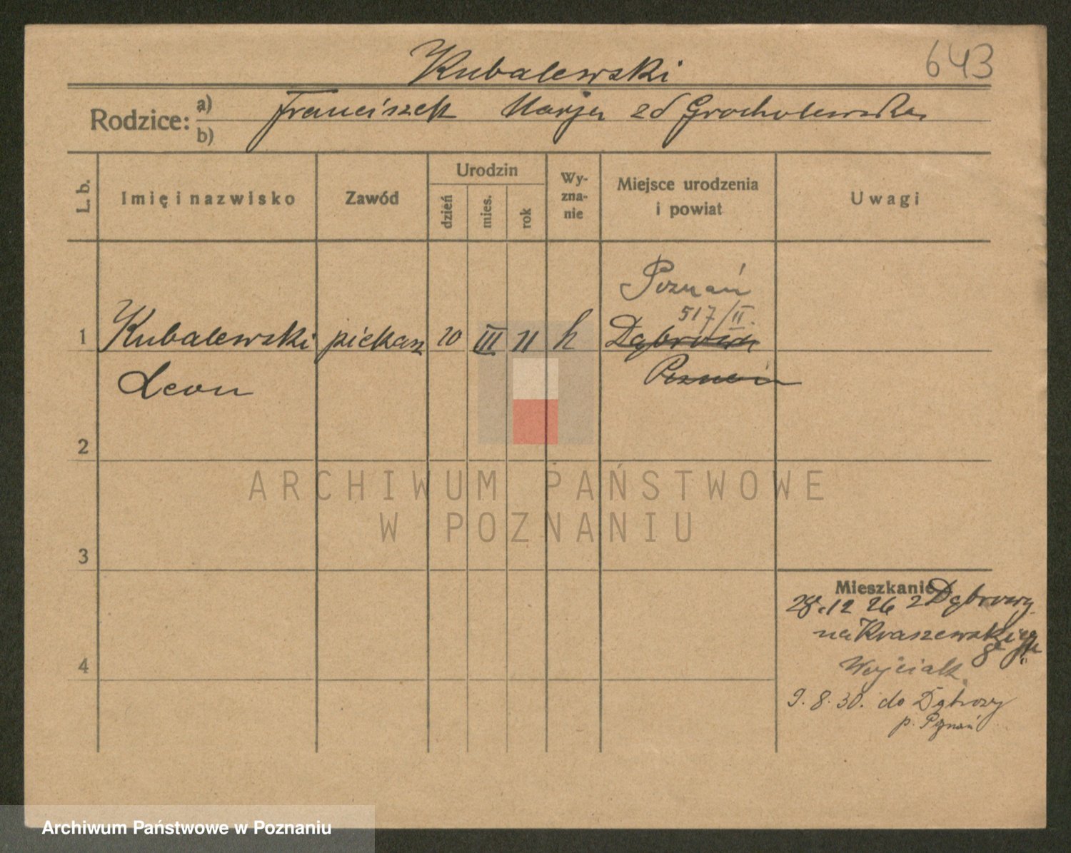 Podgląd karty osobowej dostępny jest po kliknięciu na nazwisko lub ikonkę karty. Można dokonywać powiększenia (ikony na górze) lub przechodzić między kolejnymi skanami (strzałki po bokach).