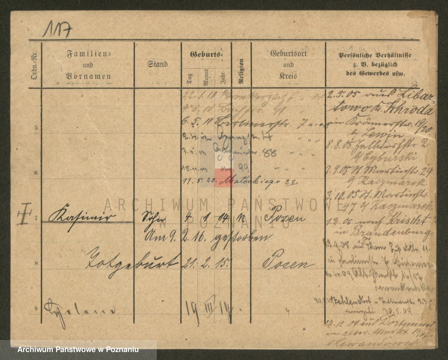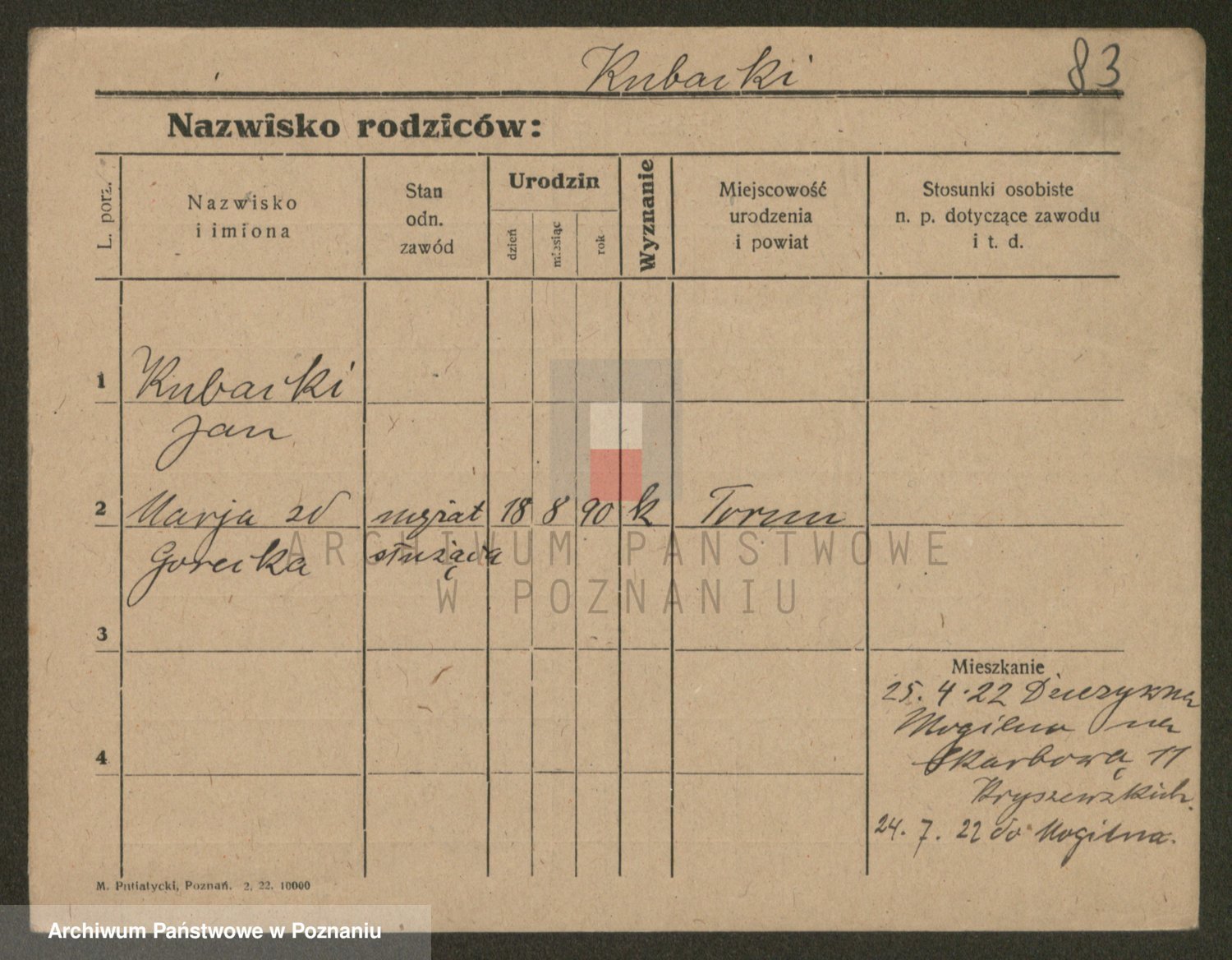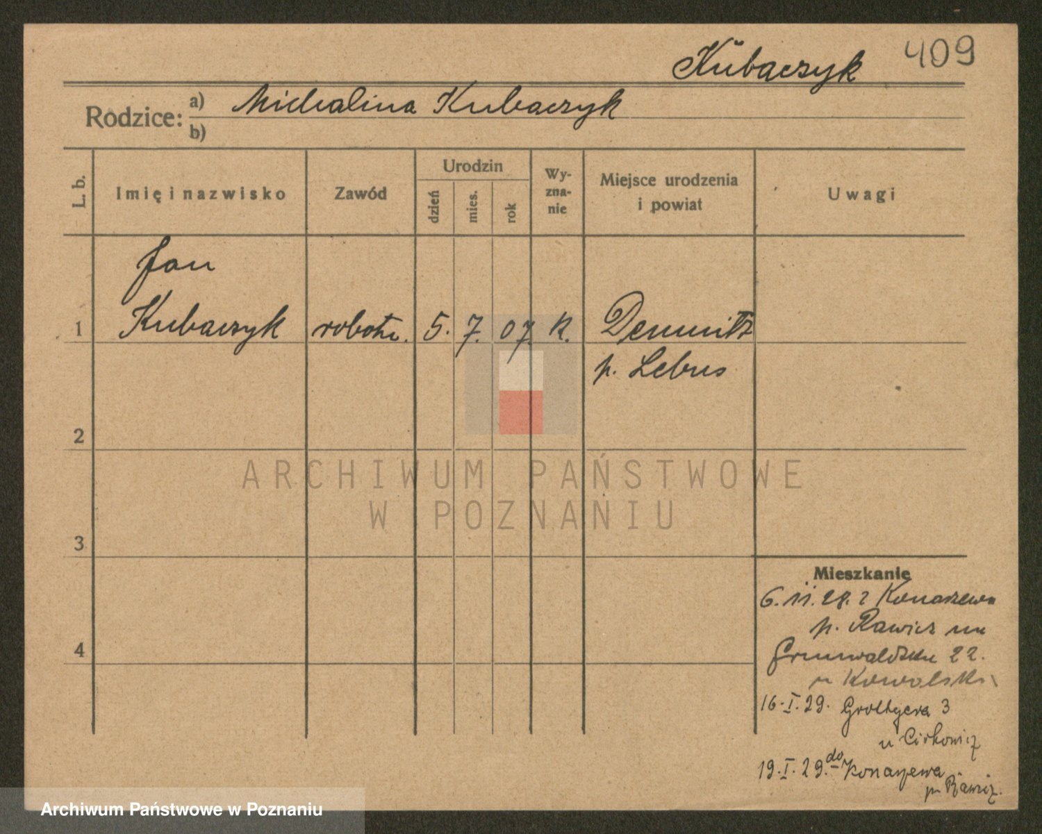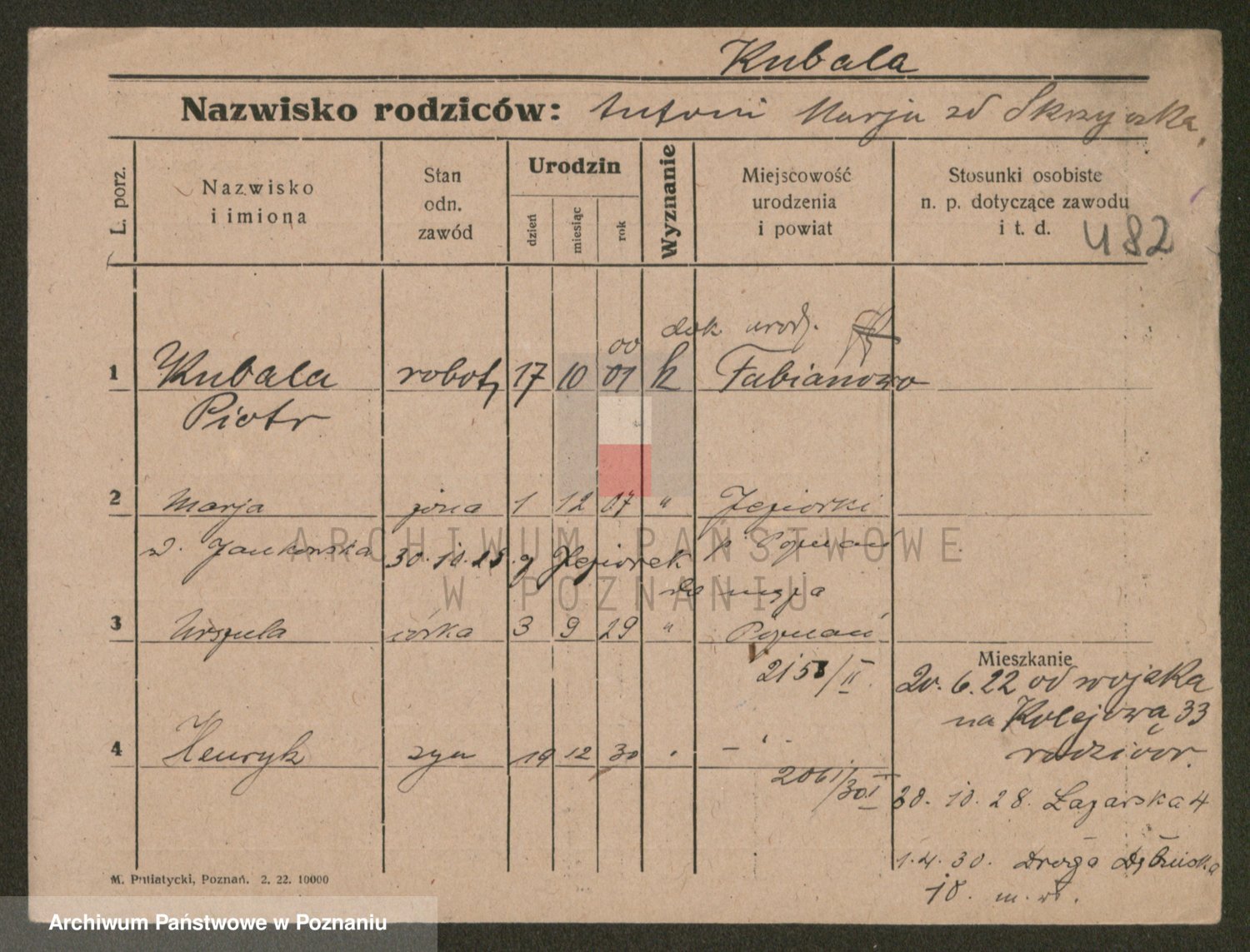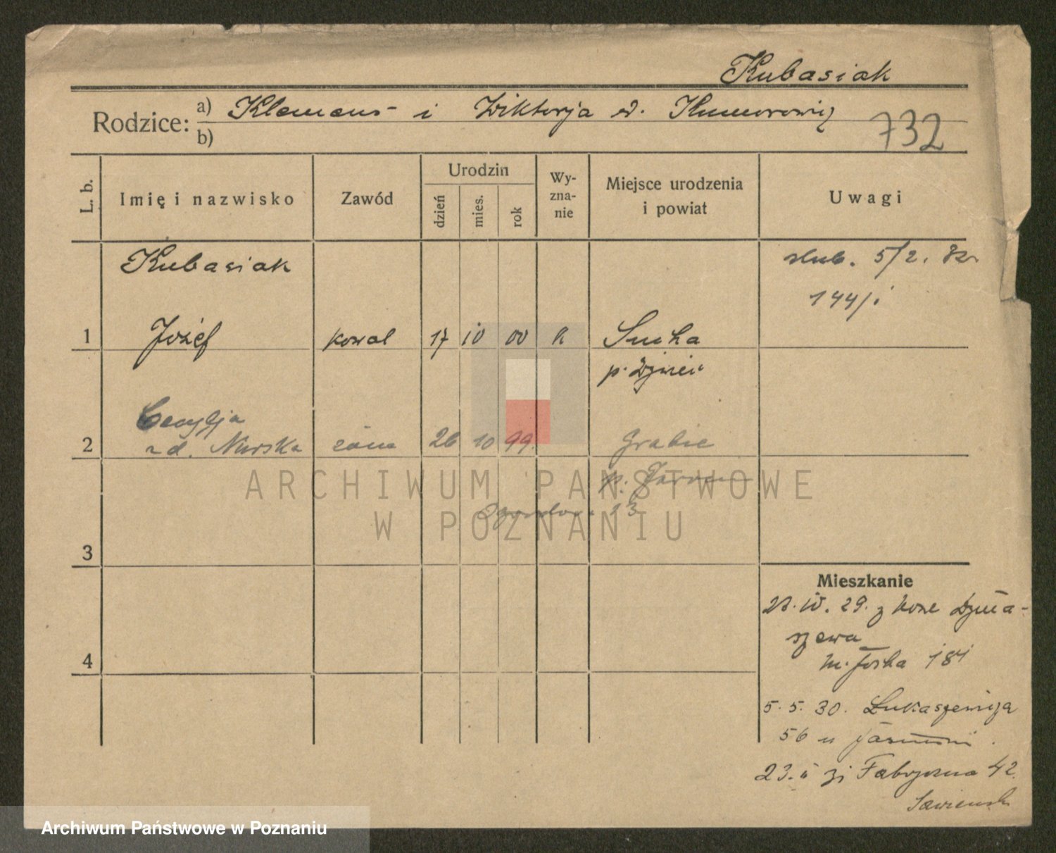 Podgląd karty osobowej dostępny jest po kliknięciu na nazwisko lub ikonkę karty. Można dokonywać powiększenia (ikony na górze) lub przechodzić między kolejnymi skanami (strzałki po bokach).