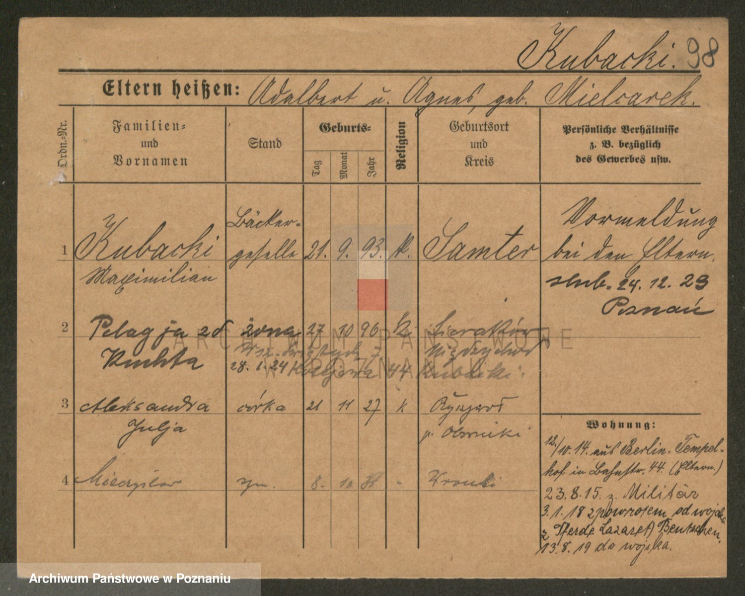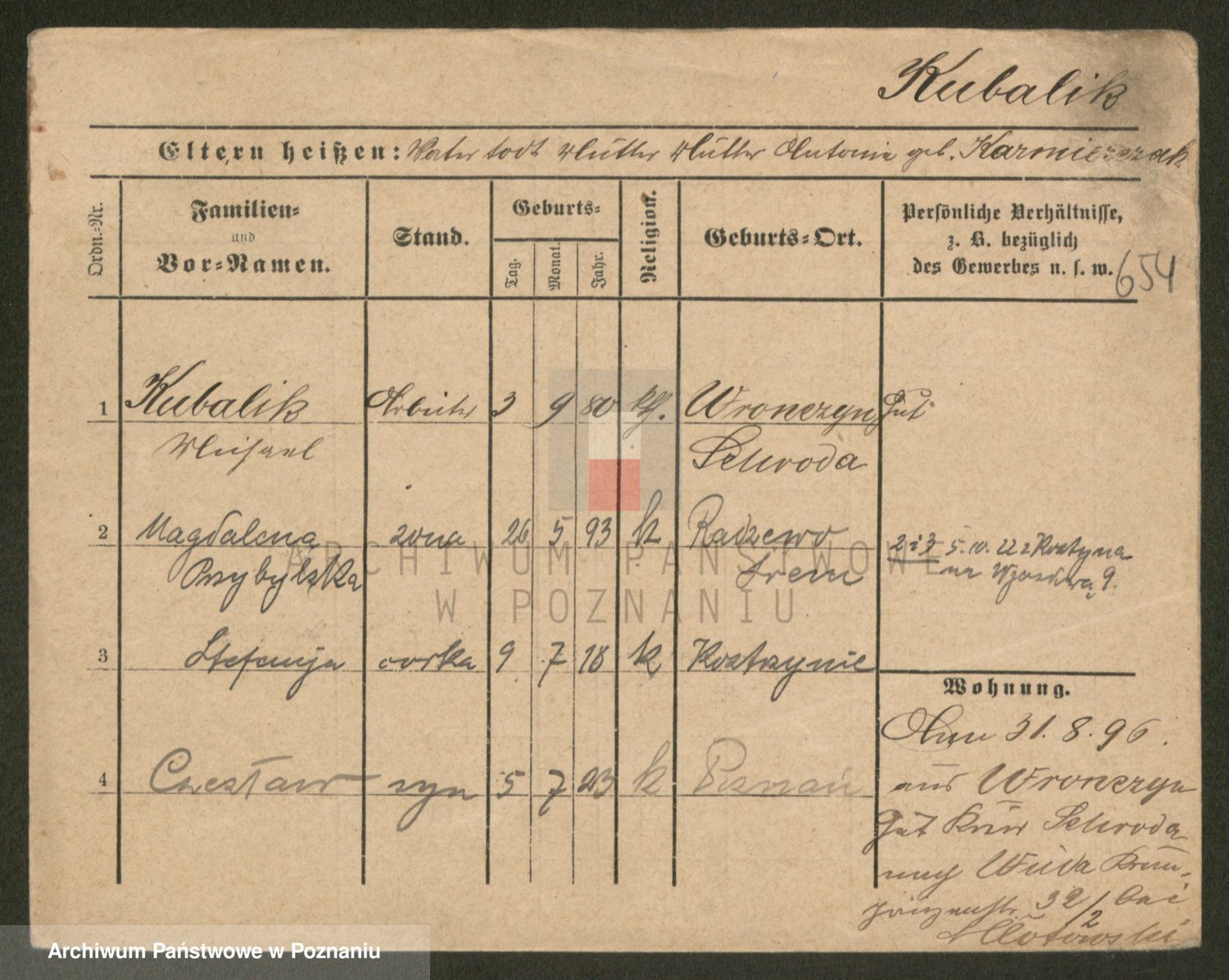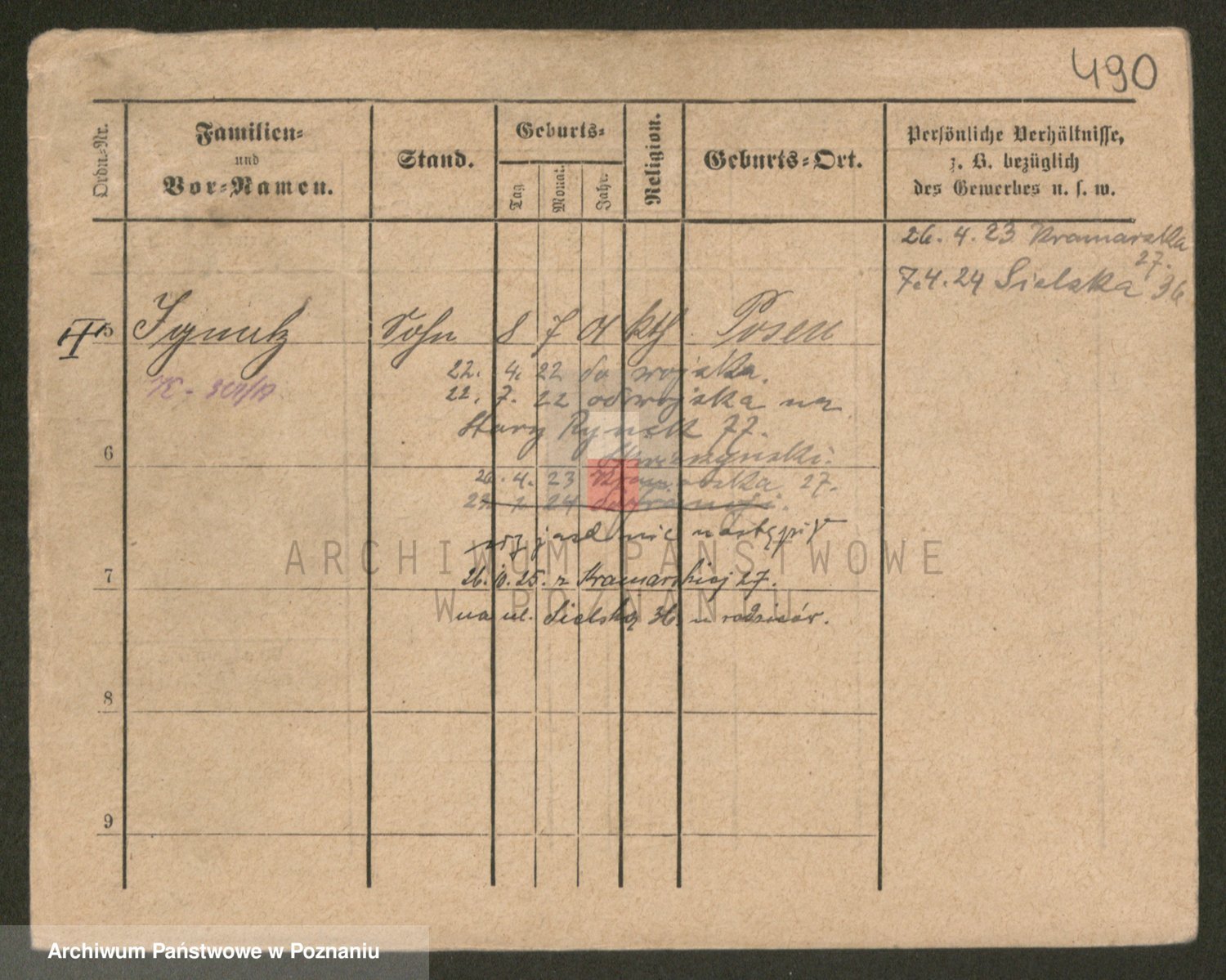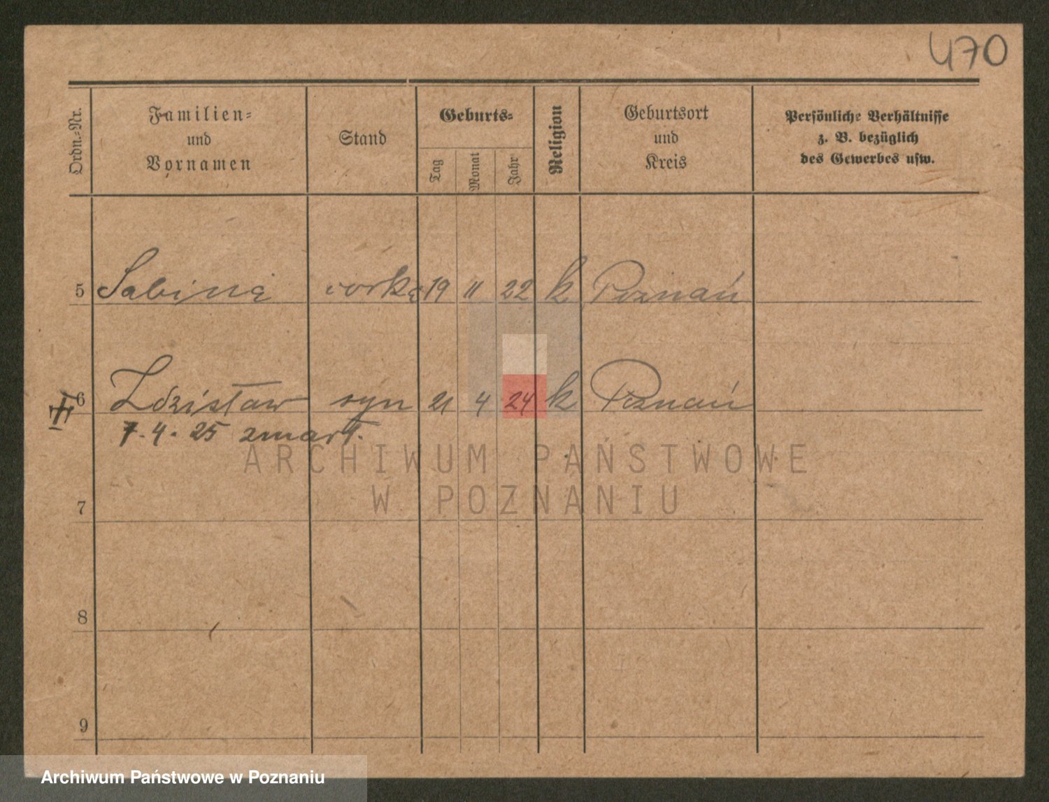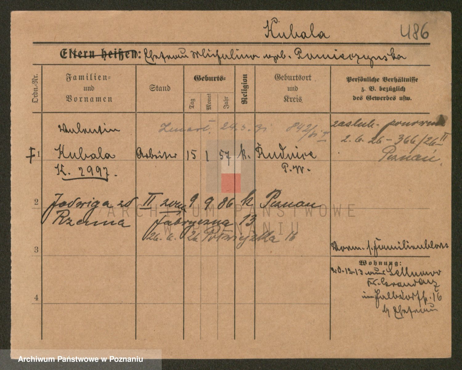 Podgląd karty osobowej dostępny jest po kliknięciu na nazwisko lub ikonkę karty. Można dokonywać powiększenia (ikony na górze) lub przechodzić między kolejnymi skanami (strzałki po bokach).