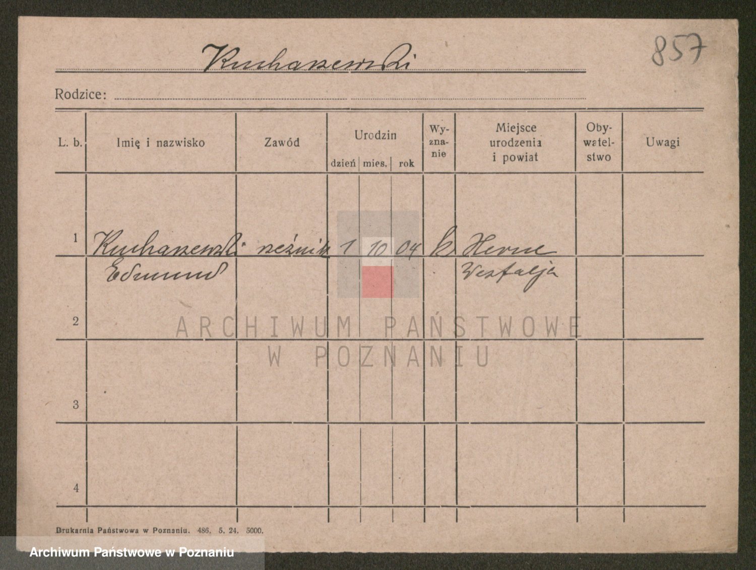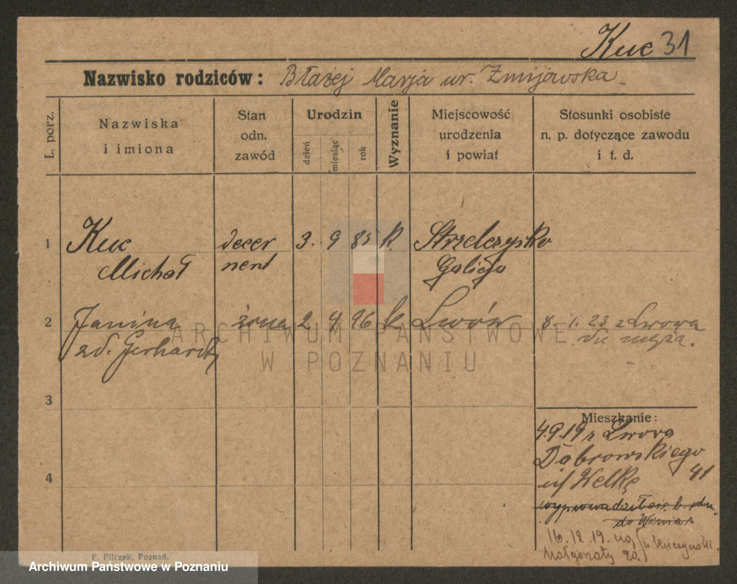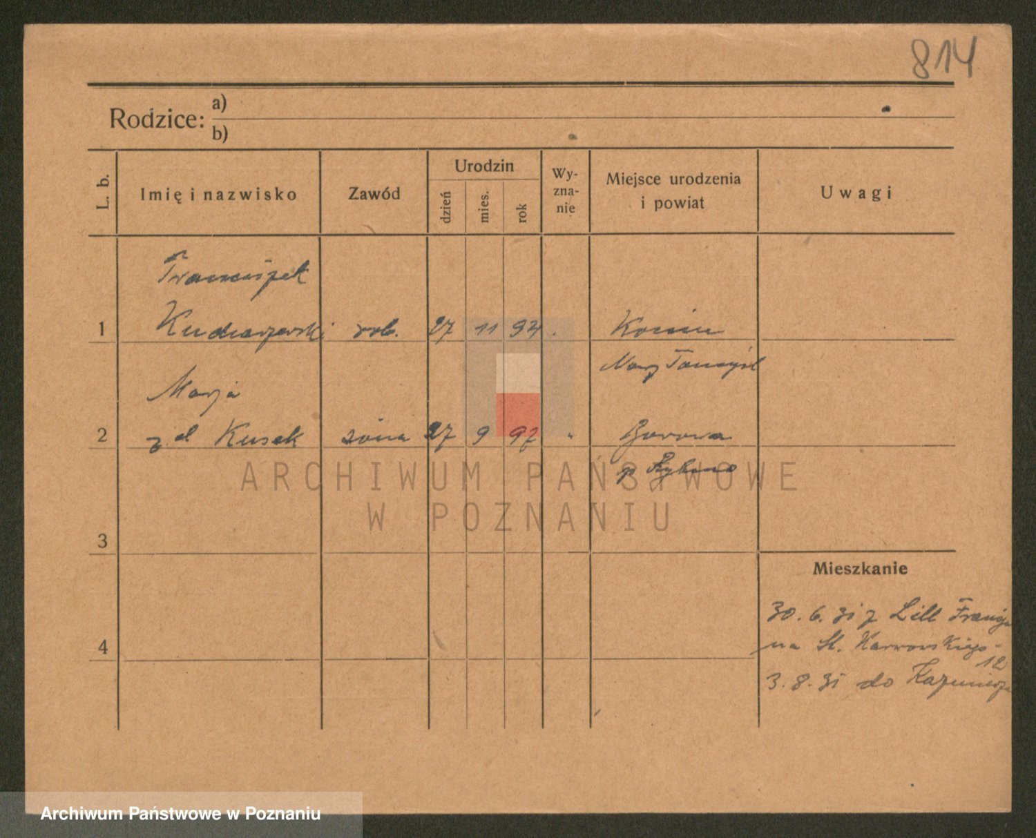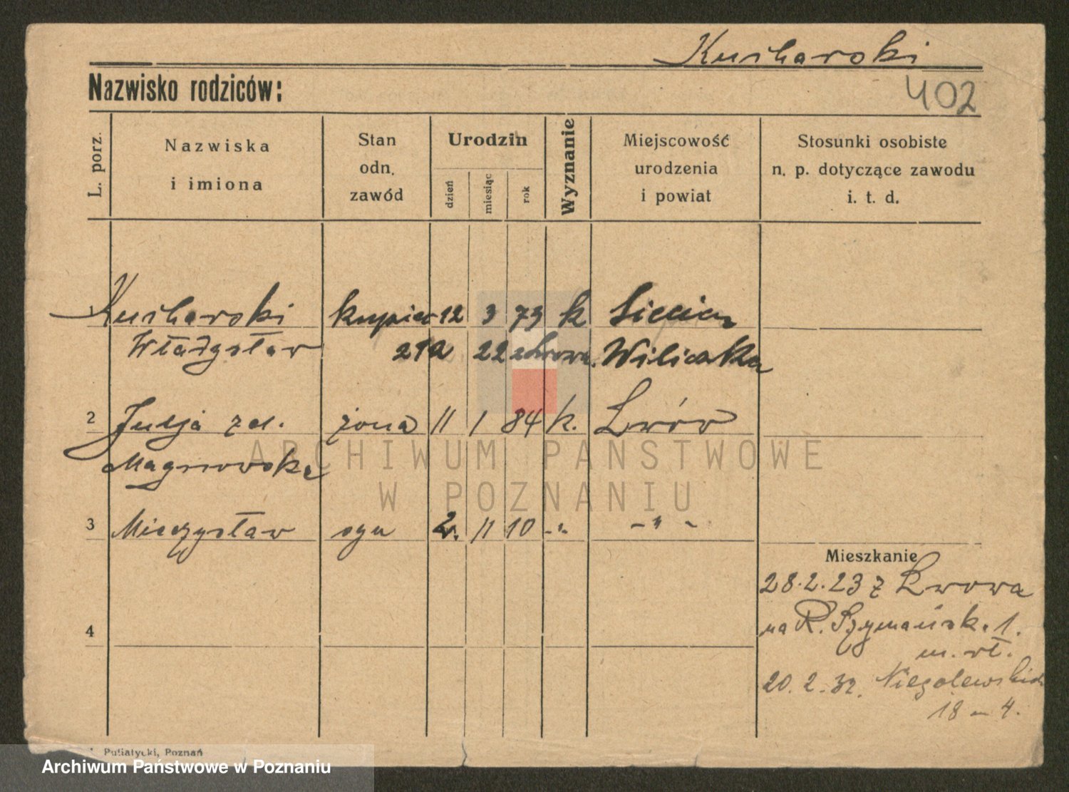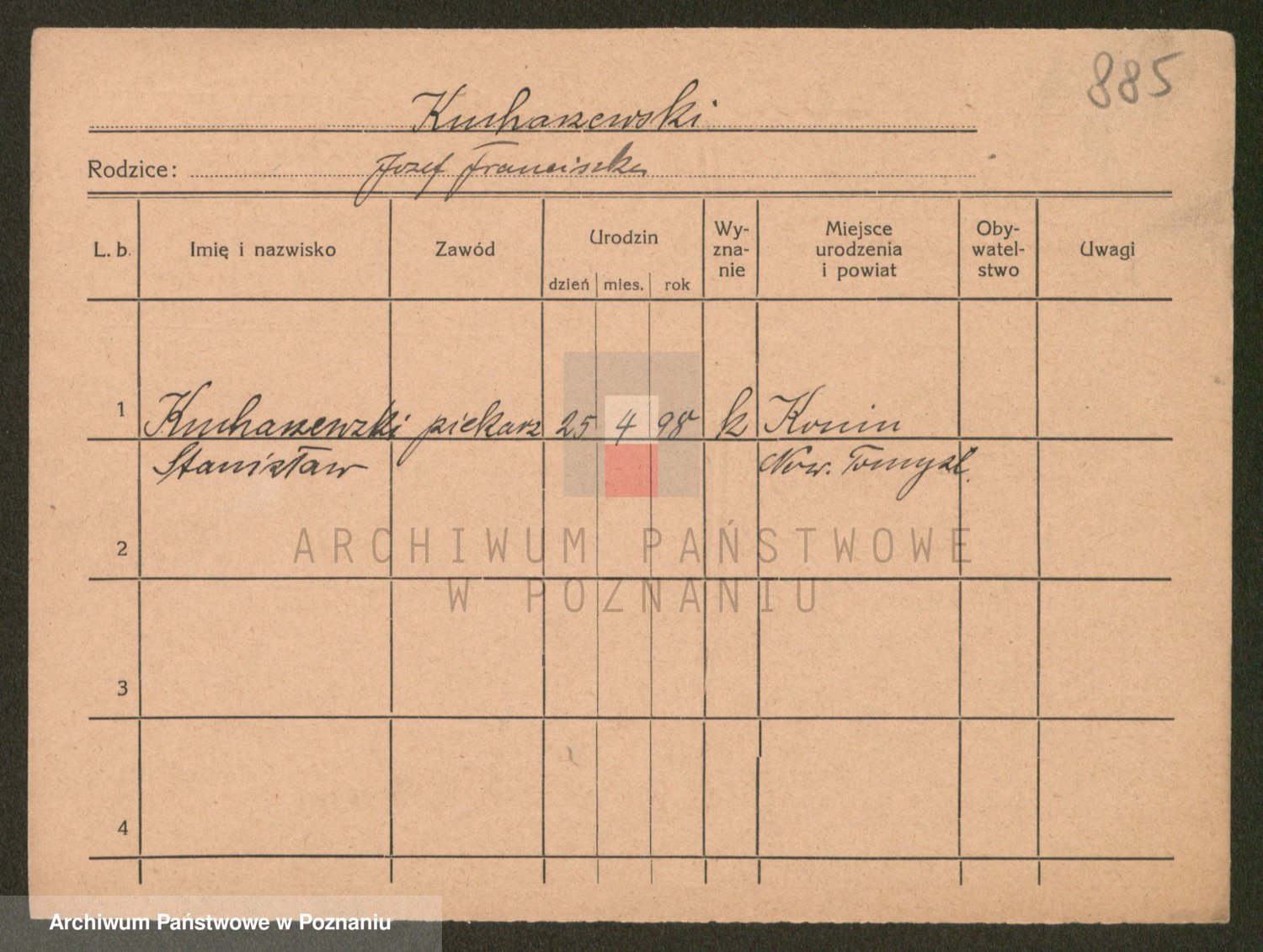 Podgląd karty osobowej dostępny jest po kliknięciu na nazwisko lub ikonkę karty. Można dokonywać powiększenia (ikony na górze) lub przechodzić między kolejnymi skanami (strzałki po bokach).