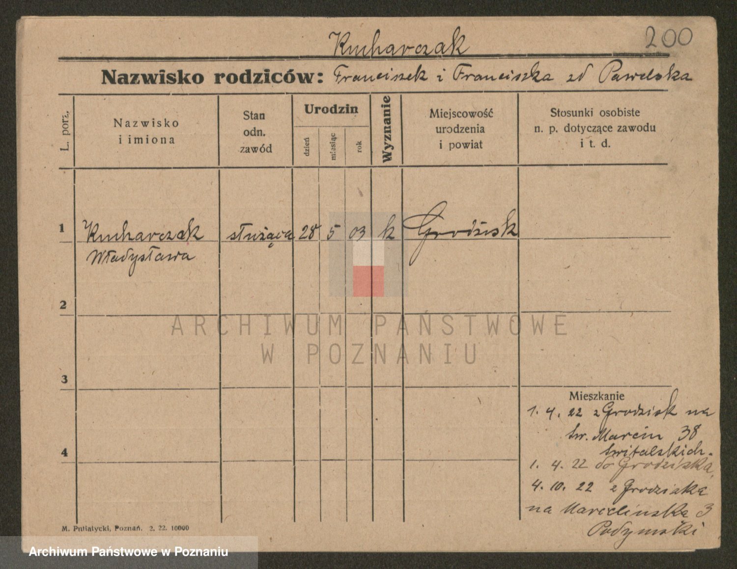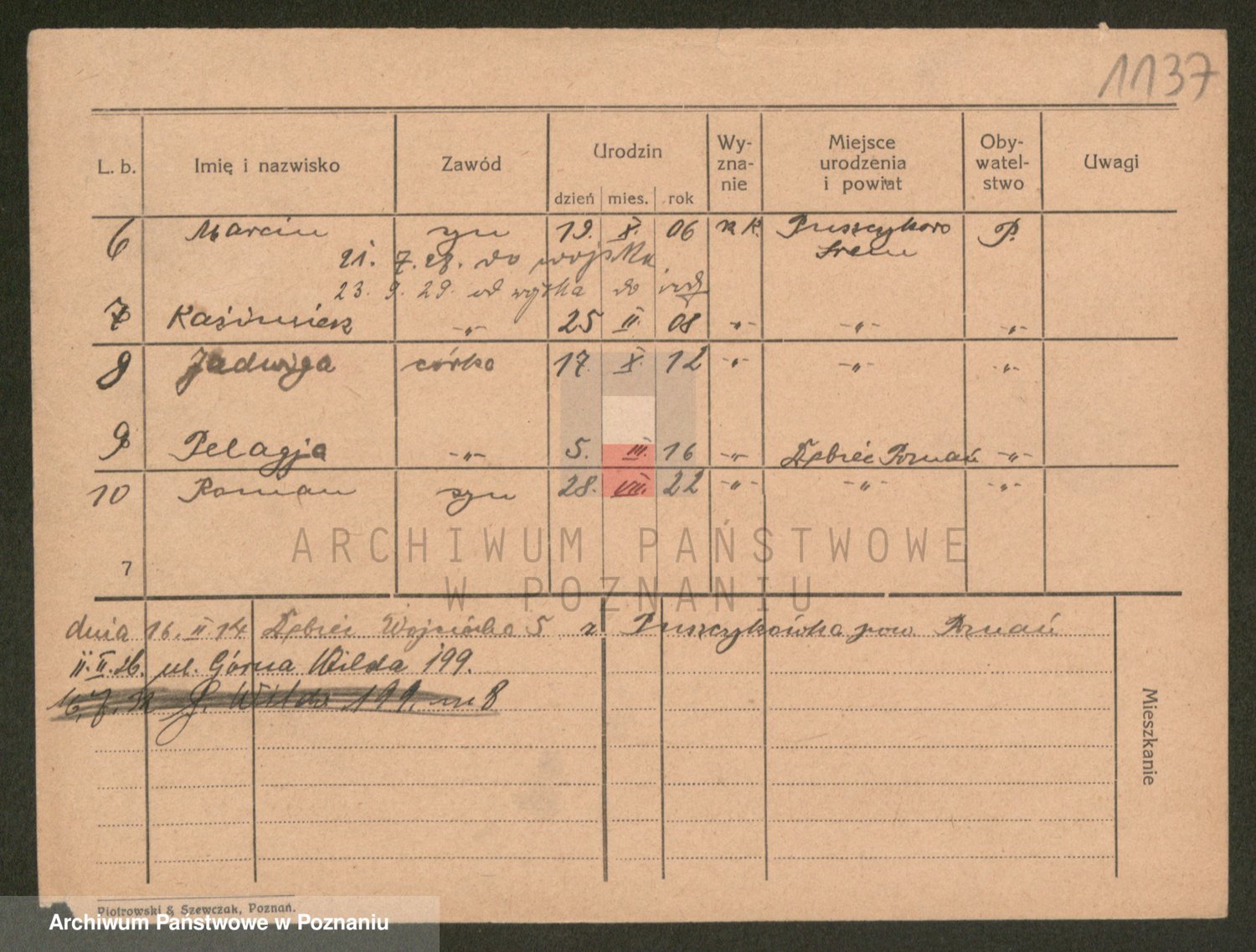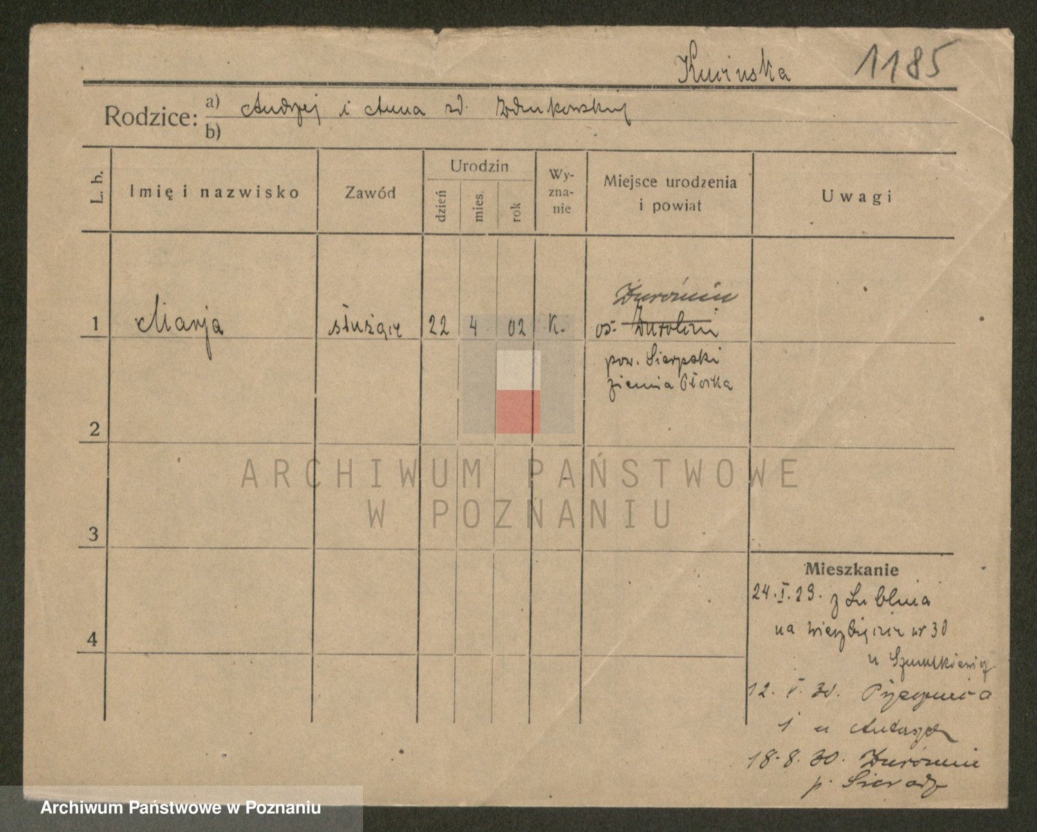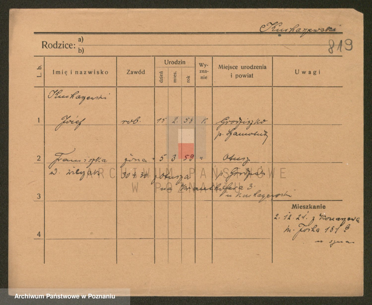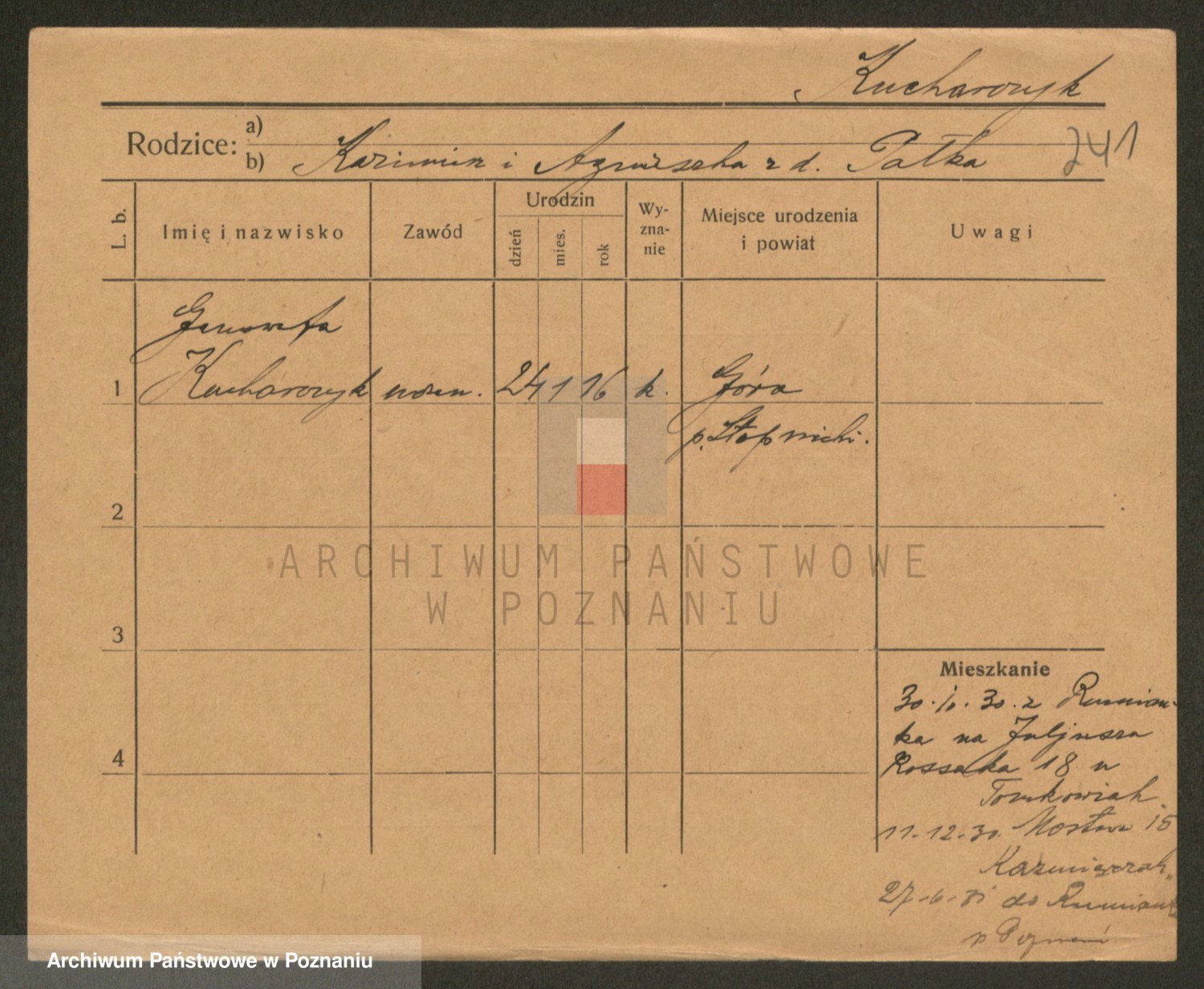 Podgląd karty osobowej dostępny jest po kliknięciu na nazwisko lub ikonkę karty. Można dokonywać powiększenia (ikony na górze) lub przechodzić między kolejnymi skanami (strzałki po bokach).
