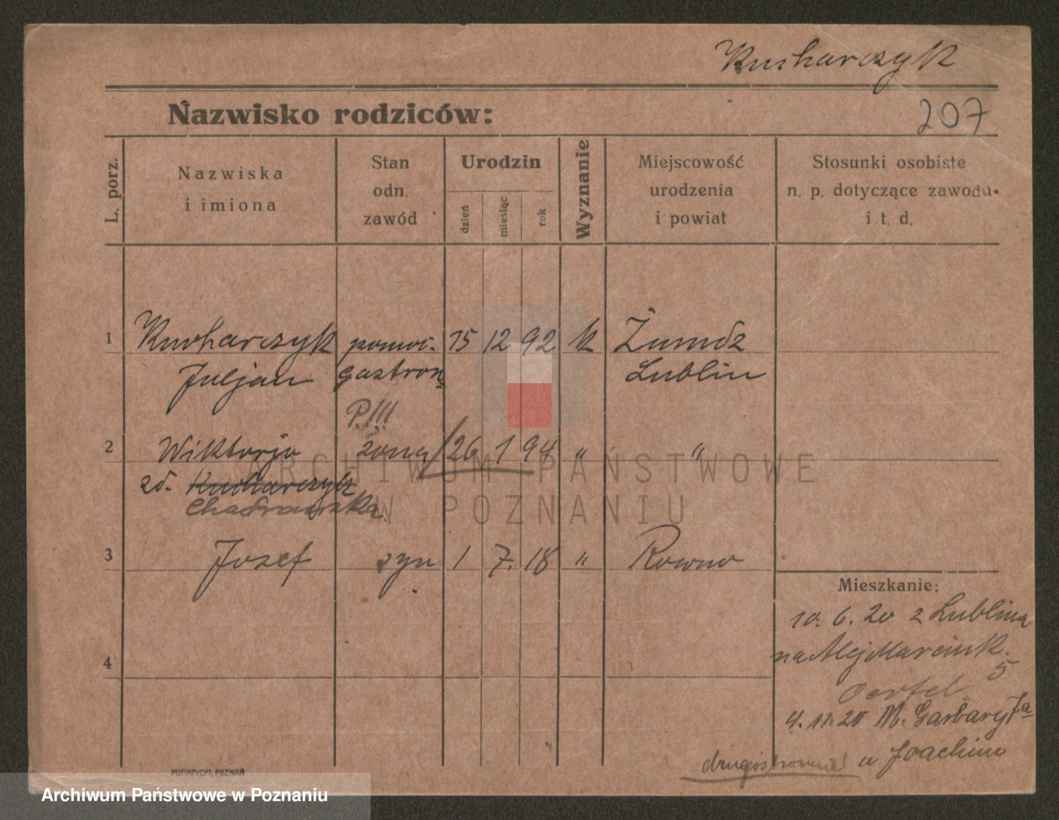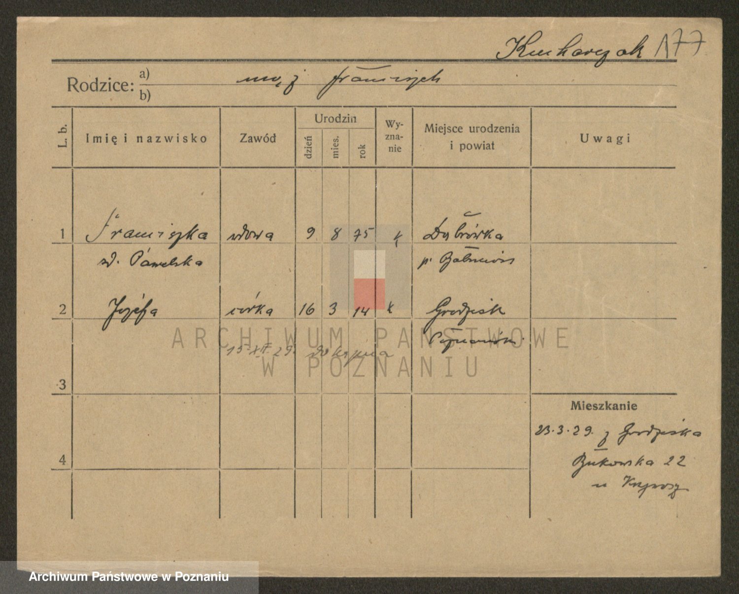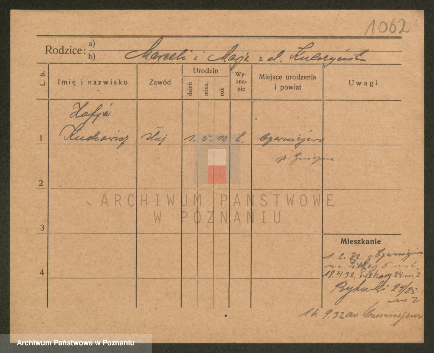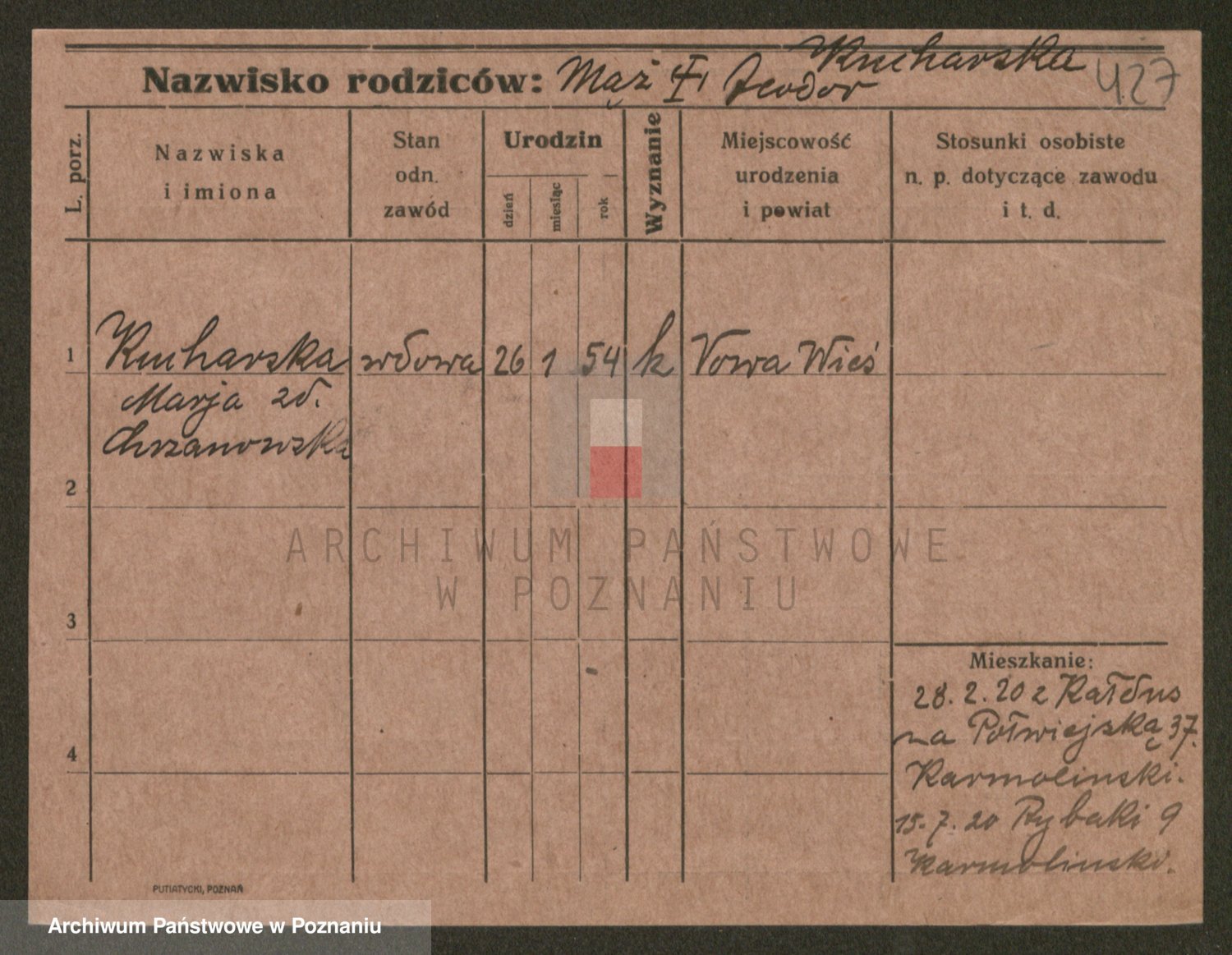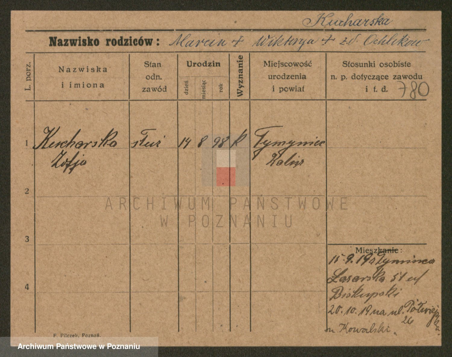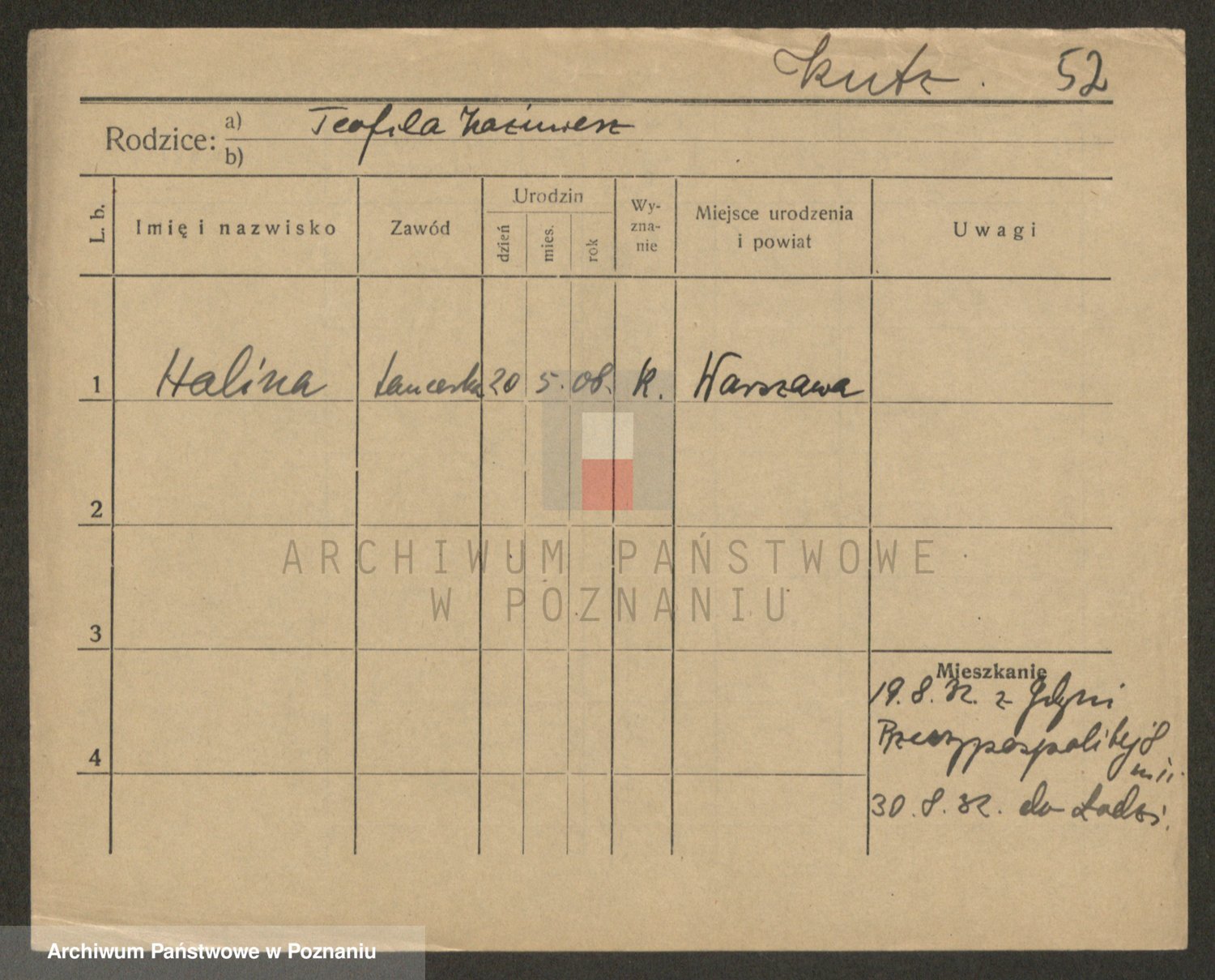 Podgląd karty osobowej dostępny jest po kliknięciu na nazwisko lub ikonkę karty. Można dokonywać powiększenia (ikony na górze) lub przechodzić między kolejnymi skanami (strzałki po bokach).