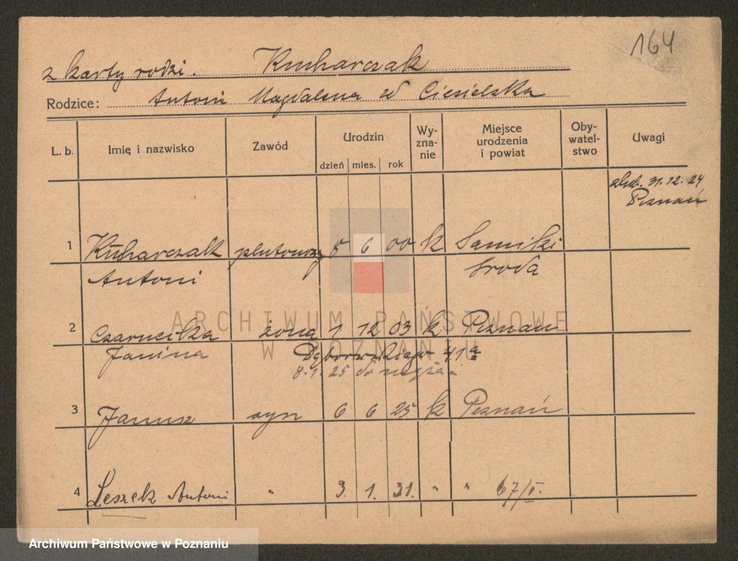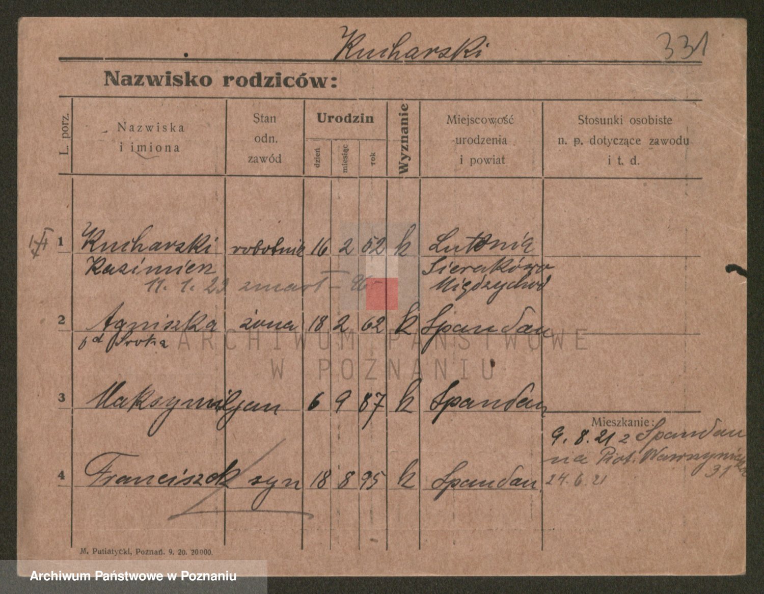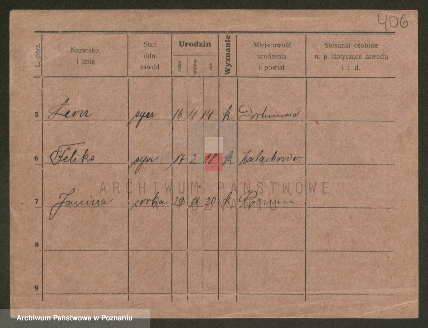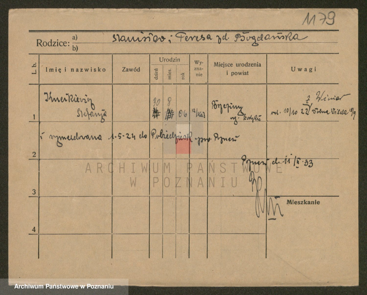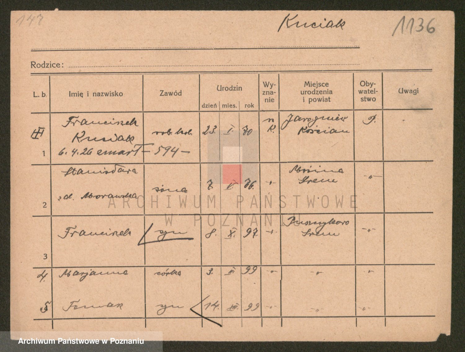 Podgląd karty osobowej dostępny jest po kliknięciu na nazwisko lub ikonkę karty. Można dokonywać powiększenia (ikony na górze) lub przechodzić między kolejnymi skanami (strzałki po bokach).