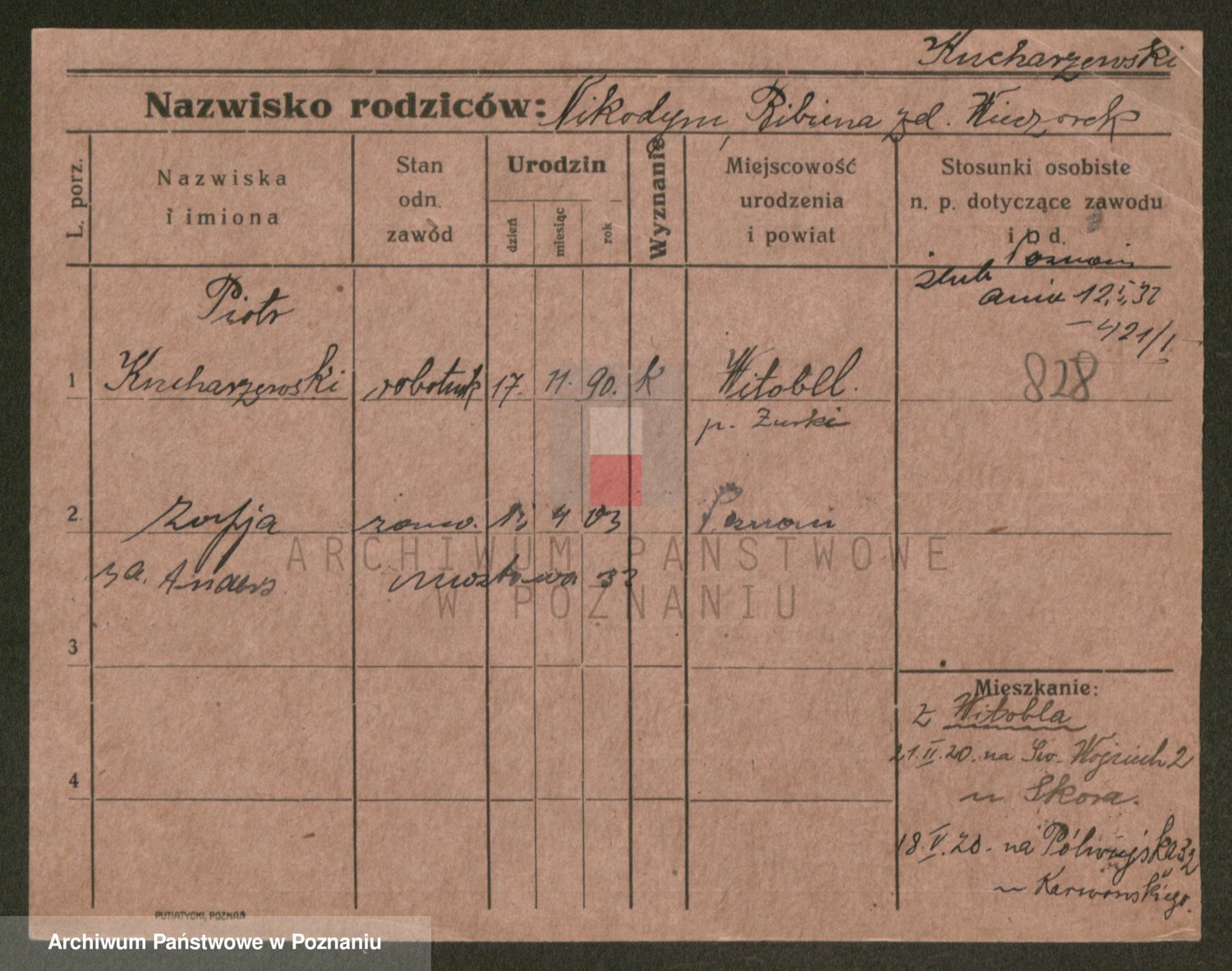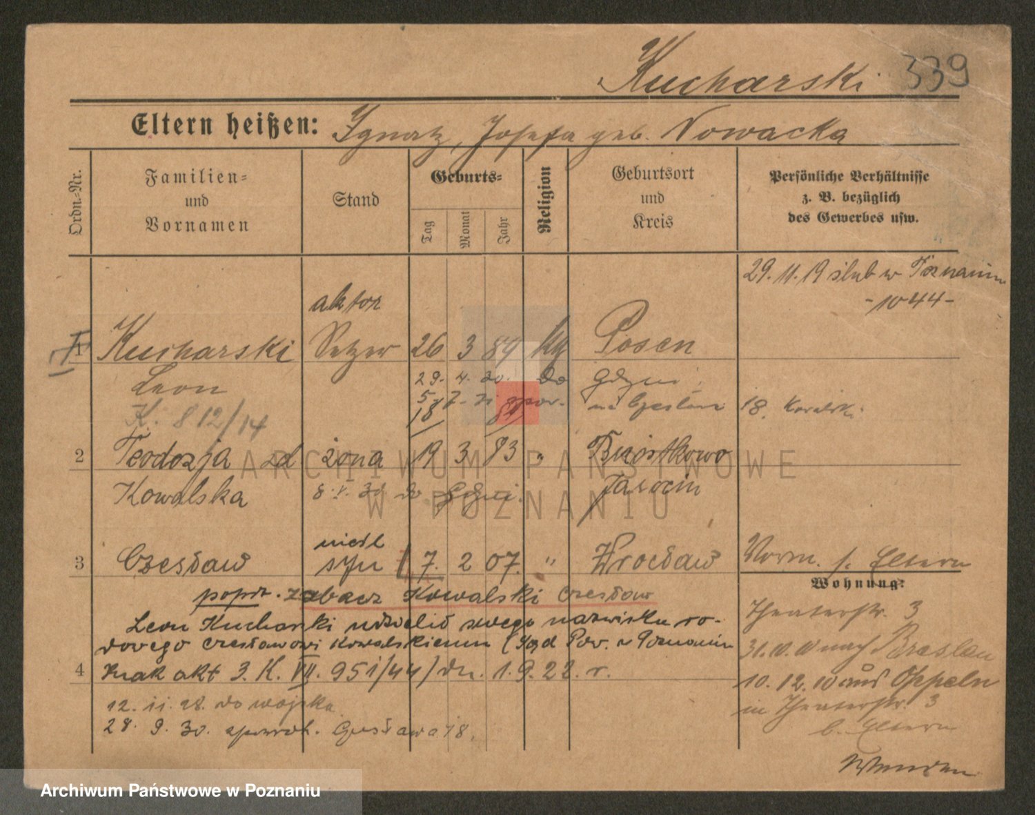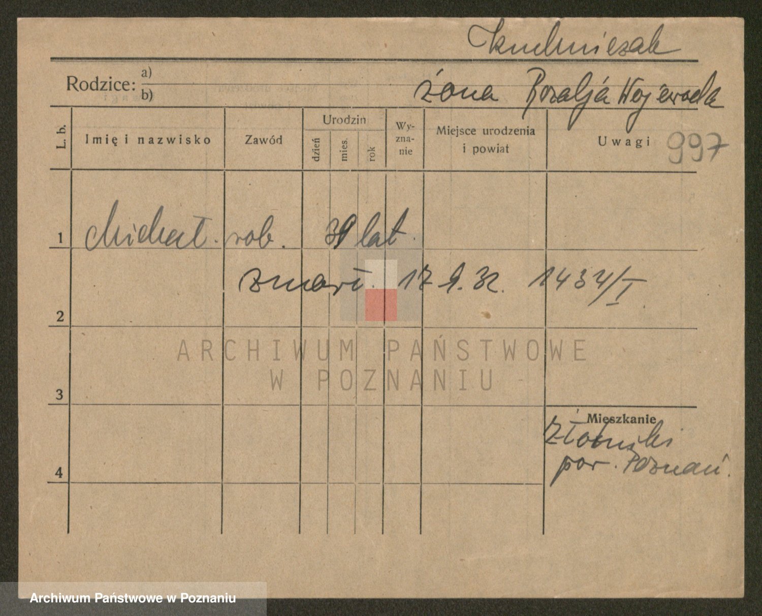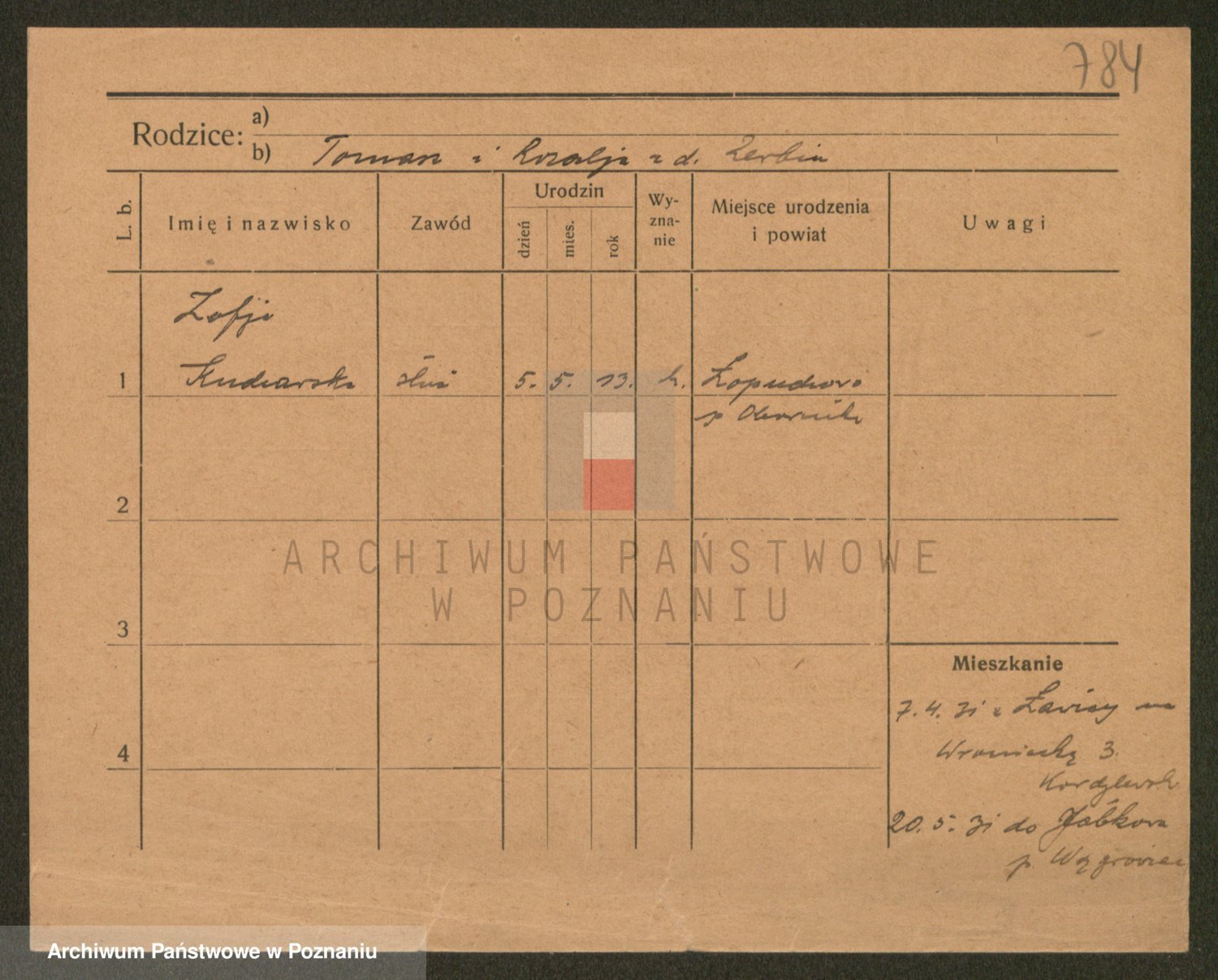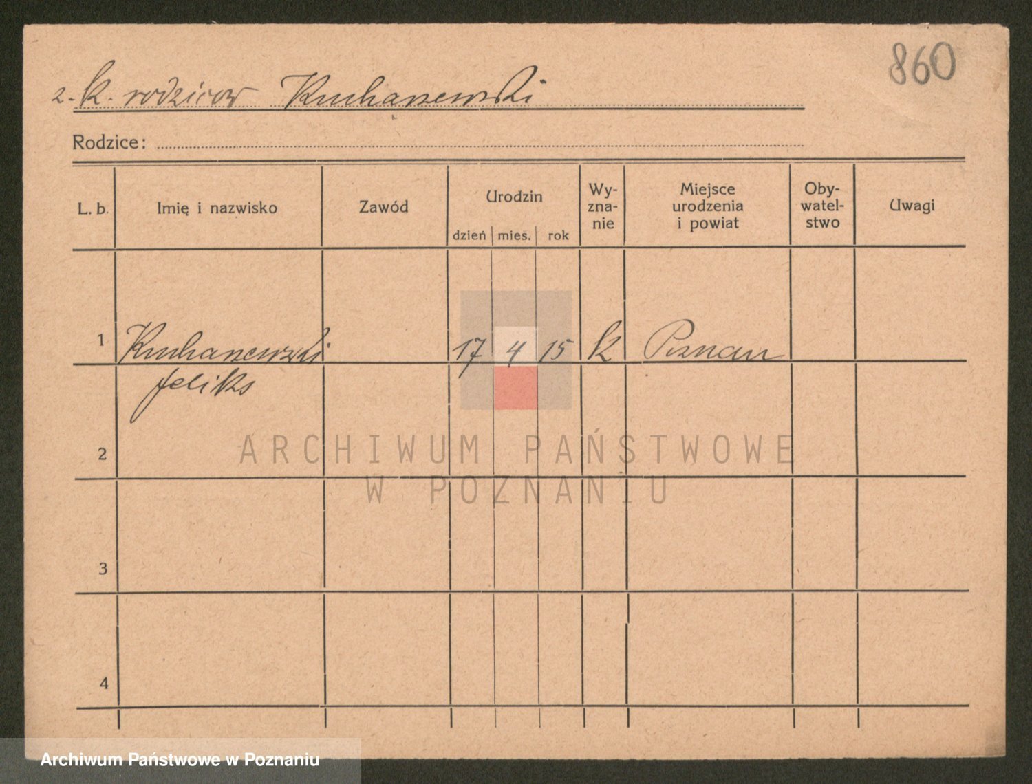 Podgląd karty osobowej dostępny jest po kliknięciu na nazwisko lub ikonkę karty. Można dokonywać powiększenia (ikony na górze) lub przechodzić między kolejnymi skanami (strzałki po bokach).
