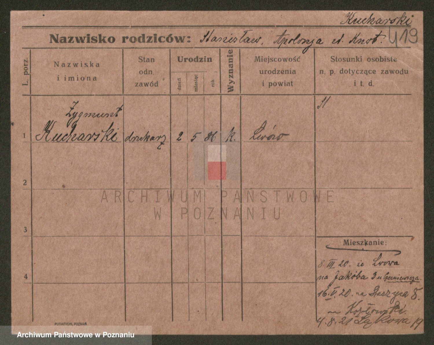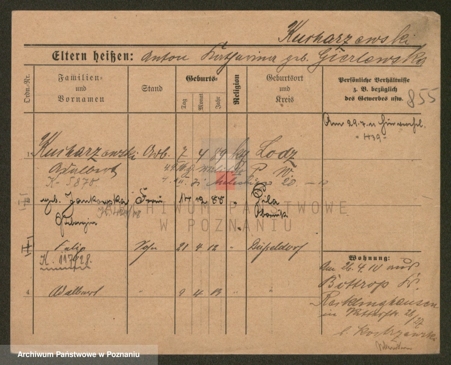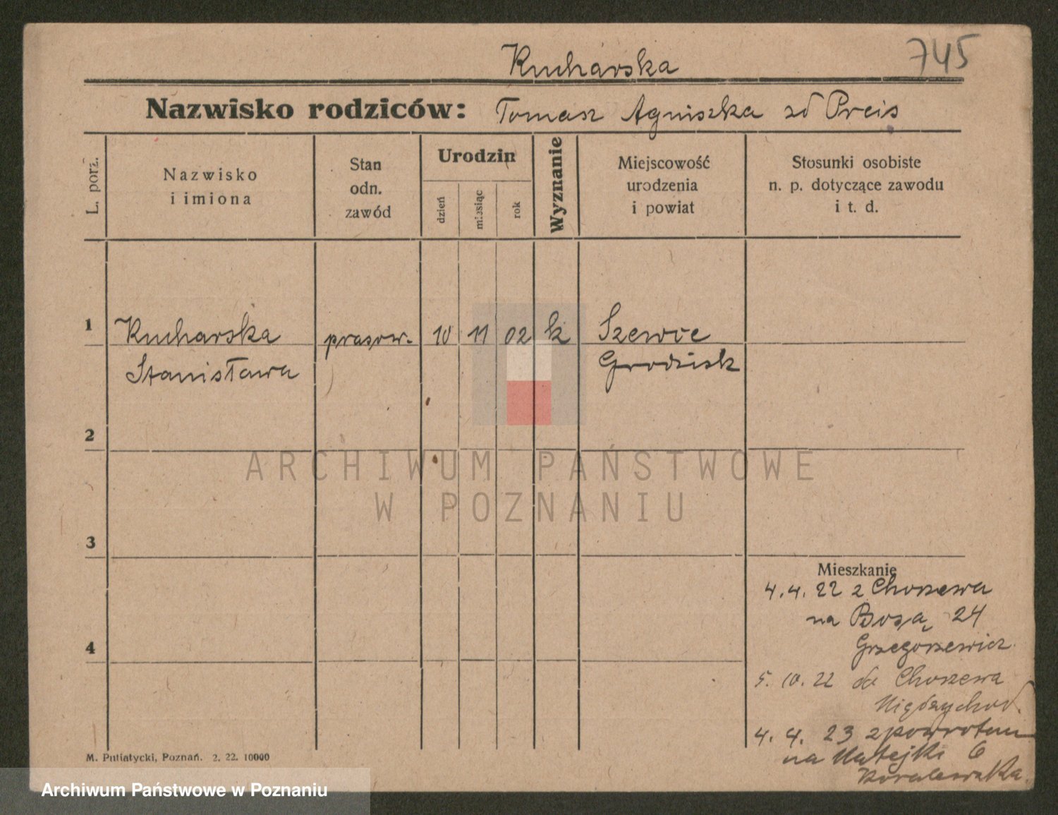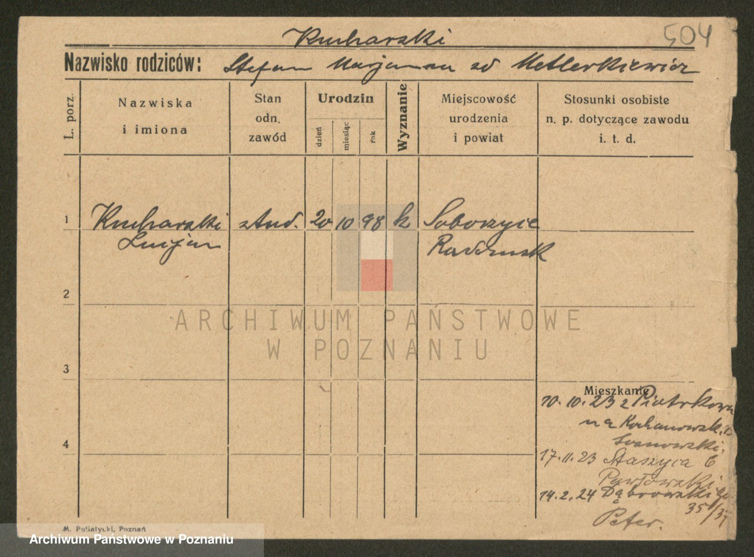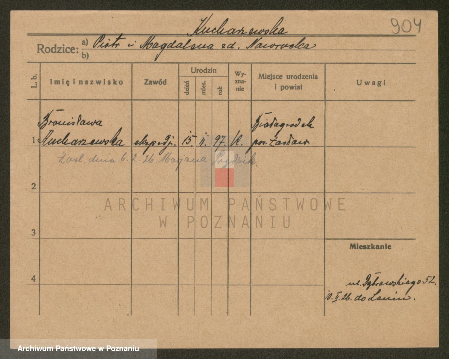 Podgląd karty osobowej dostępny jest po kliknięciu na nazwisko lub ikonkę karty. Można dokonywać powiększenia (ikony na górze) lub przechodzić między kolejnymi skanami (strzałki po bokach).