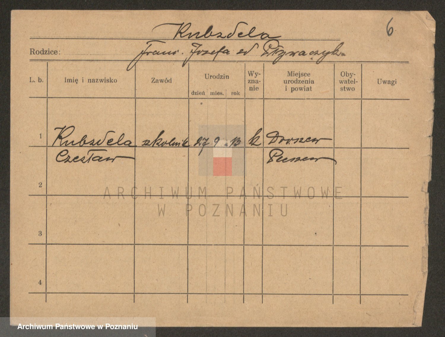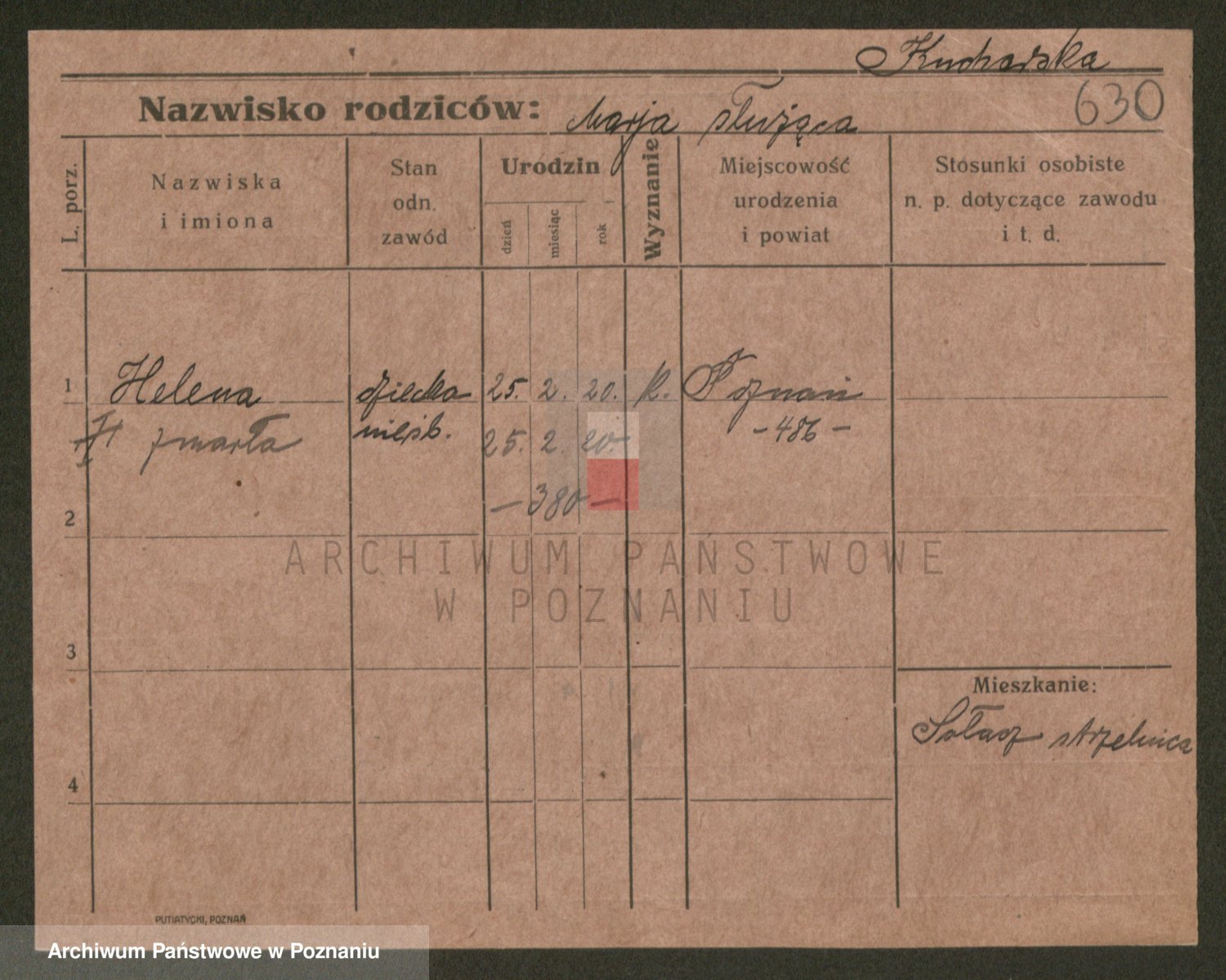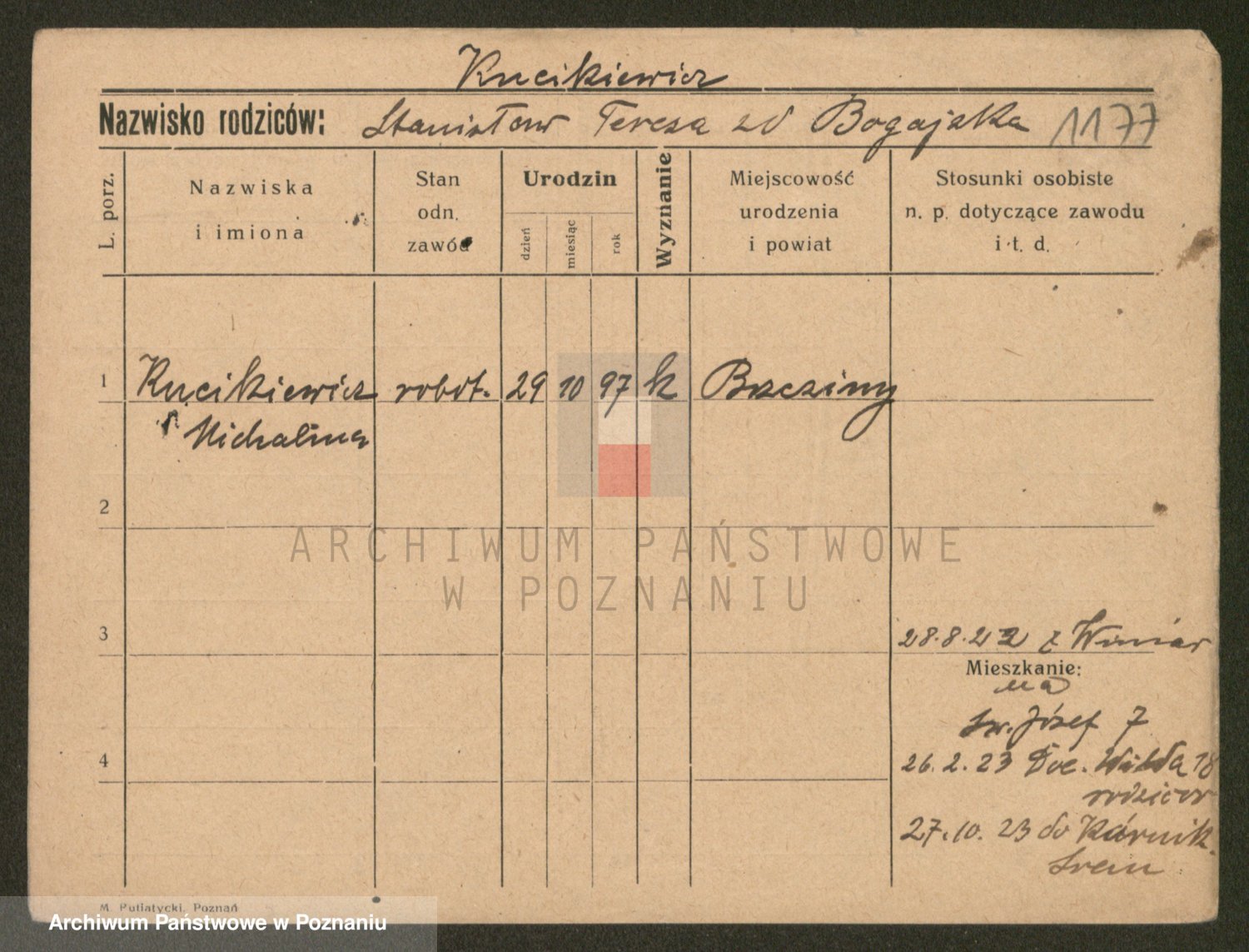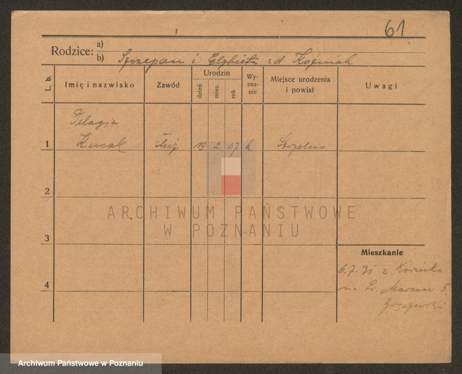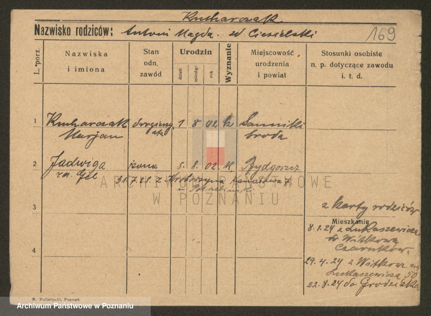 Podgląd karty osobowej dostępny jest po kliknięciu na nazwisko lub ikonkę karty. Można dokonywać powiększenia (ikony na górze) lub przechodzić między kolejnymi skanami (strzałki po bokach).