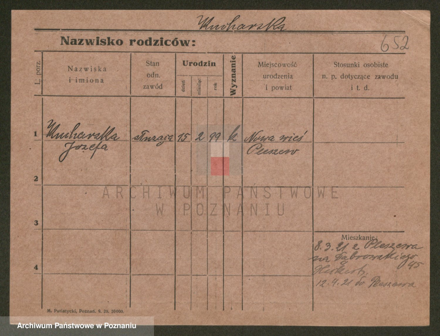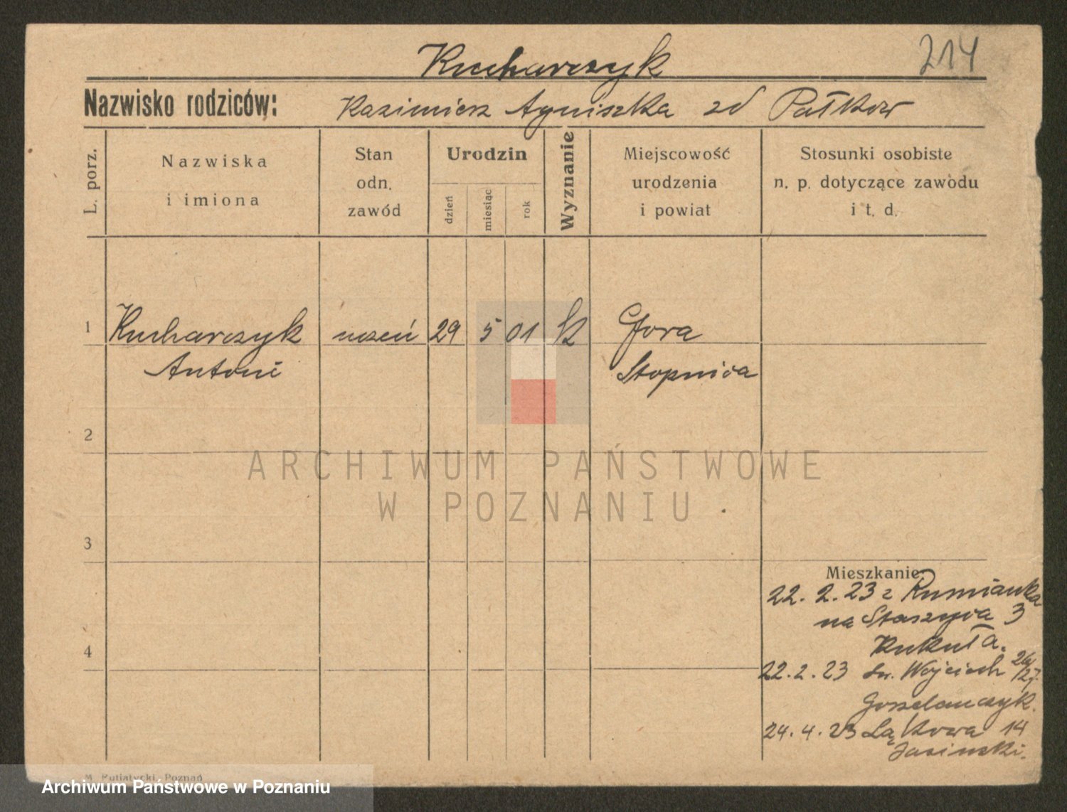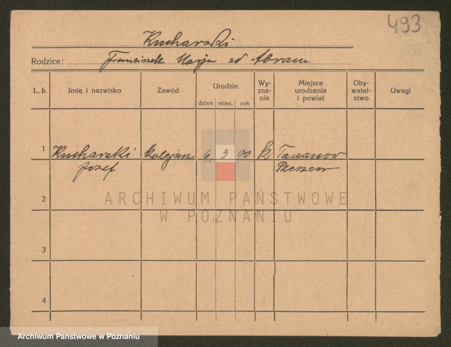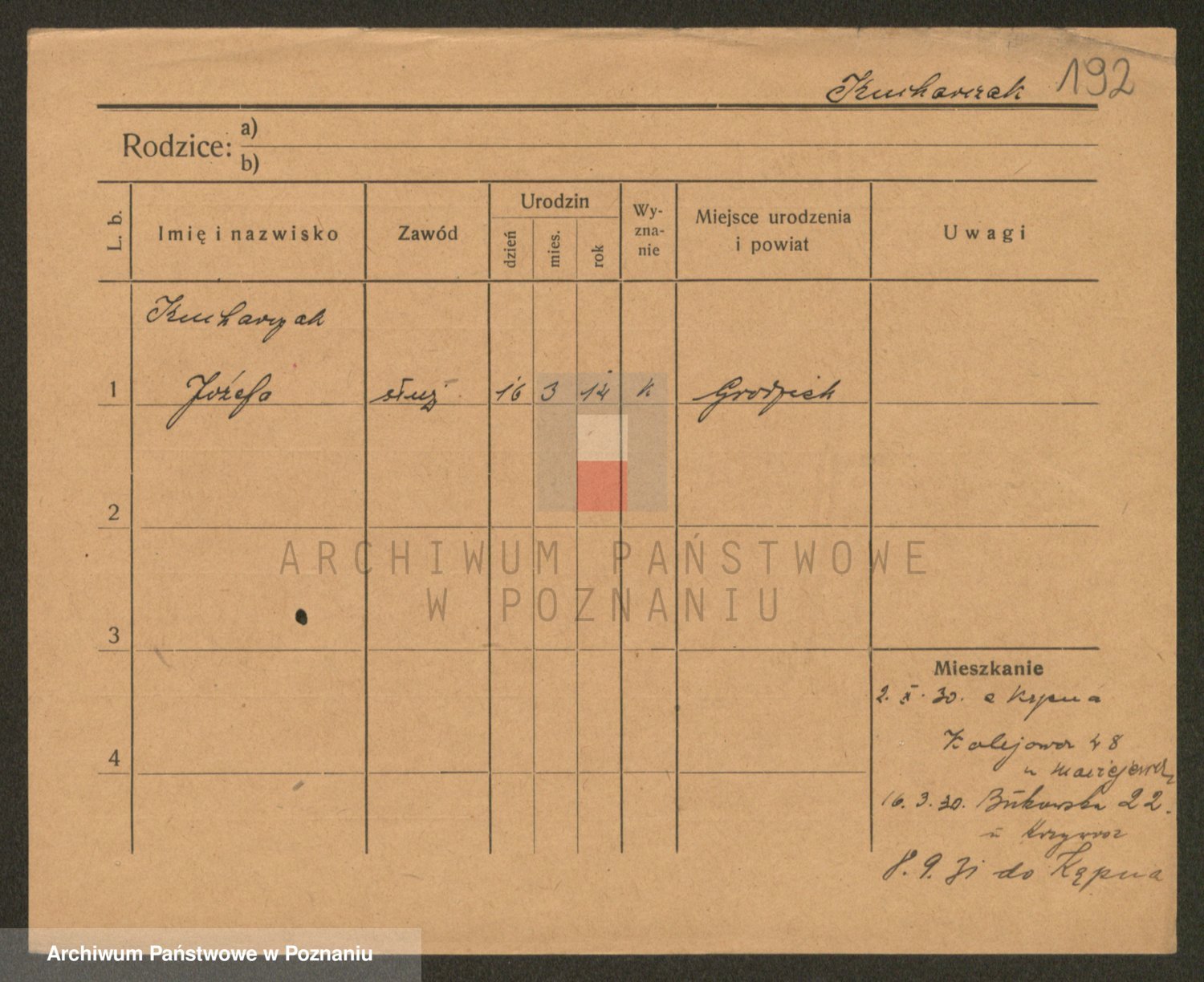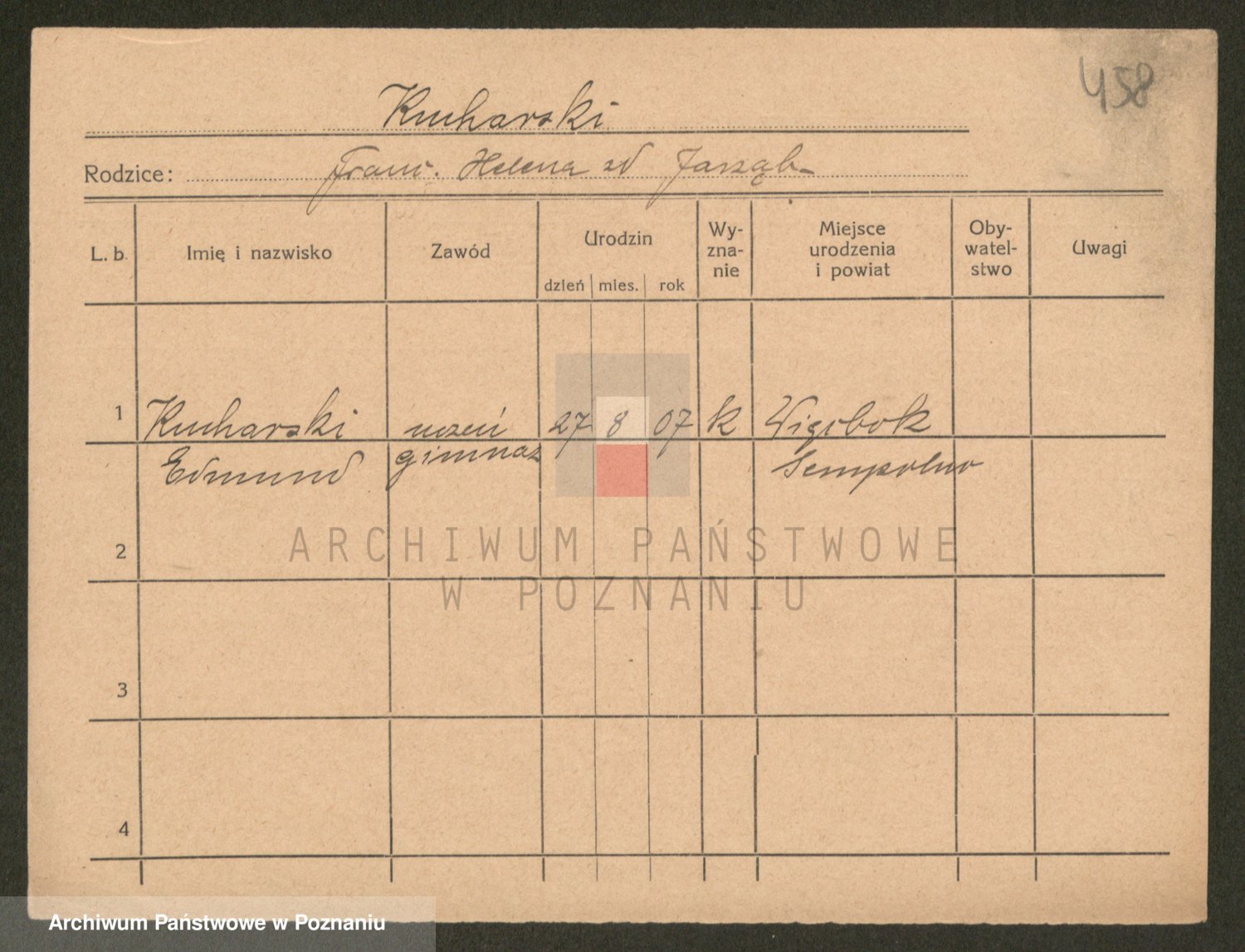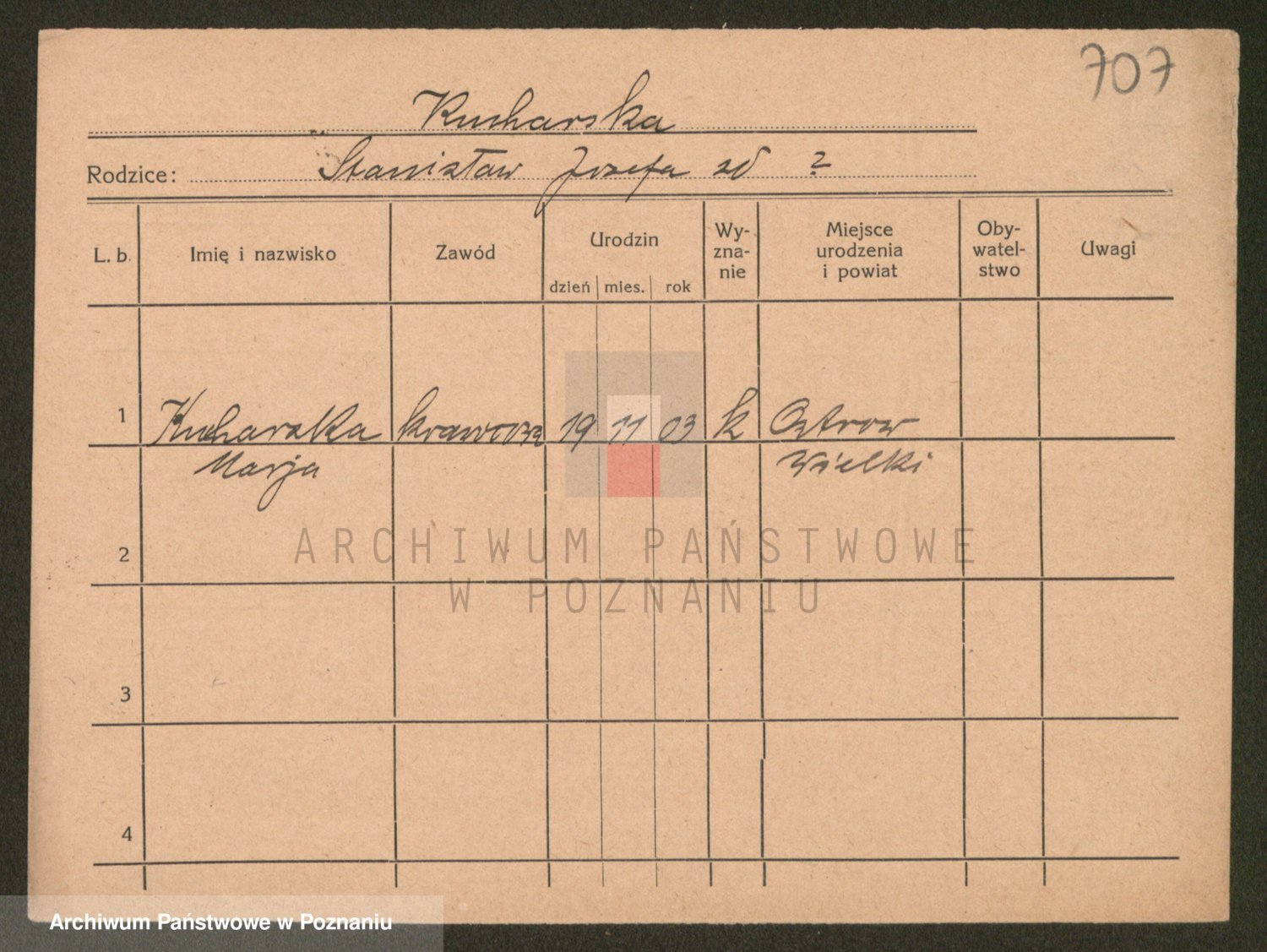 Podgląd karty osobowej dostępny jest po kliknięciu na nazwisko lub ikonkę karty. Można dokonywać powiększenia (ikony na górze) lub przechodzić między kolejnymi skanami (strzałki po bokach).