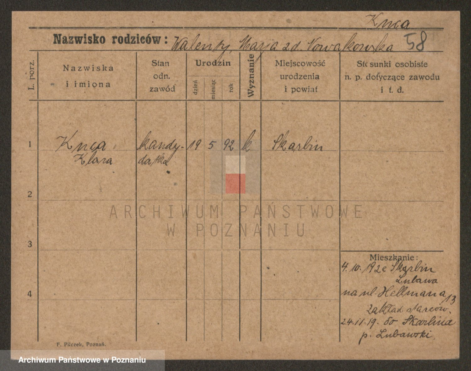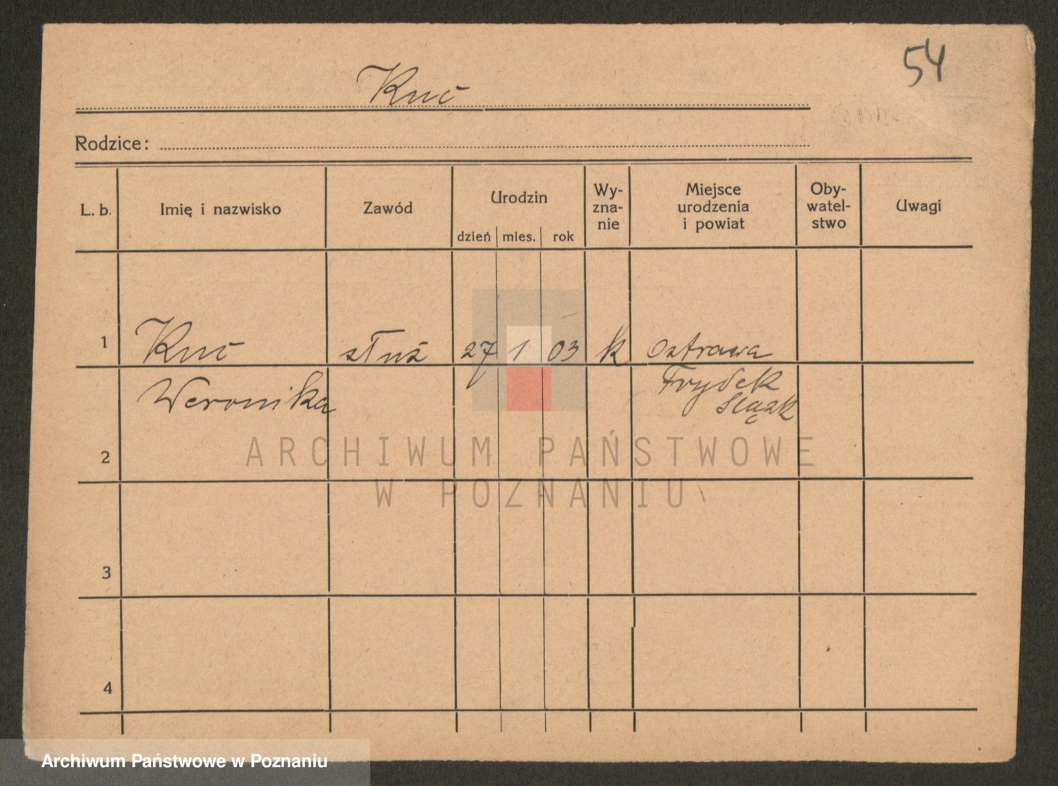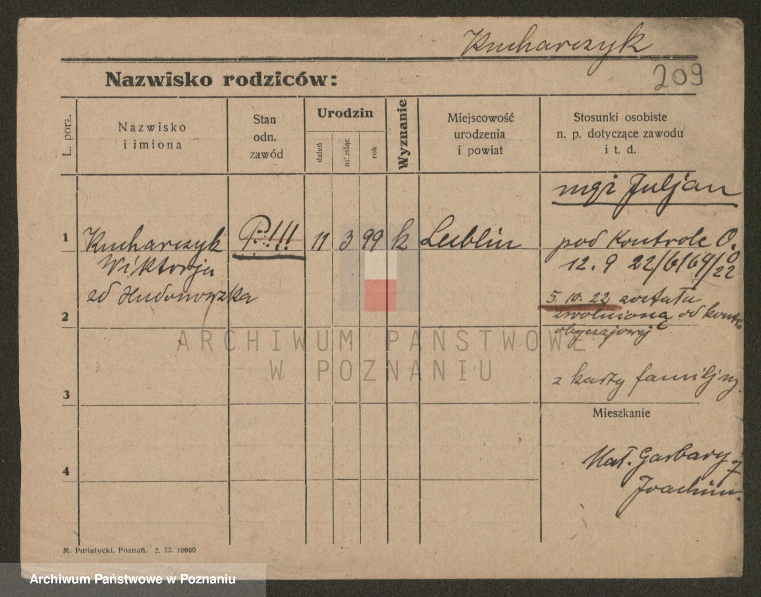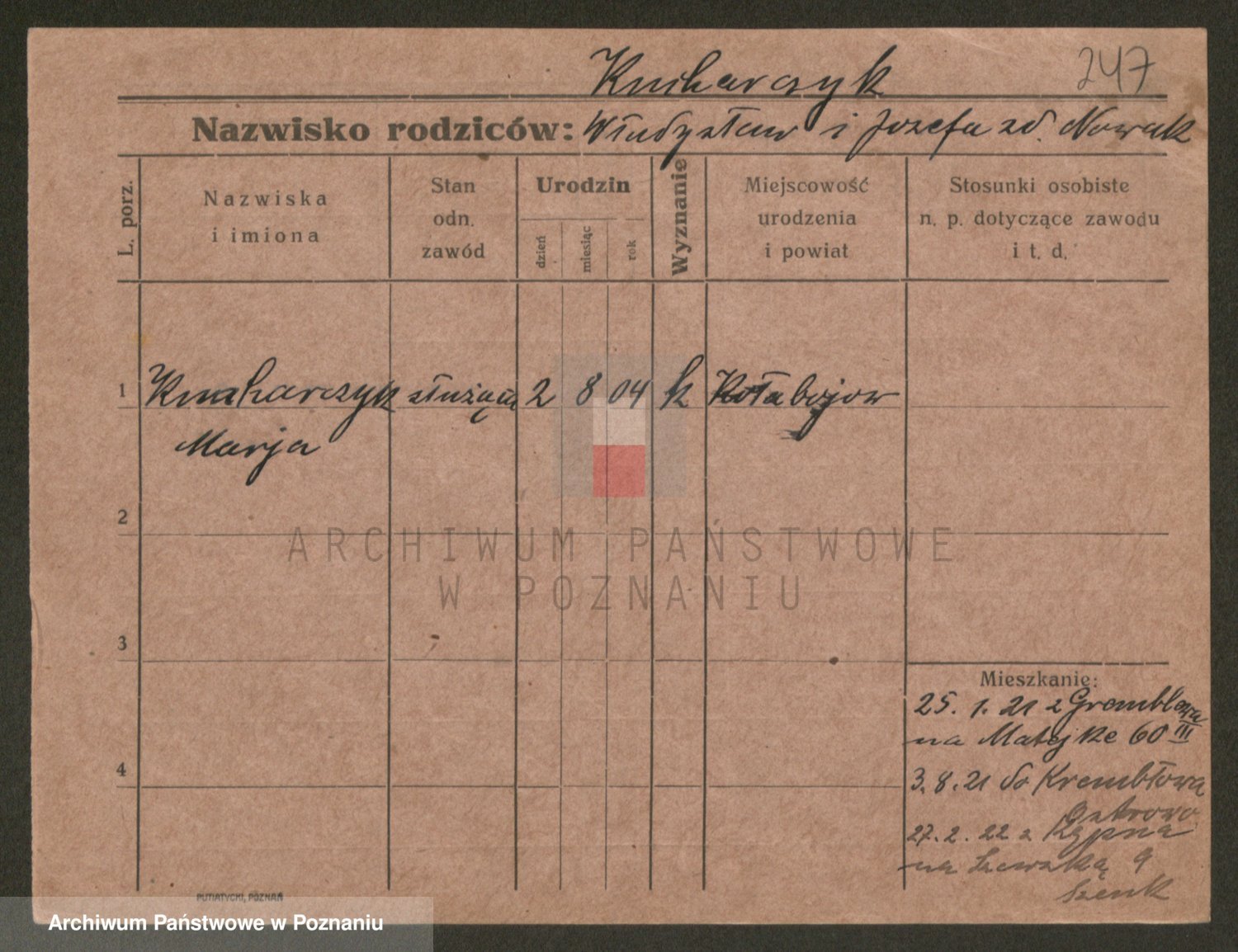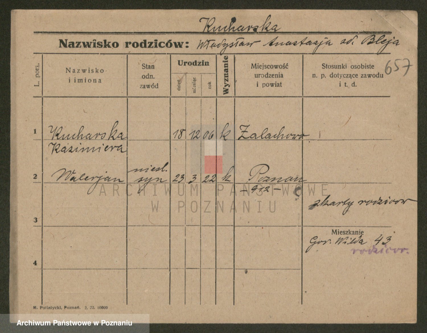 Podgląd karty osobowej dostępny jest po kliknięciu na nazwisko lub ikonkę karty. Można dokonywać powiększenia (ikony na górze) lub przechodzić między kolejnymi skanami (strzałki po bokach).