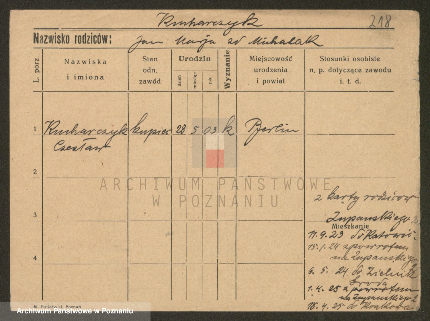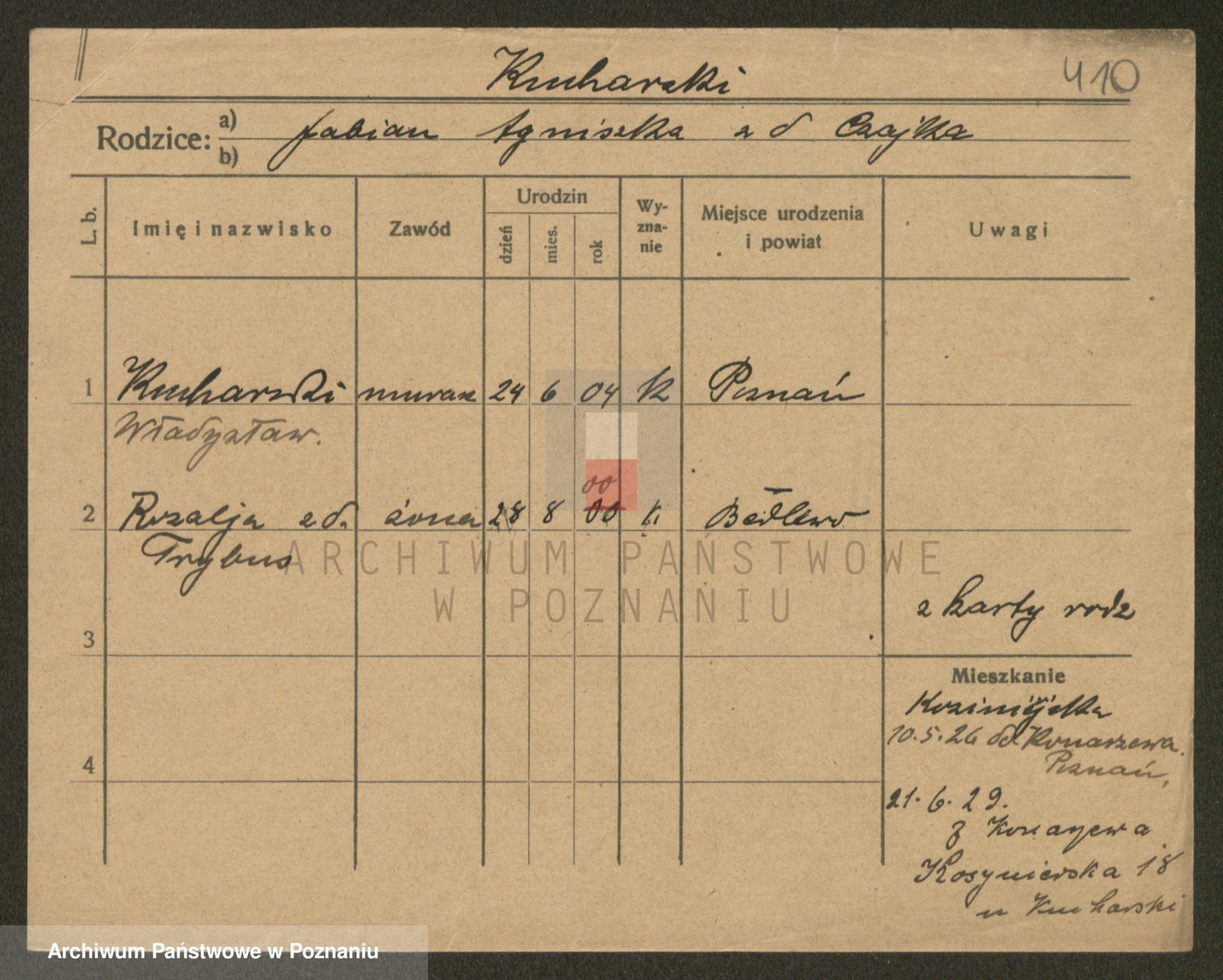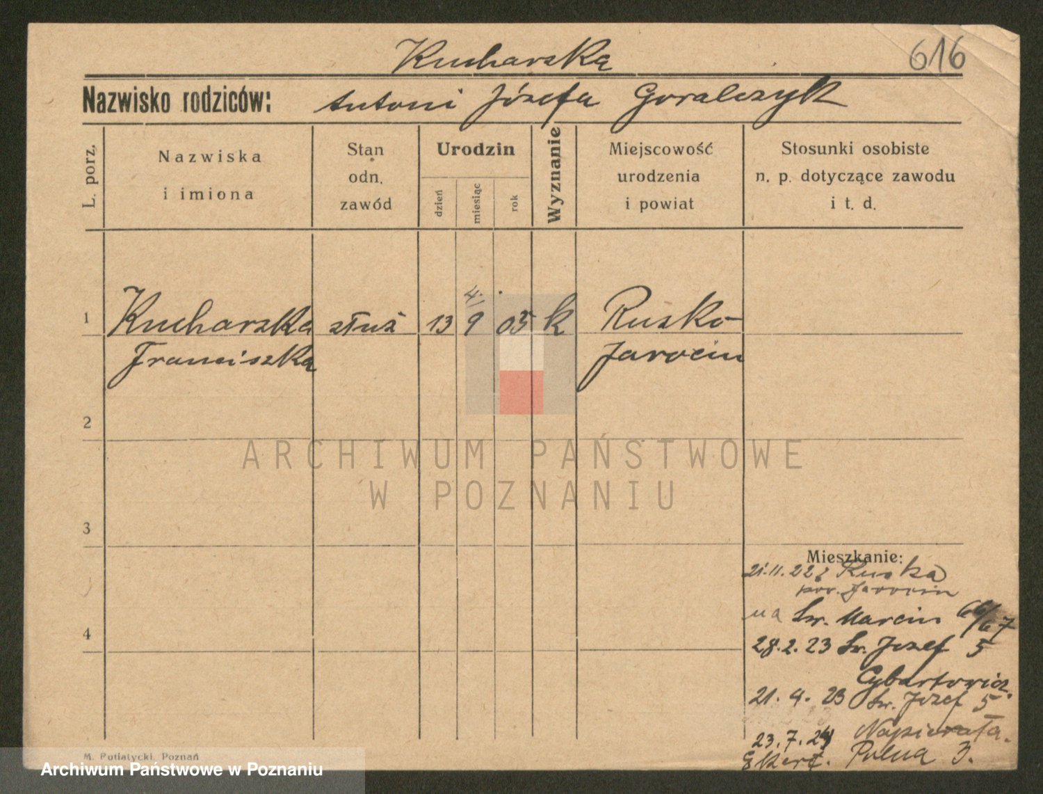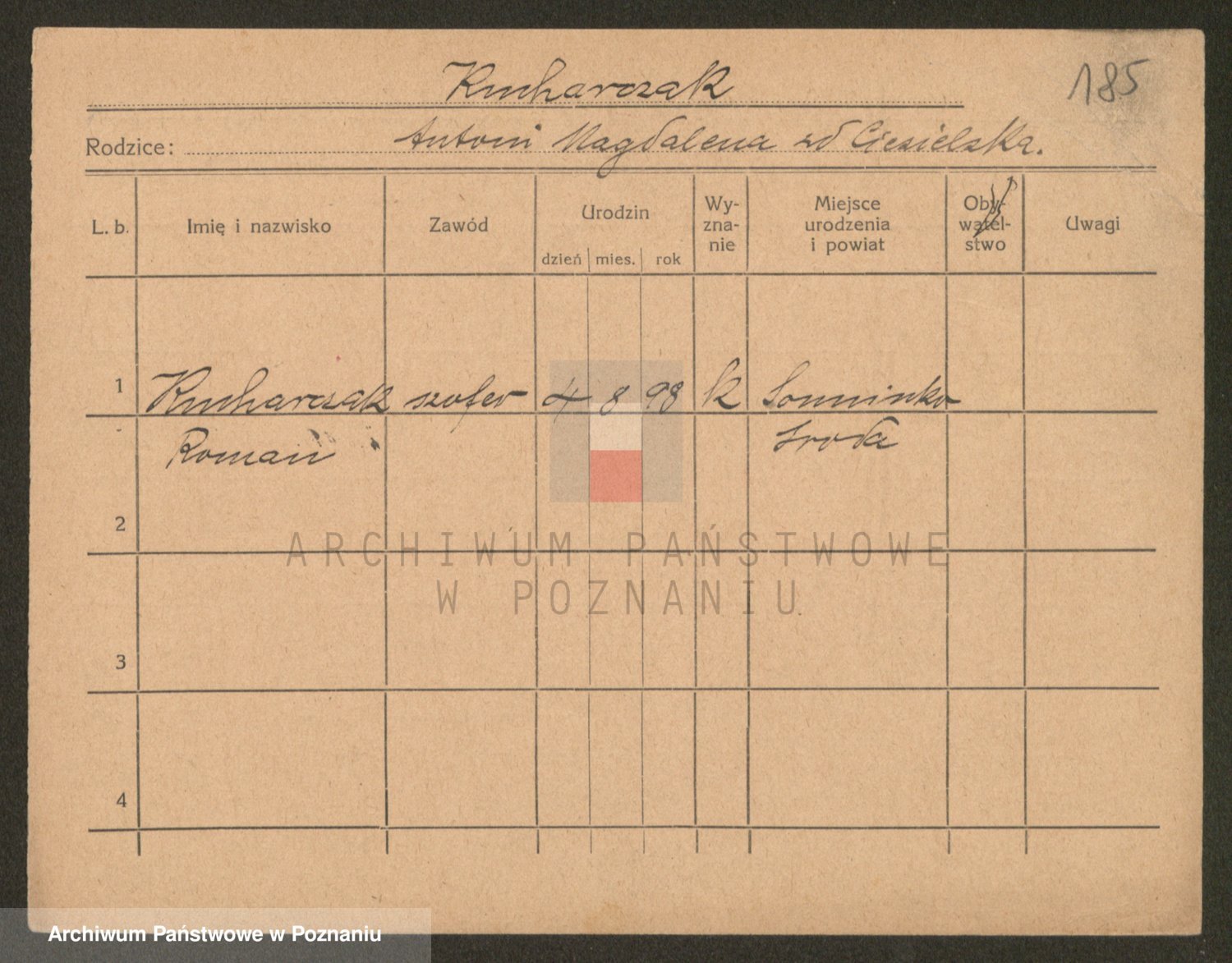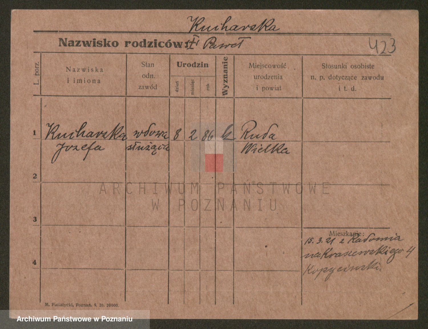 Podgląd karty osobowej dostępny jest po kliknięciu na nazwisko lub ikonkę karty. Można dokonywać powiększenia (ikony na górze) lub przechodzić między kolejnymi skanami (strzałki po bokach).