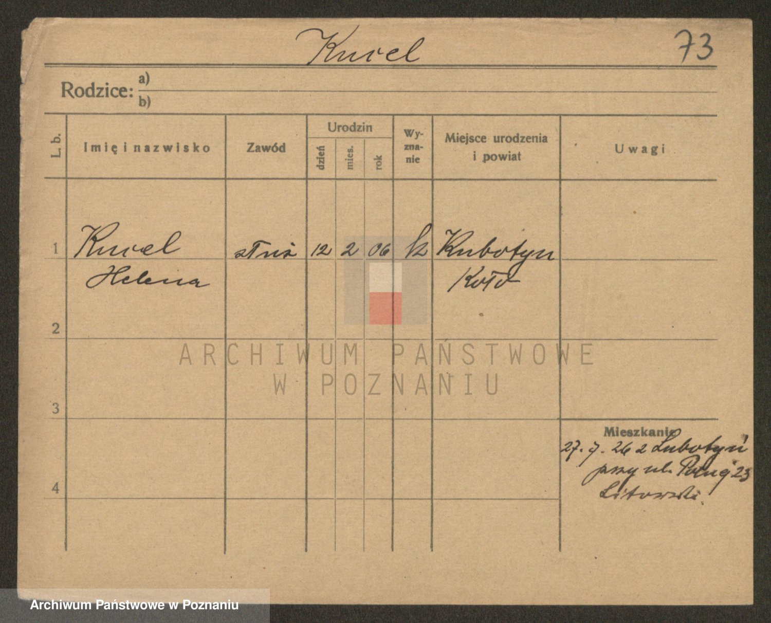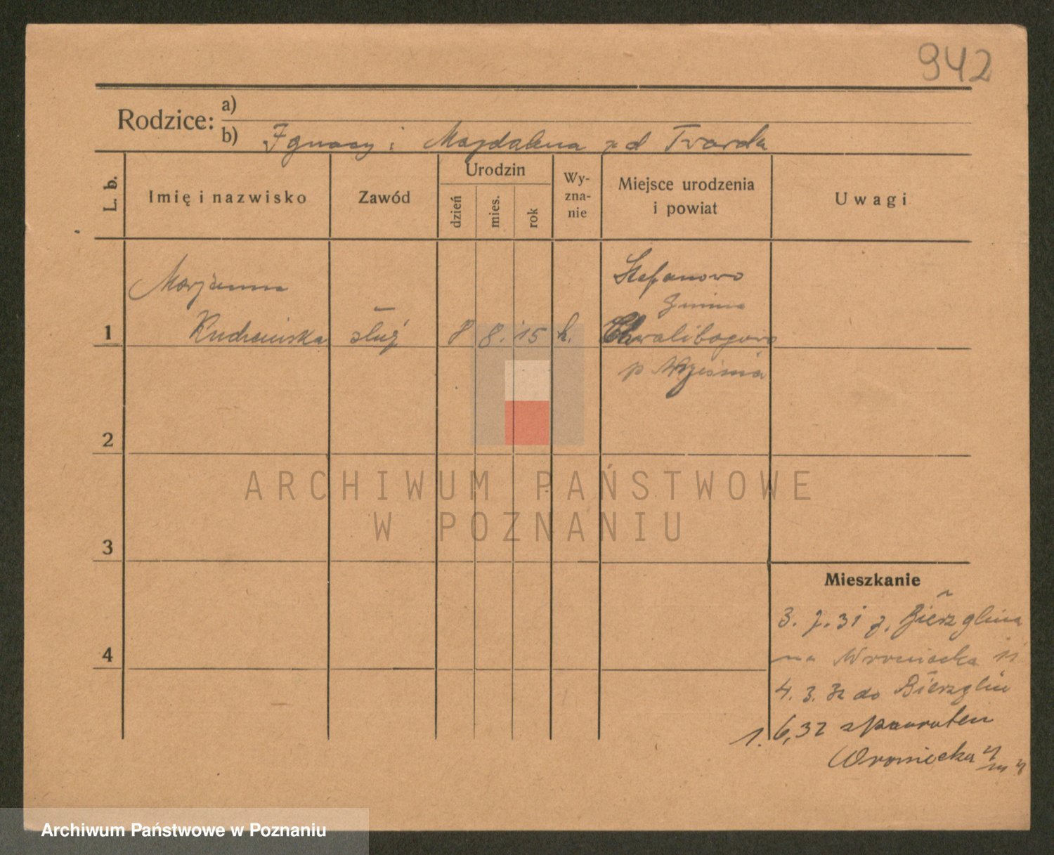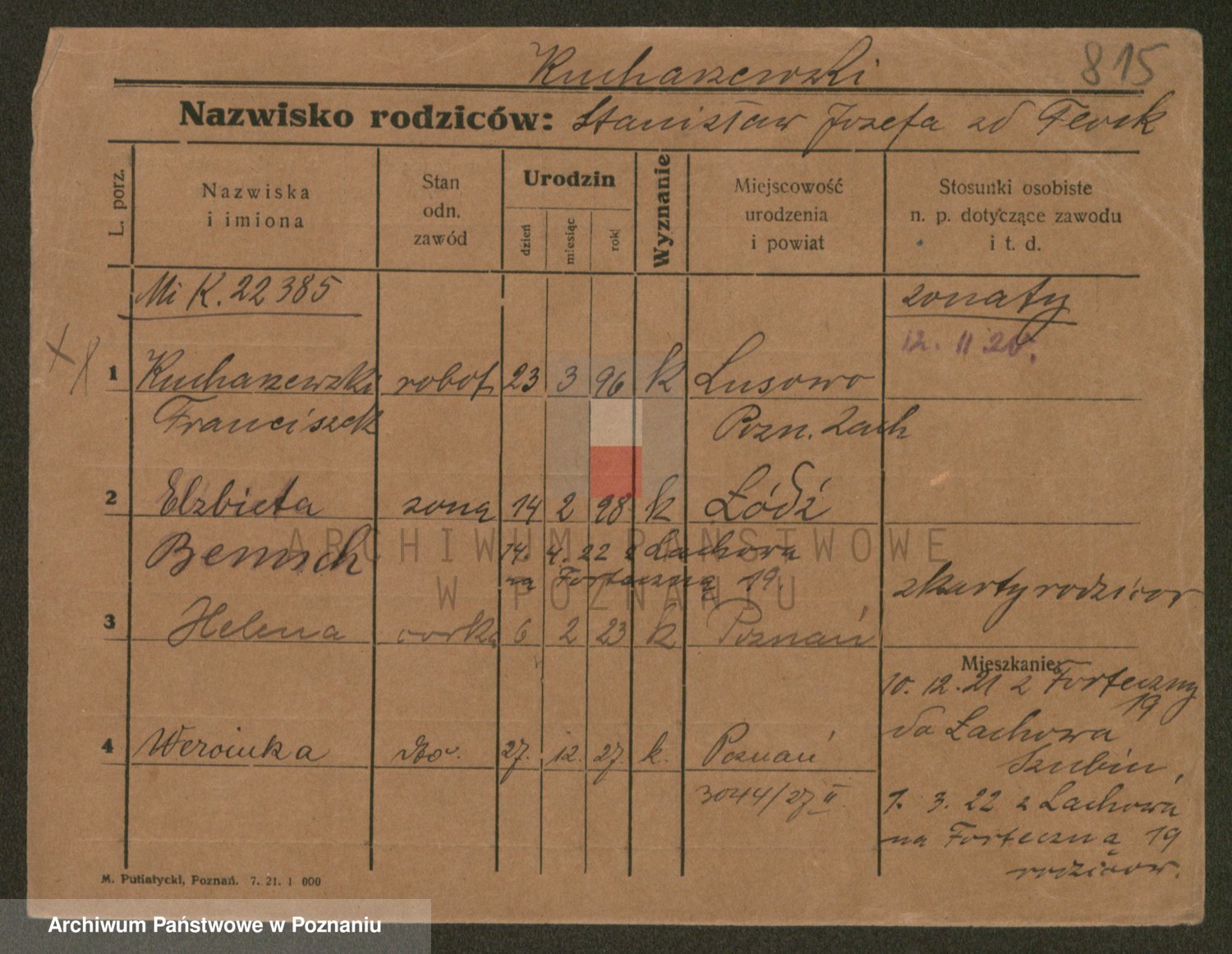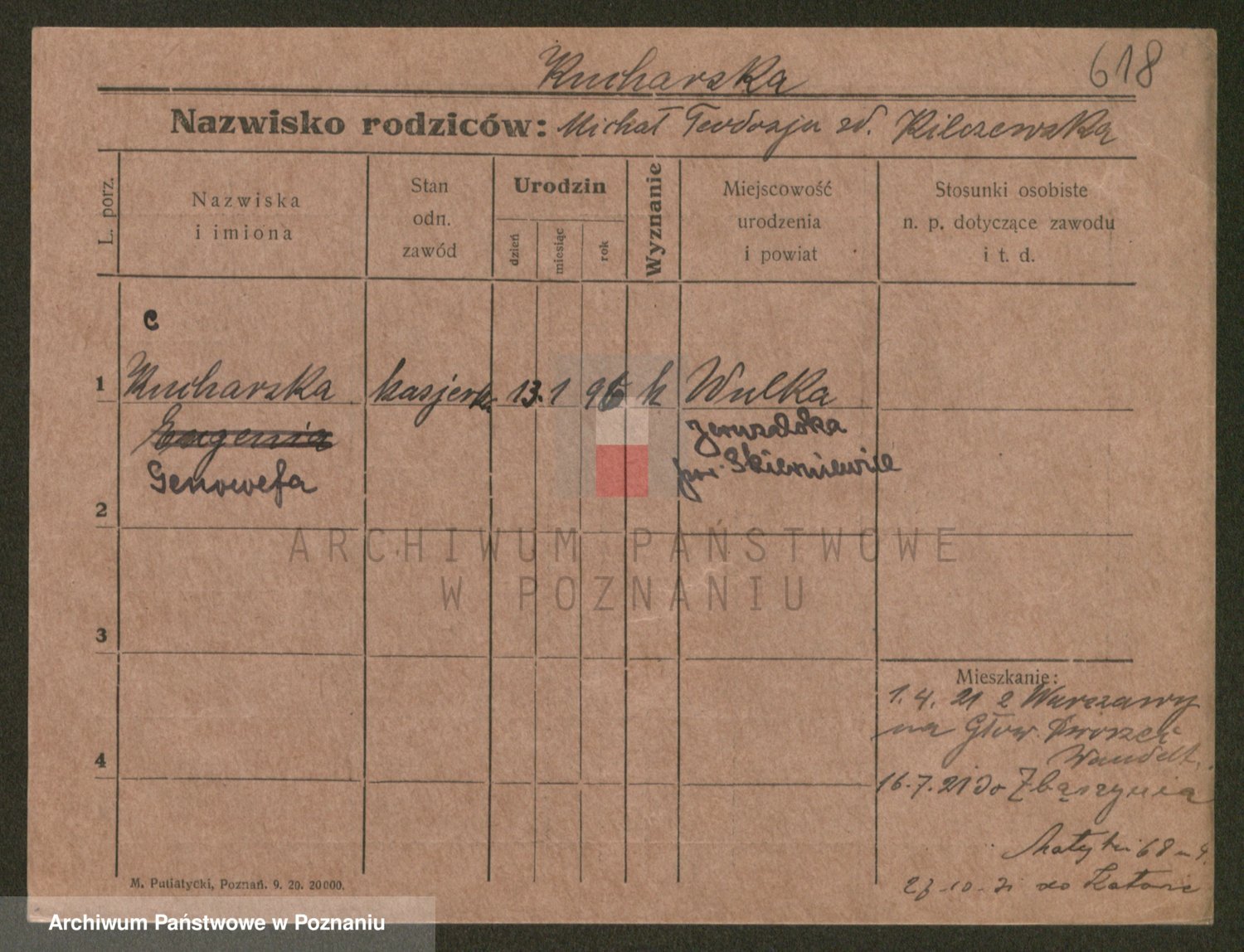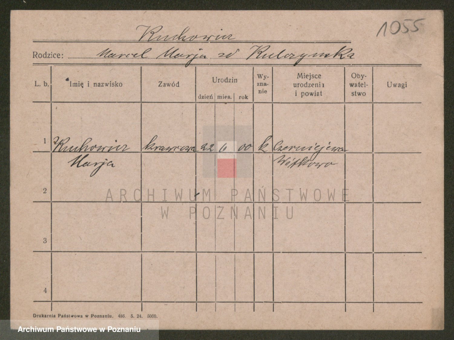 Podgląd karty osobowej dostępny jest po kliknięciu na nazwisko lub ikonkę karty. Można dokonywać powiększenia (ikony na górze) lub przechodzić między kolejnymi skanami (strzałki po bokach).