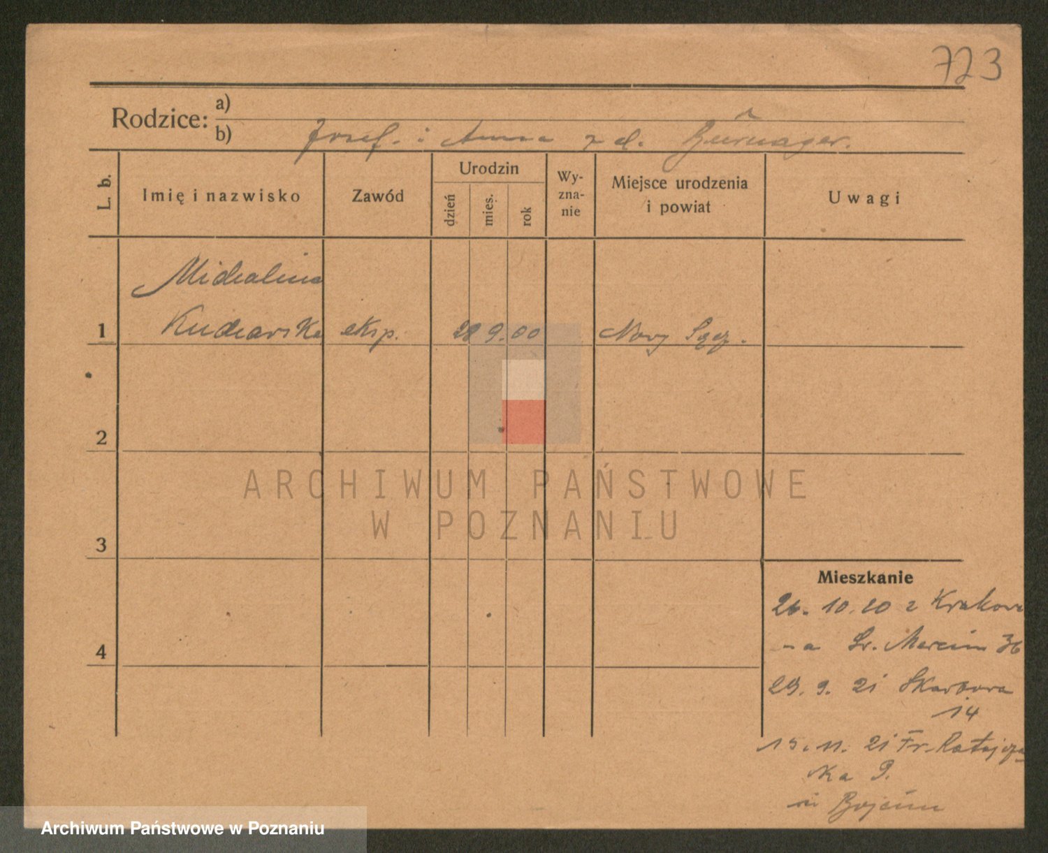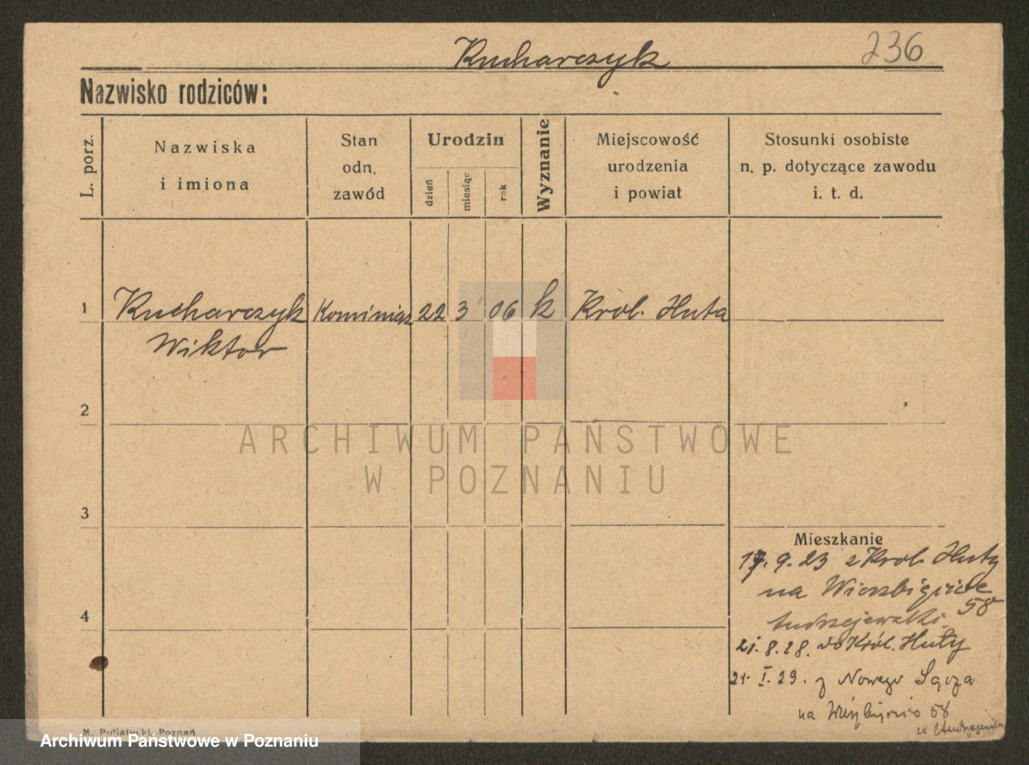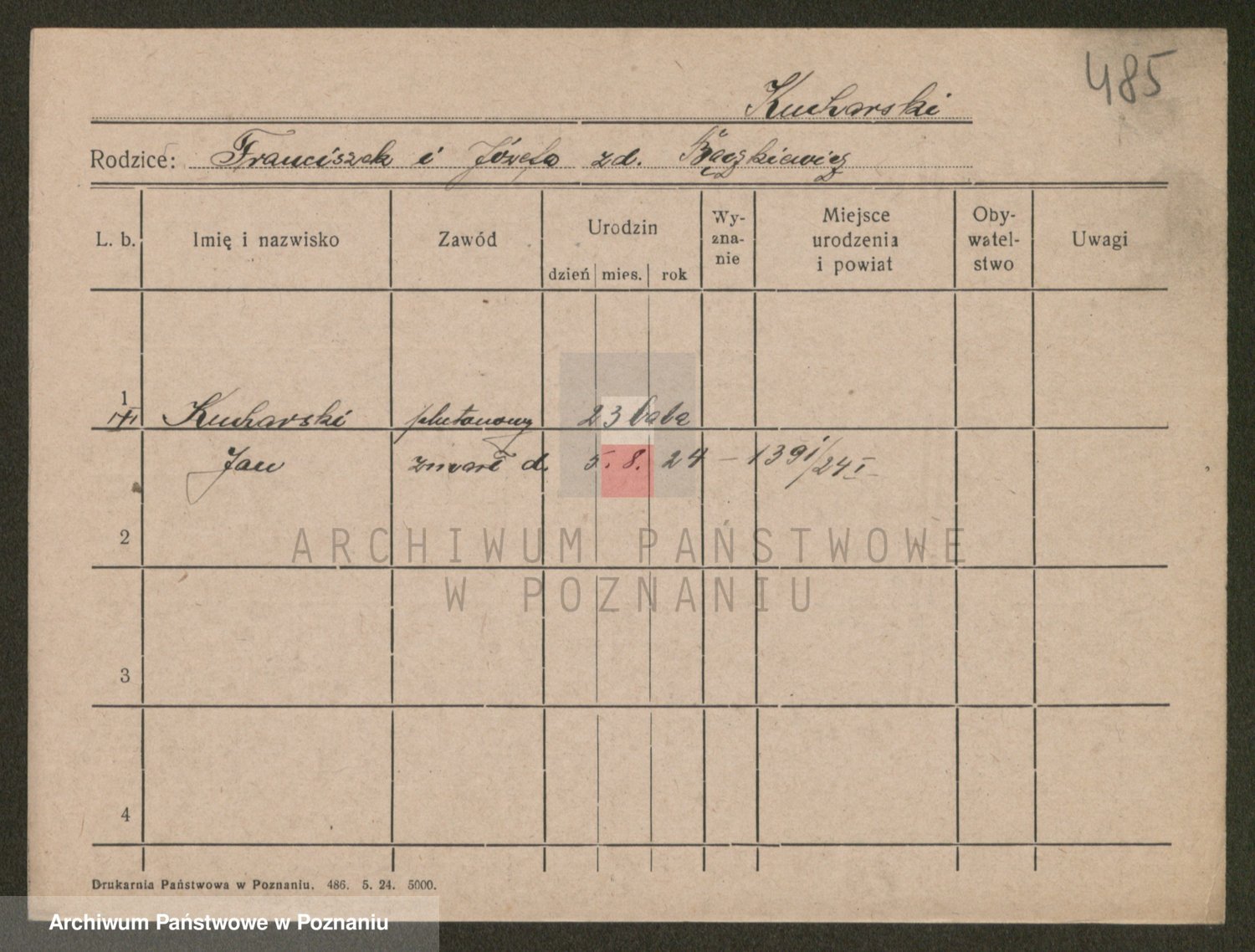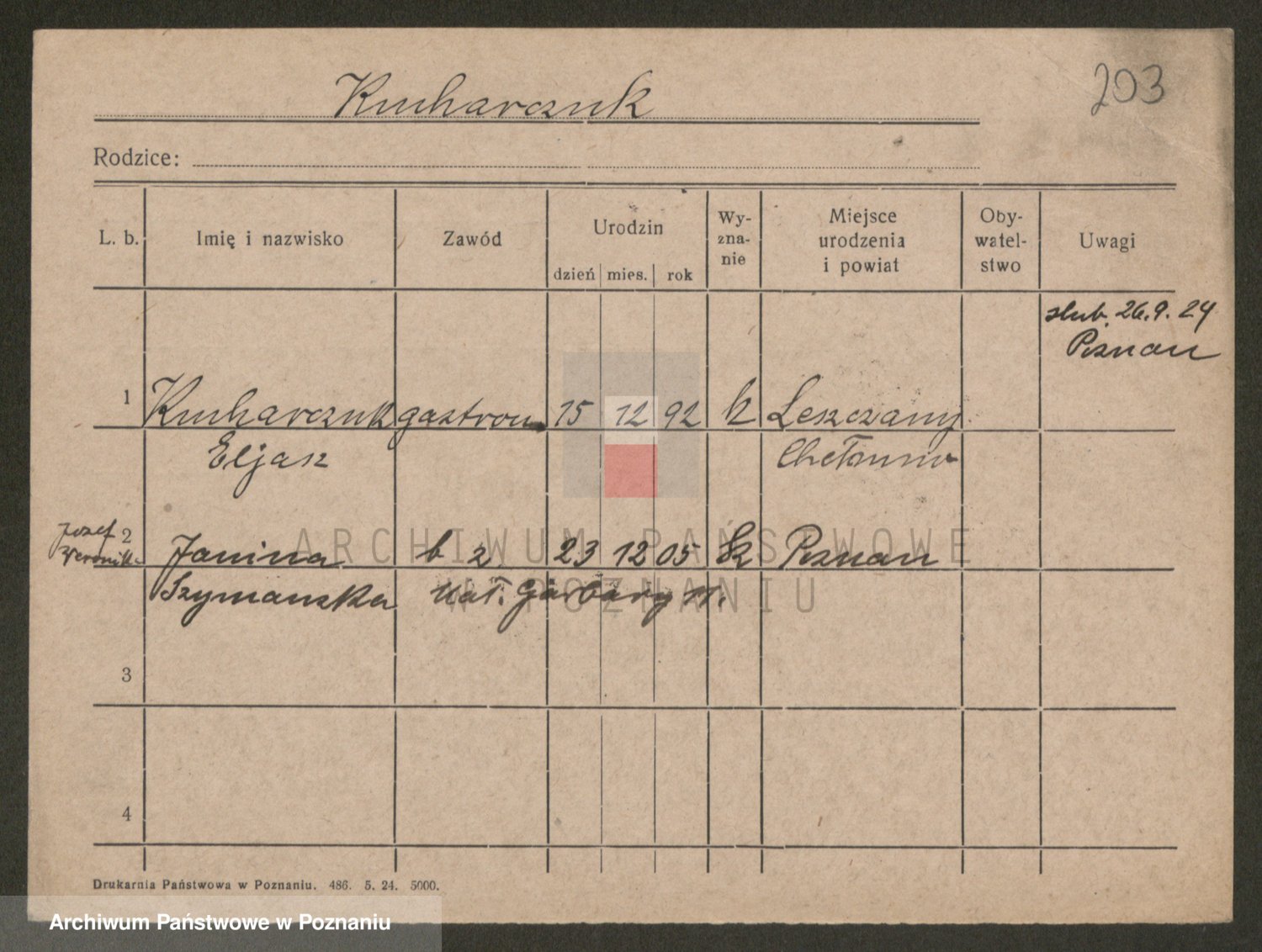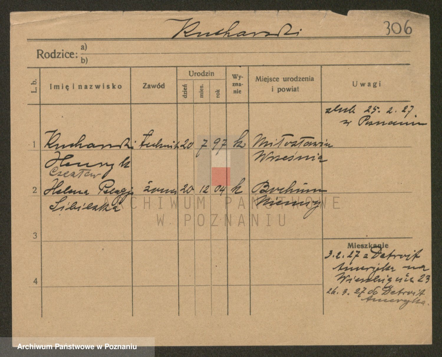 Podgląd karty osobowej dostępny jest po kliknięciu na nazwisko lub ikonkę karty. Można dokonywać powiększenia (ikony na górze) lub przechodzić między kolejnymi skanami (strzałki po bokach).