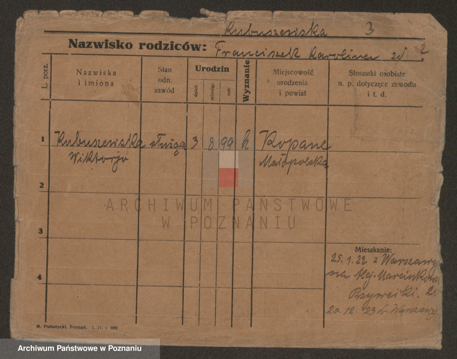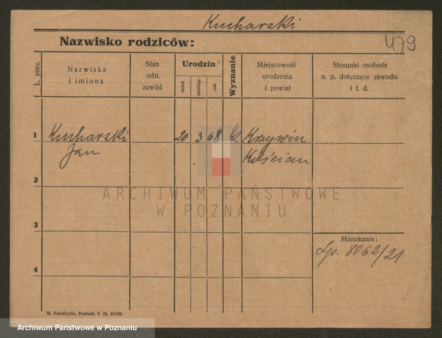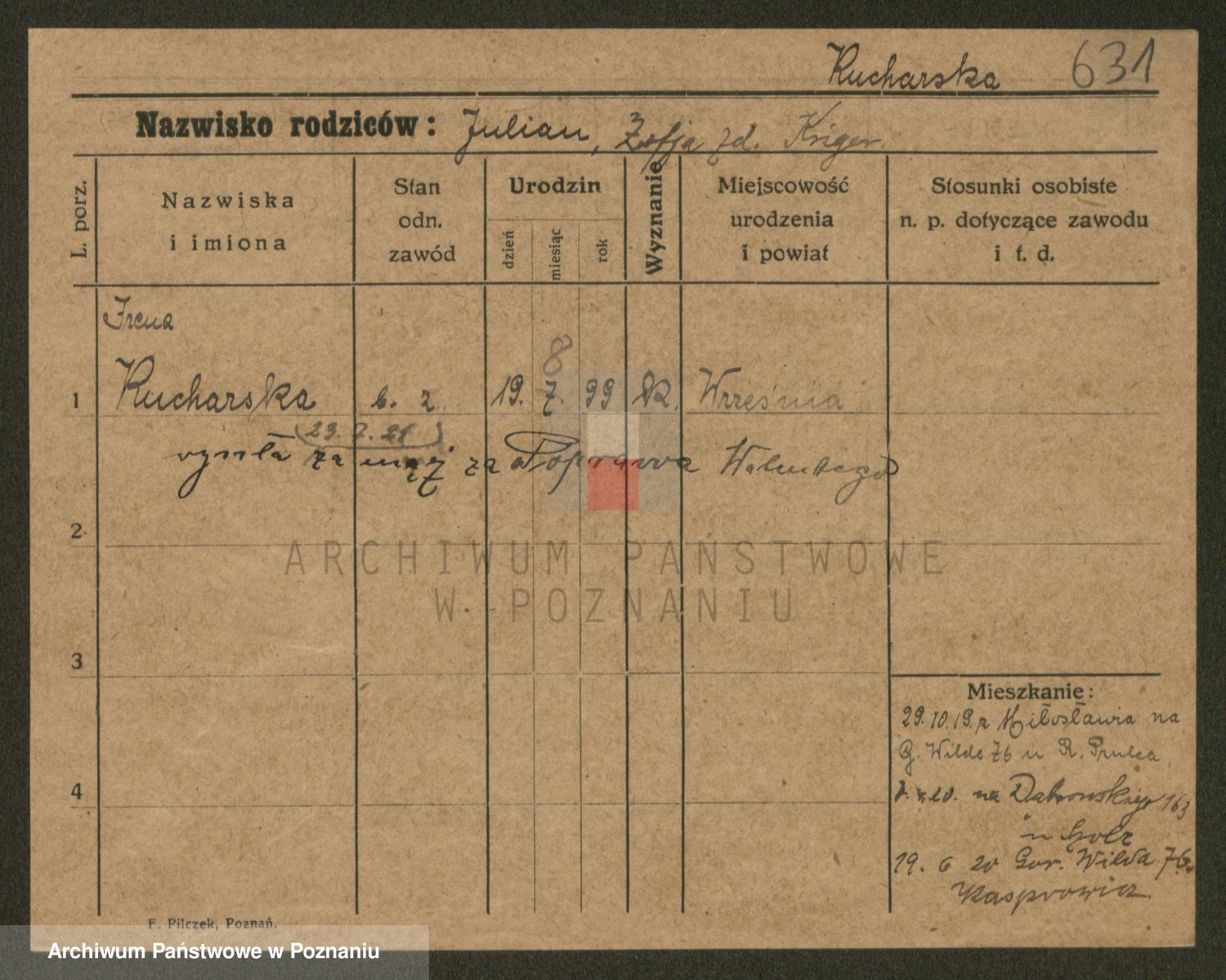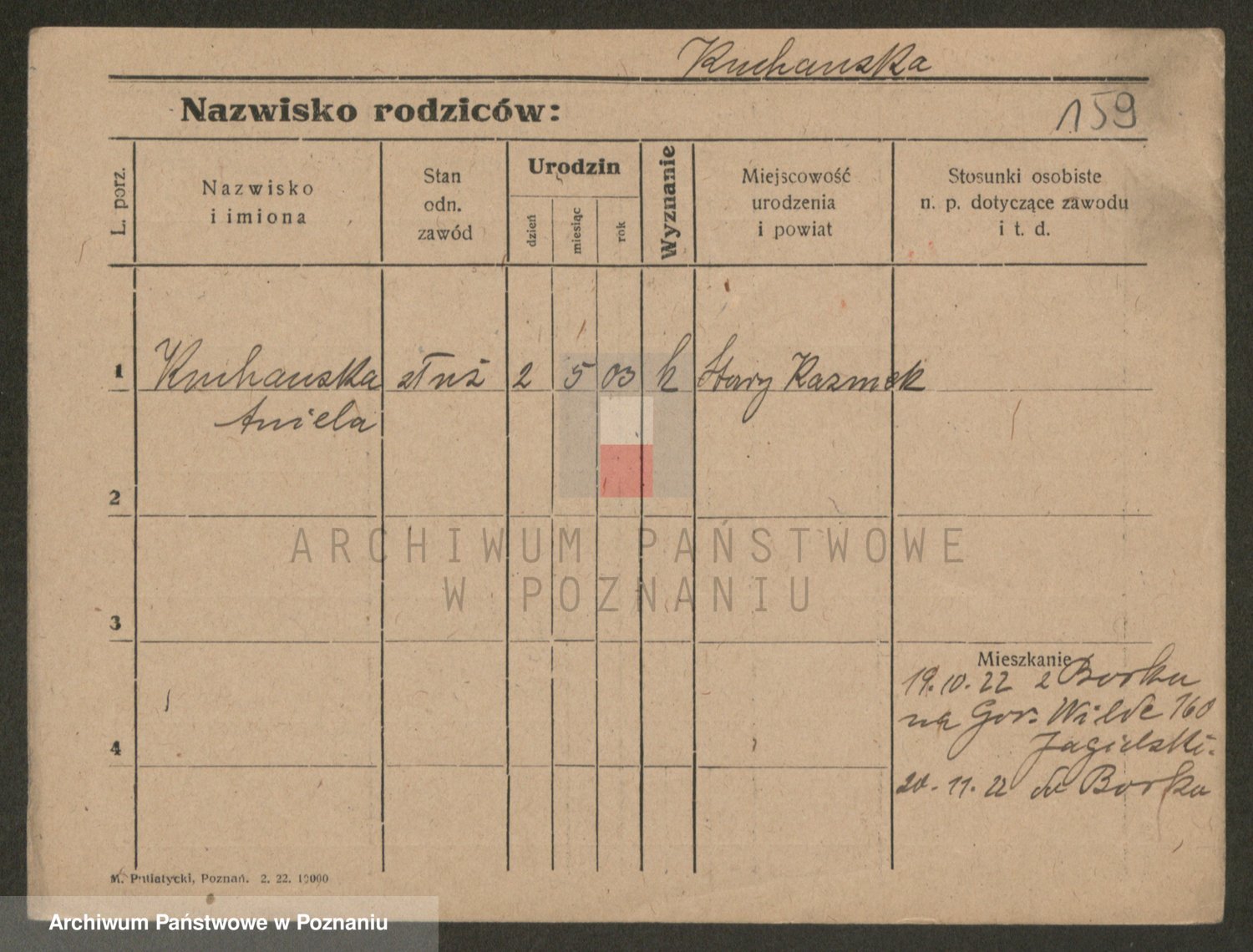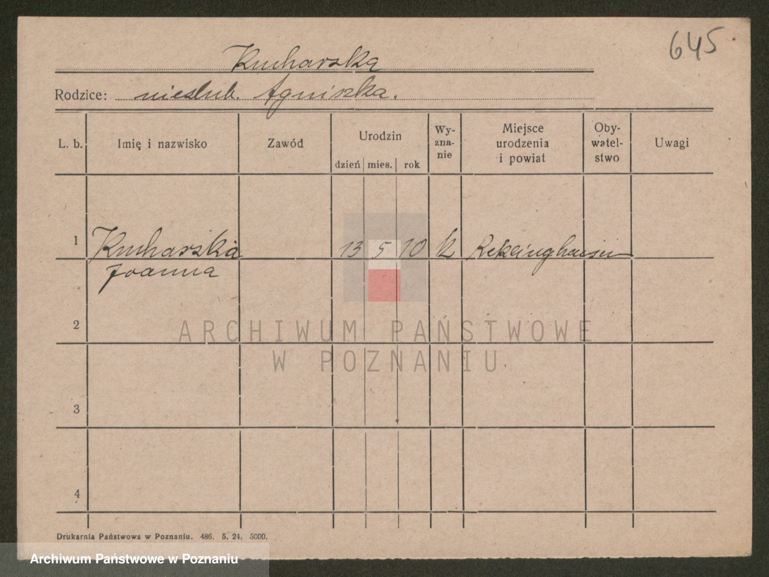 Podgląd karty osobowej dostępny jest po kliknięciu na nazwisko lub ikonkę karty. Można dokonywać powiększenia (ikony na górze) lub przechodzić między kolejnymi skanami (strzałki po bokach).