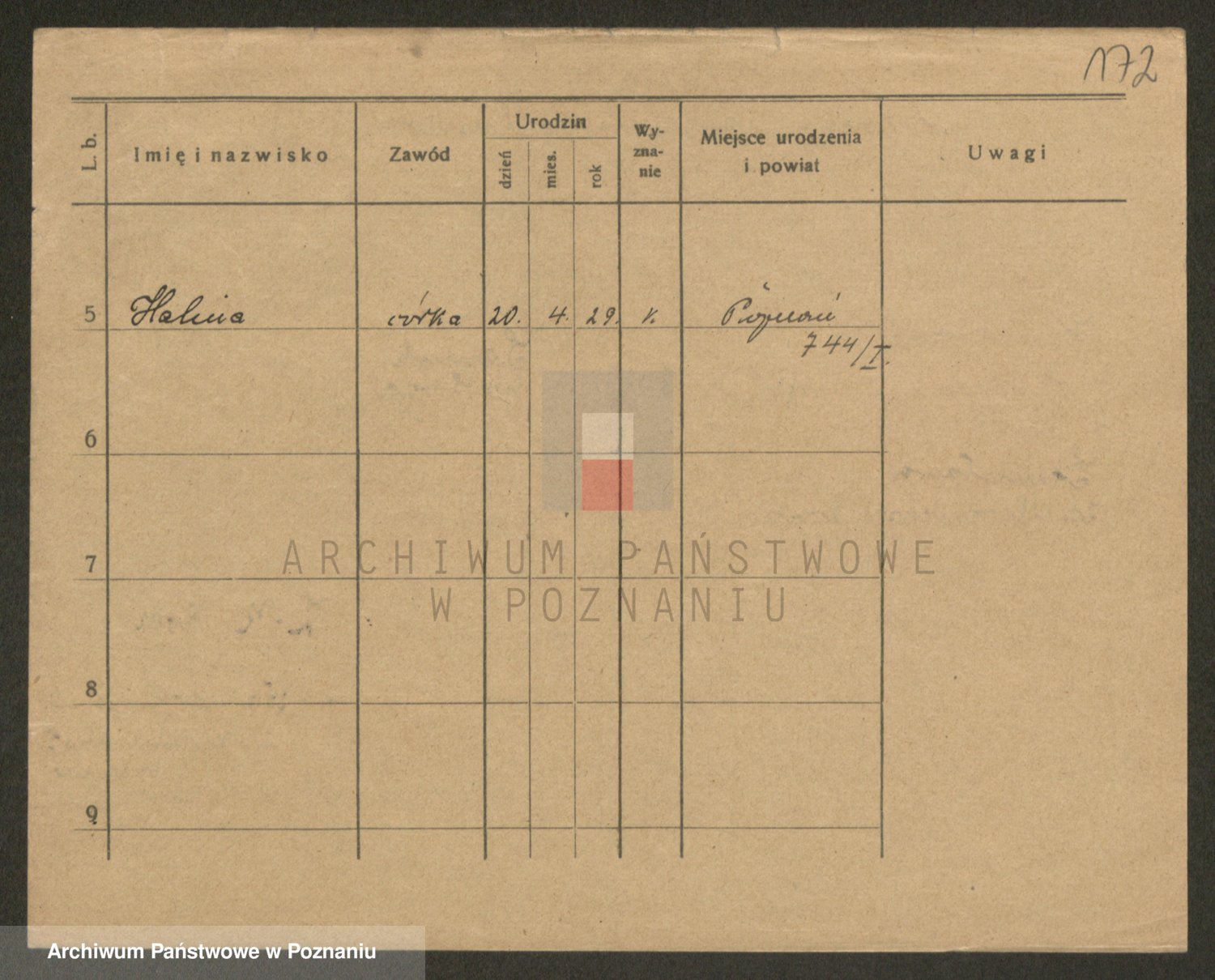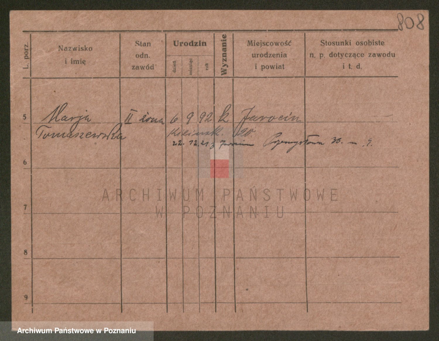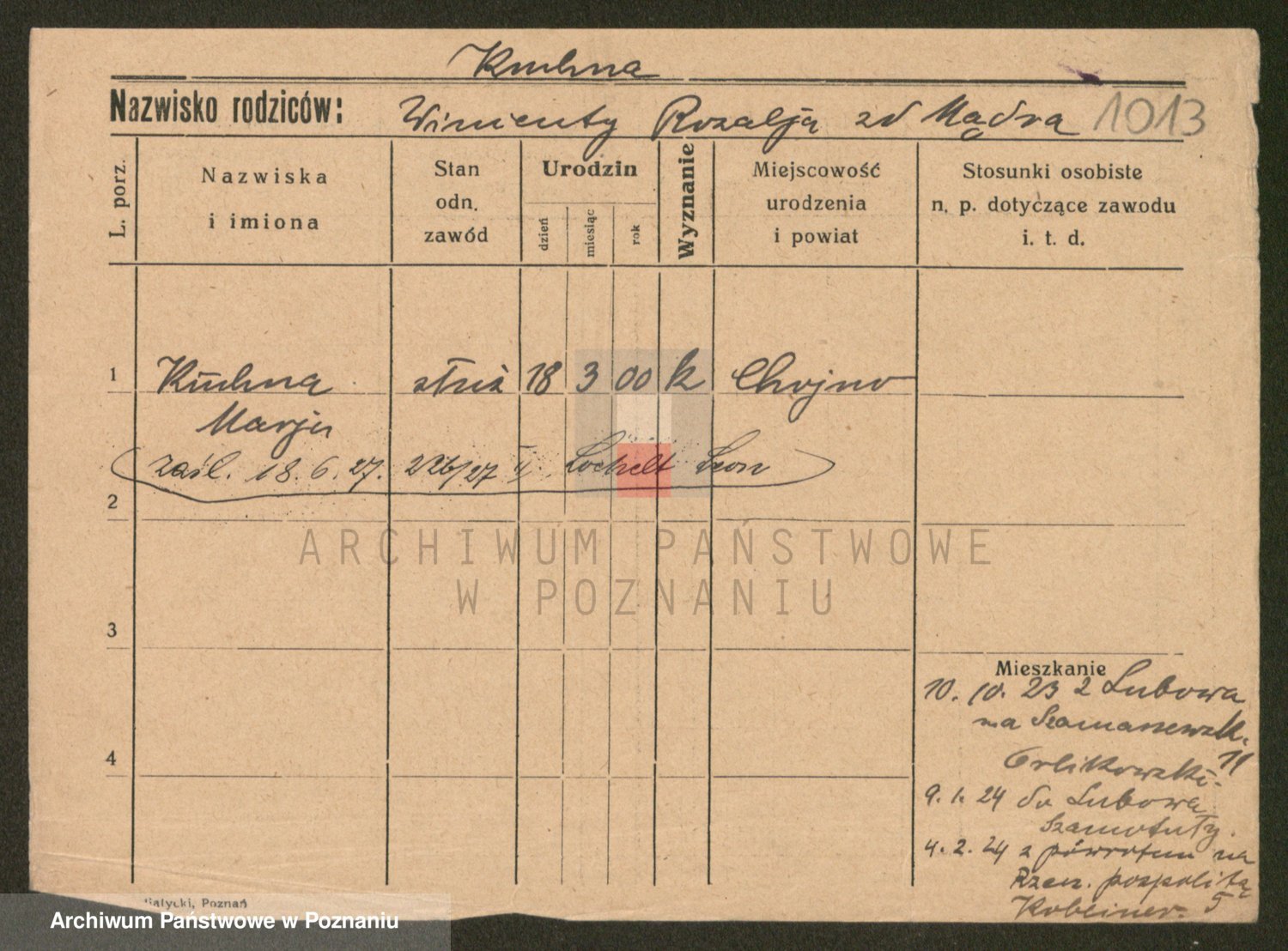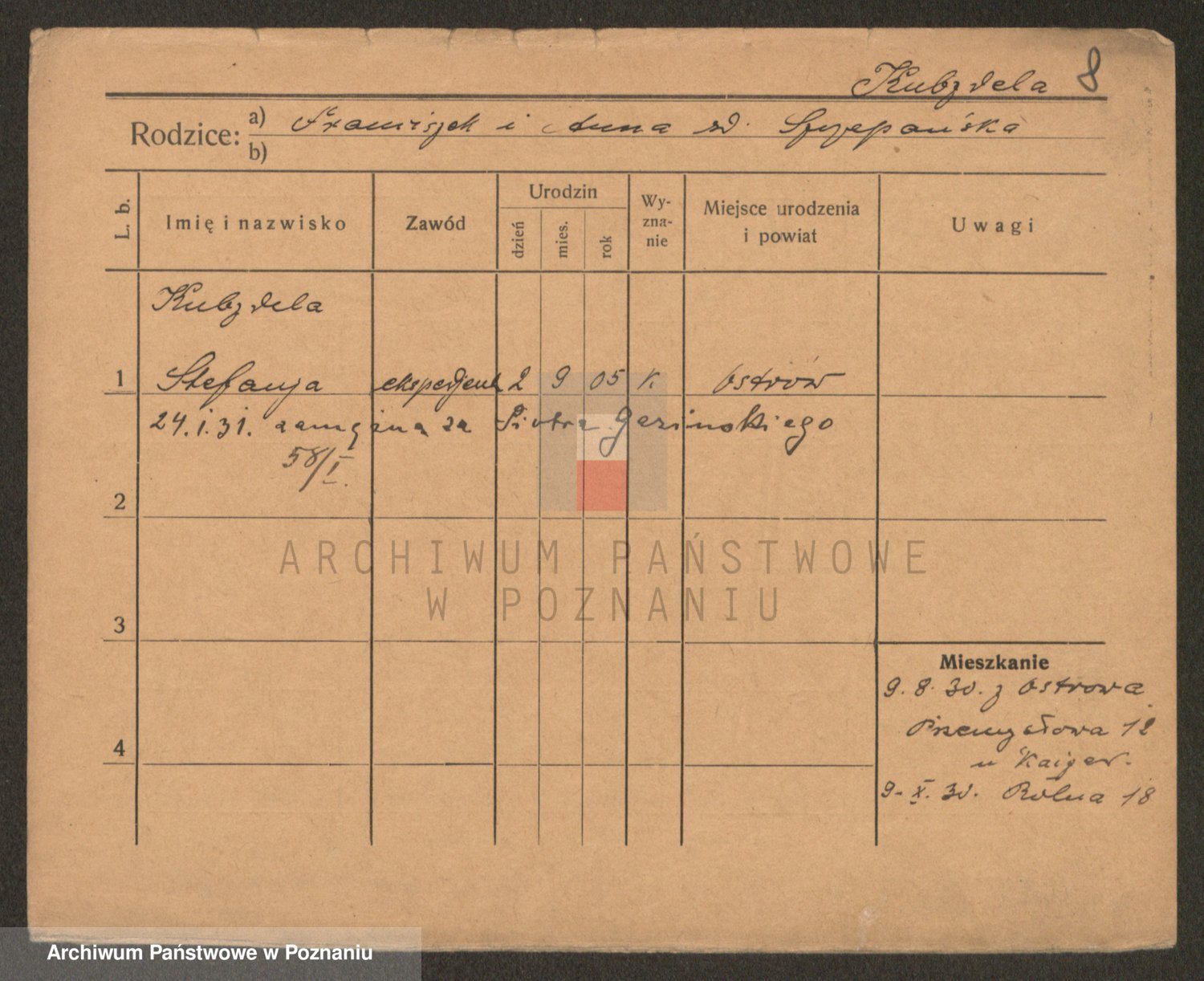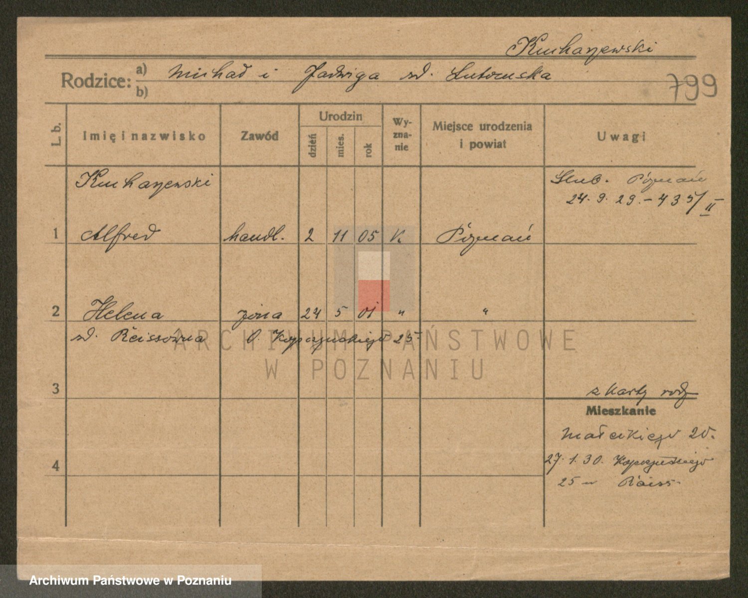 Podgląd karty osobowej dostępny jest po kliknięciu na nazwisko lub ikonkę karty. Można dokonywać powiększenia (ikony na górze) lub przechodzić między kolejnymi skanami (strzałki po bokach).