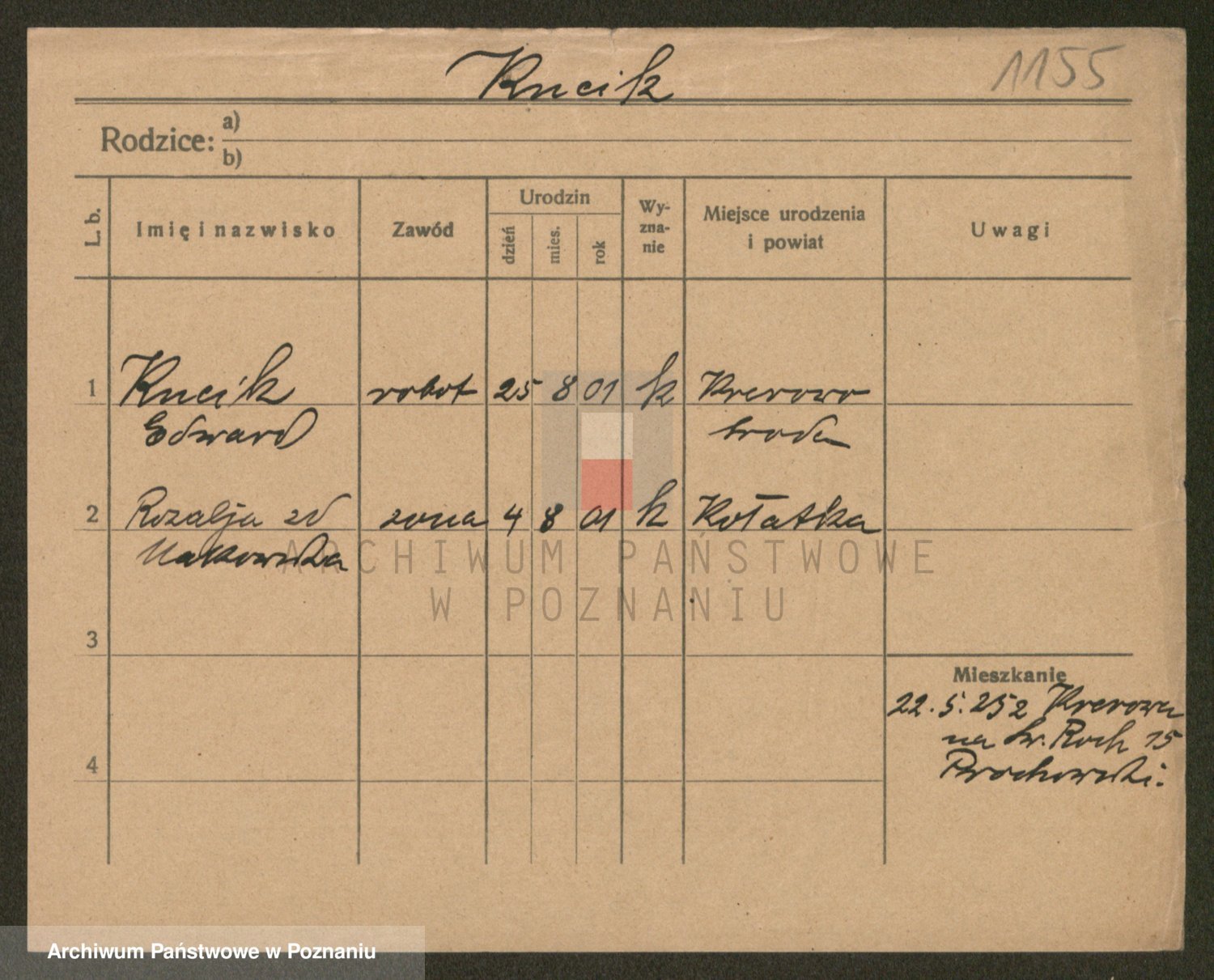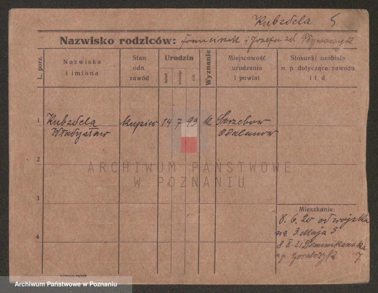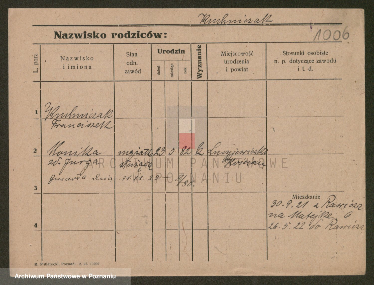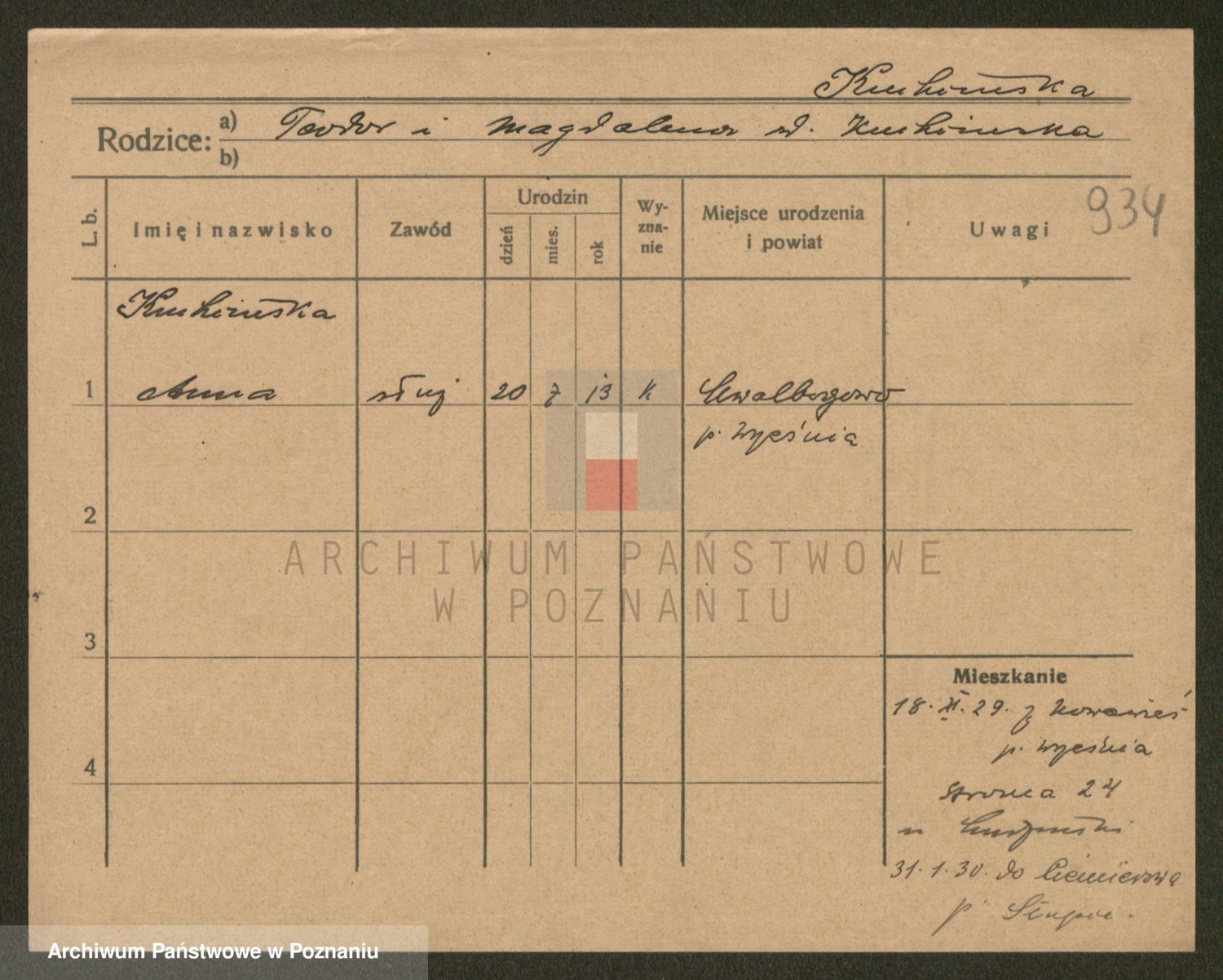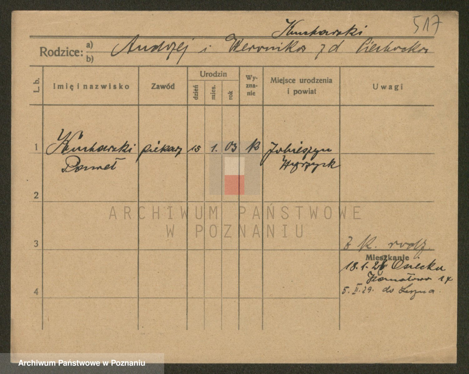 Podgląd karty osobowej dostępny jest po kliknięciu na nazwisko lub ikonkę karty. Można dokonywać powiększenia (ikony na górze) lub przechodzić między kolejnymi skanami (strzałki po bokach).