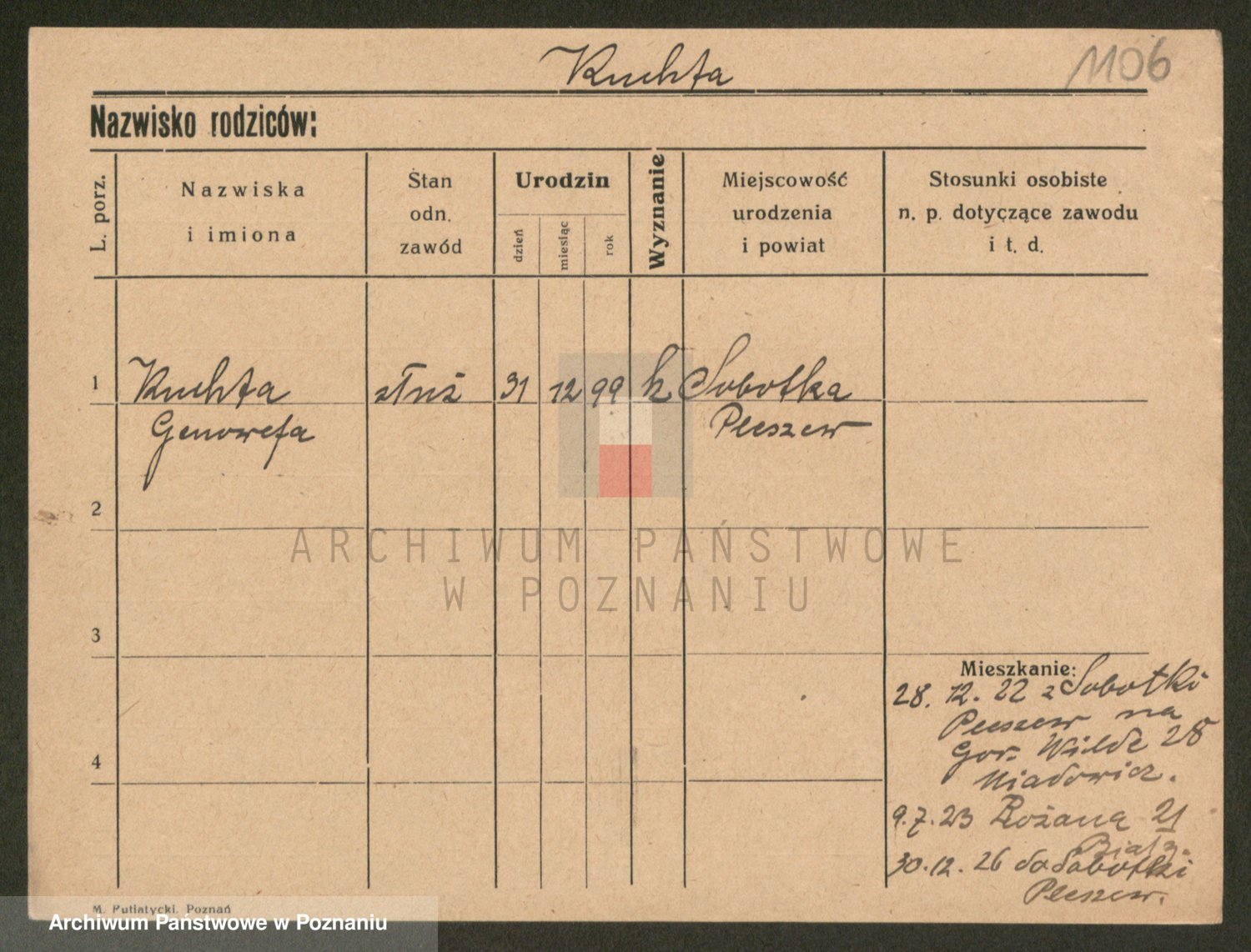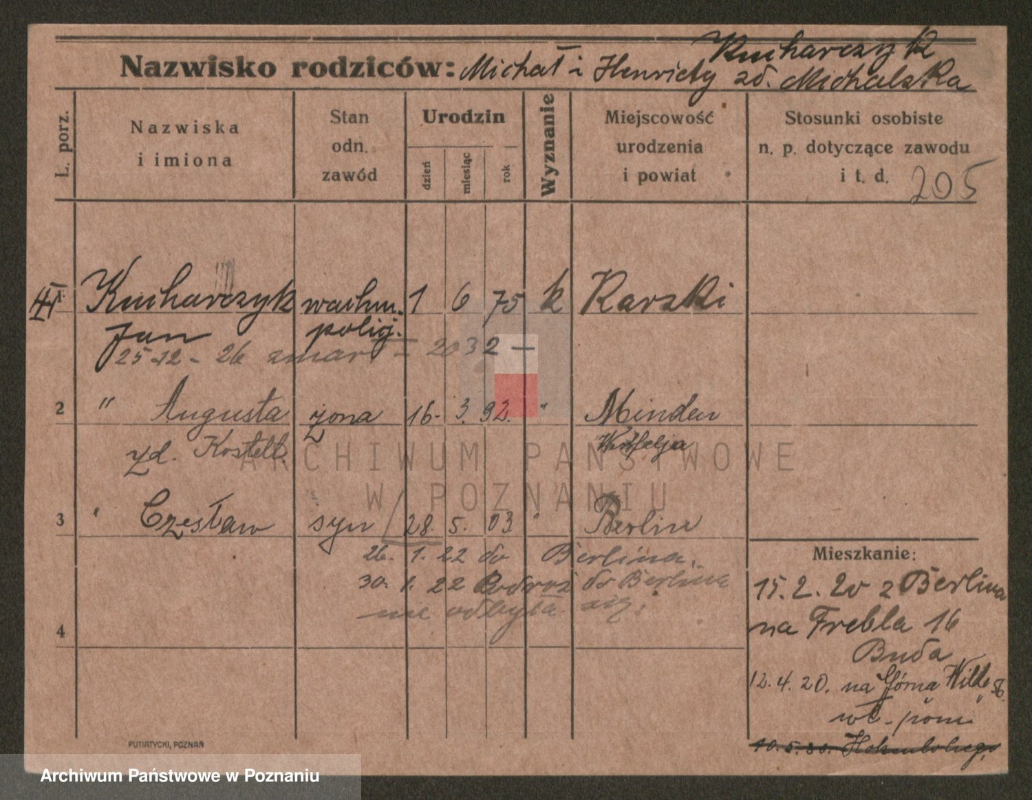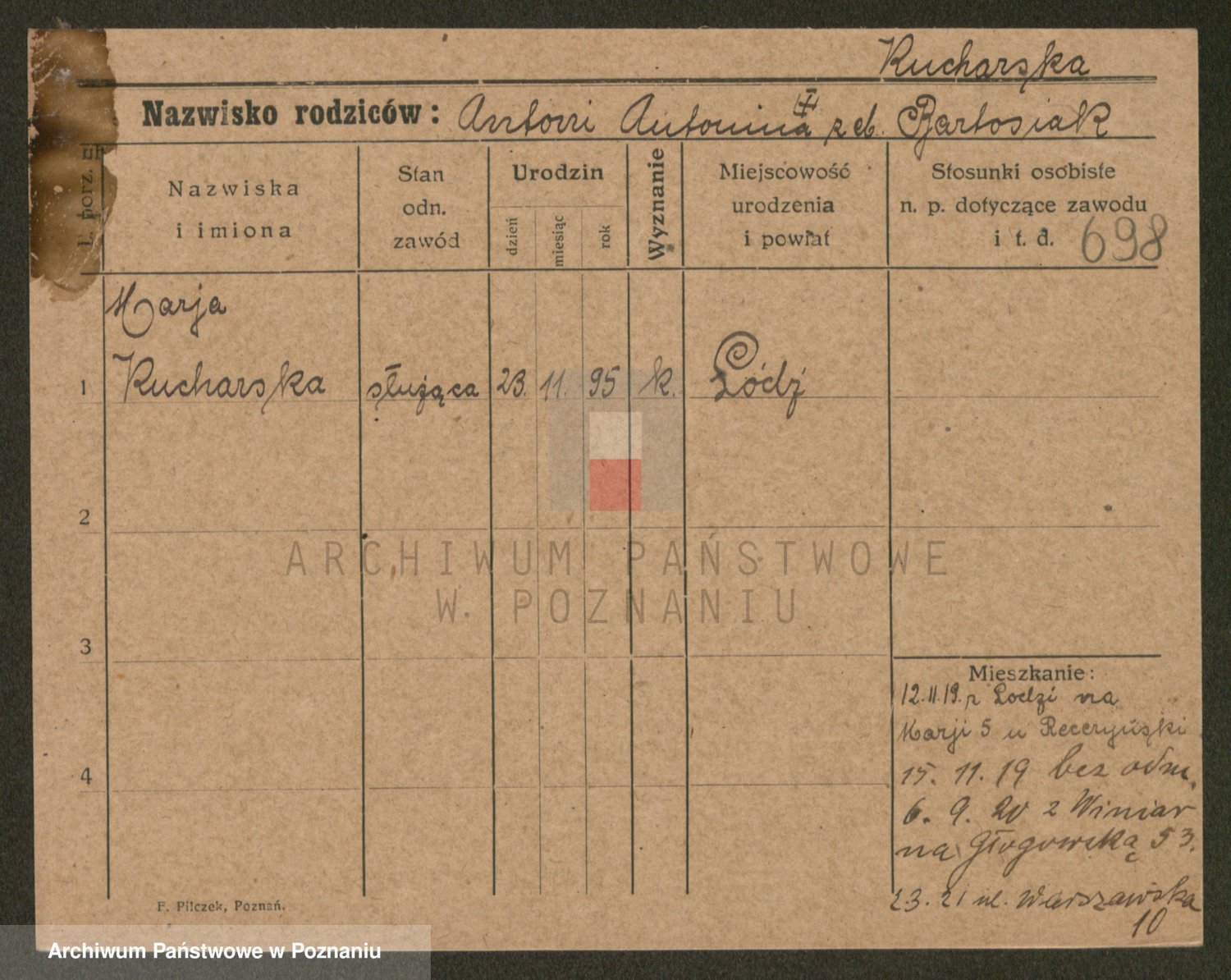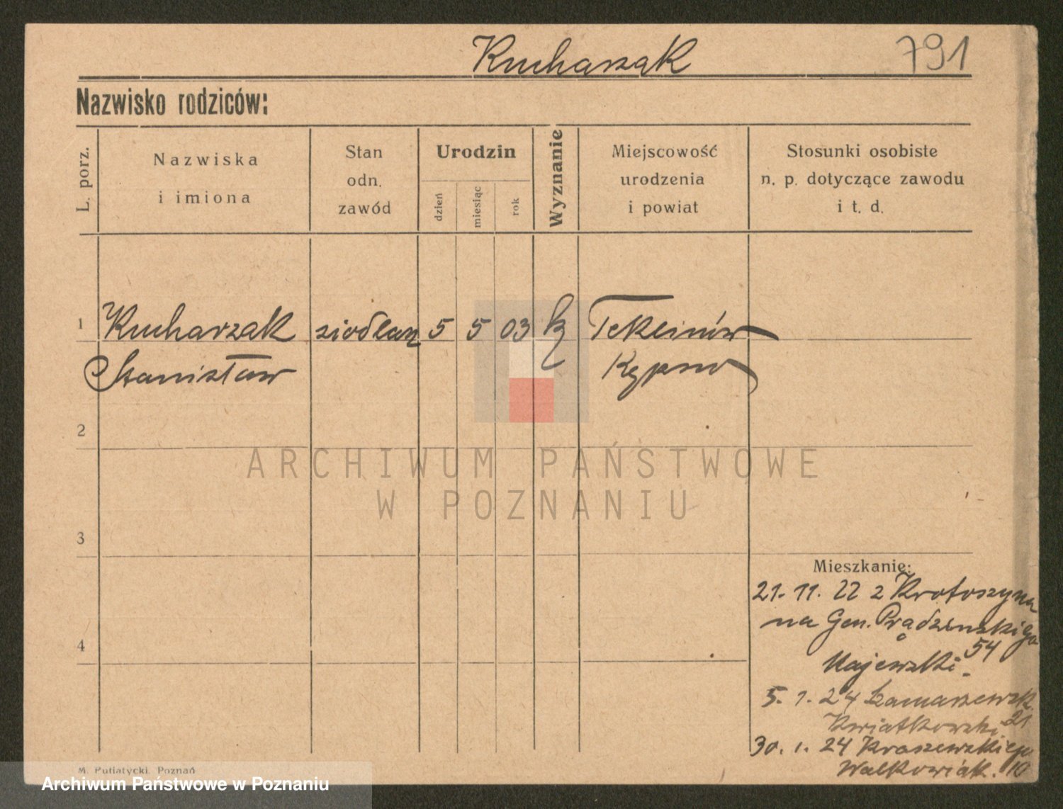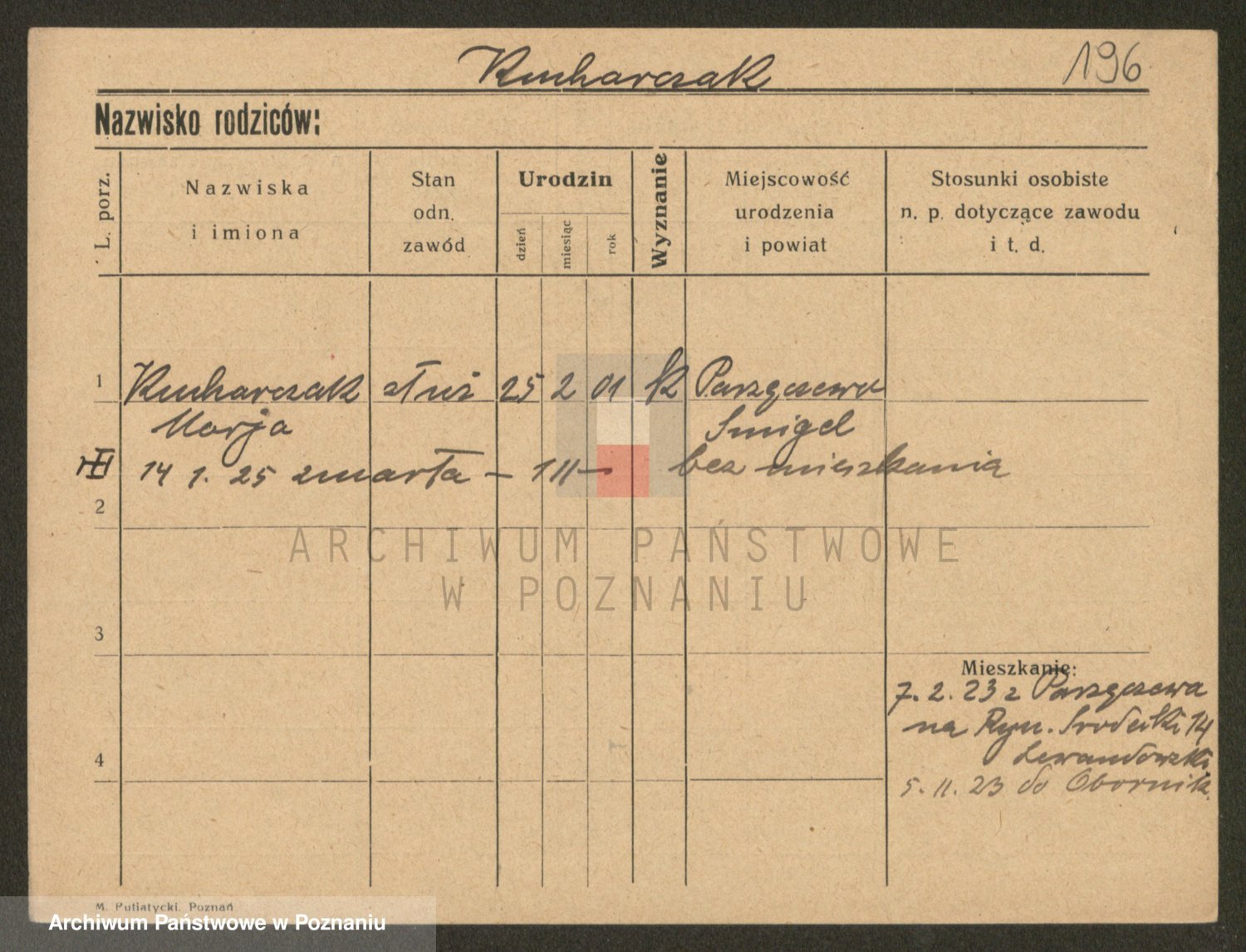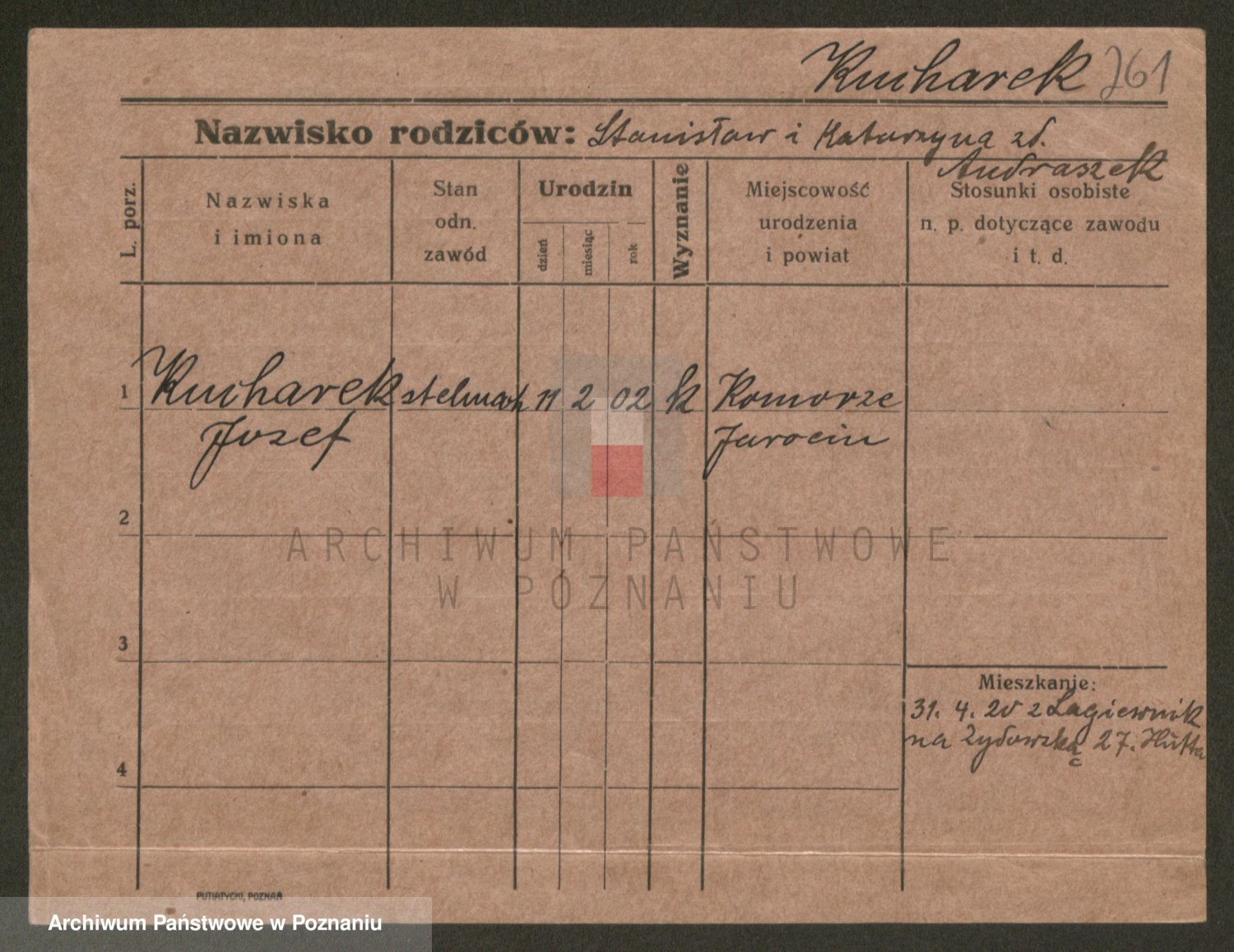 Podgląd karty osobowej dostępny jest po kliknięciu na nazwisko lub ikonkę karty. Można dokonywać powiększenia (ikony na górze) lub przechodzić między kolejnymi skanami (strzałki po bokach).