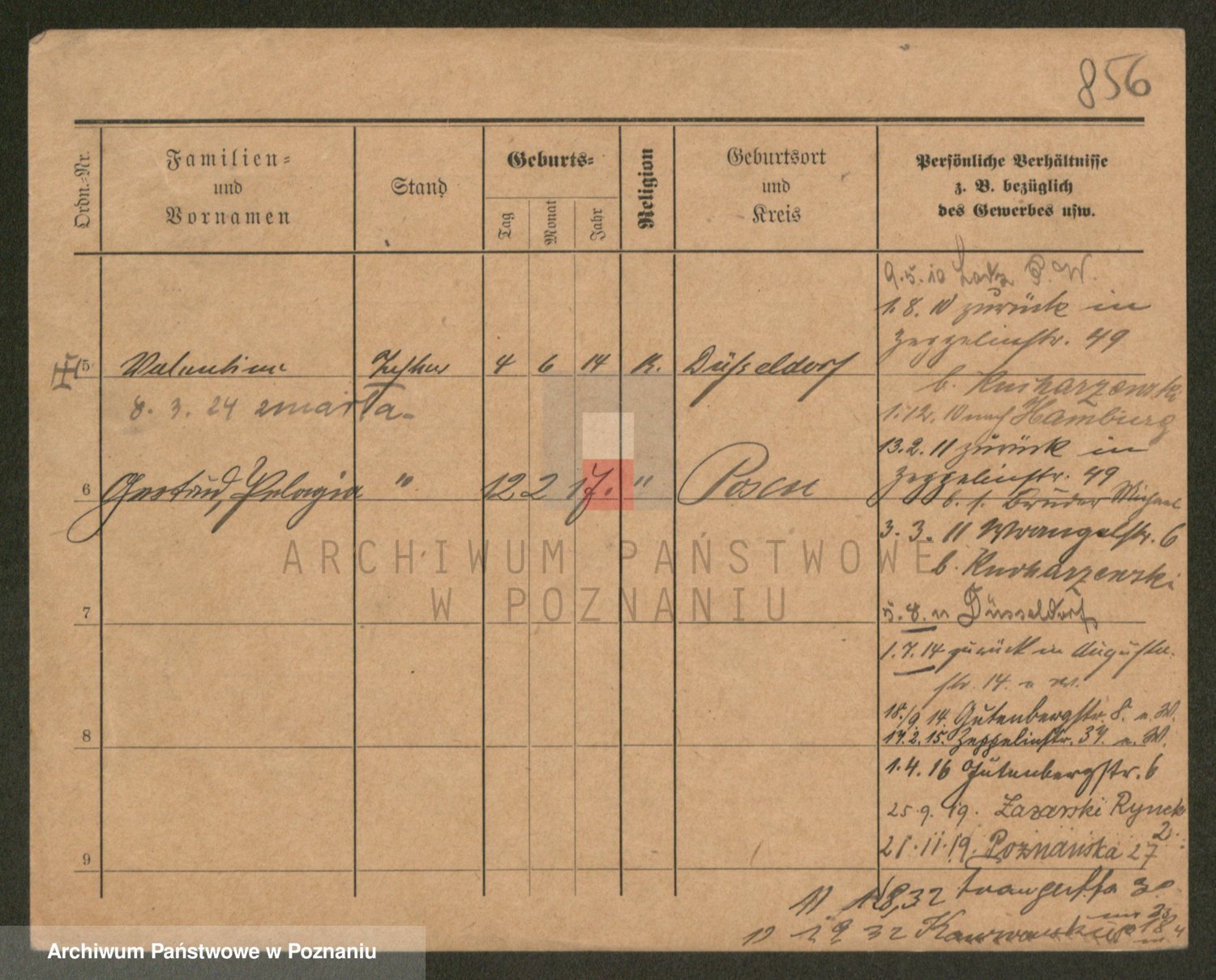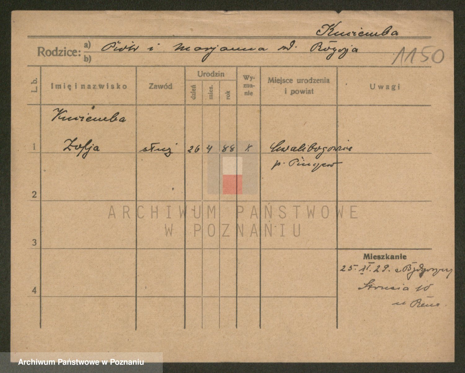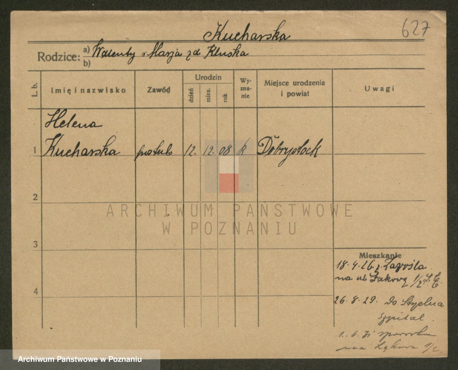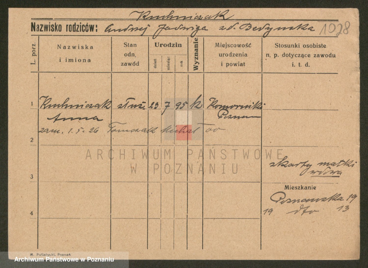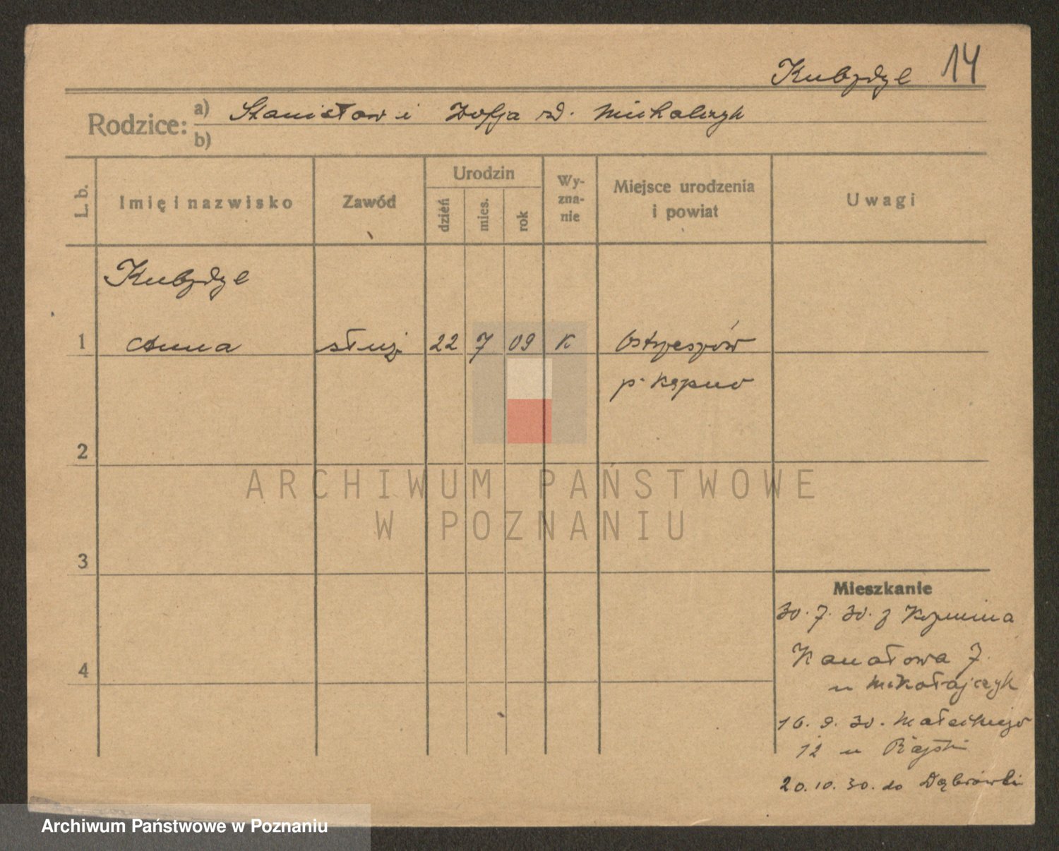 Podgląd karty osobowej dostępny jest po kliknięciu na nazwisko lub ikonkę karty. Można dokonywać powiększenia (ikony na górze) lub przechodzić między kolejnymi skanami (strzałki po bokach).
