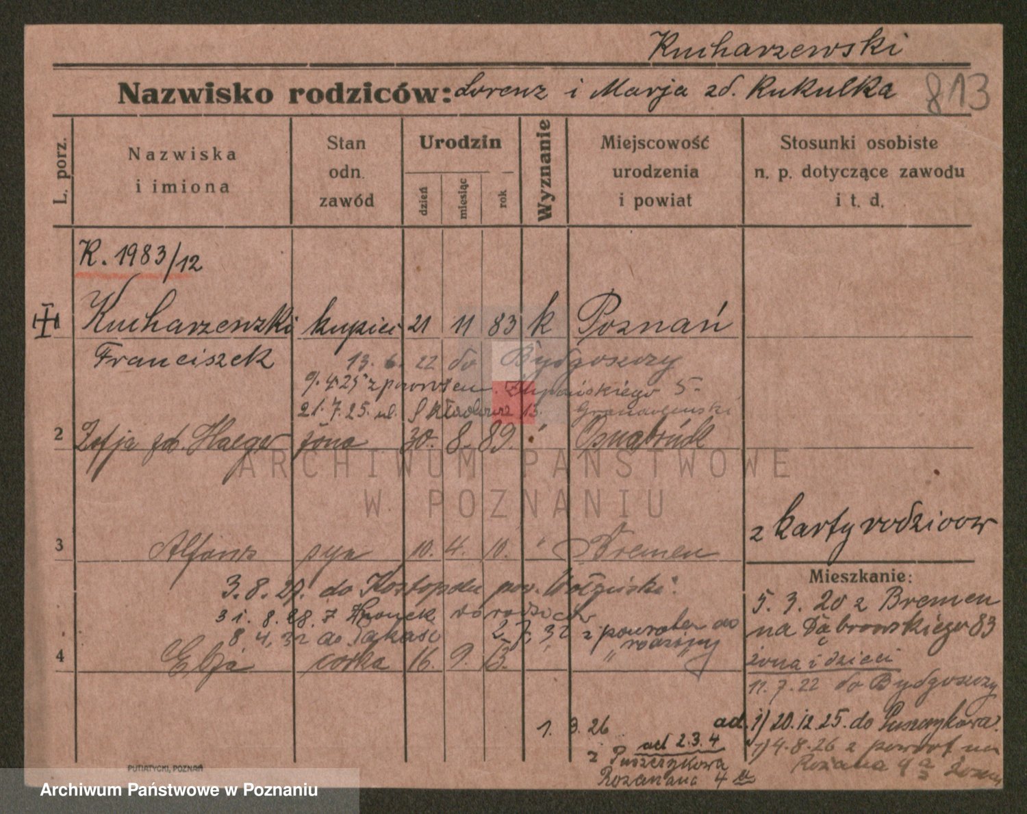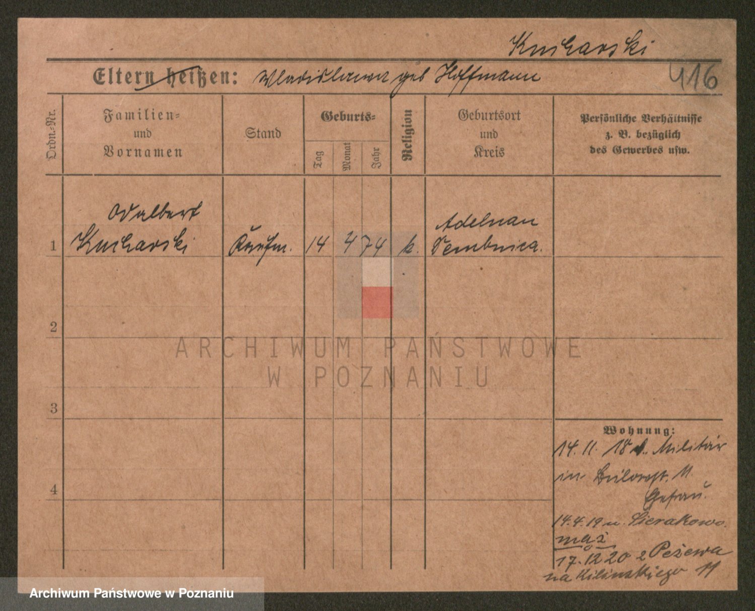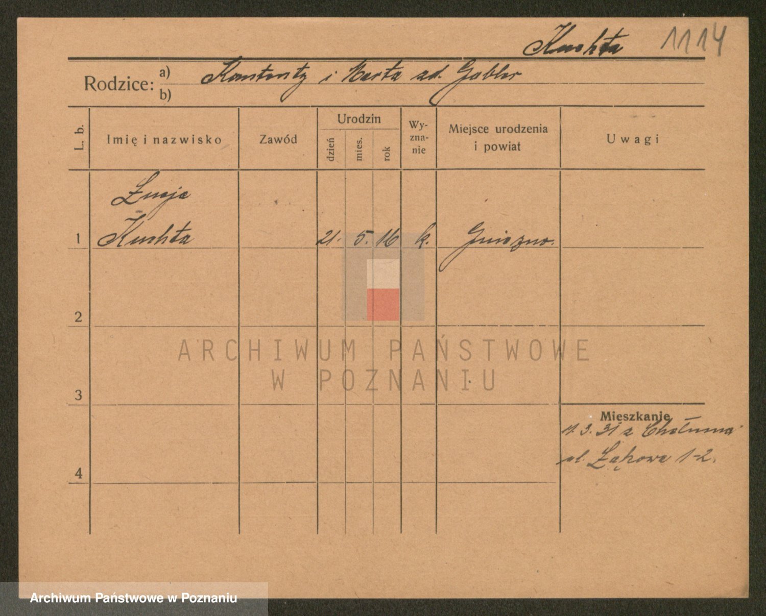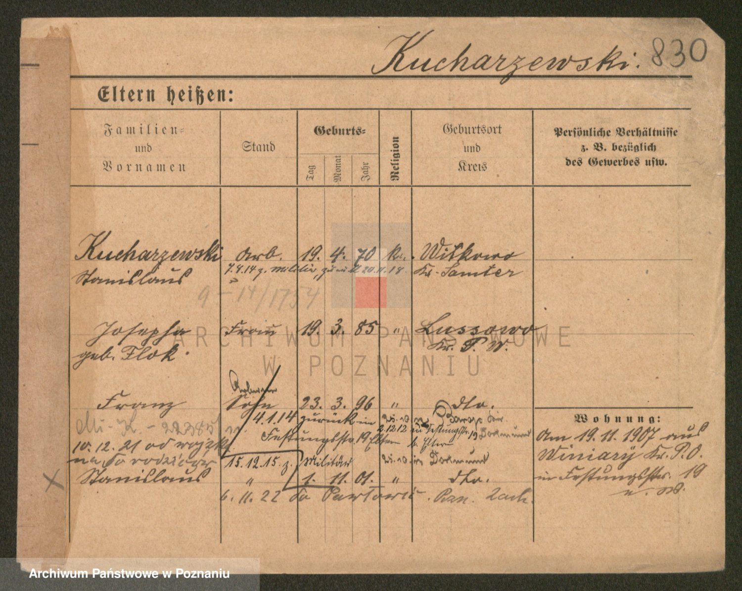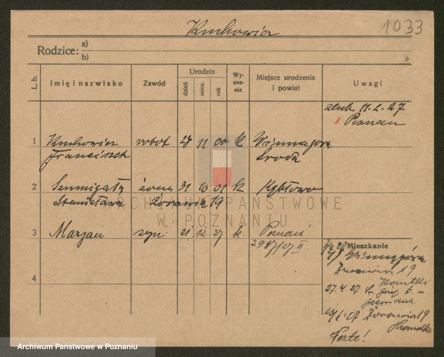 Podgląd karty osobowej dostępny jest po kliknięciu na nazwisko lub ikonkę karty. Można dokonywać powiększenia (ikony na górze) lub przechodzić między kolejnymi skanami (strzałki po bokach).