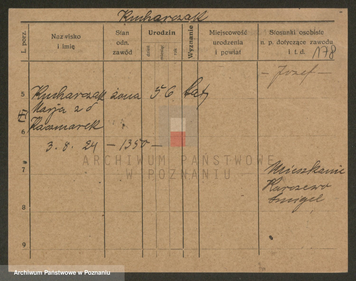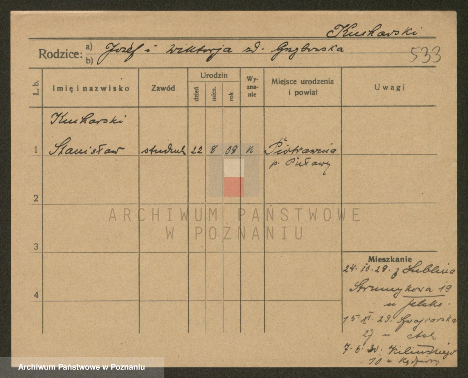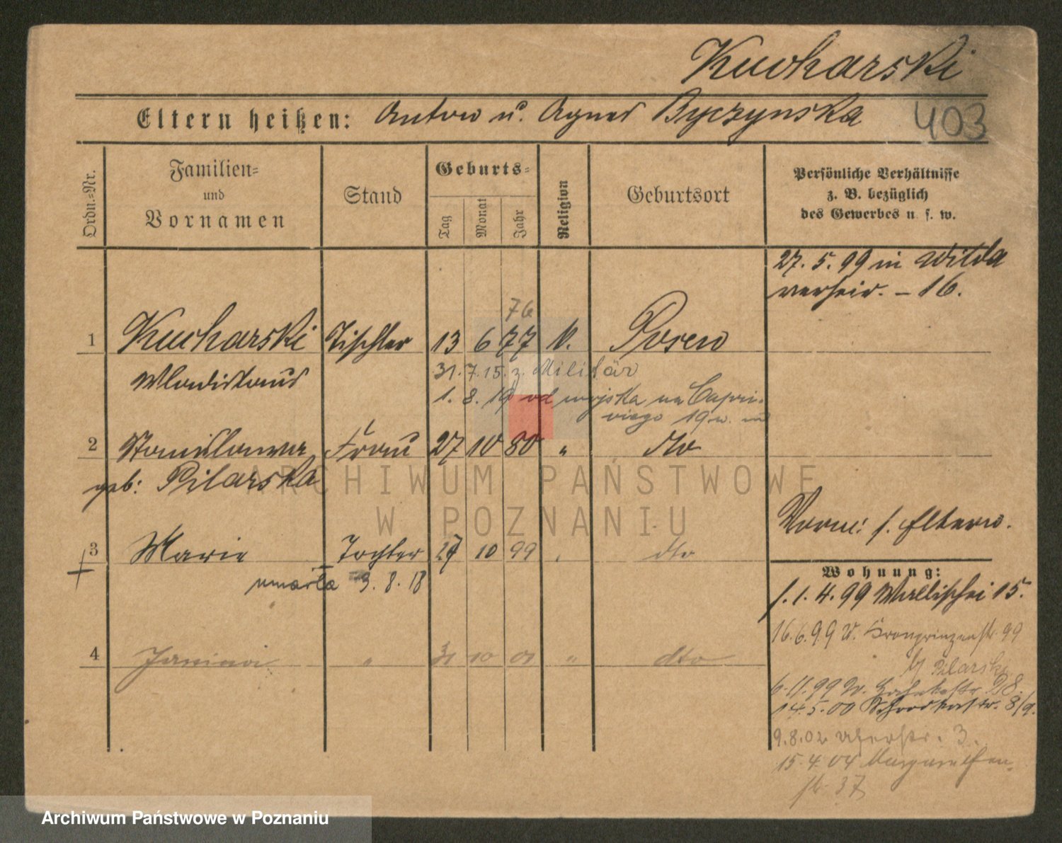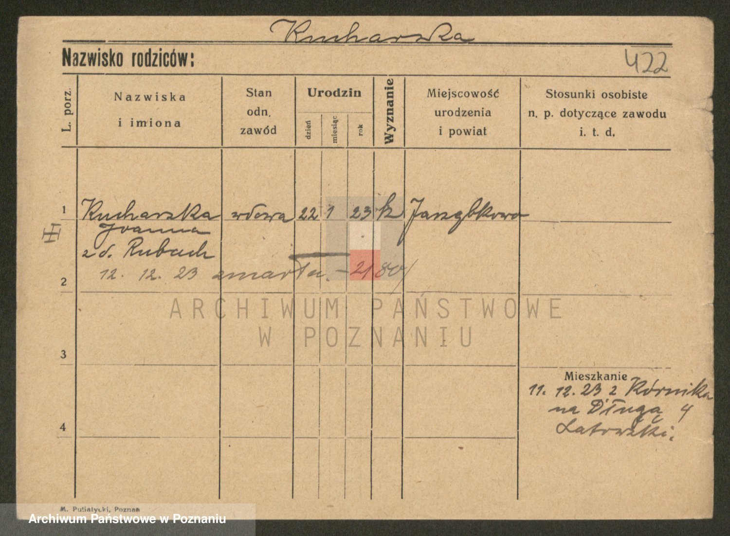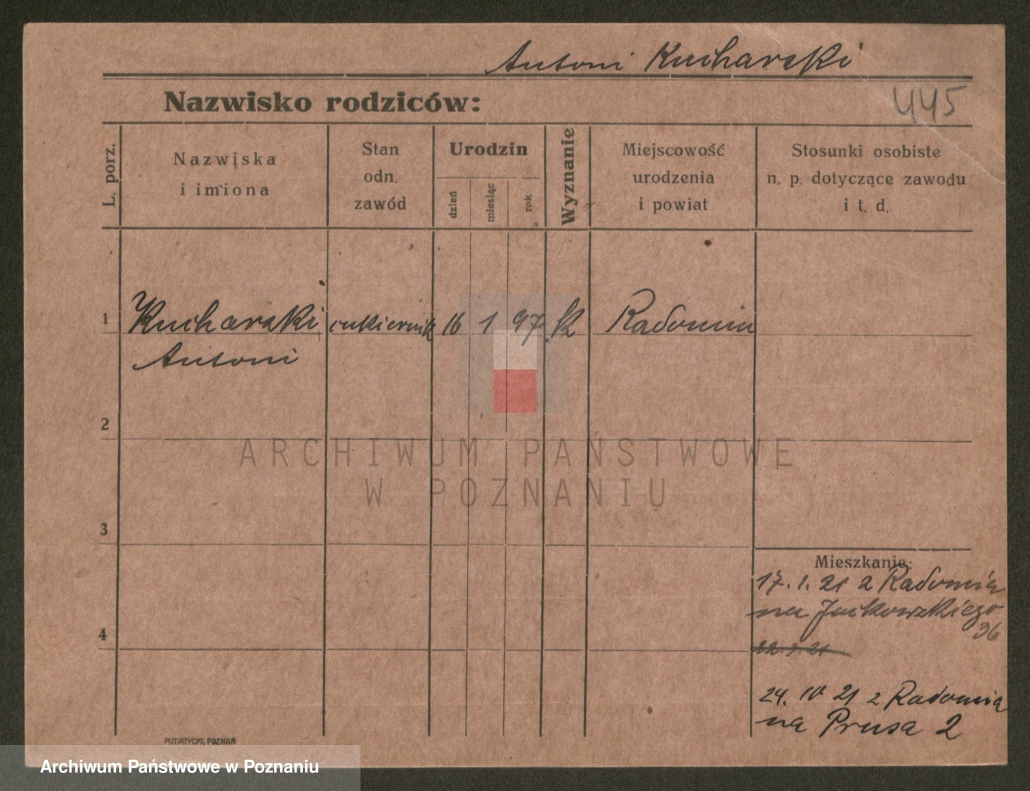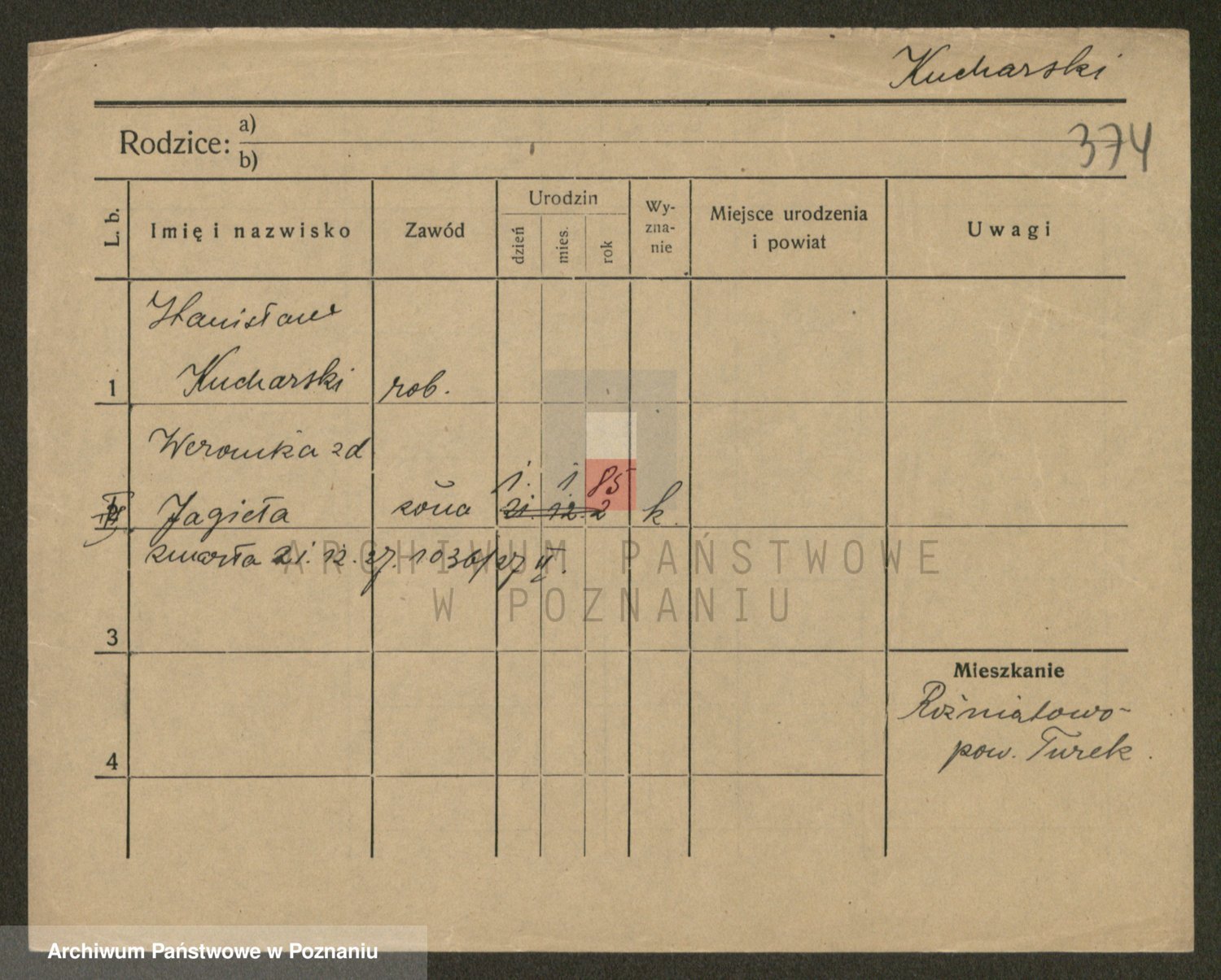 Podgląd karty osobowej dostępny jest po kliknięciu na nazwisko lub ikonkę karty. Można dokonywać powiększenia (ikony na górze) lub przechodzić między kolejnymi skanami (strzałki po bokach).