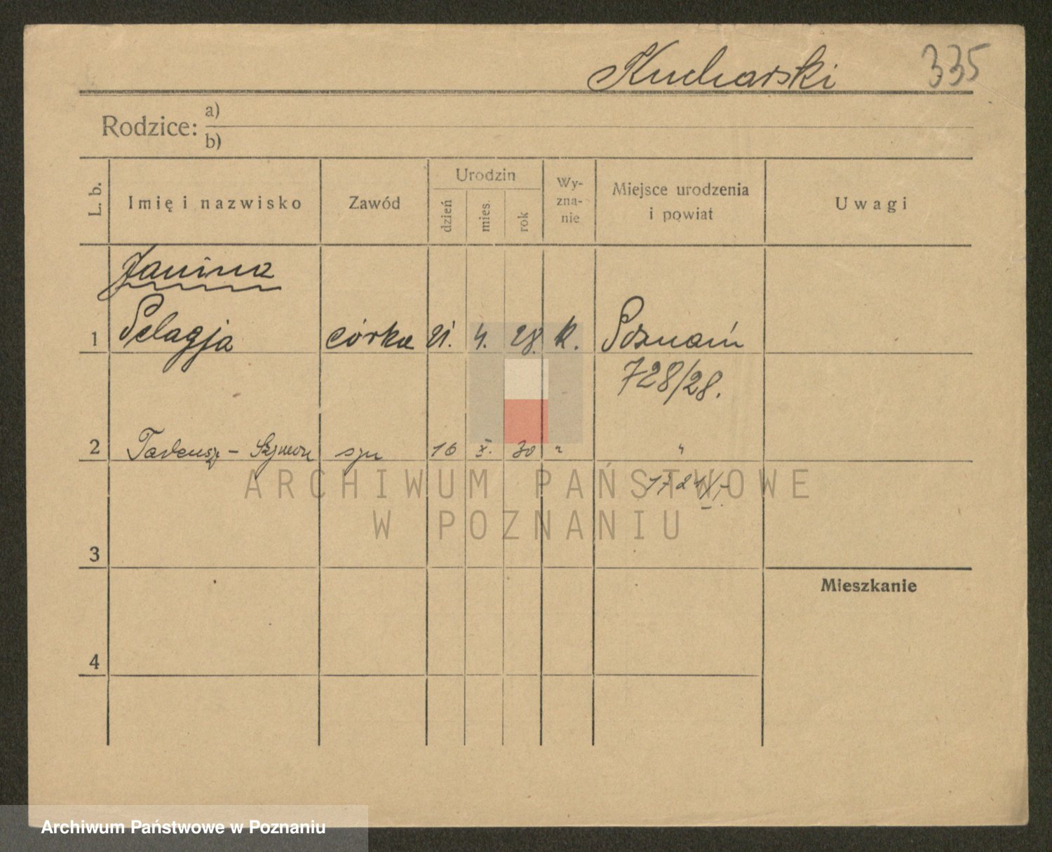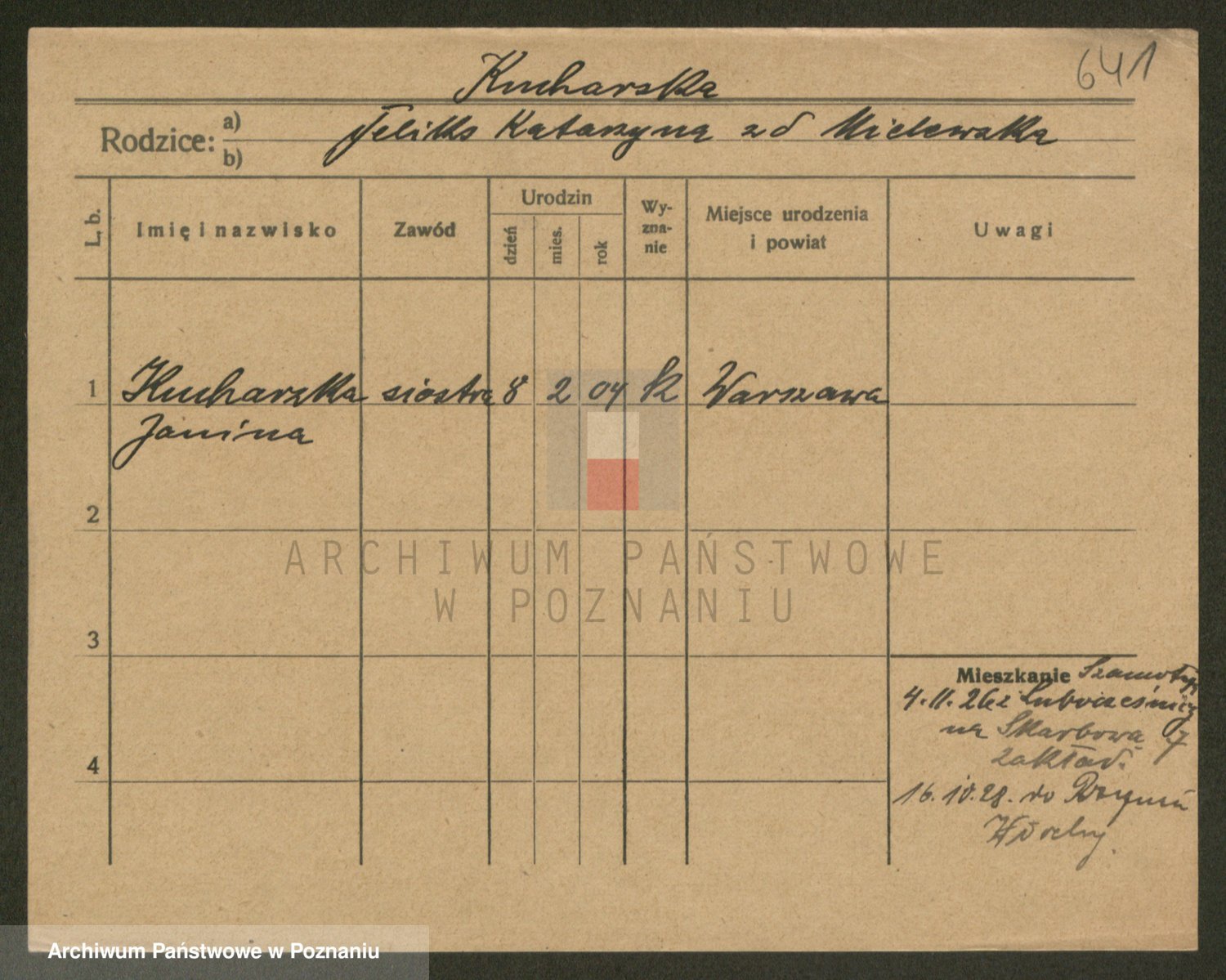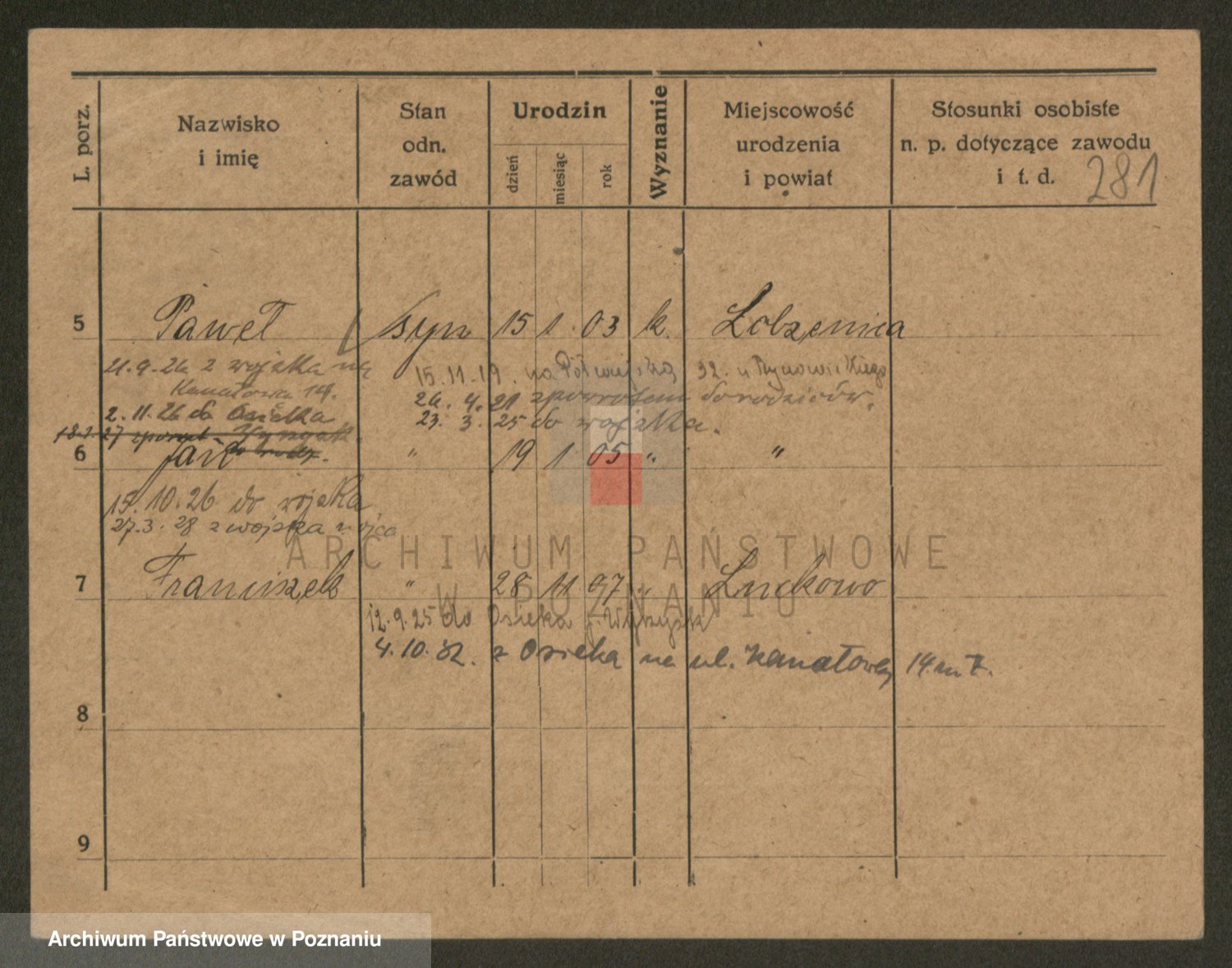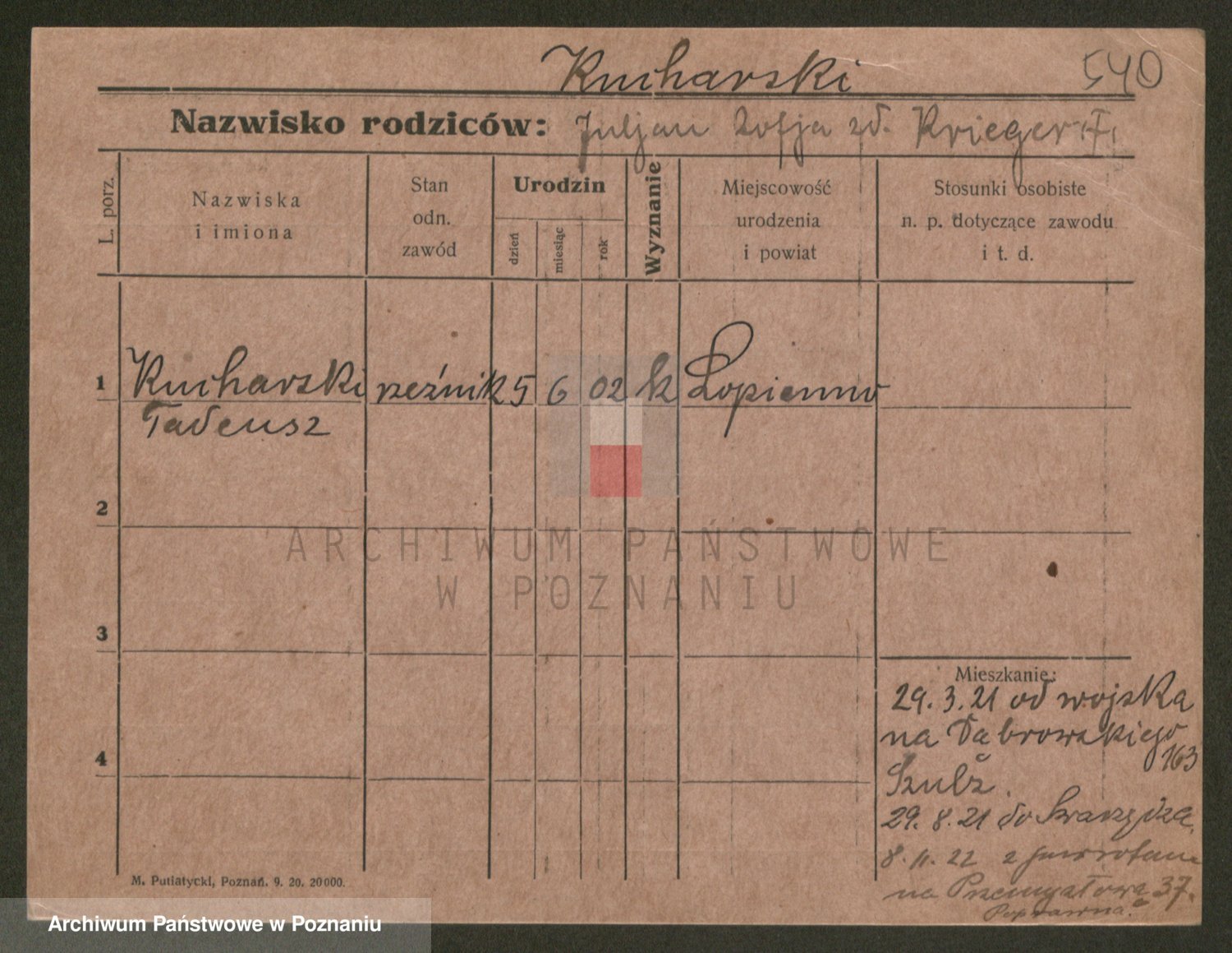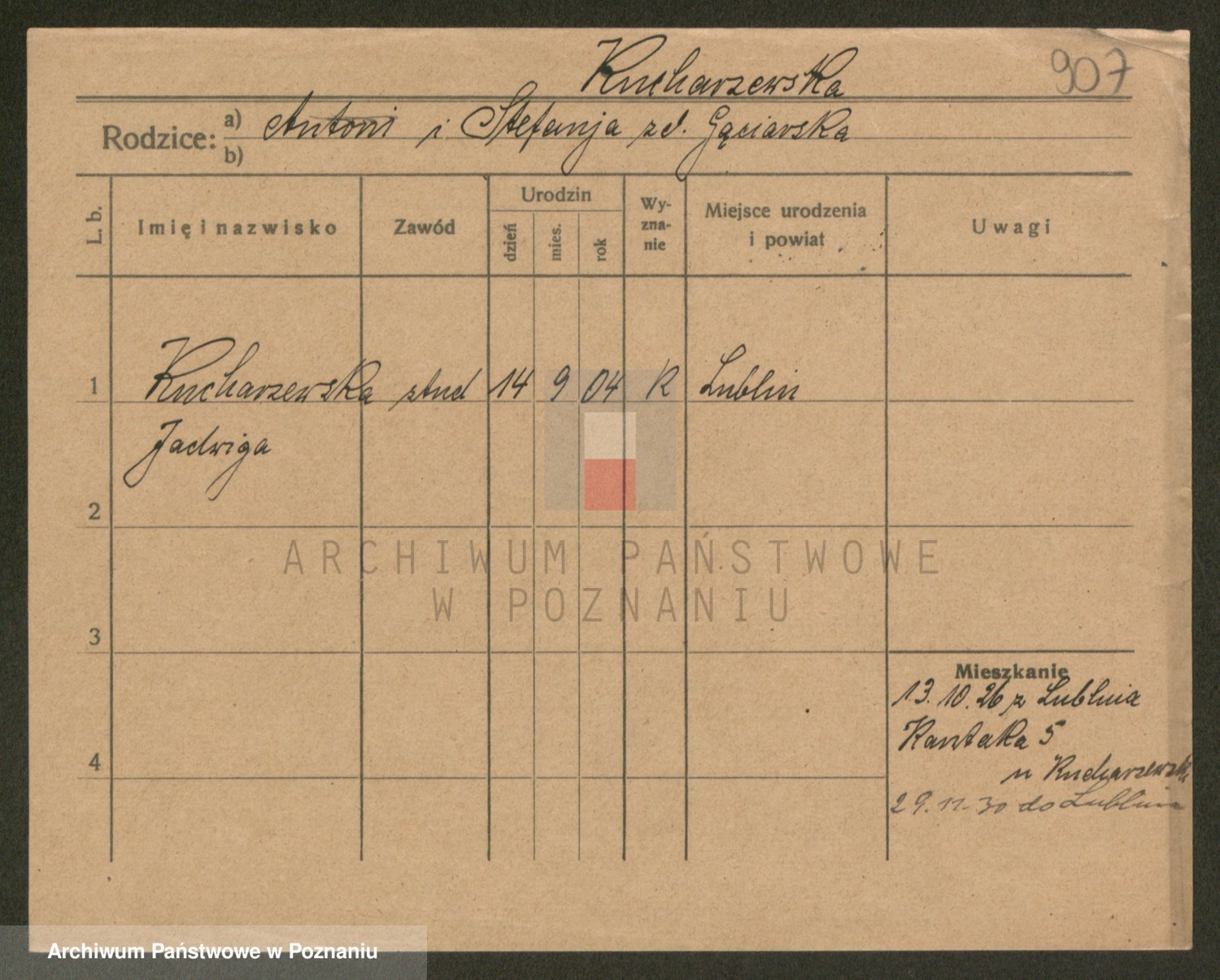 Podgląd karty osobowej dostępny jest po kliknięciu na nazwisko lub ikonkę karty. Można dokonywać powiększenia (ikony na górze) lub przechodzić między kolejnymi skanami (strzałki po bokach).