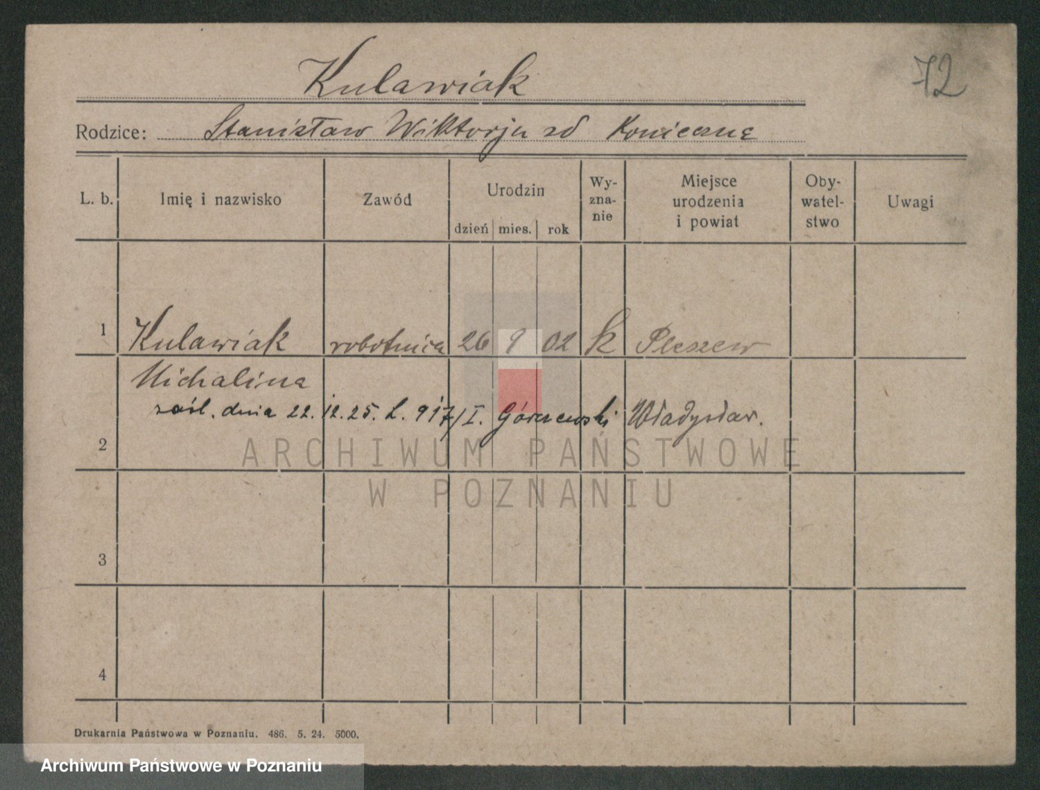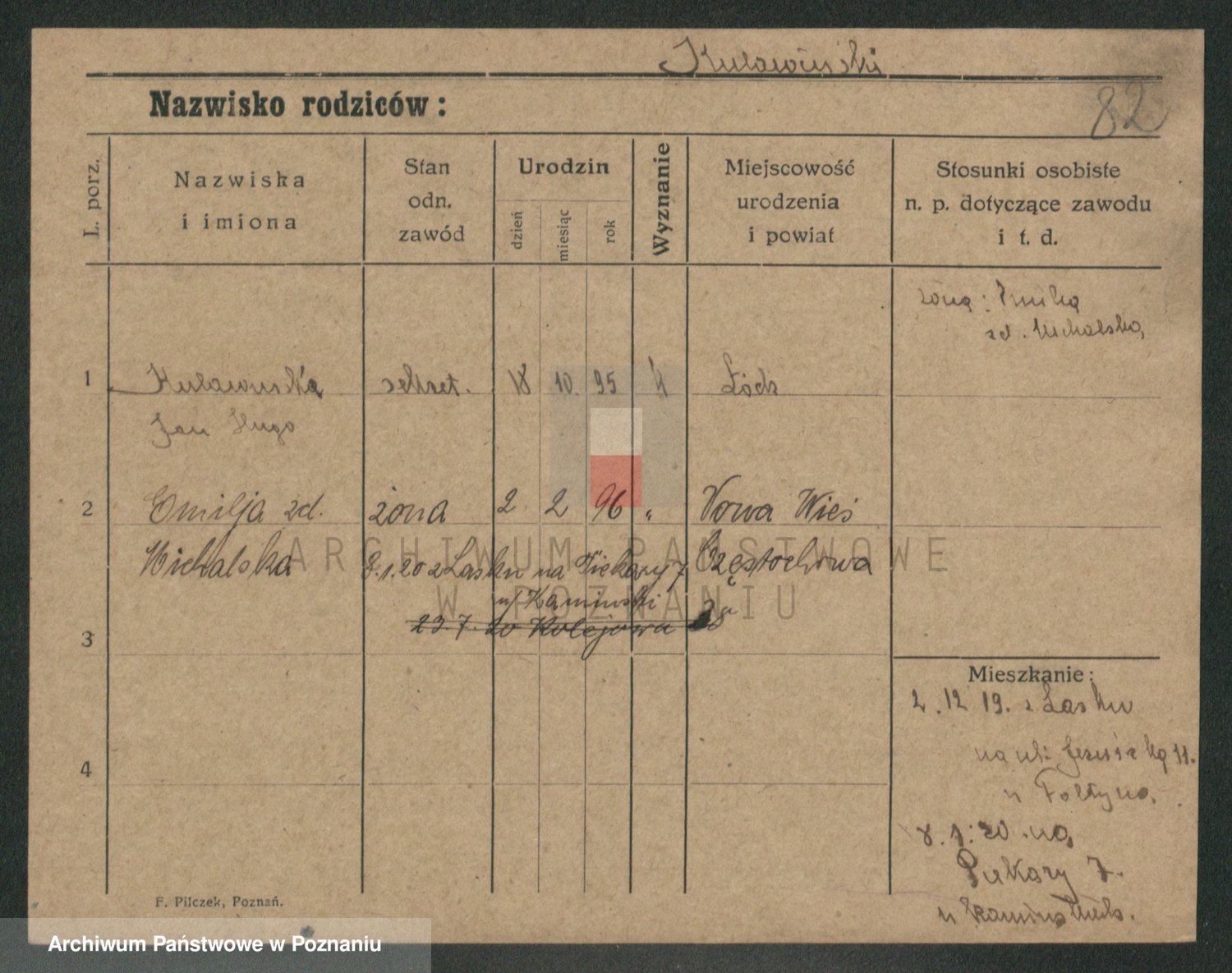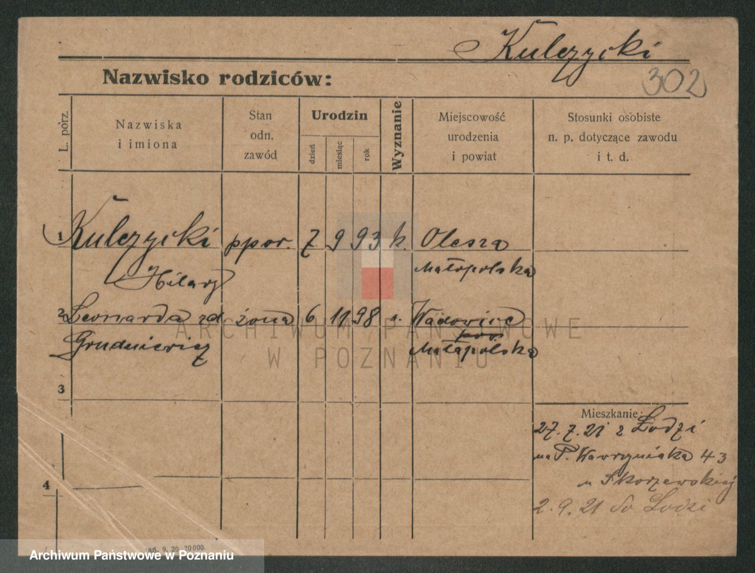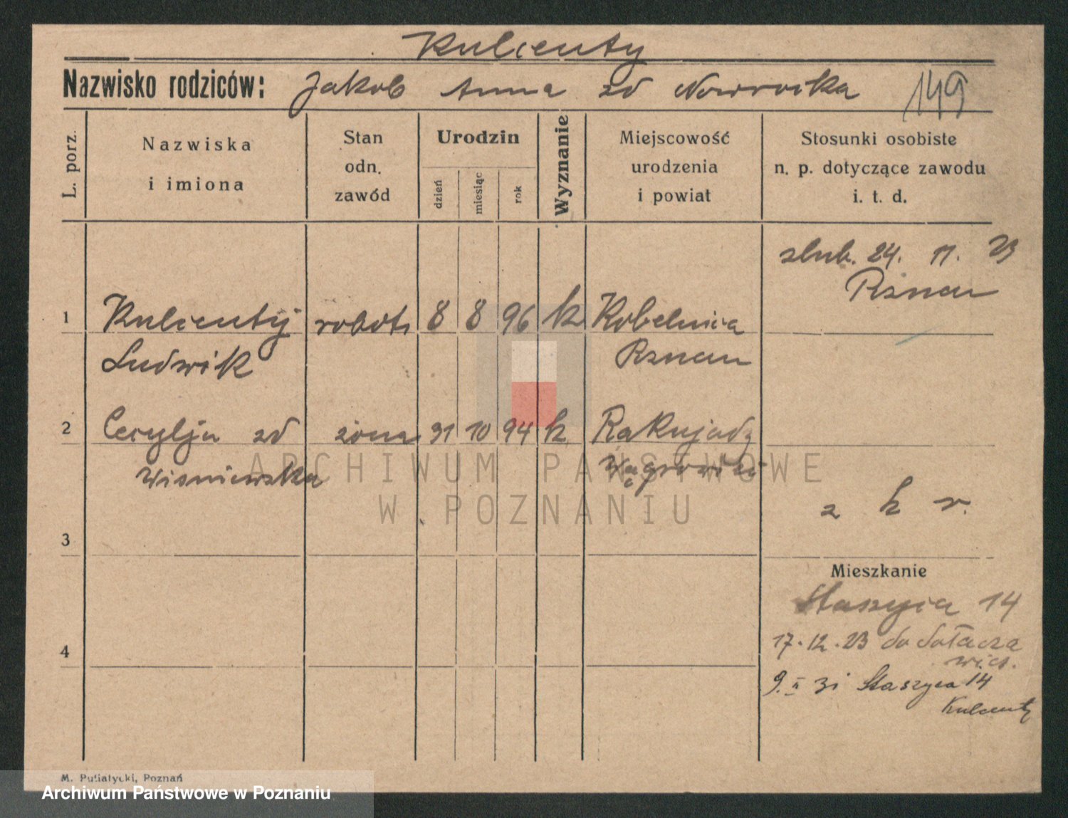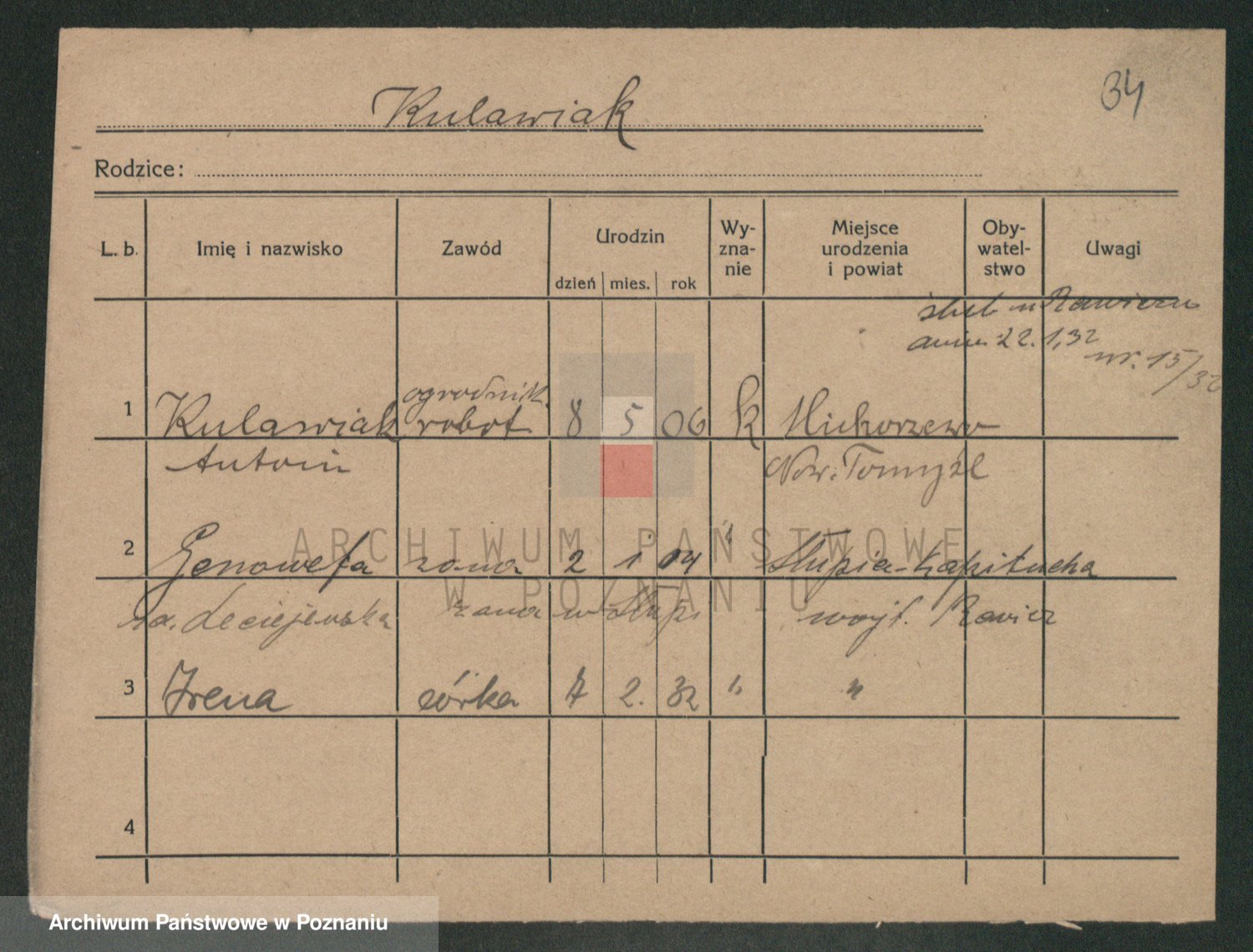 Podgląd karty osobowej dostępny jest po kliknięciu na nazwisko lub ikonkę karty. Można dokonywać powiększenia (ikony na górze) lub przechodzić między kolejnymi skanami (strzałki po bokach).