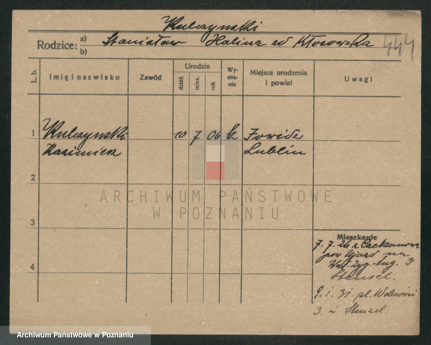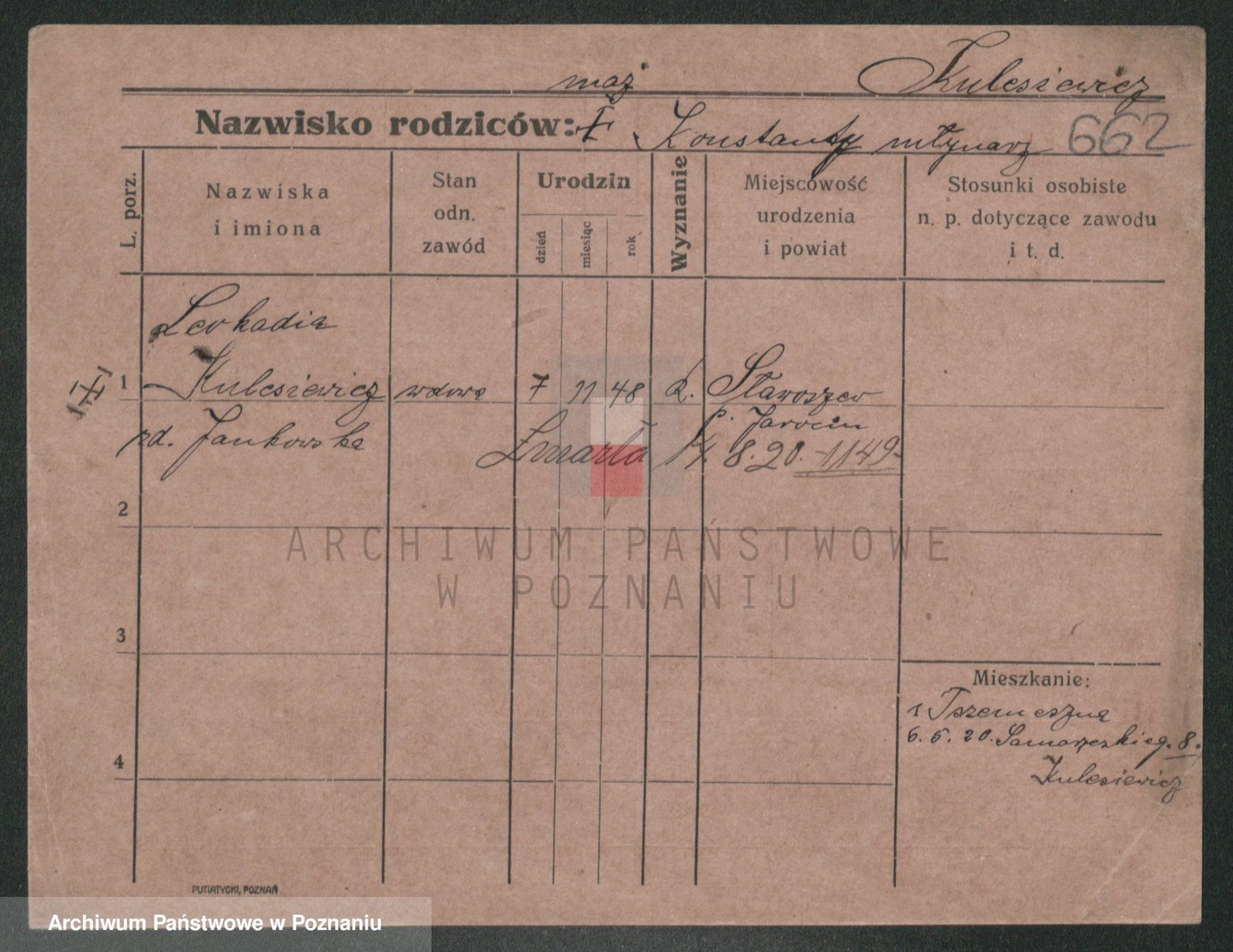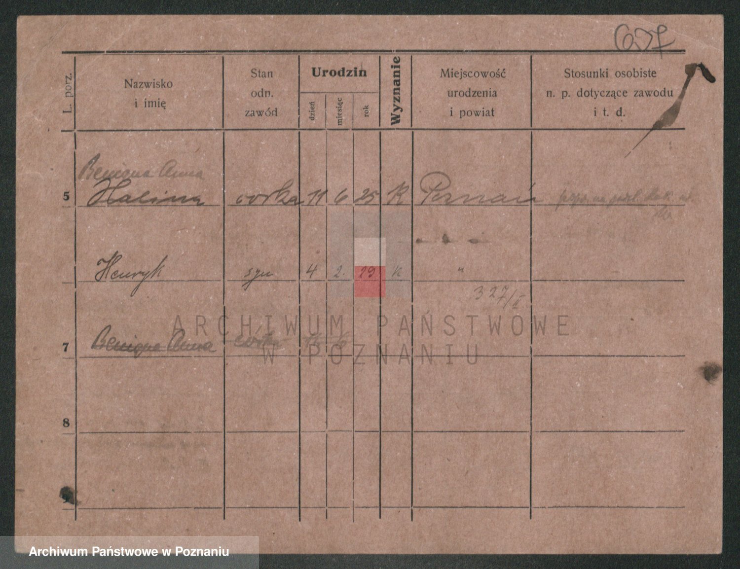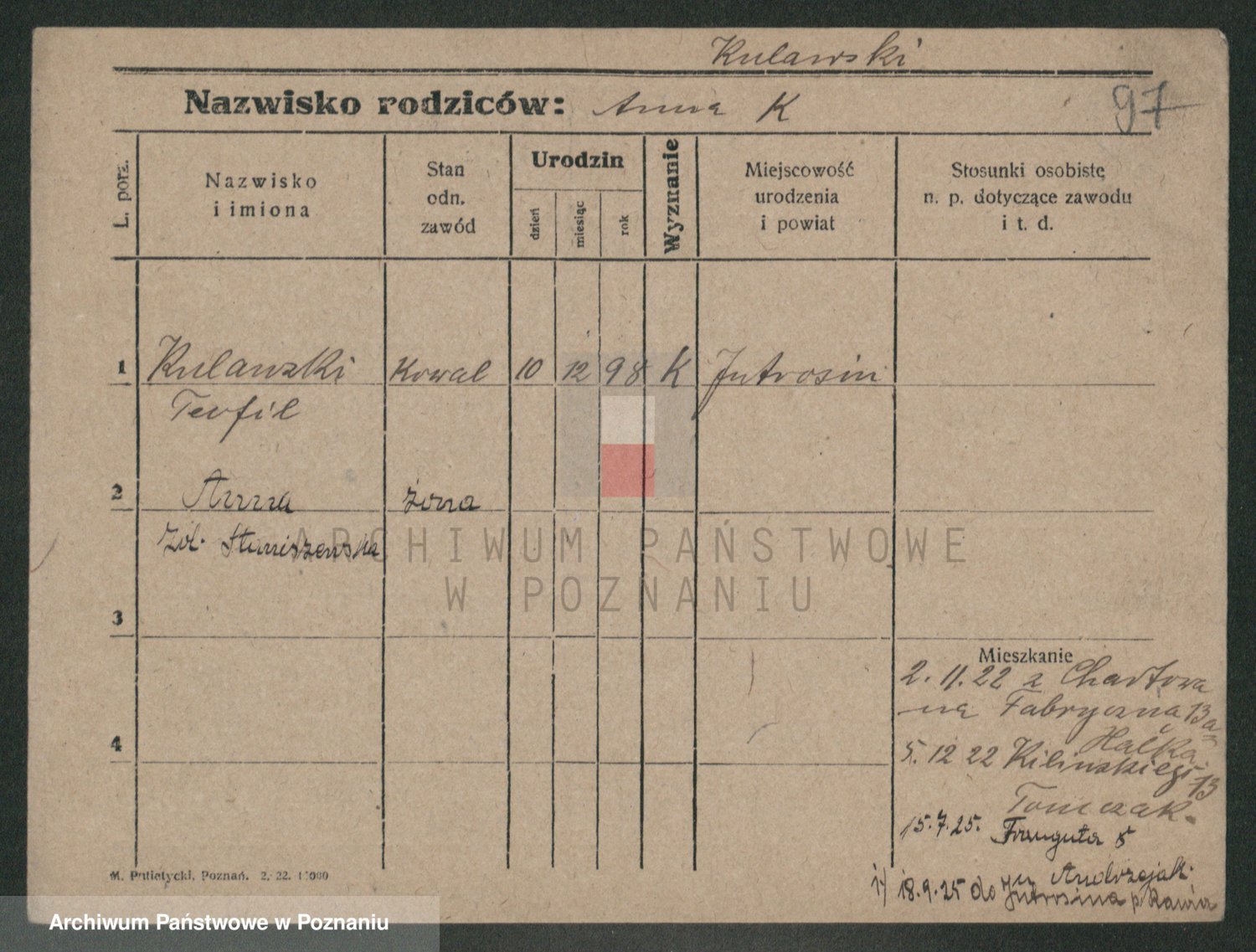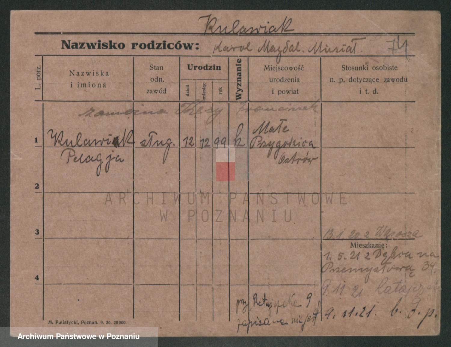 Podgląd karty osobowej dostępny jest po kliknięciu na nazwisko lub ikonkę karty. Można dokonywać powiększenia (ikony na górze) lub przechodzić między kolejnymi skanami (strzałki po bokach).