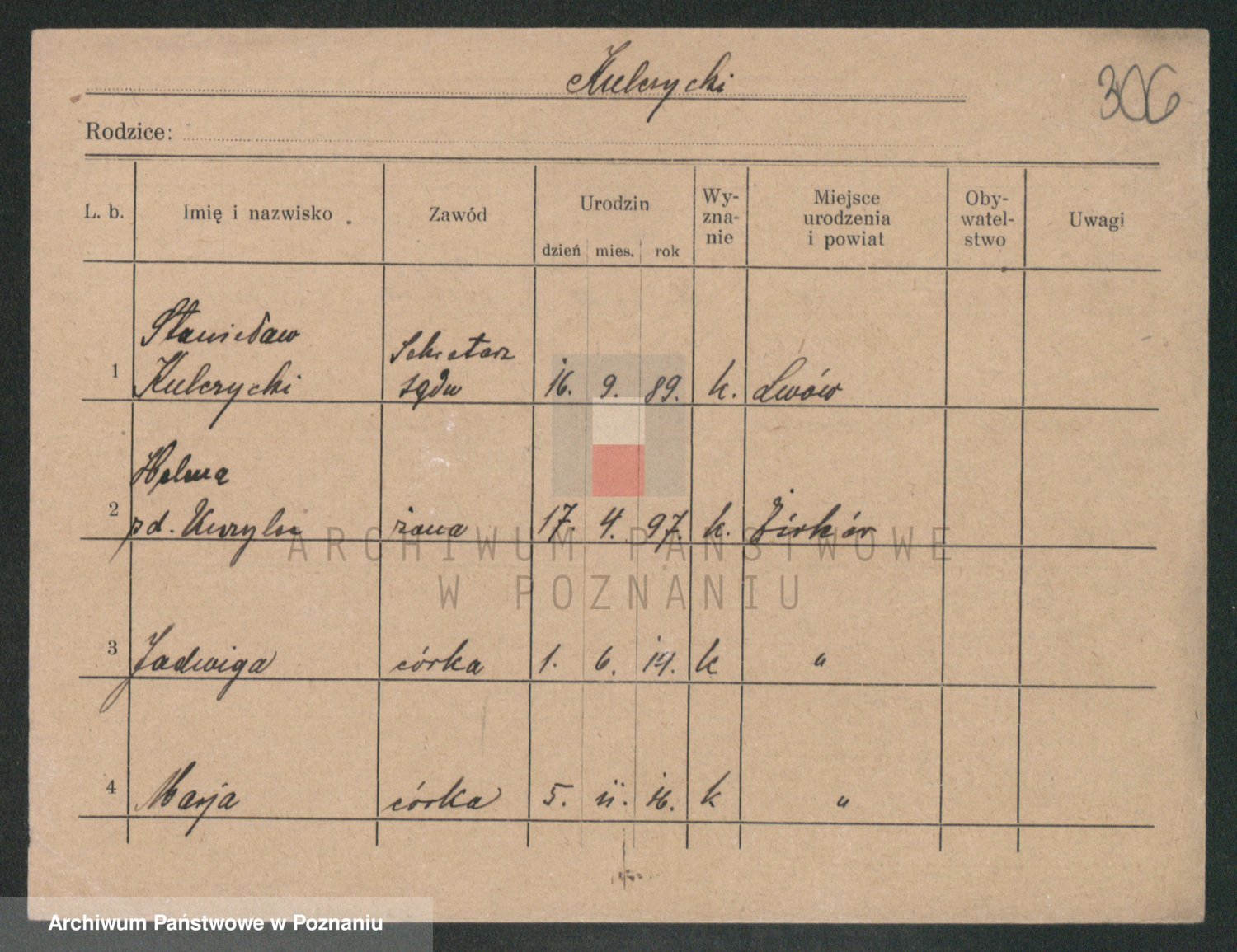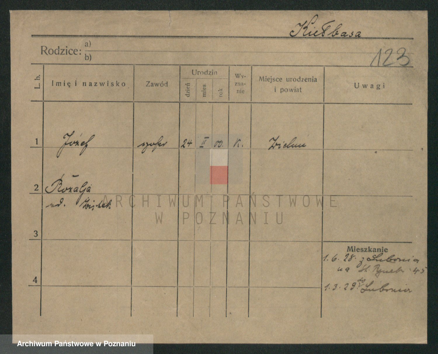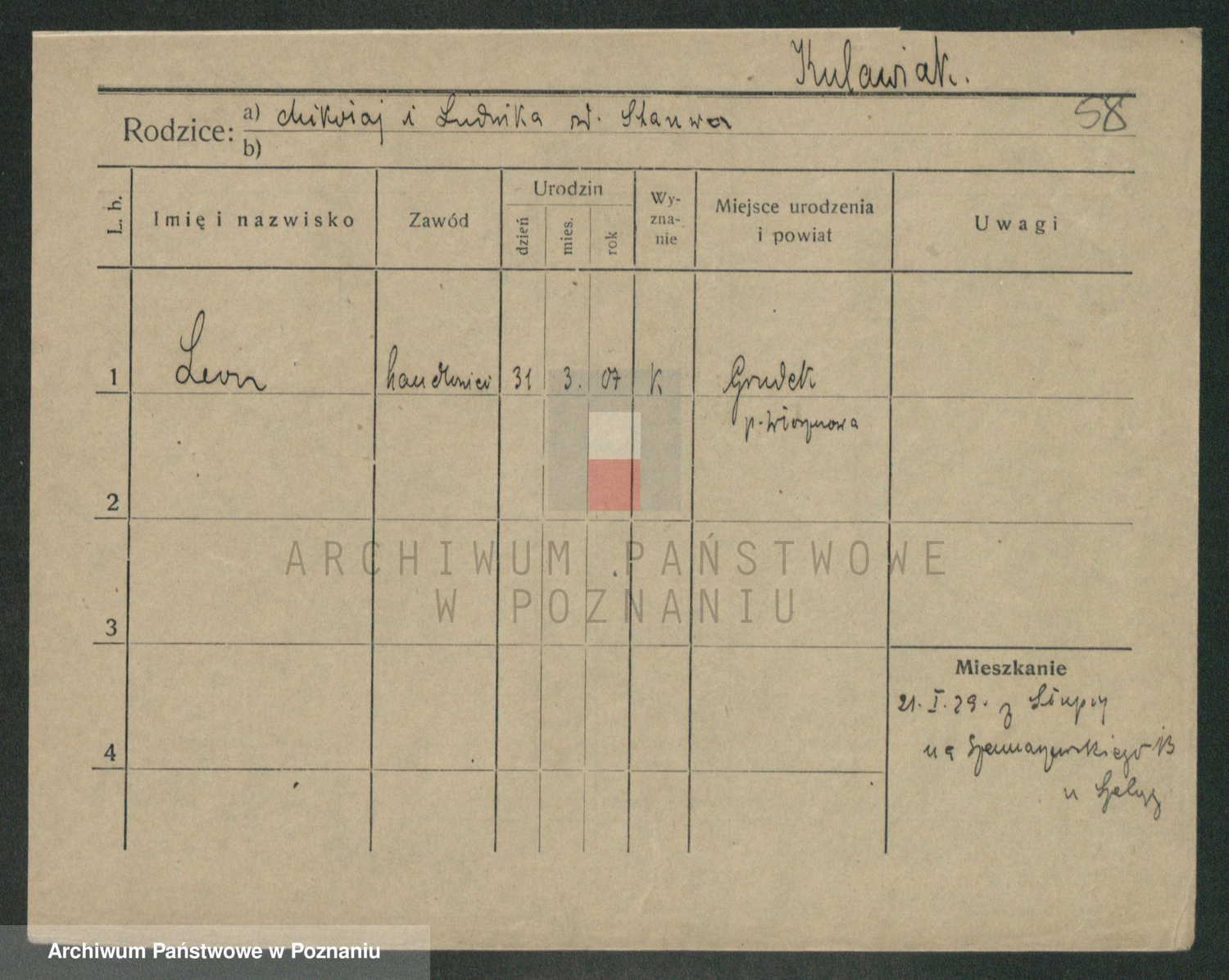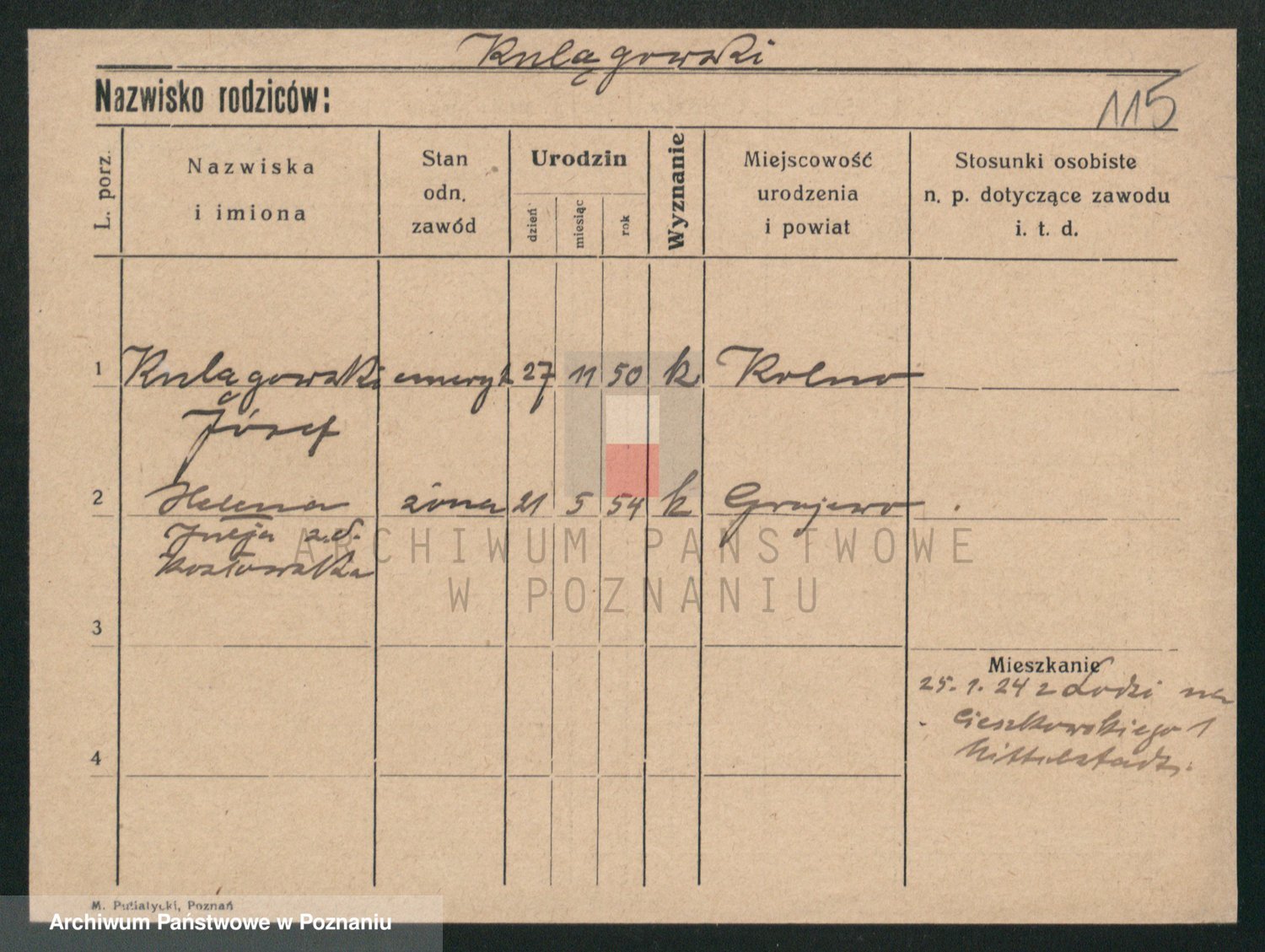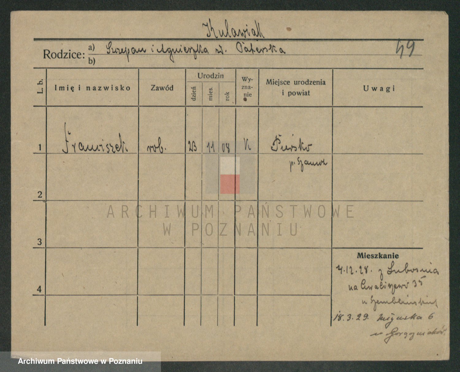 Podgląd karty osobowej dostępny jest po kliknięciu na nazwisko lub ikonkę karty. Można dokonywać powiększenia (ikony na górze) lub przechodzić między kolejnymi skanami (strzałki po bokach).