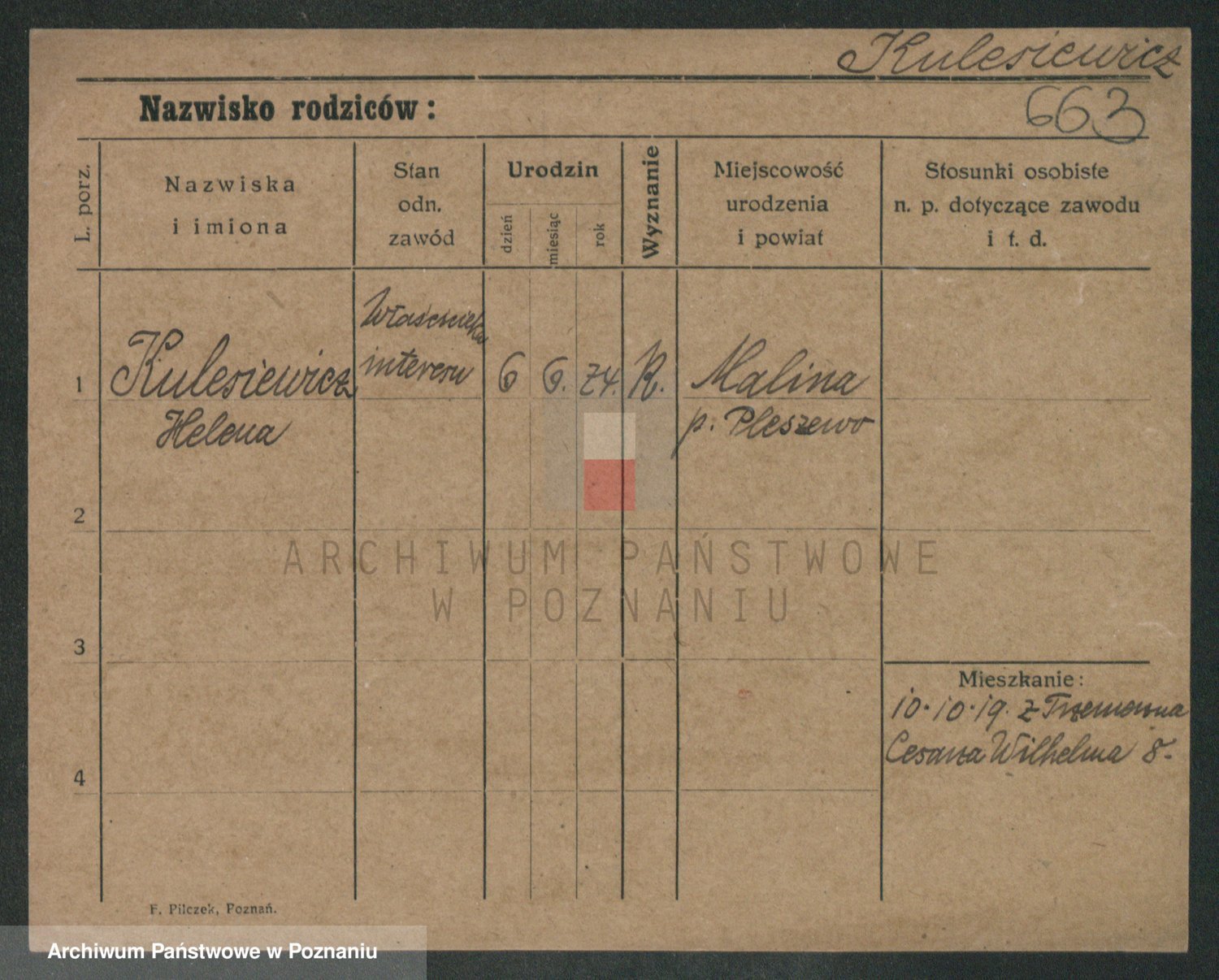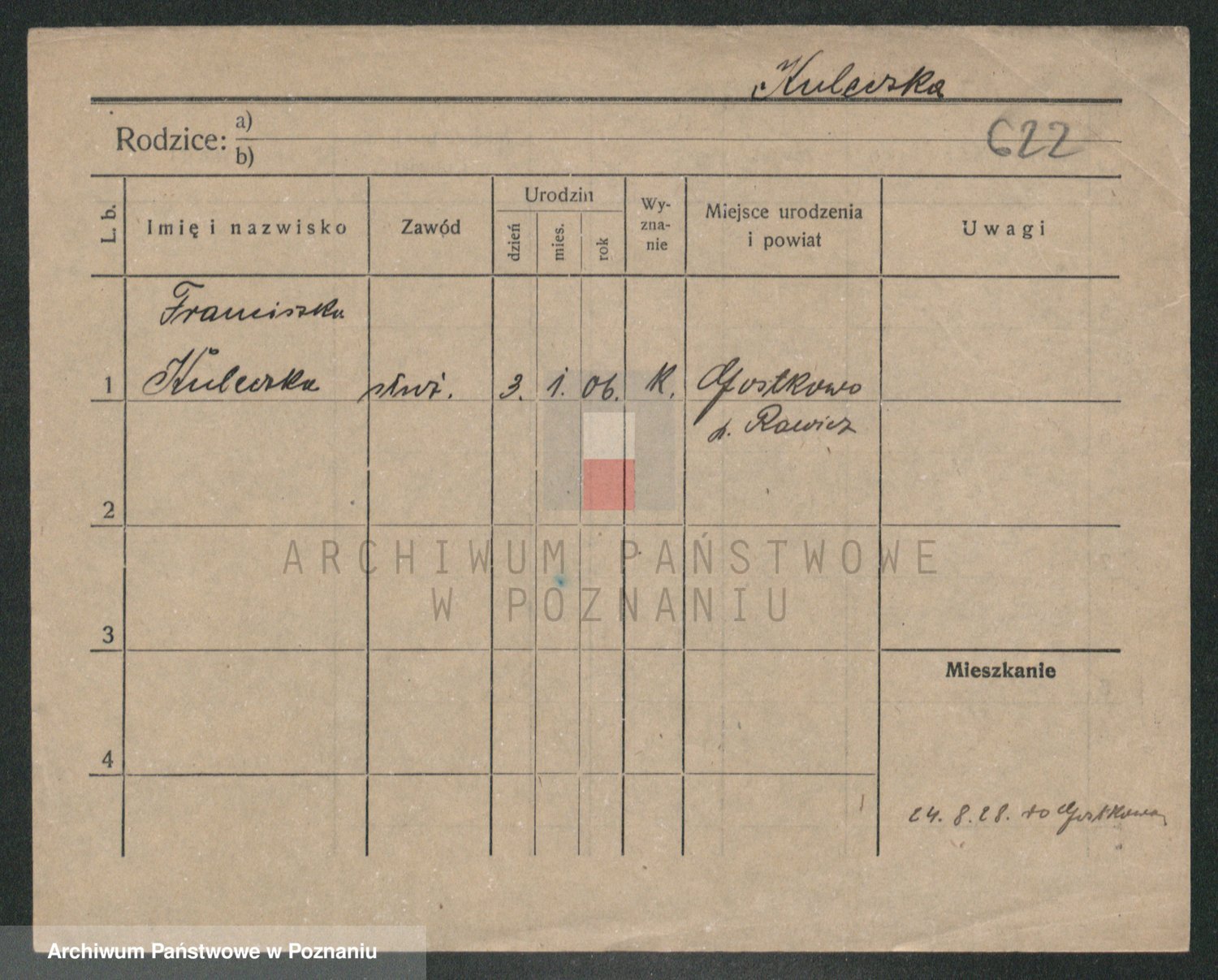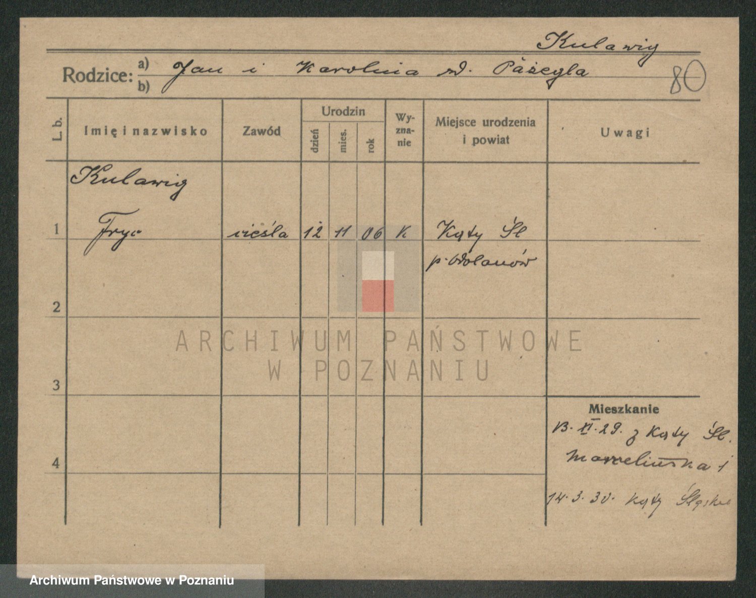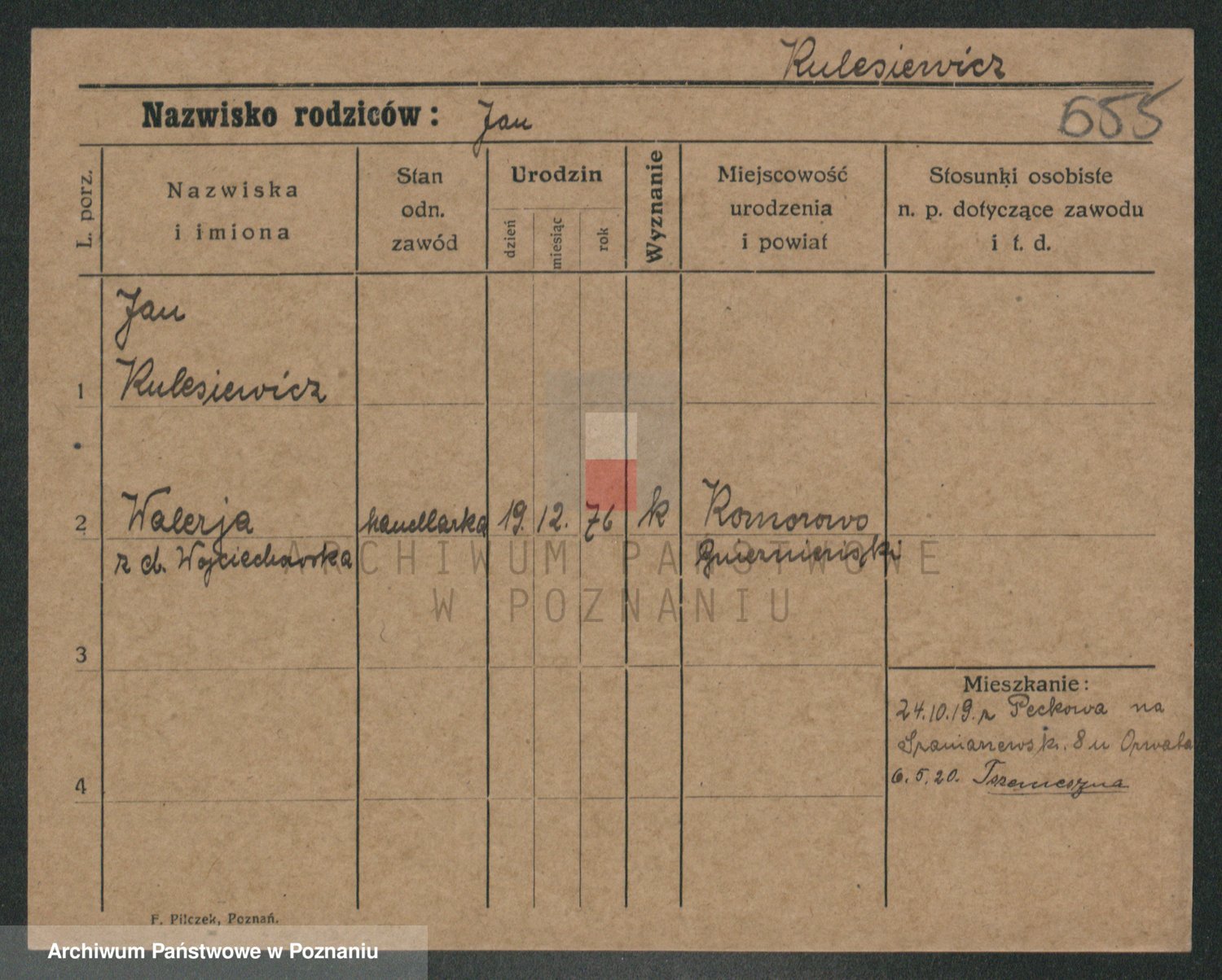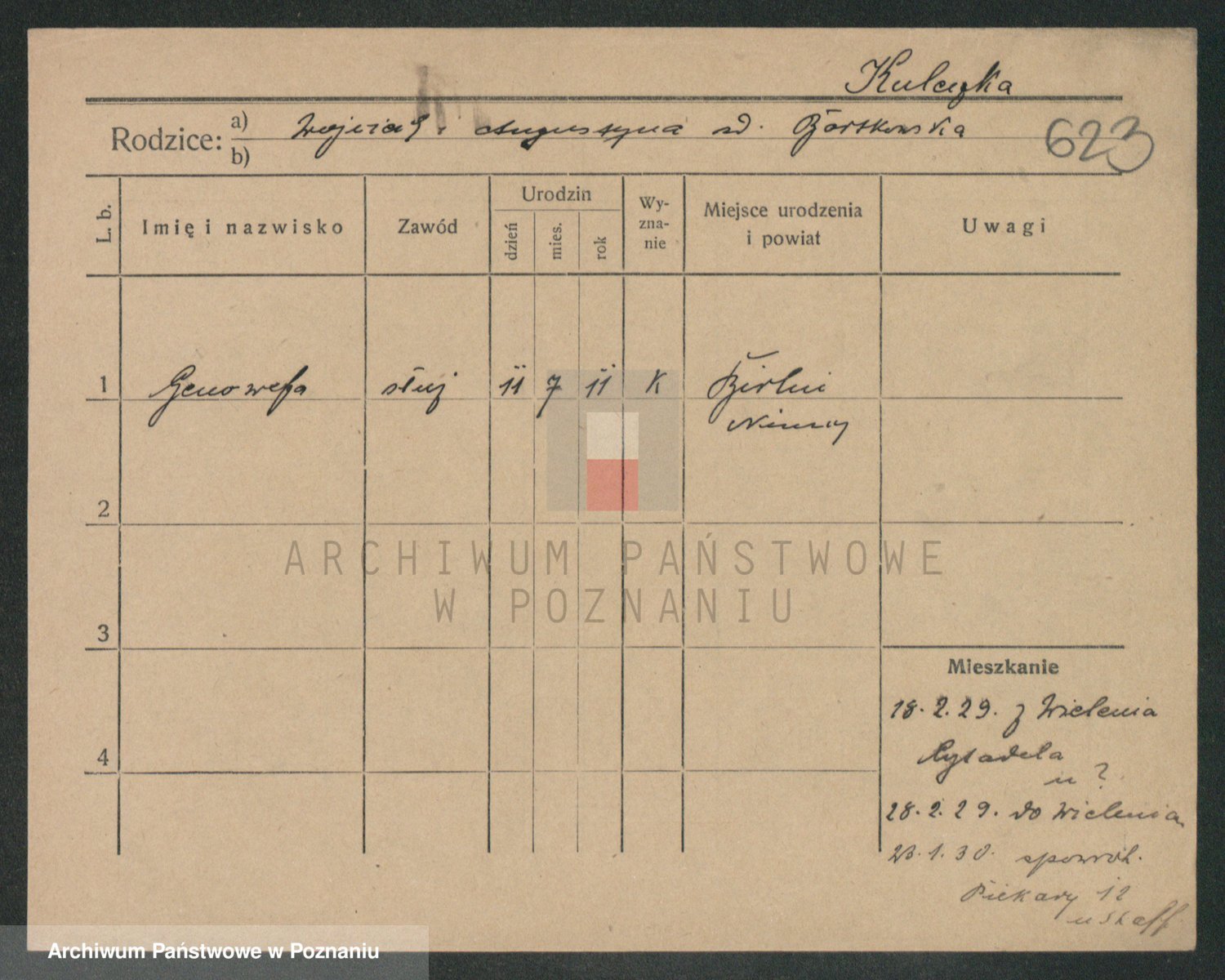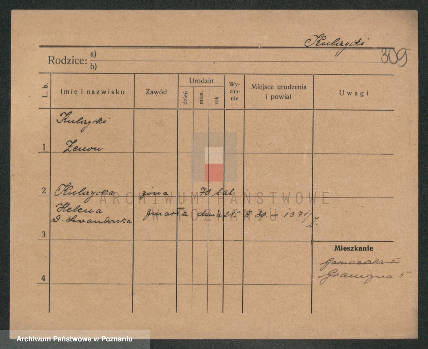 Podgląd karty osobowej dostępny jest po kliknięciu na nazwisko lub ikonkę karty. Można dokonywać powiększenia (ikony na górze) lub przechodzić między kolejnymi skanami (strzałki po bokach).