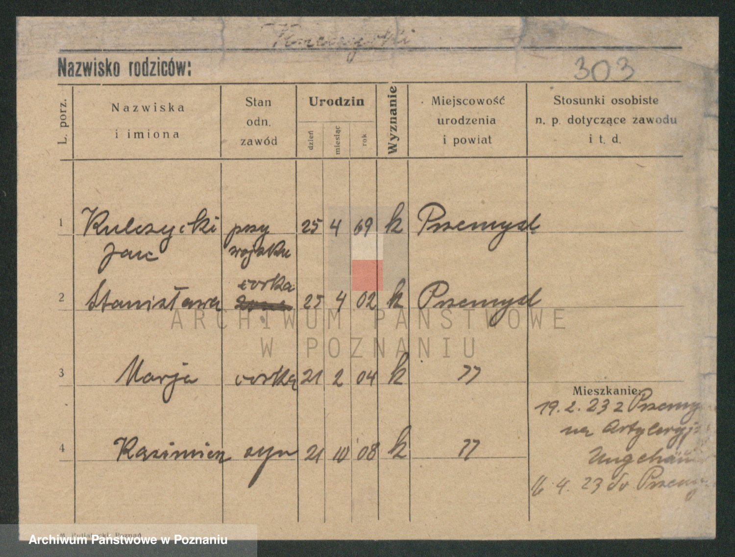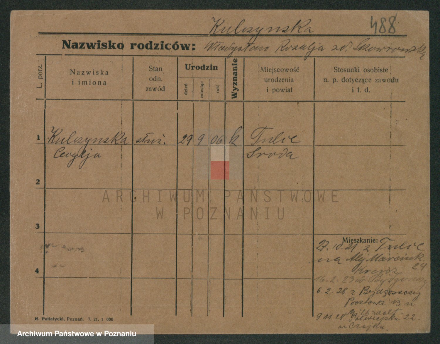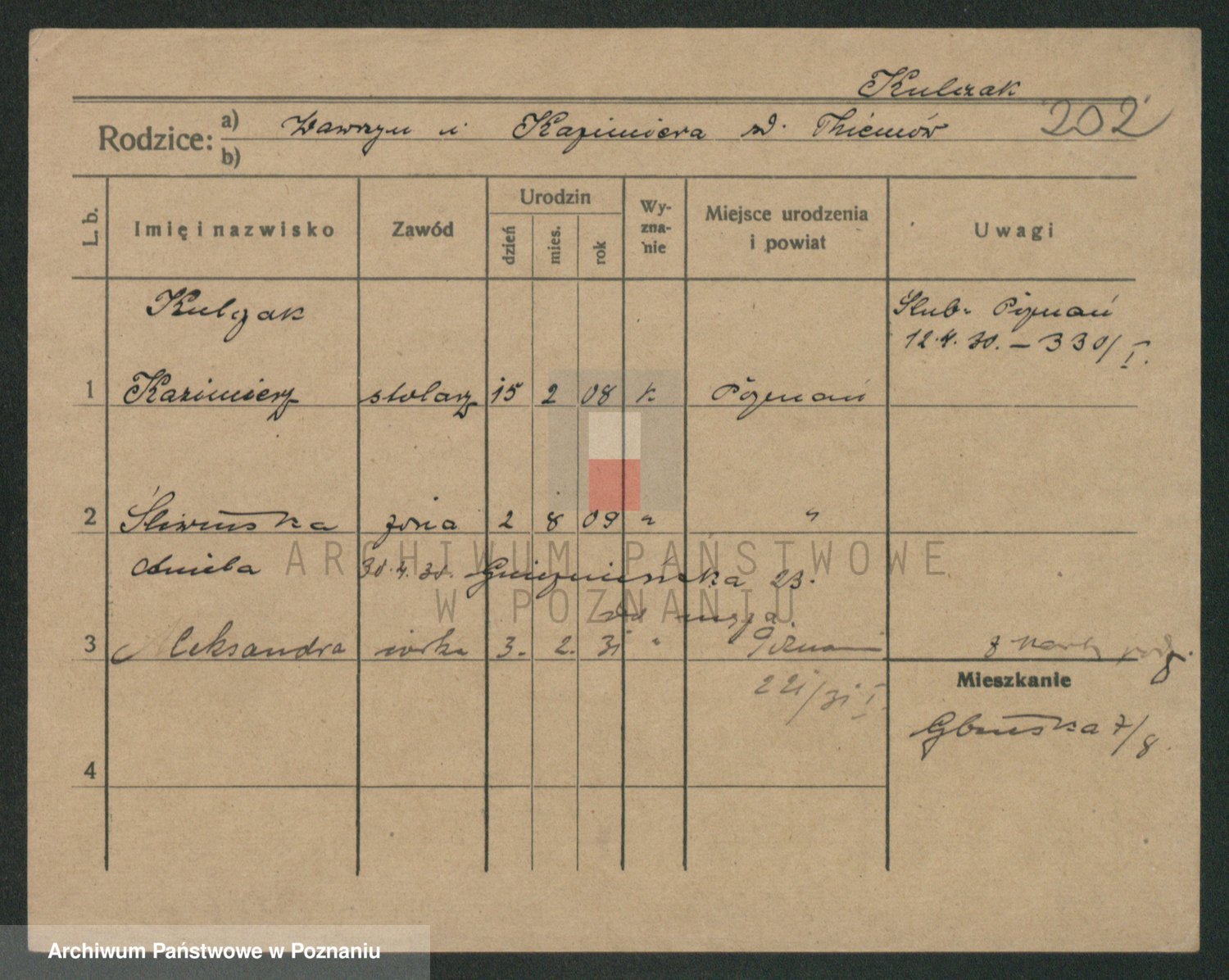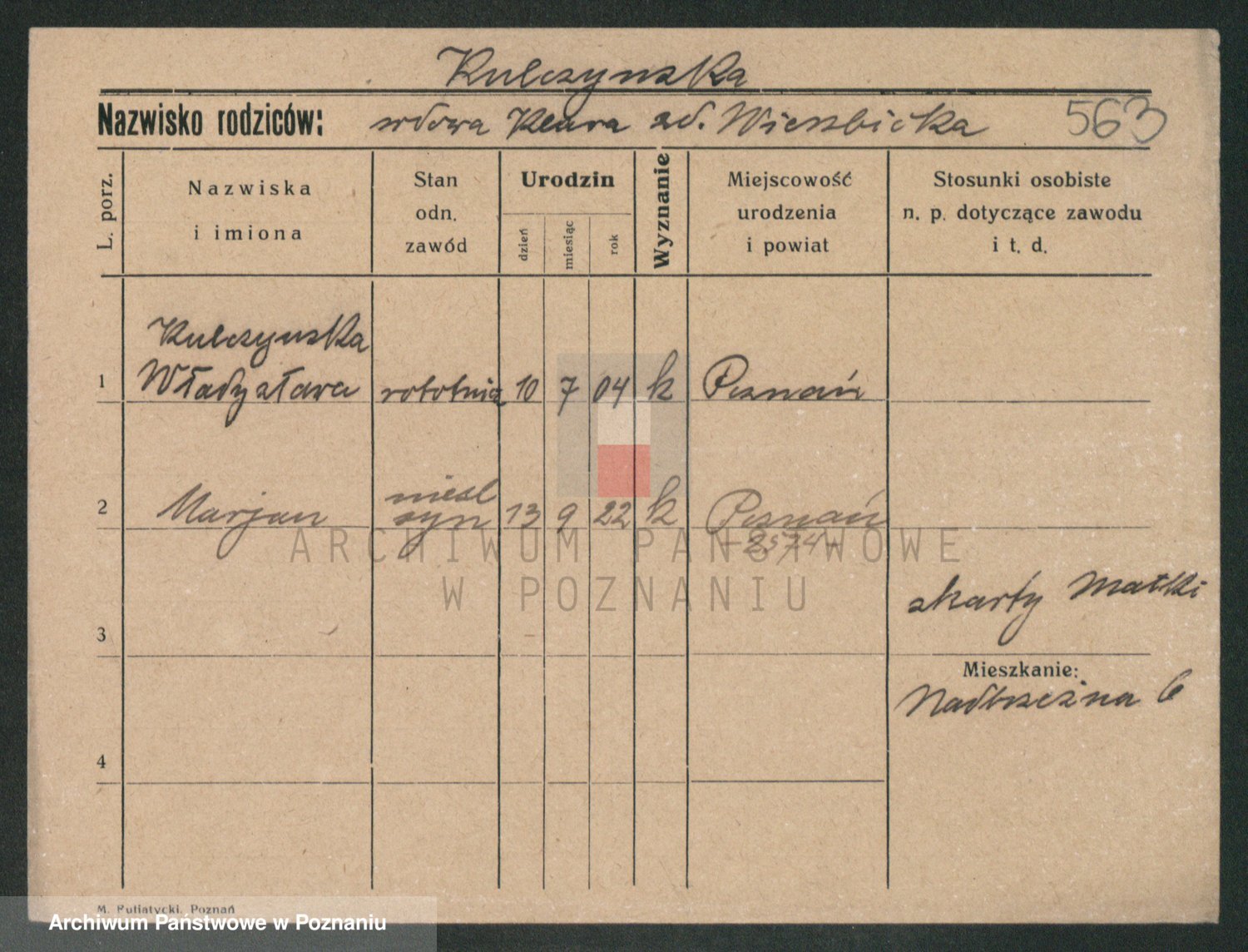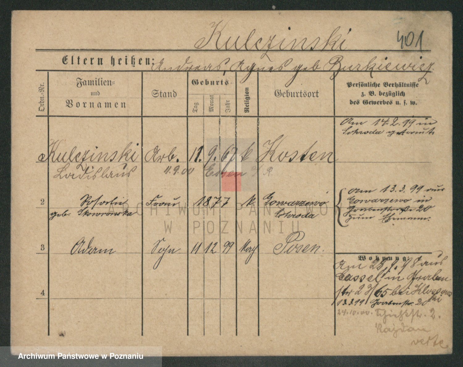 Podgląd karty osobowej dostępny jest po kliknięciu na nazwisko lub ikonkę karty. Można dokonywać powiększenia (ikony na górze) lub przechodzić między kolejnymi skanami (strzałki po bokach).
