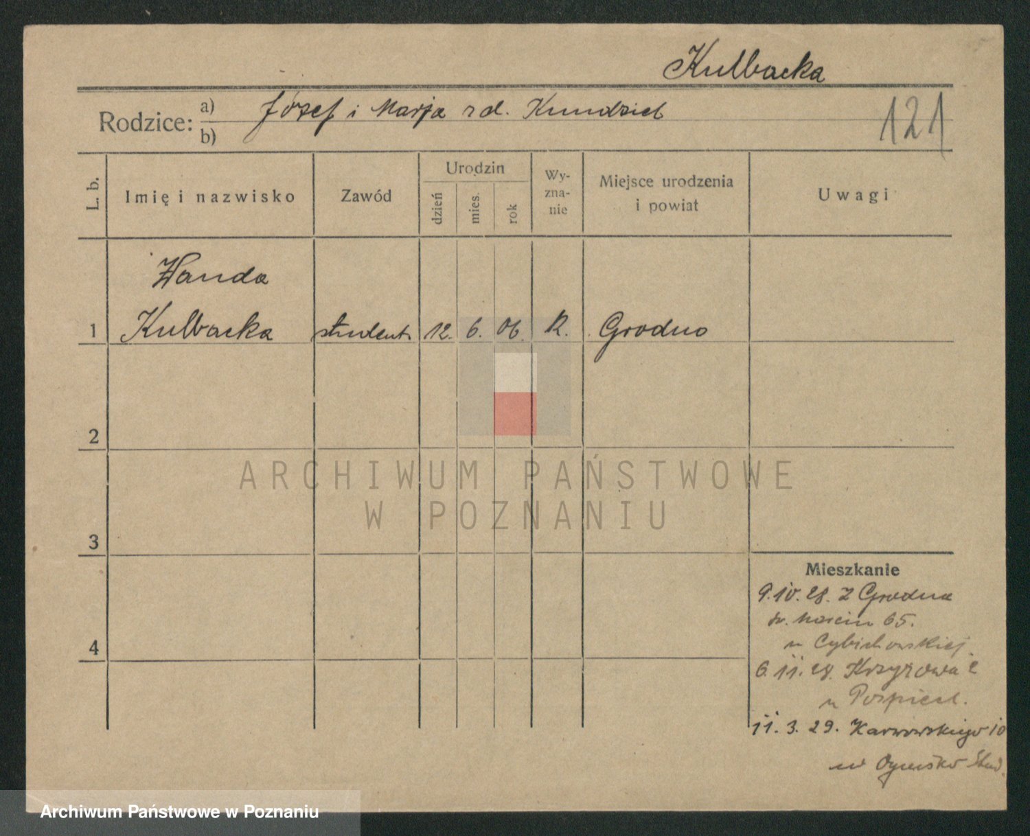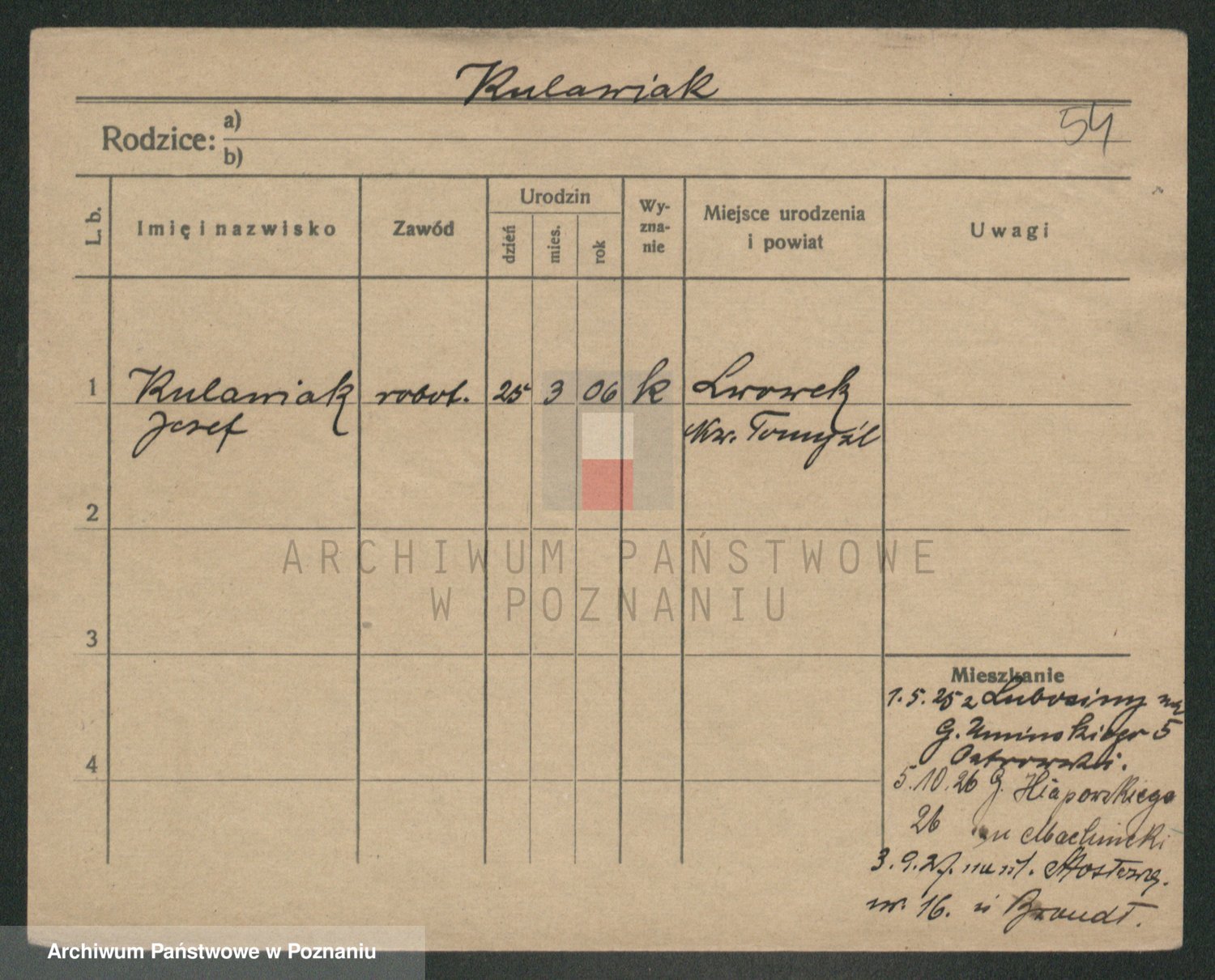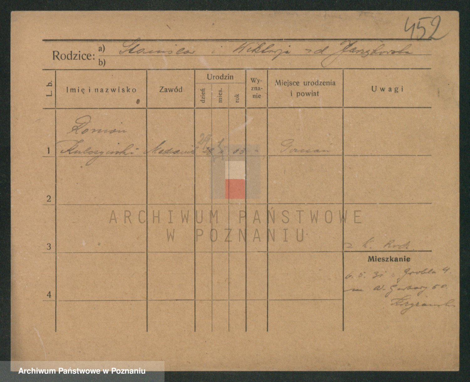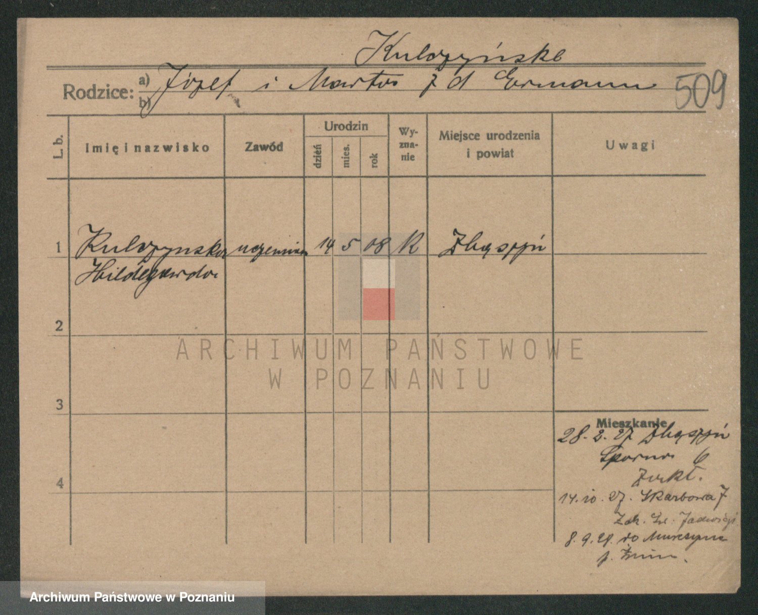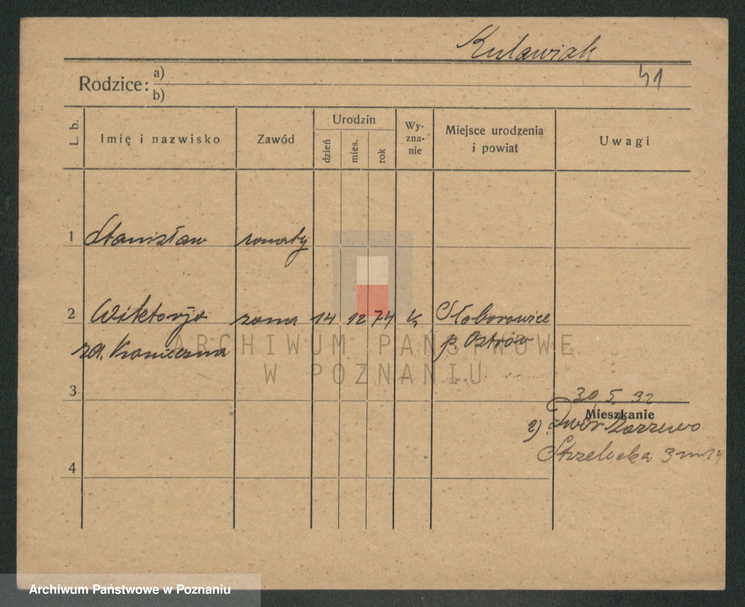 Podgląd karty osobowej dostępny jest po kliknięciu na nazwisko lub ikonkę karty. Można dokonywać powiększenia (ikony na górze) lub przechodzić między kolejnymi skanami (strzałki po bokach).