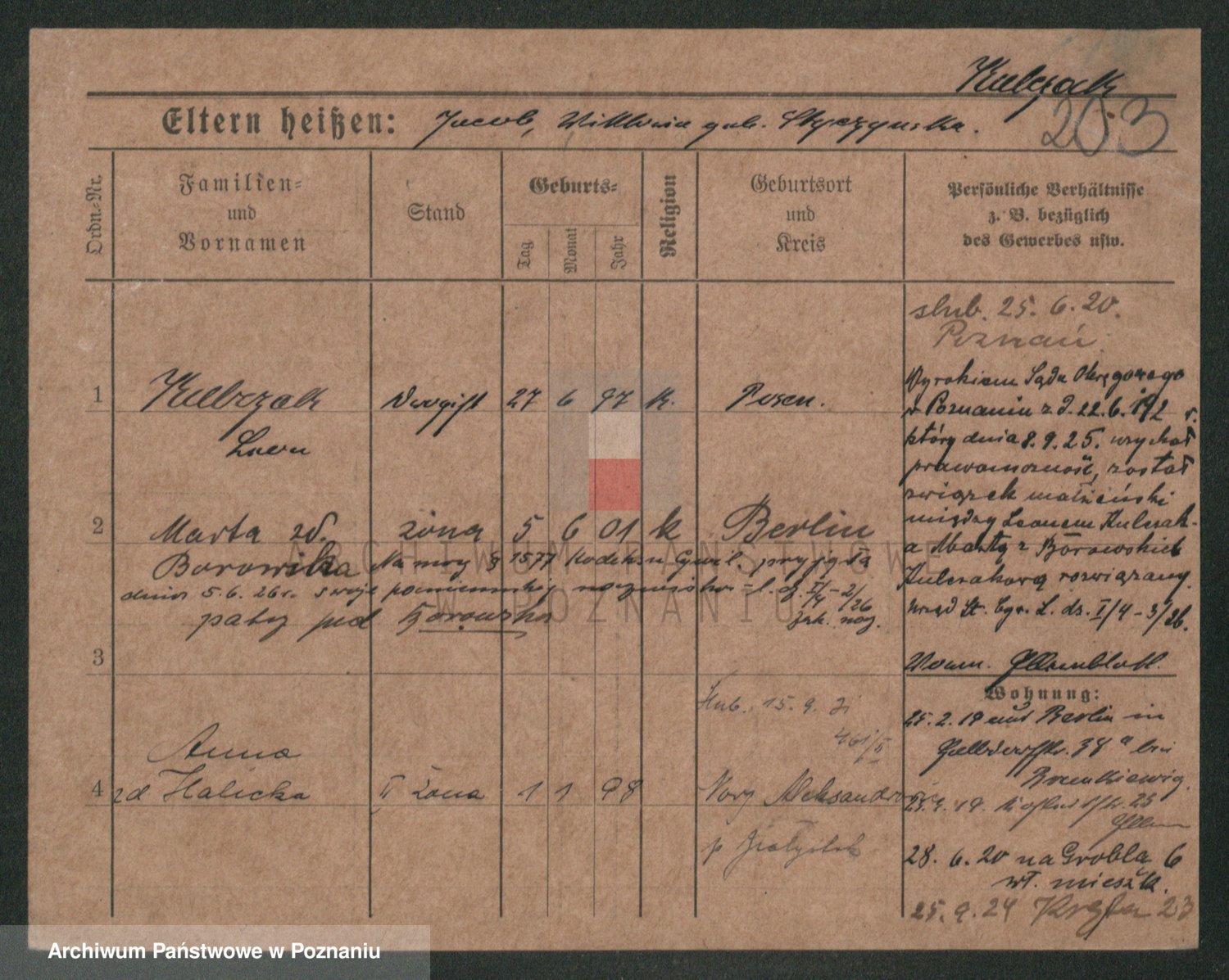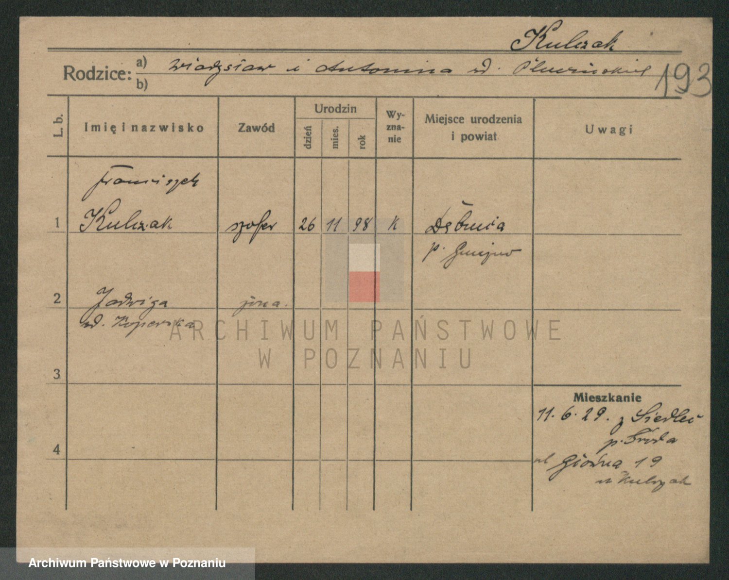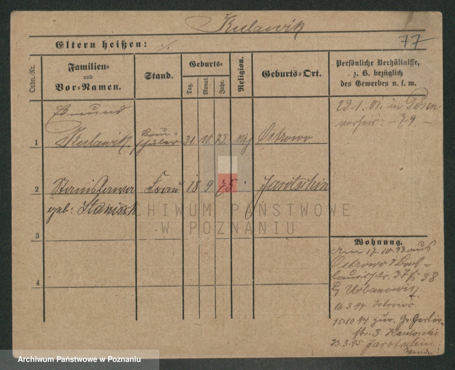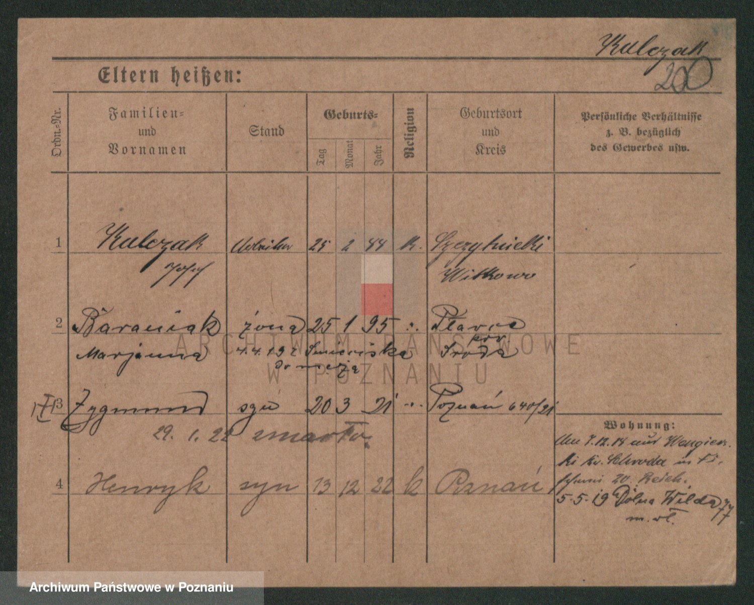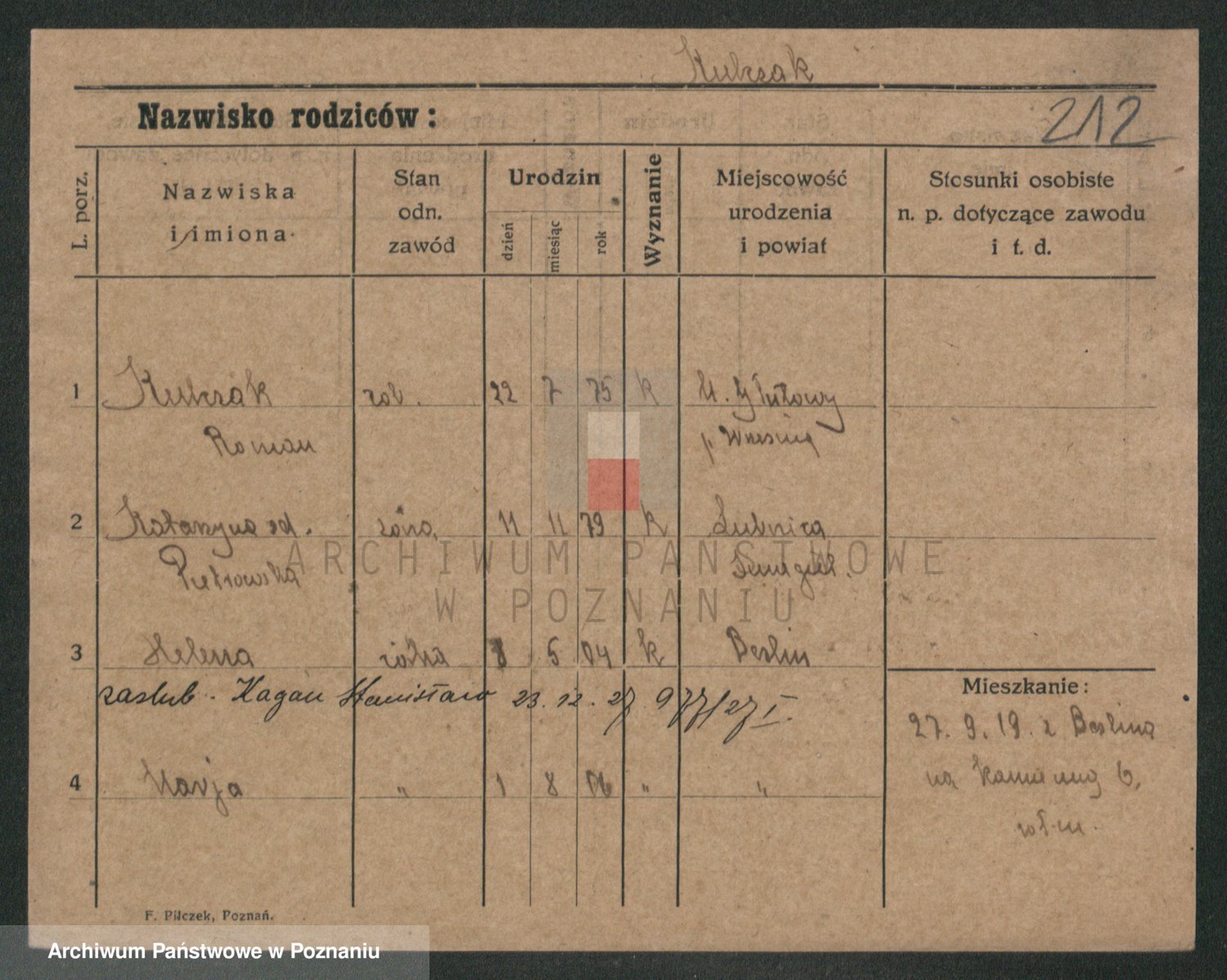 Podgląd karty osobowej dostępny jest po kliknięciu na nazwisko lub ikonkę karty. Można dokonywać powiększenia (ikony na górze) lub przechodzić między kolejnymi skanami (strzałki po bokach).