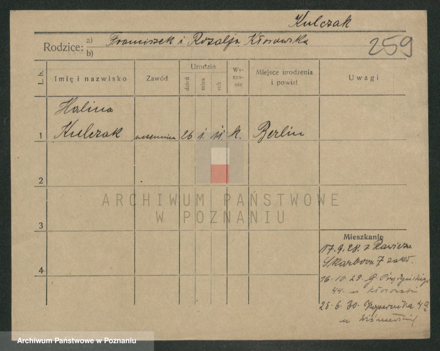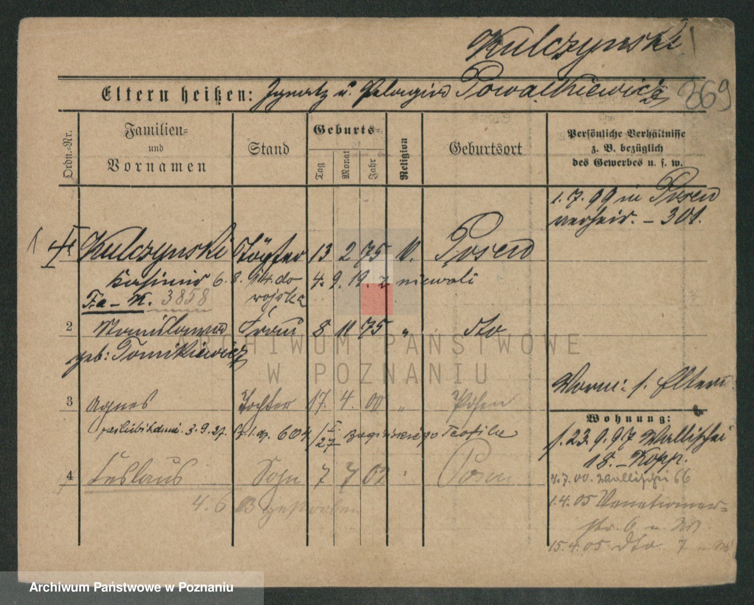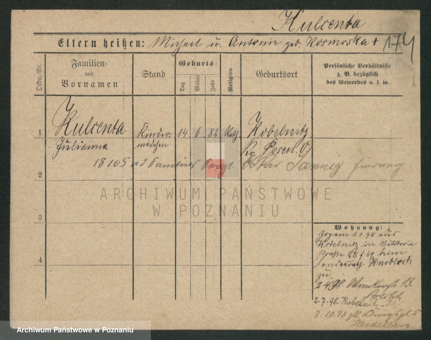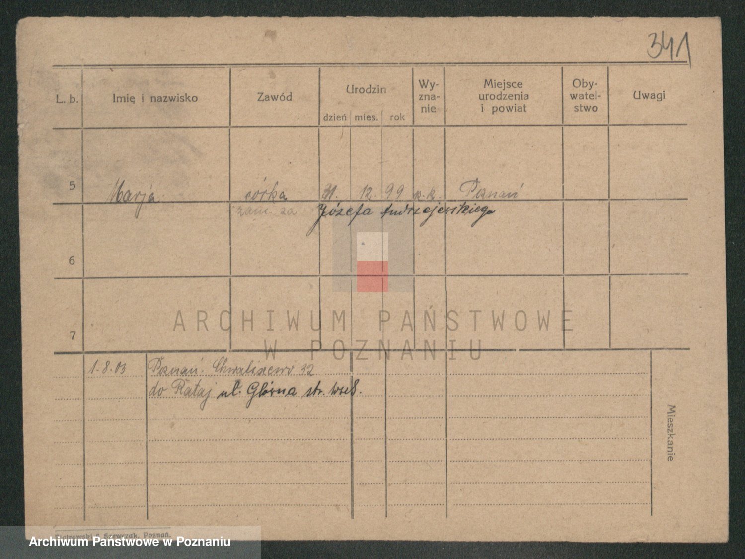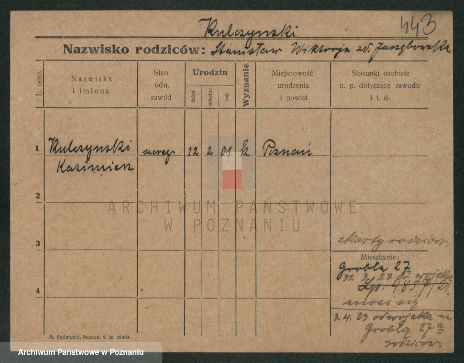 Podgląd karty osobowej dostępny jest po kliknięciu na nazwisko lub ikonkę karty. Można dokonywać powiększenia (ikony na górze) lub przechodzić między kolejnymi skanami (strzałki po bokach).