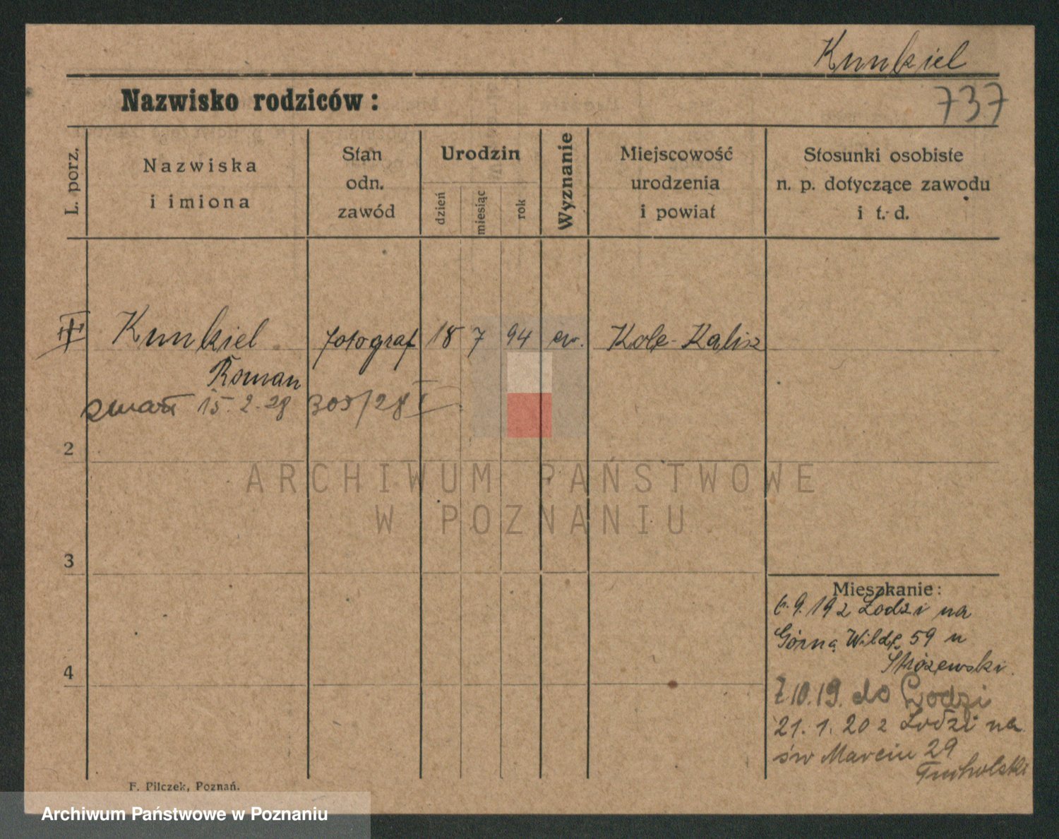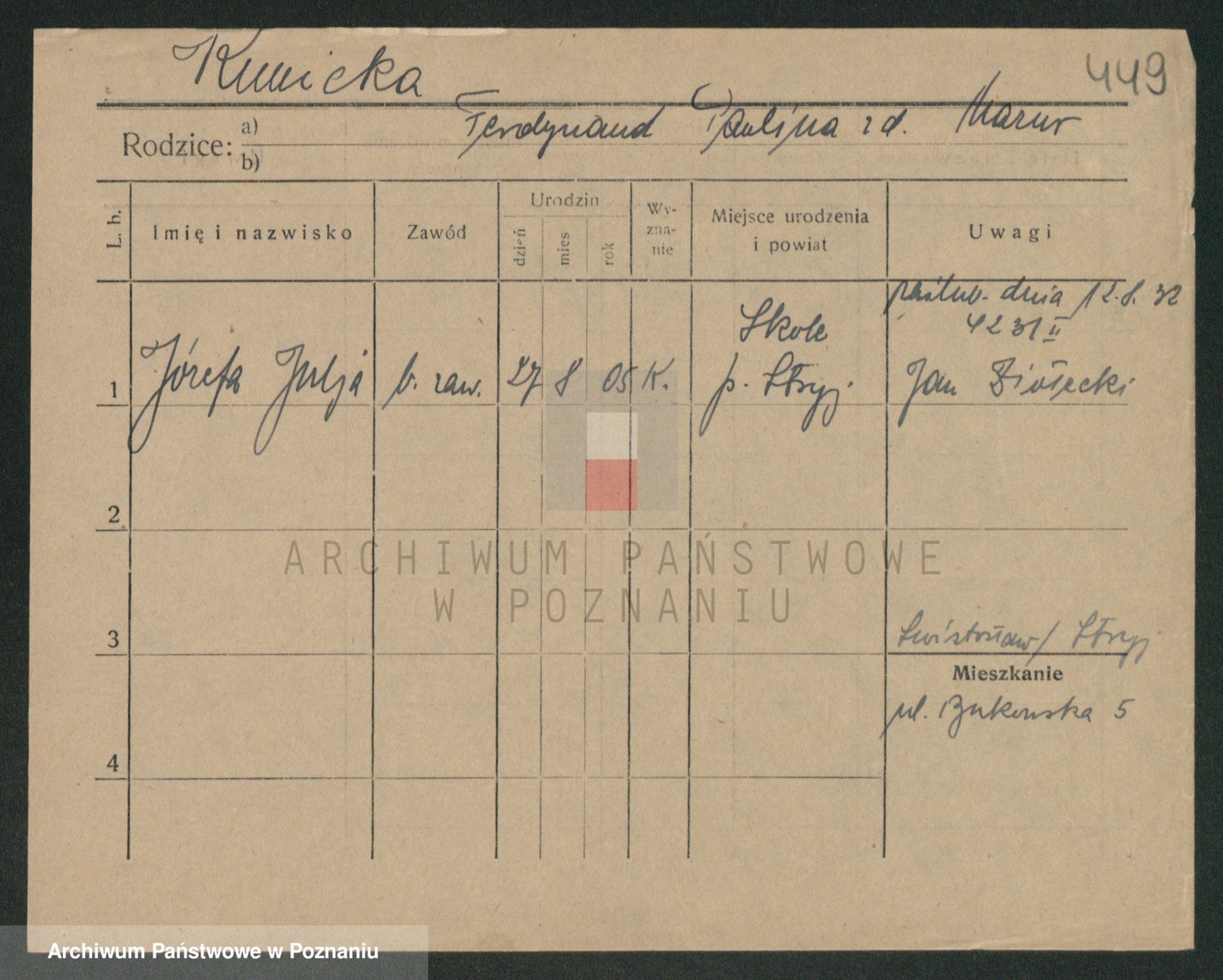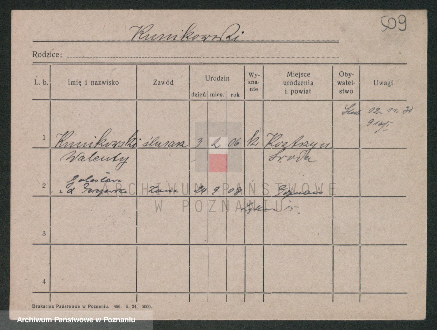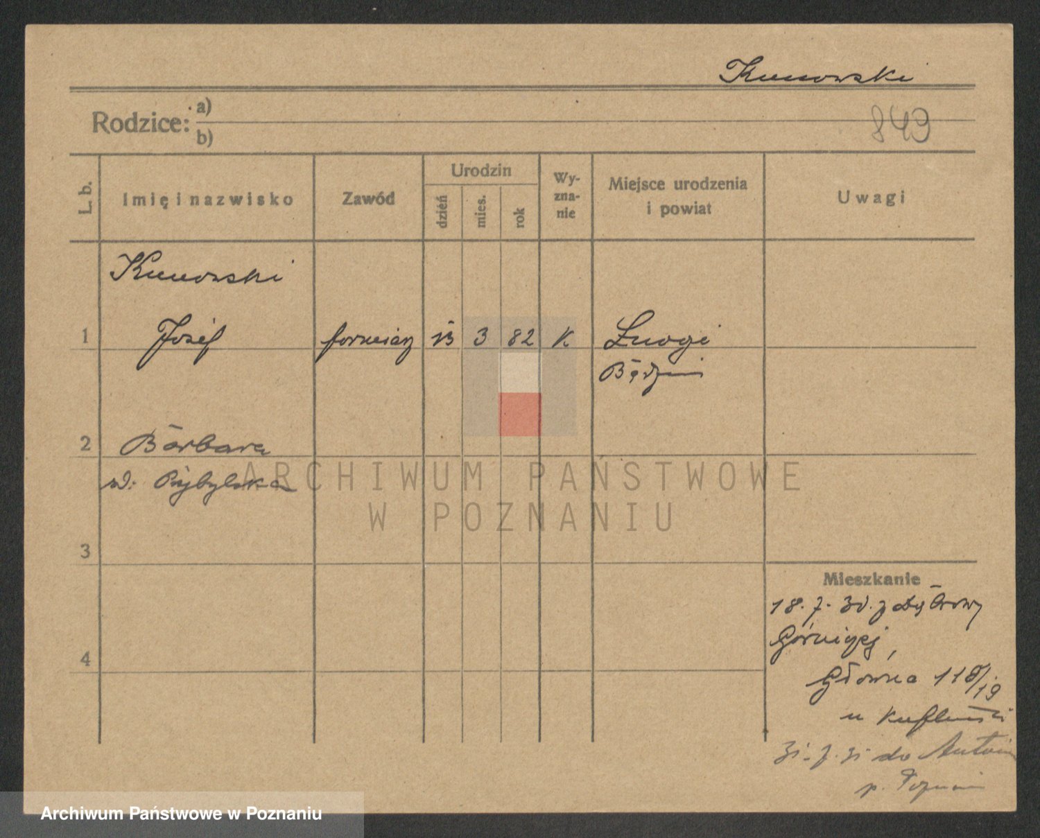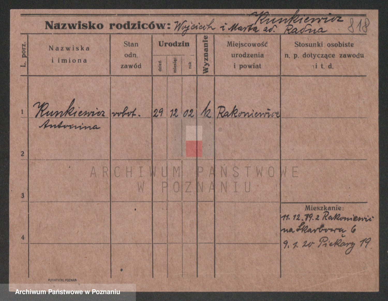 Podgląd karty osobowej dostępny jest po kliknięciu na nazwisko lub ikonkę karty. Można dokonywać powiększenia (ikony na górze) lub przechodzić między kolejnymi skanami (strzałki po bokach).