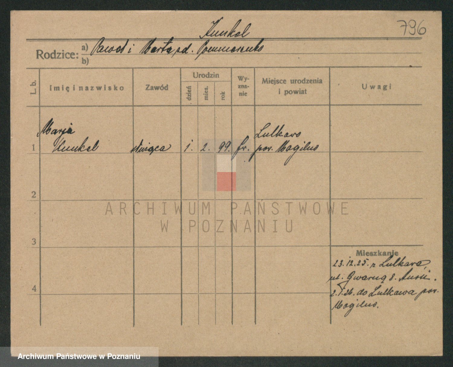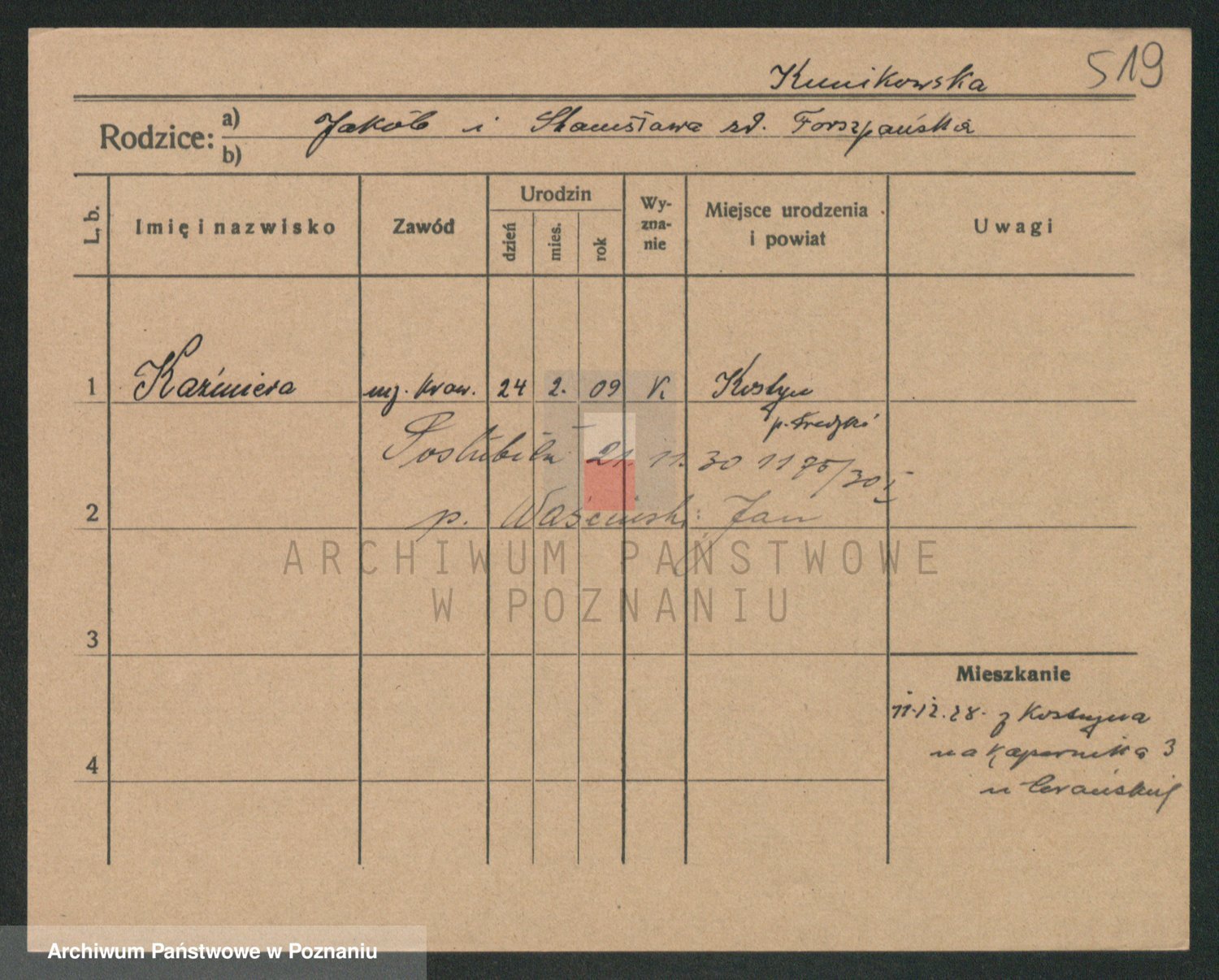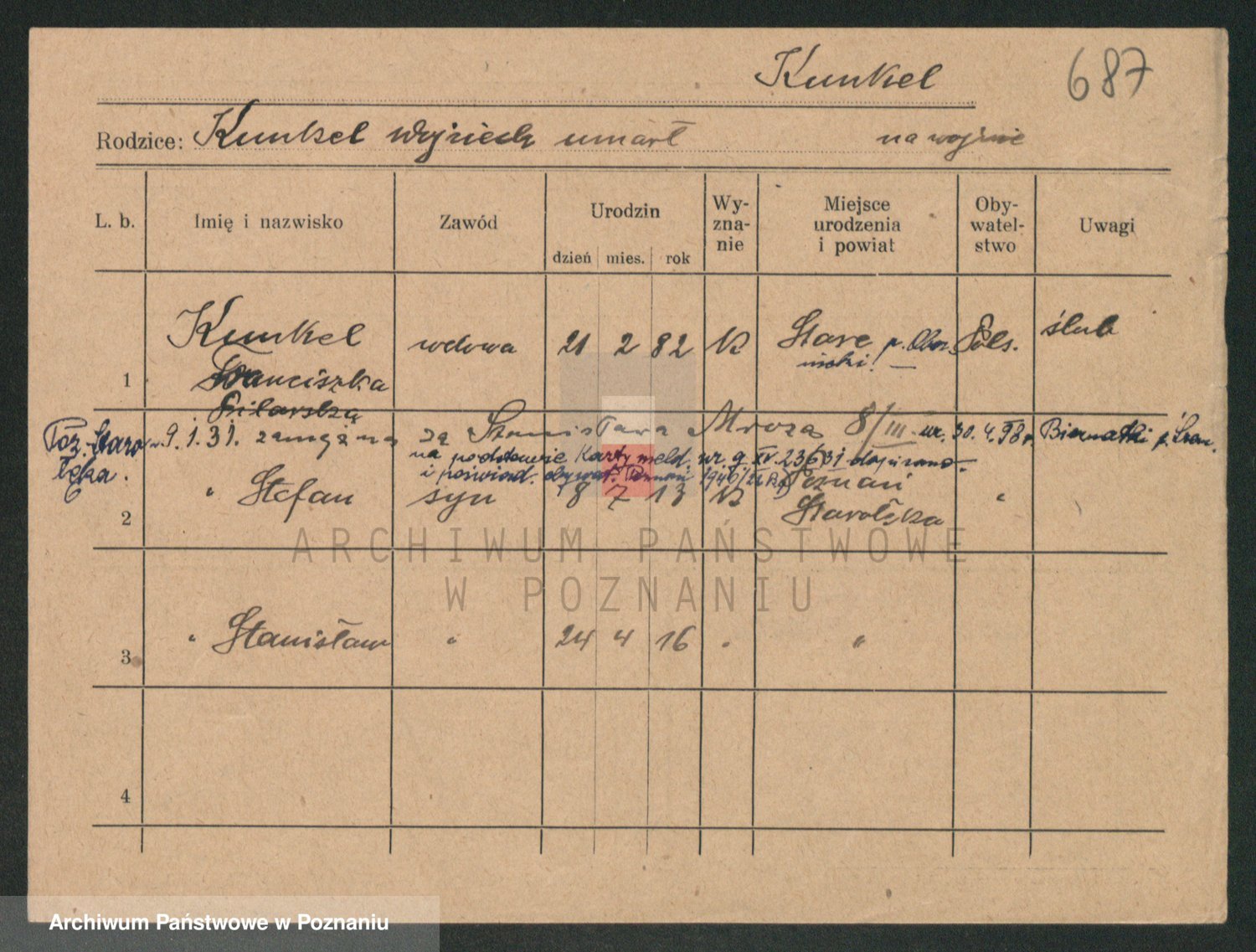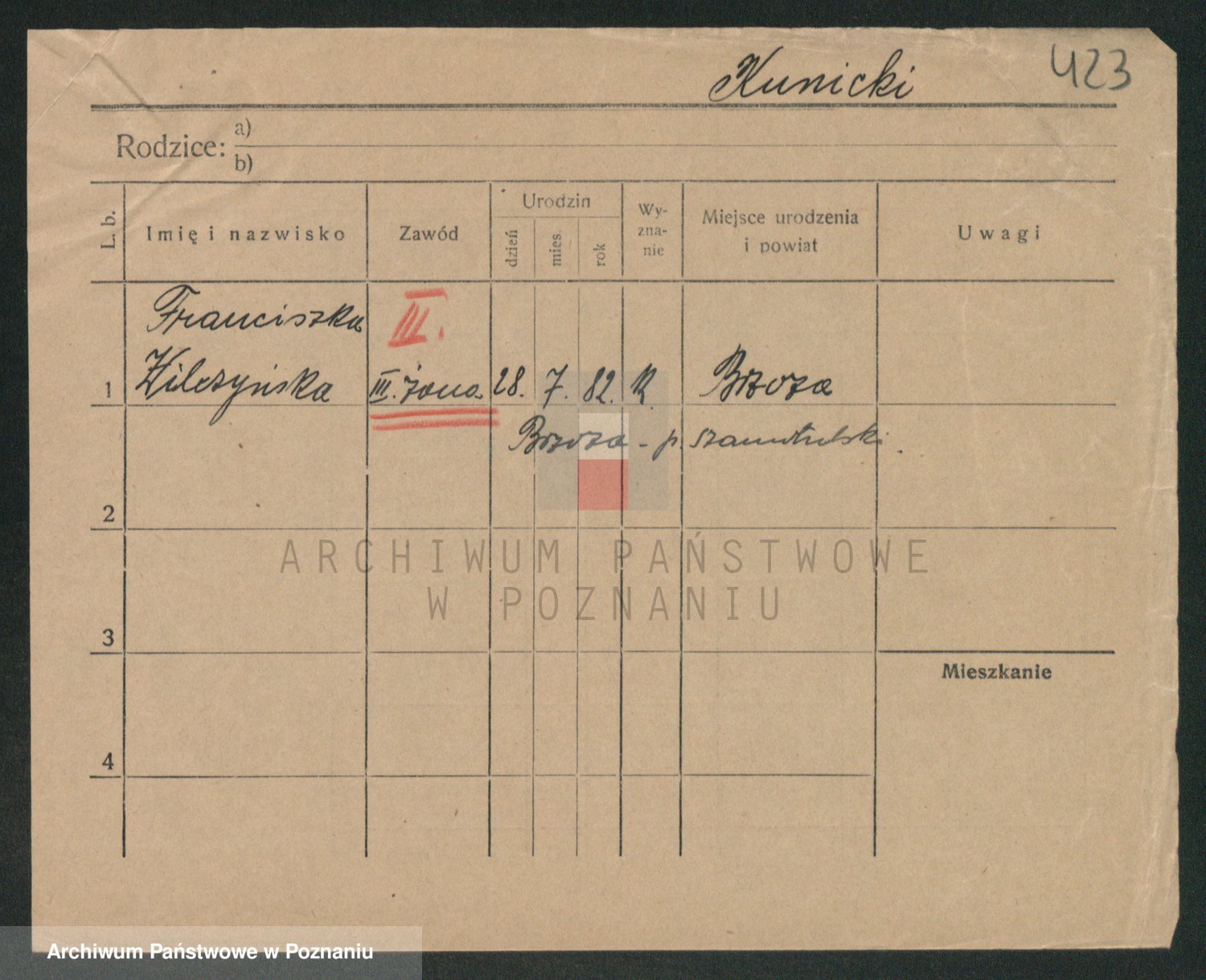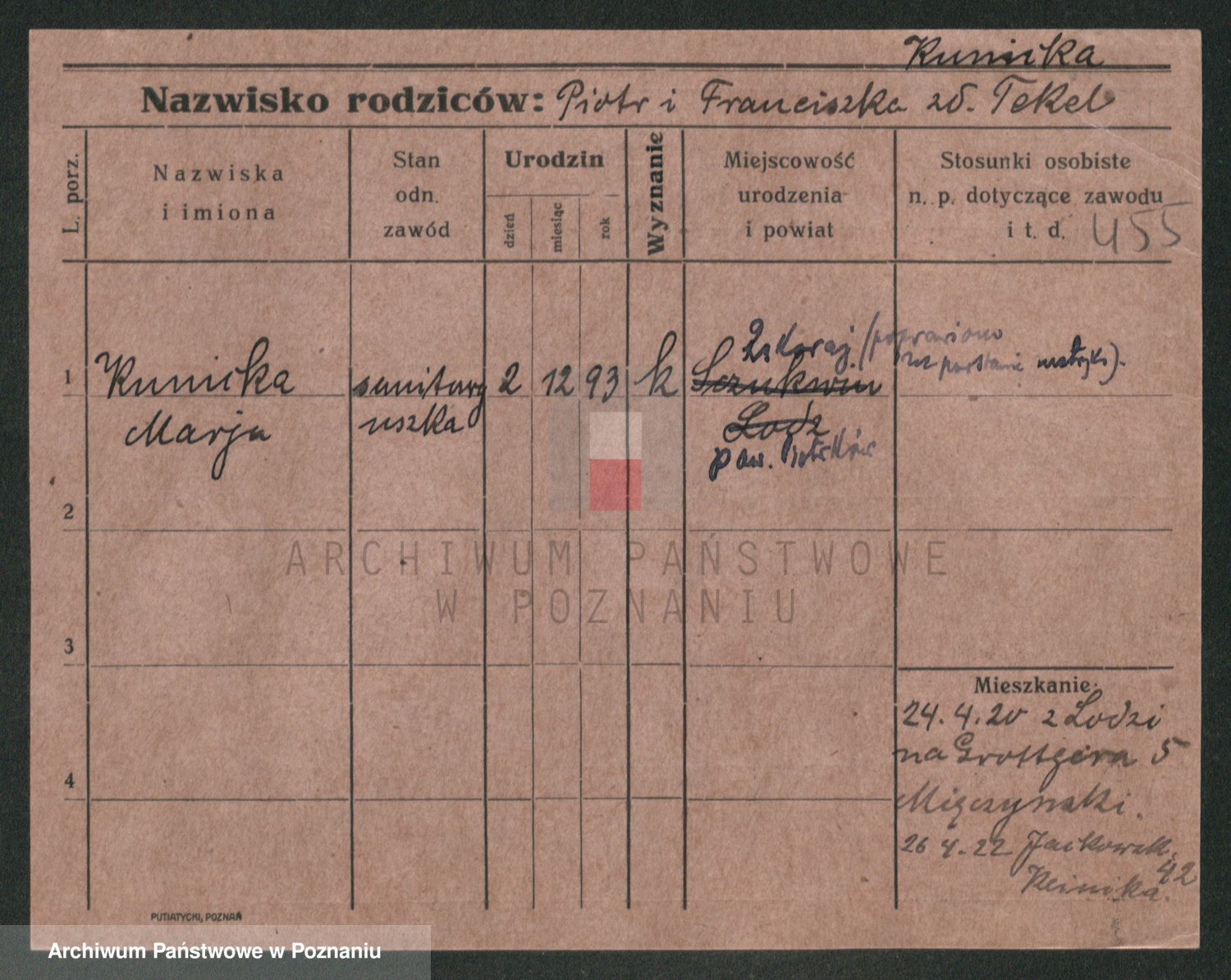 Podgląd karty osobowej dostępny jest po kliknięciu na nazwisko lub ikonkę karty. Można dokonywać powiększenia (ikony na górze) lub przechodzić między kolejnymi skanami (strzałki po bokach).