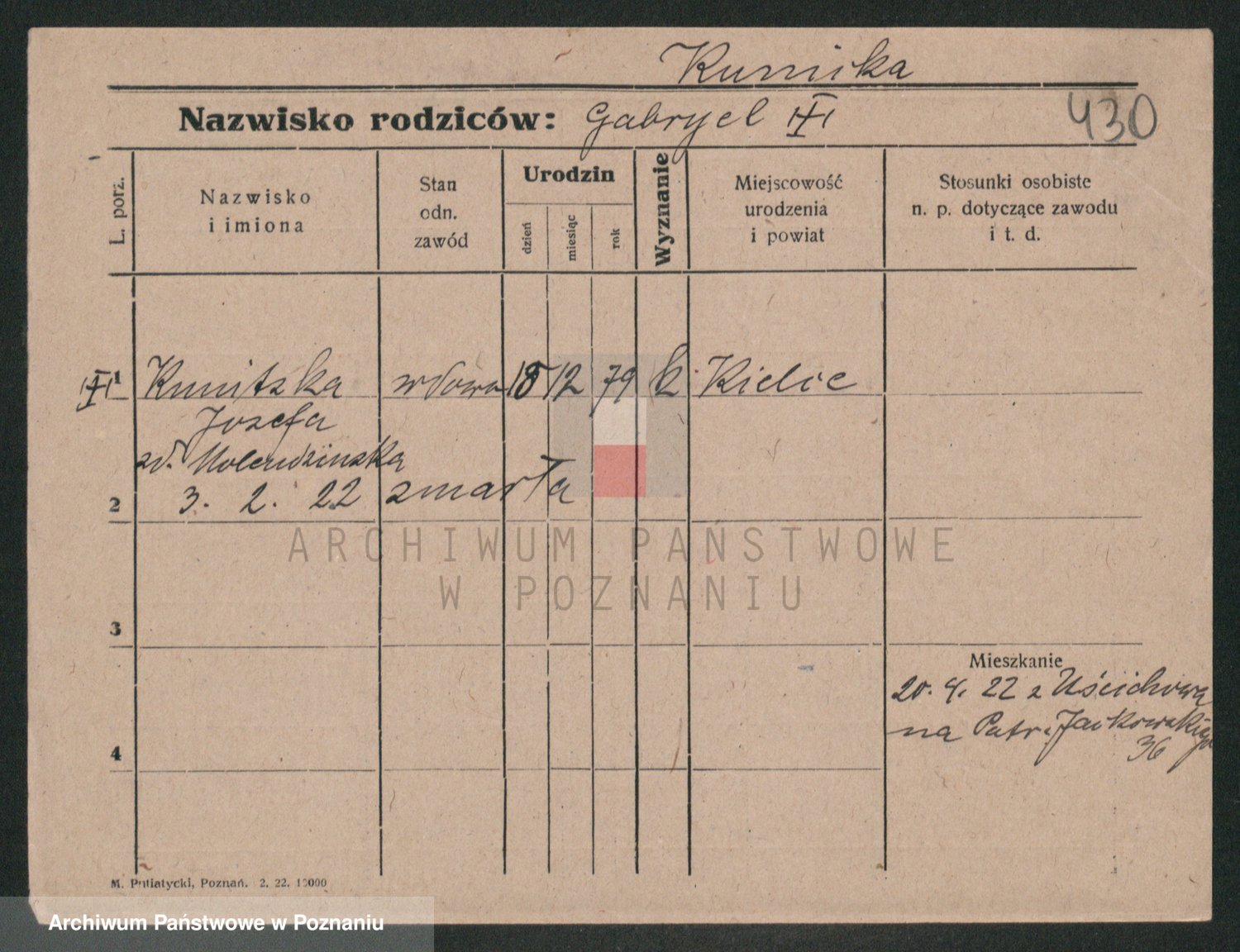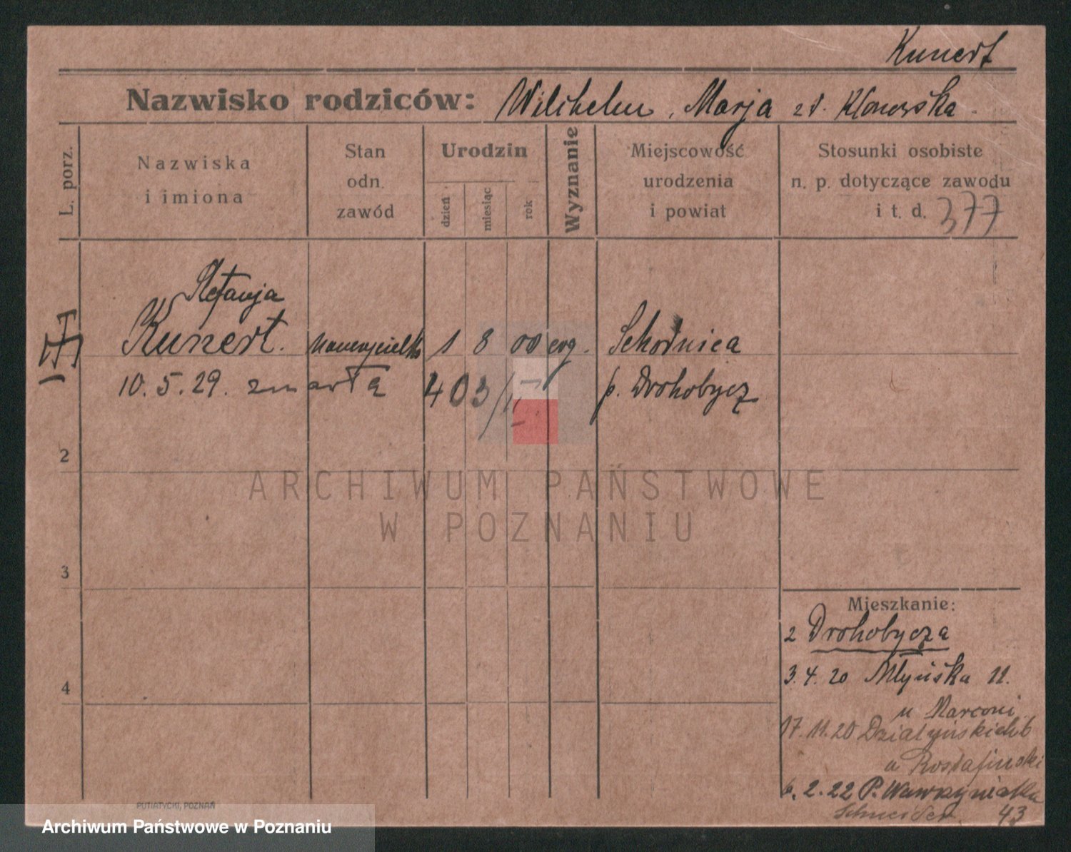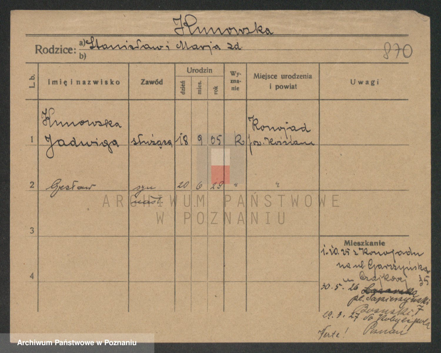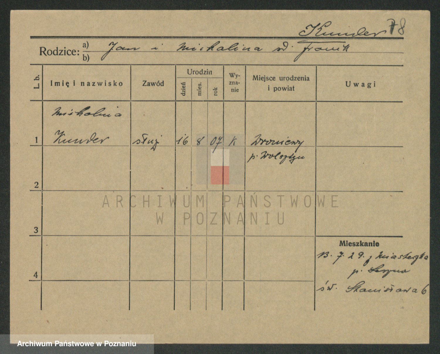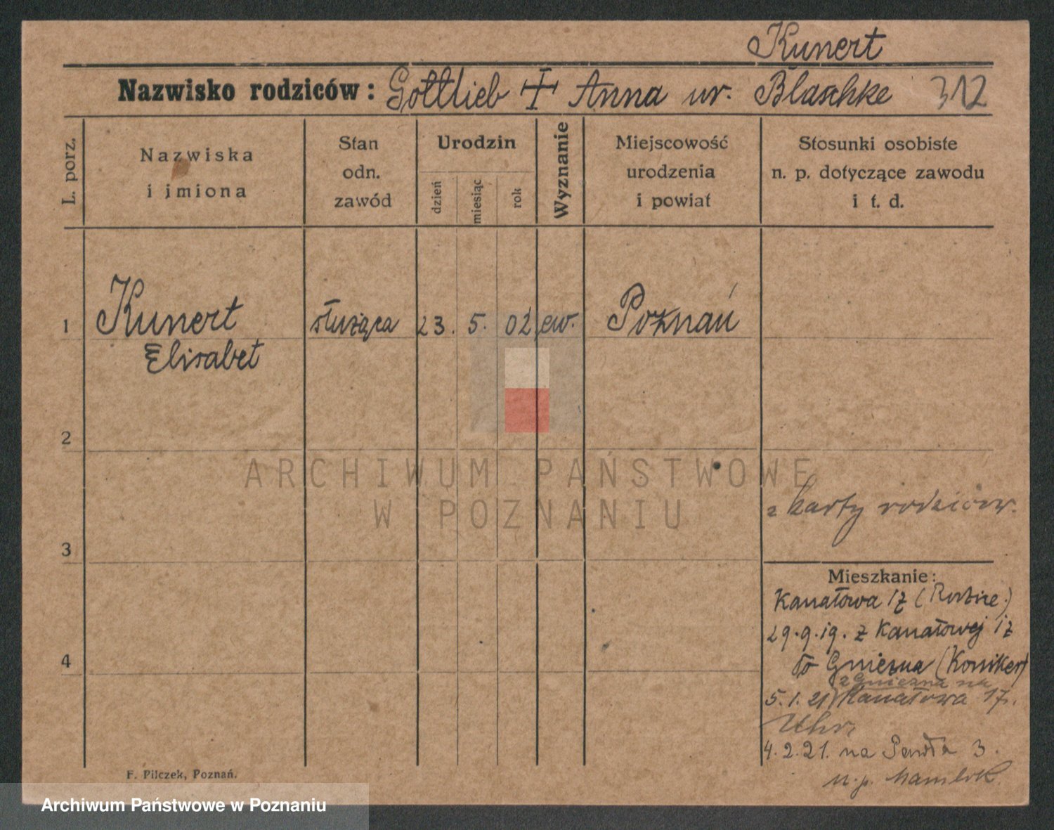 Podgląd karty osobowej dostępny jest po kliknięciu na nazwisko lub ikonkę karty. Można dokonywać powiększenia (ikony na górze) lub przechodzić między kolejnymi skanami (strzałki po bokach).
