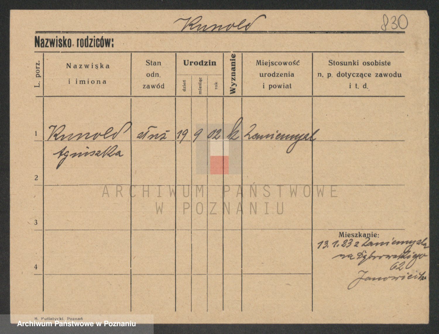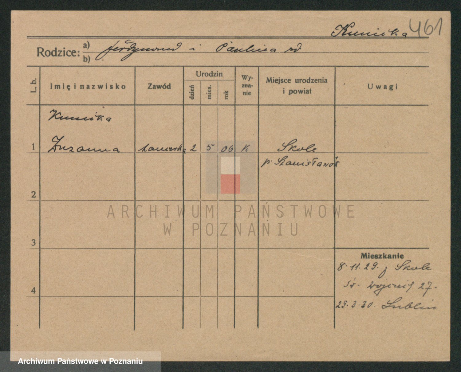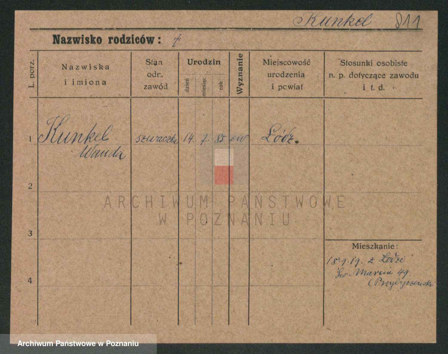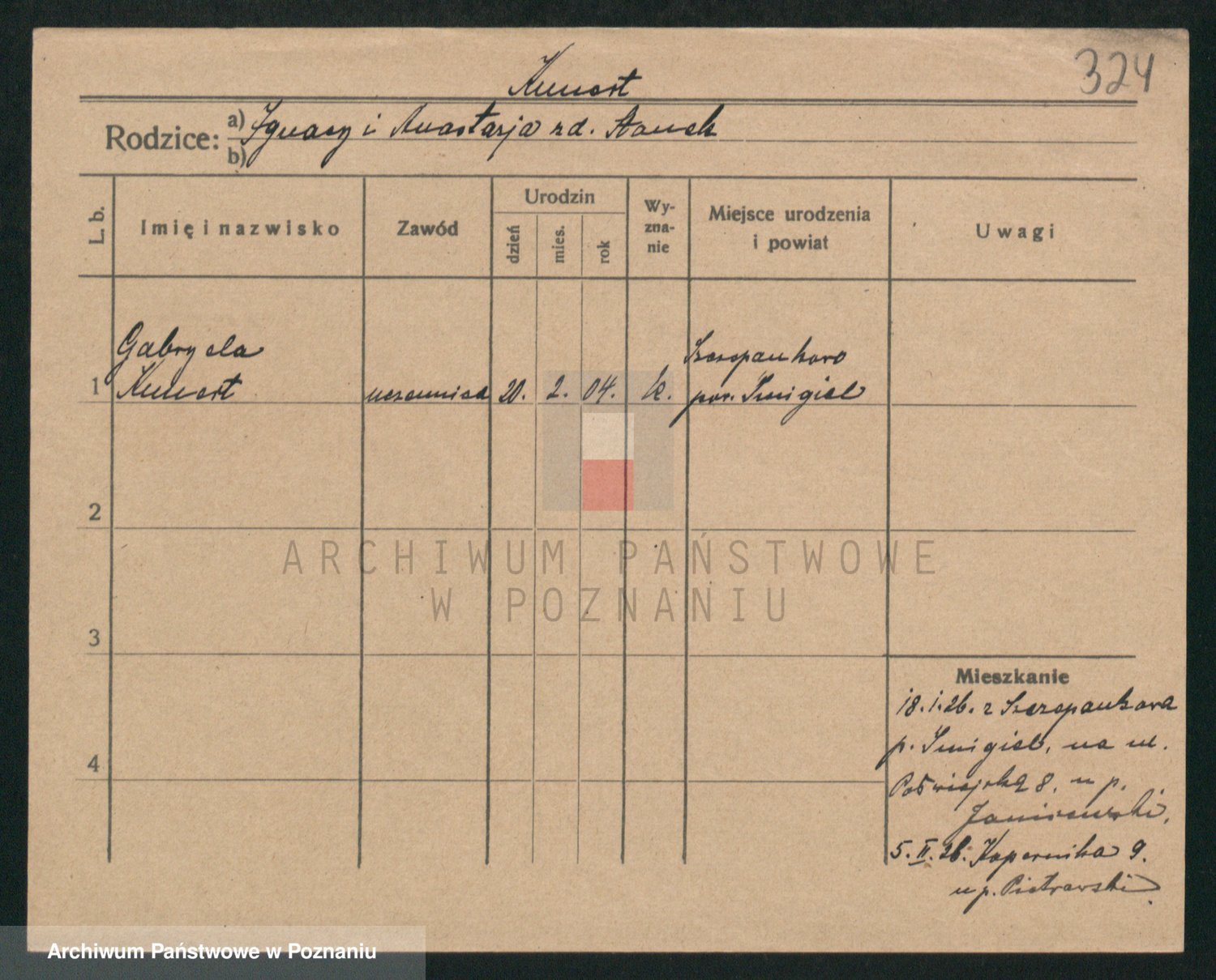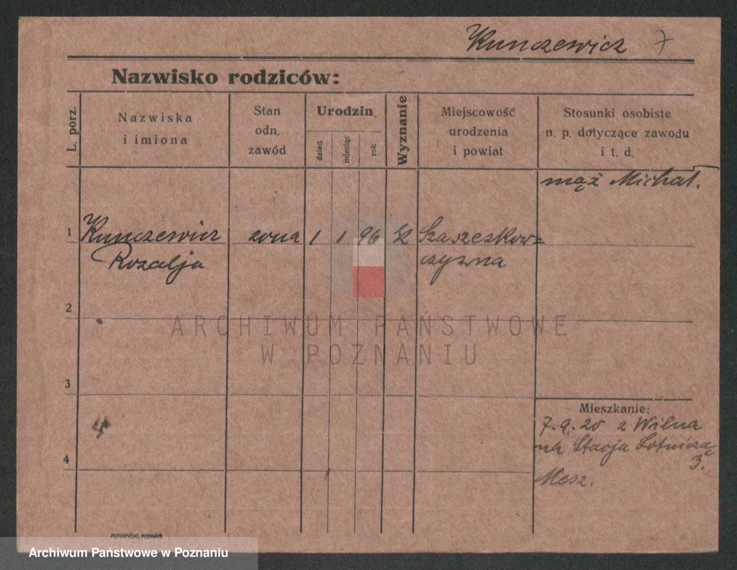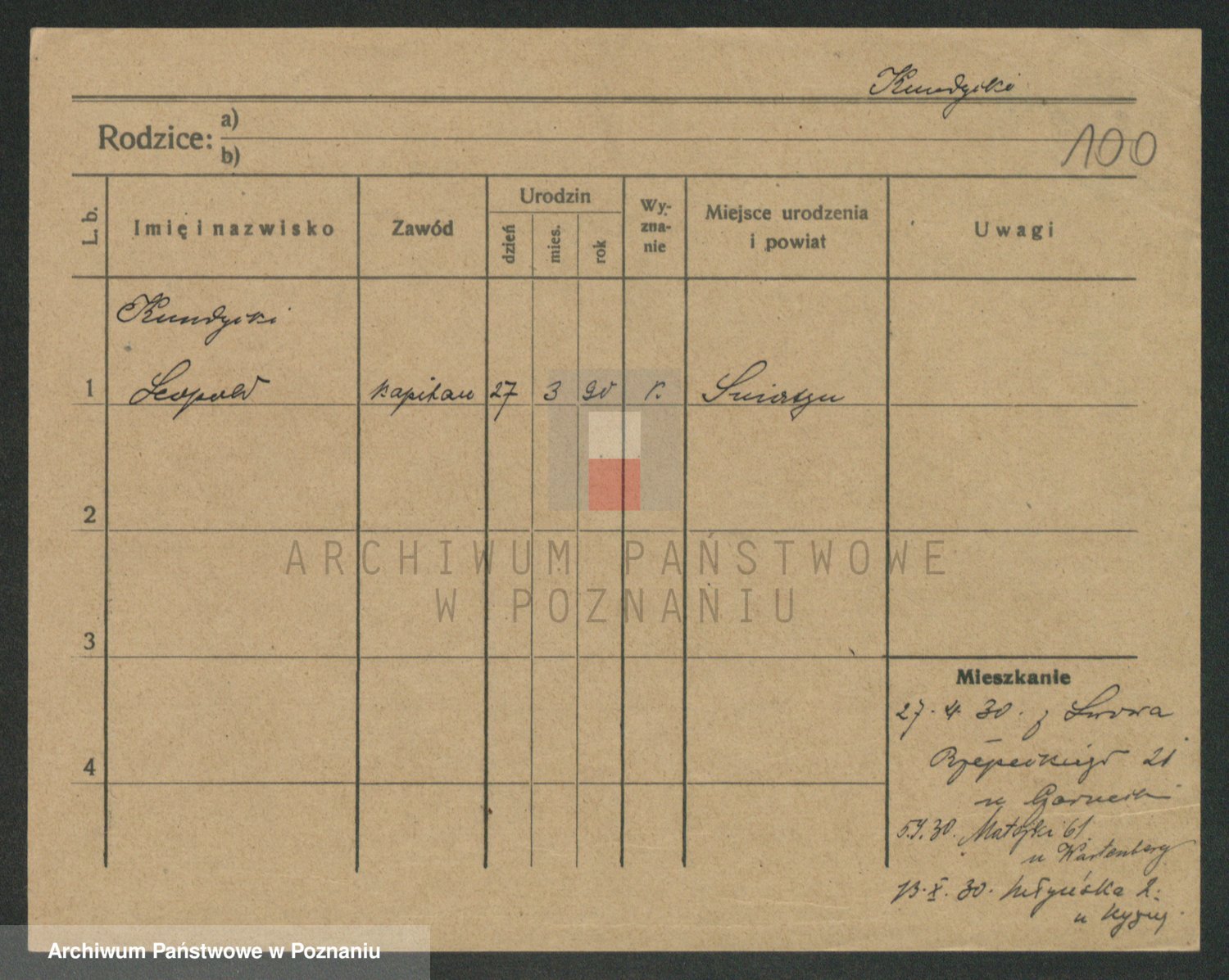 Podgląd karty osobowej dostępny jest po kliknięciu na nazwisko lub ikonkę karty. Można dokonywać powiększenia (ikony na górze) lub przechodzić między kolejnymi skanami (strzałki po bokach).