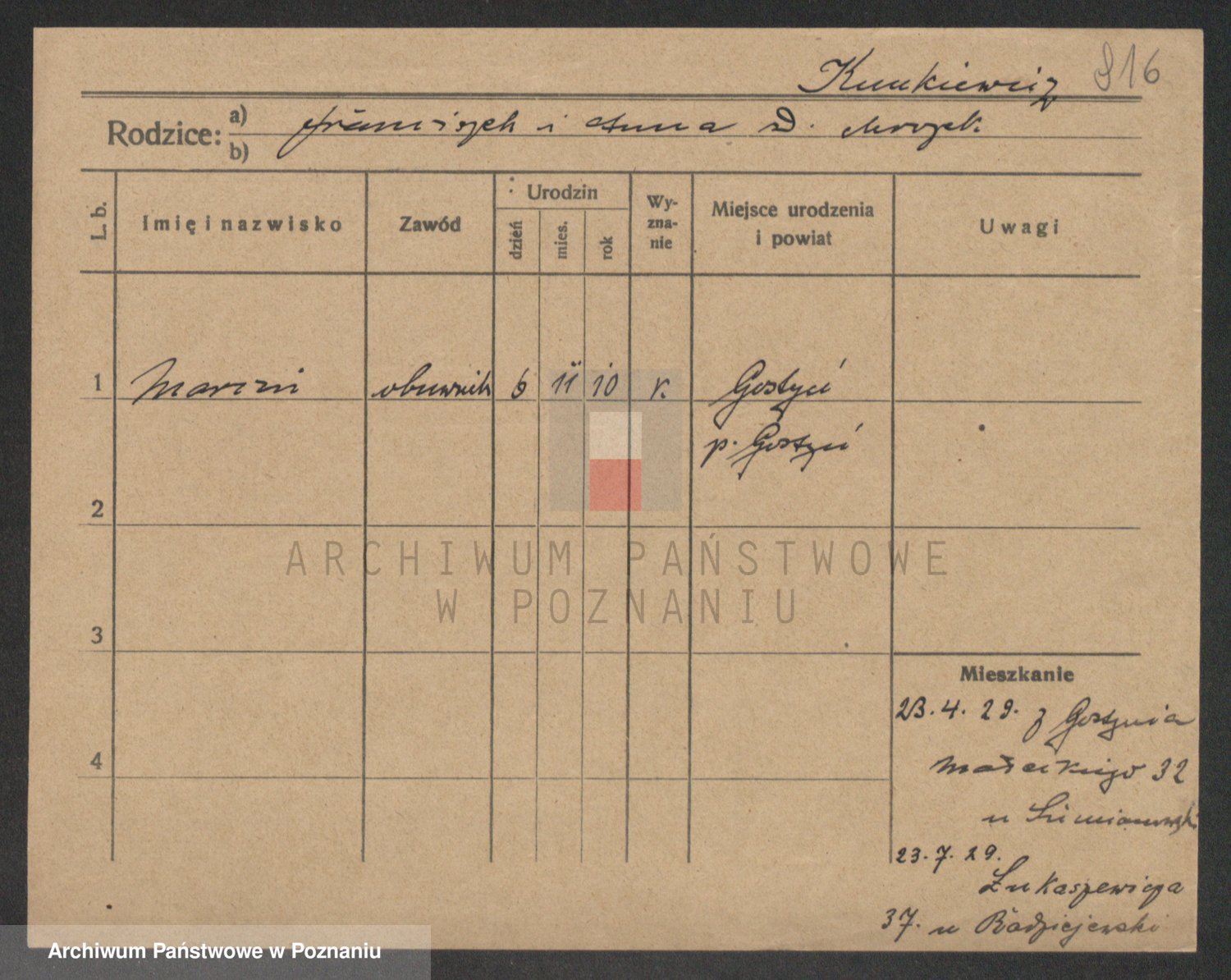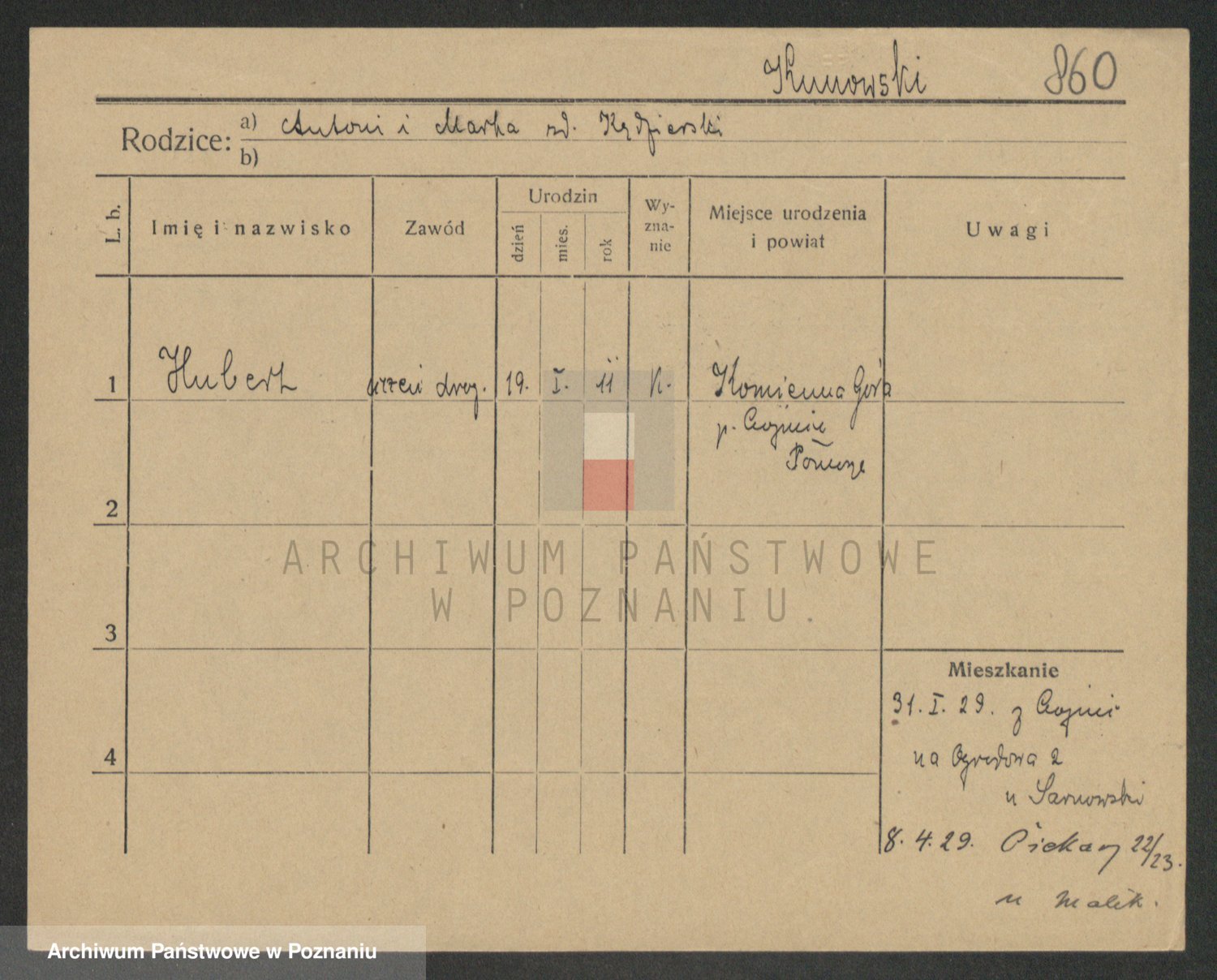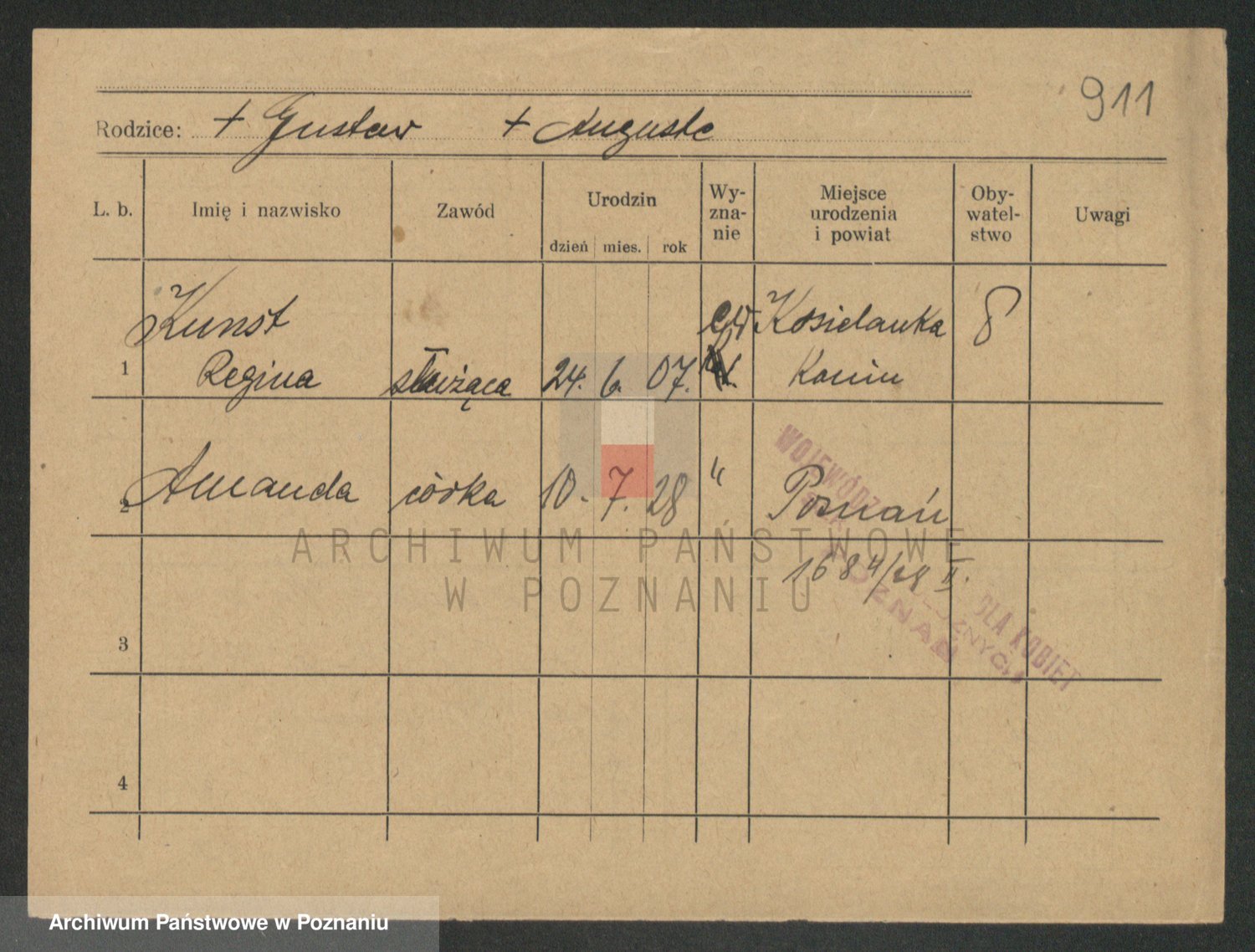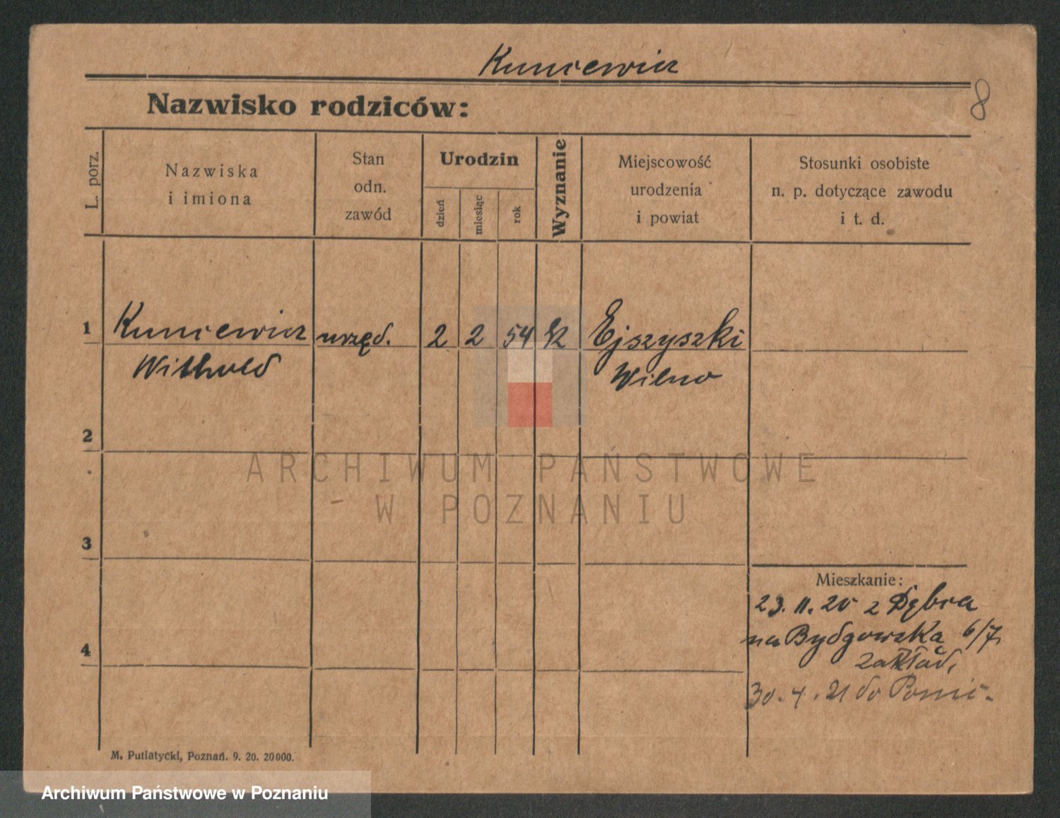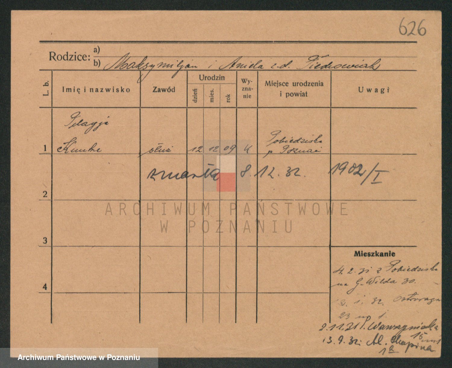 Podgląd karty osobowej dostępny jest po kliknięciu na nazwisko lub ikonkę karty. Można dokonywać powiększenia (ikony na górze) lub przechodzić między kolejnymi skanami (strzałki po bokach).