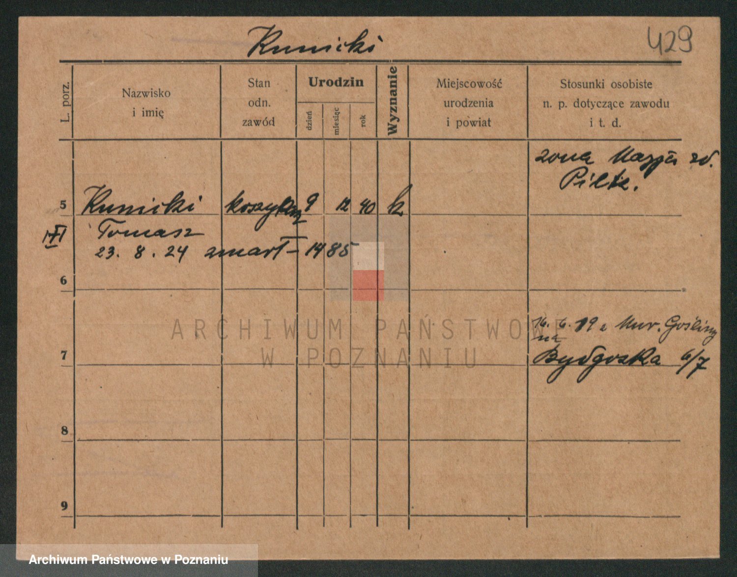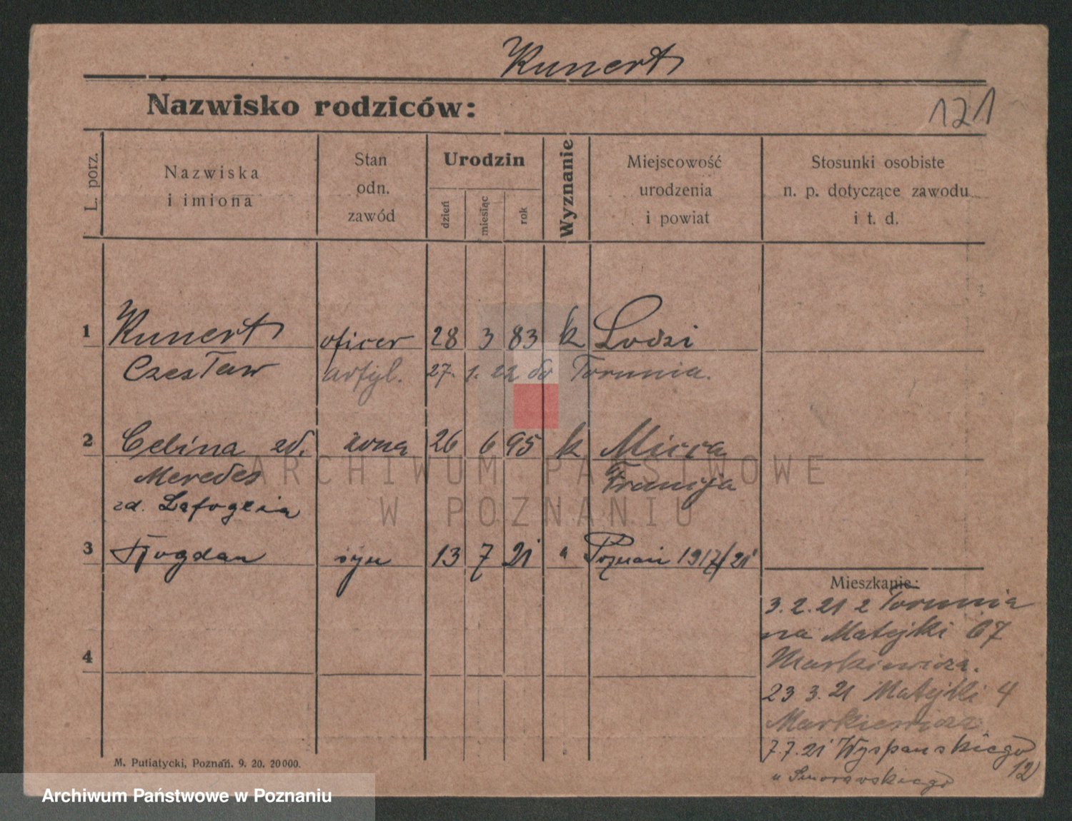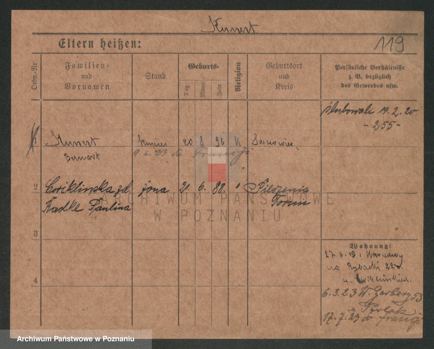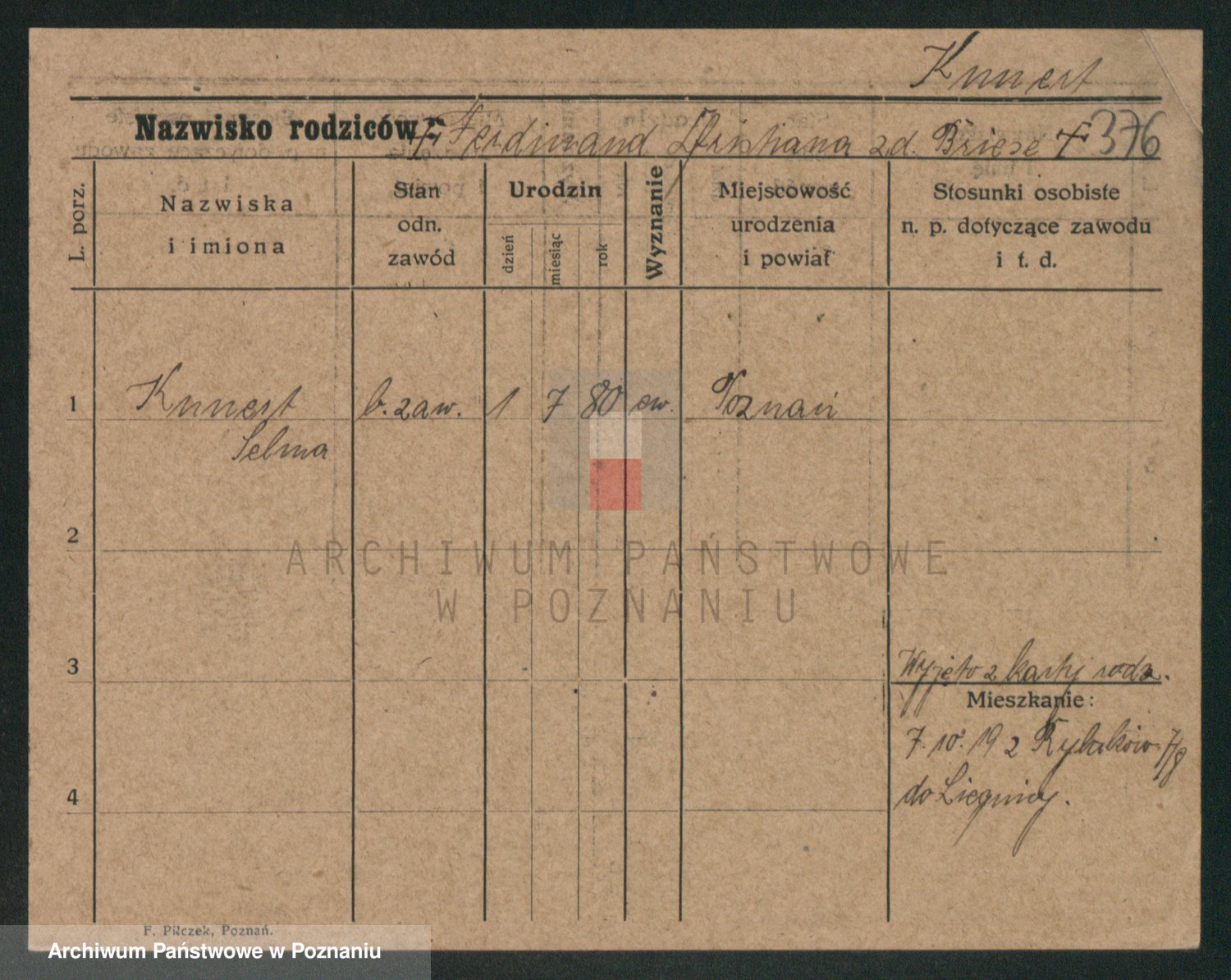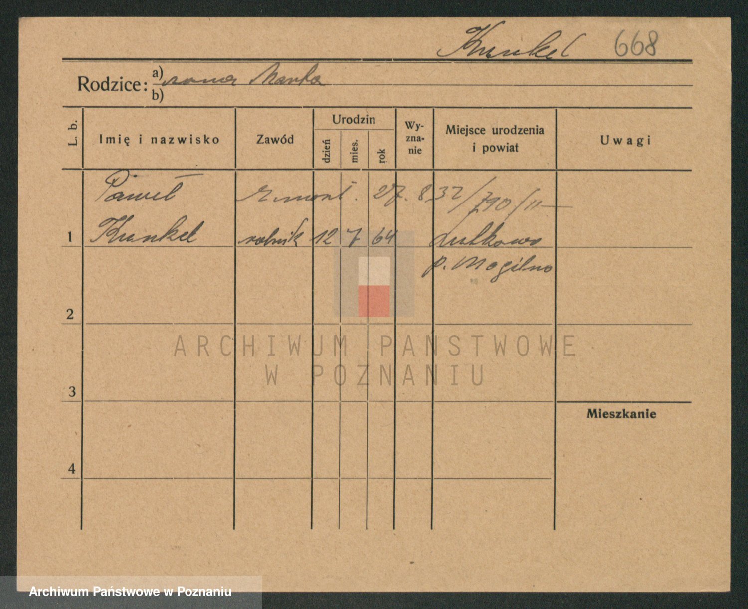 Podgląd karty osobowej dostępny jest po kliknięciu na nazwisko lub ikonkę karty. Można dokonywać powiększenia (ikony na górze) lub przechodzić między kolejnymi skanami (strzałki po bokach).
