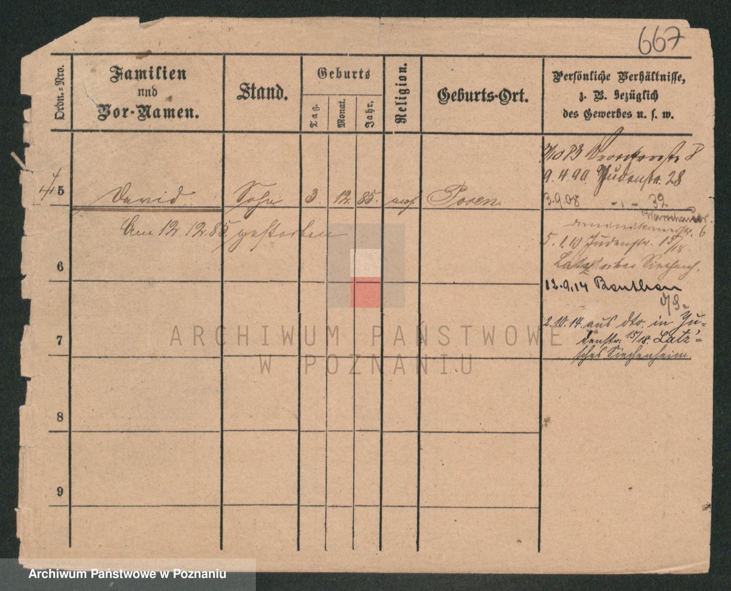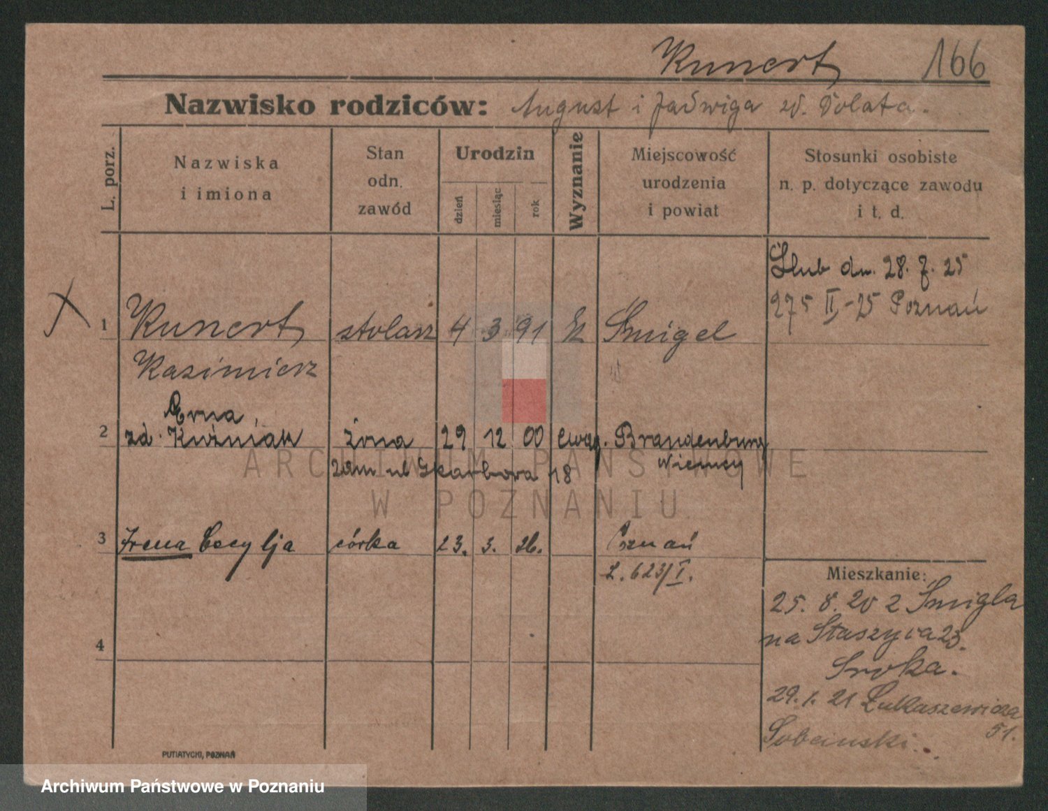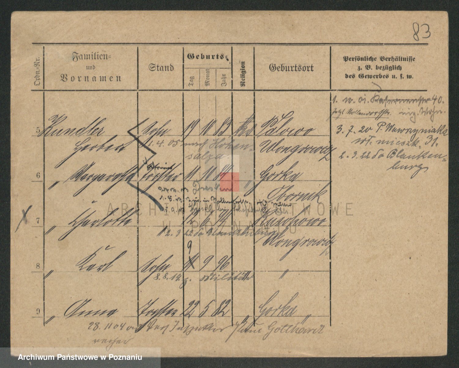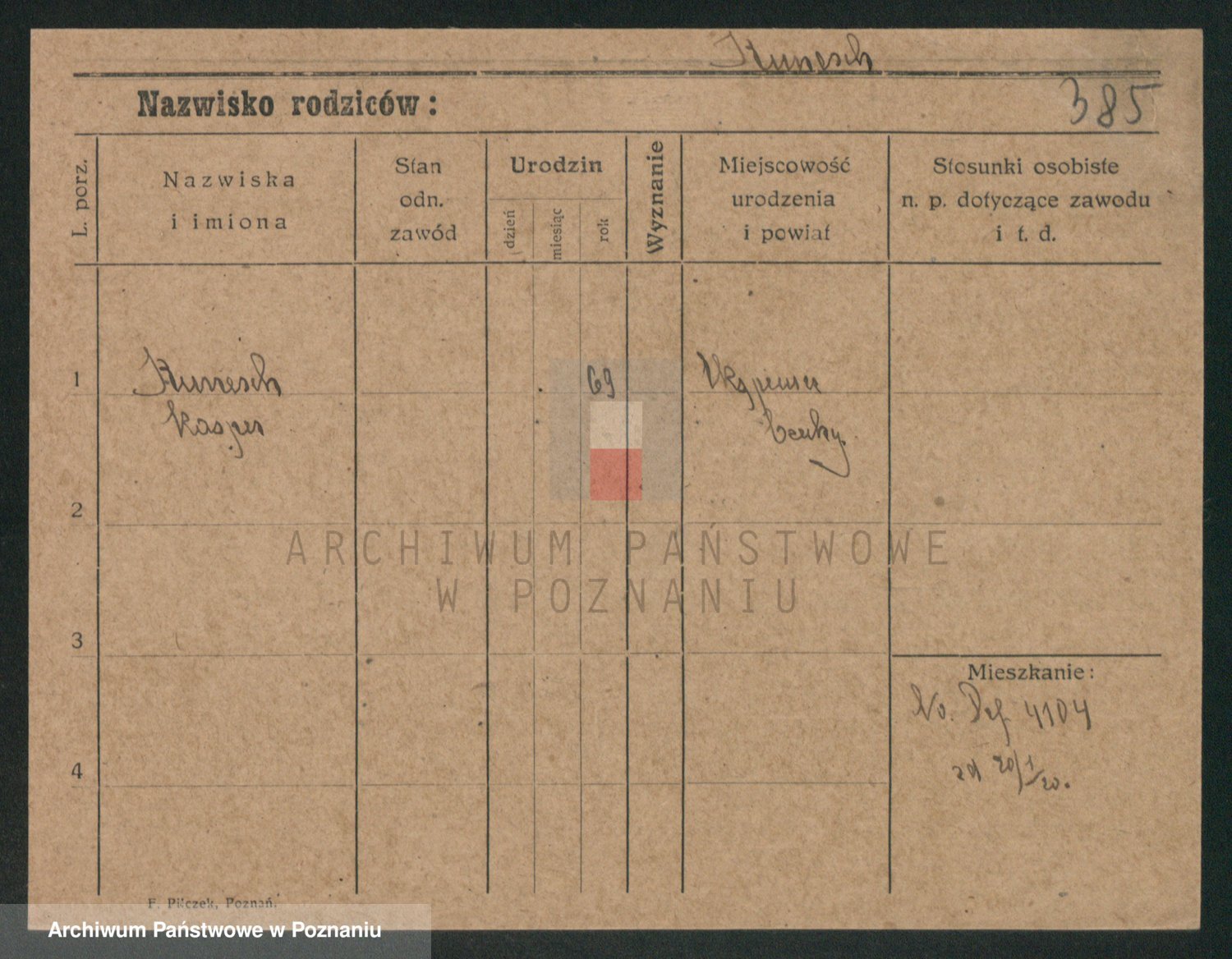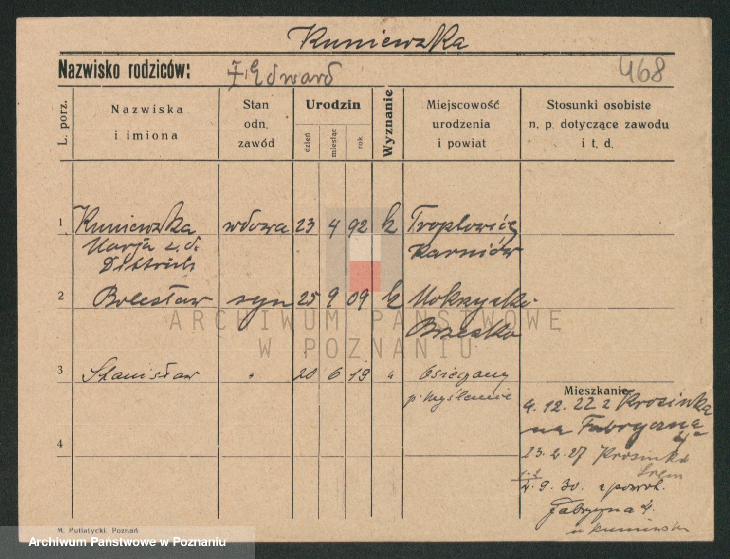 Podgląd karty osobowej dostępny jest po kliknięciu na nazwisko lub ikonkę karty. Można dokonywać powiększenia (ikony na górze) lub przechodzić między kolejnymi skanami (strzałki po bokach).