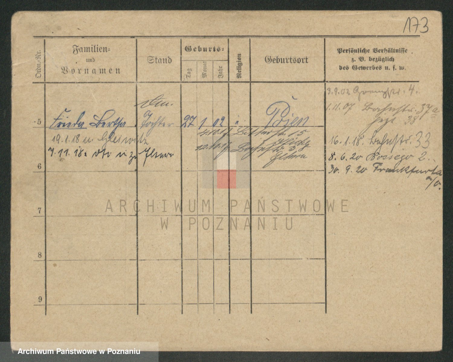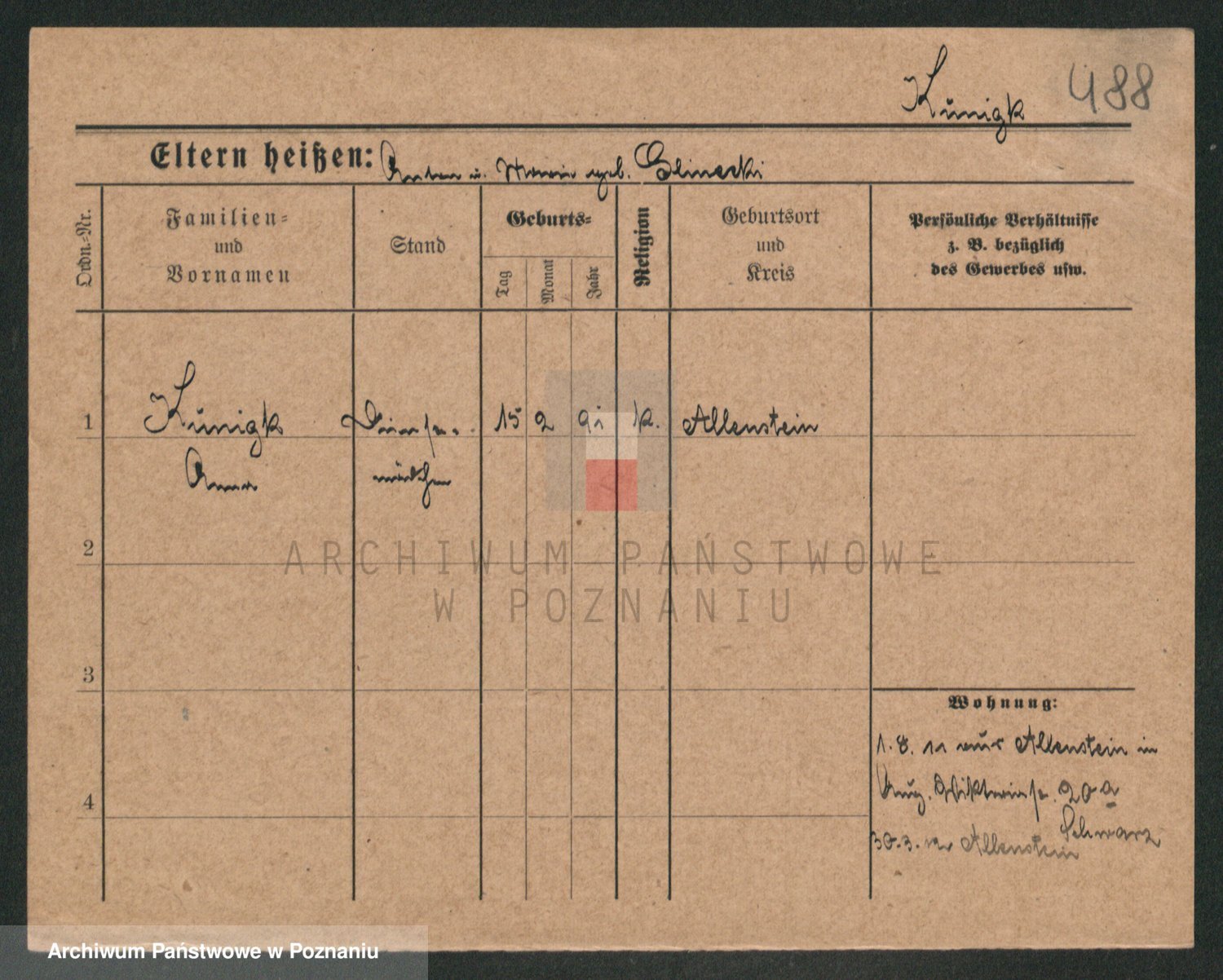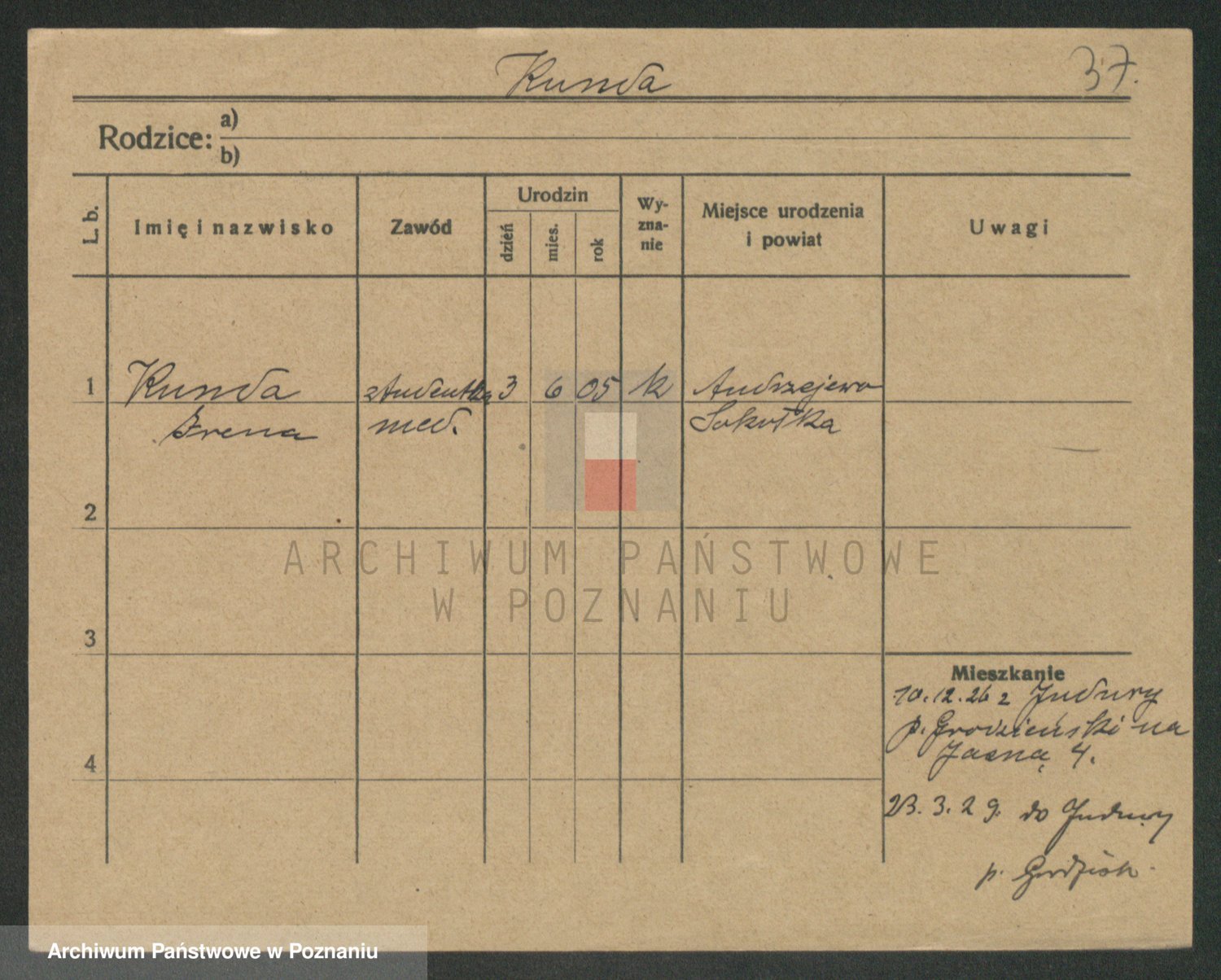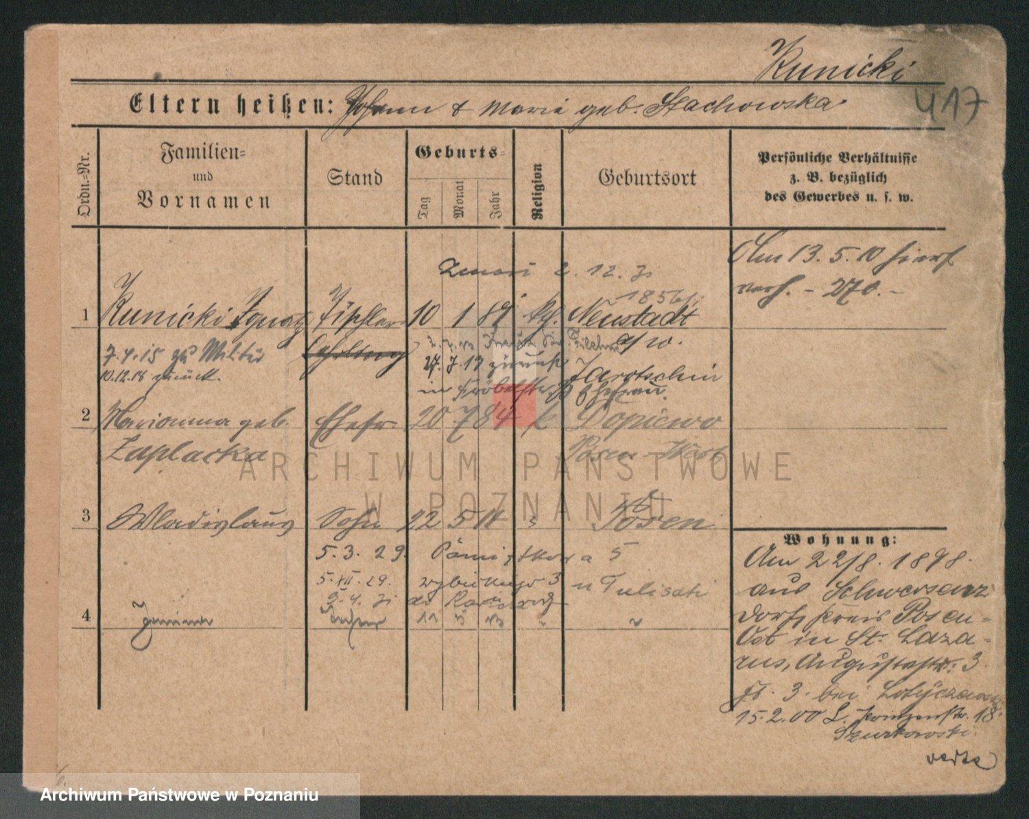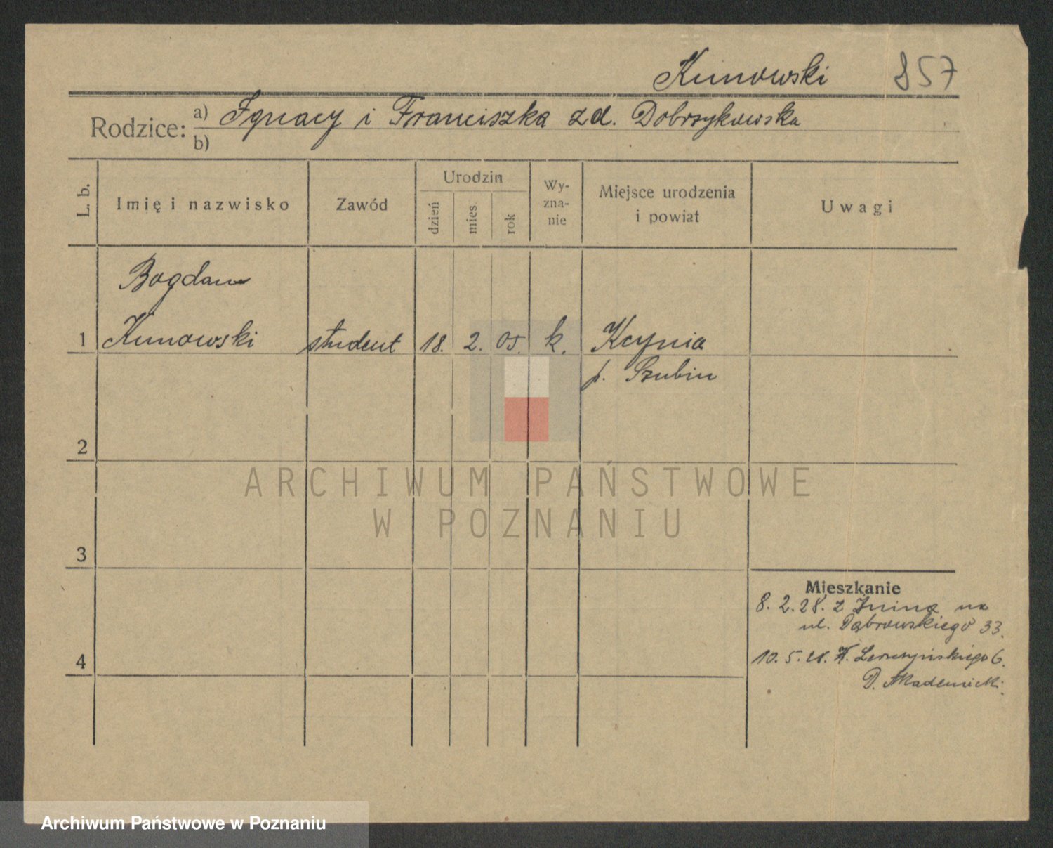 Podgląd karty osobowej dostępny jest po kliknięciu na nazwisko lub ikonkę karty. Można dokonywać powiększenia (ikony na górze) lub przechodzić między kolejnymi skanami (strzałki po bokach).