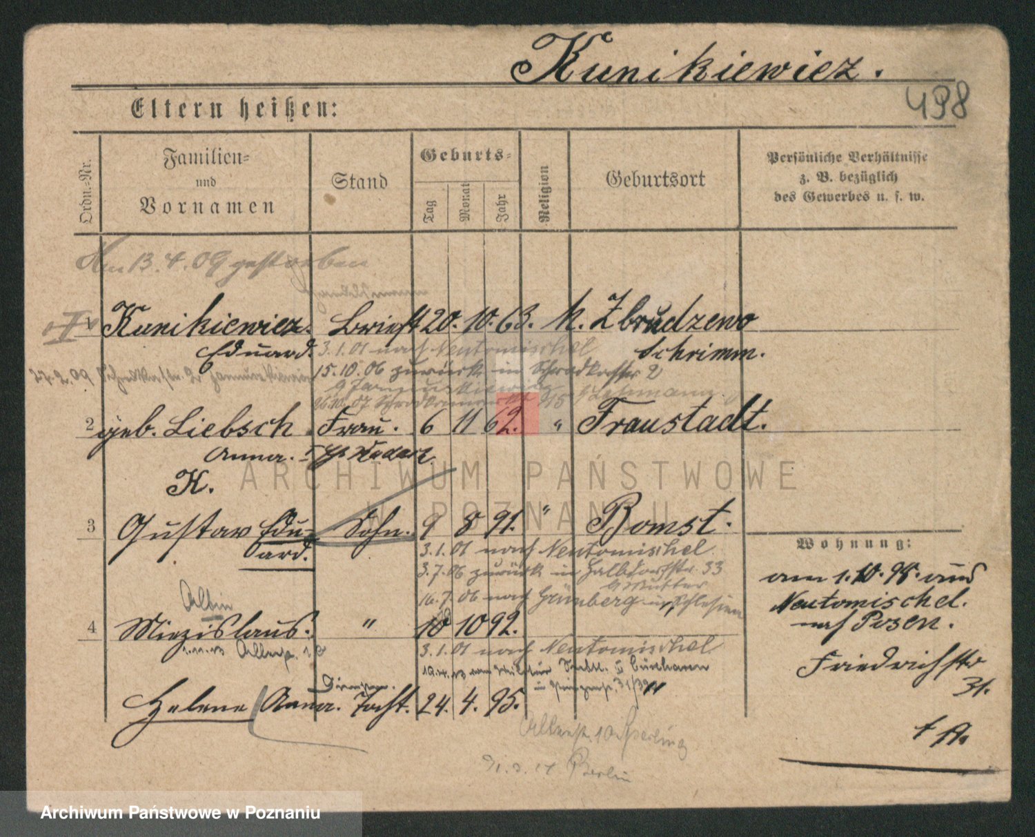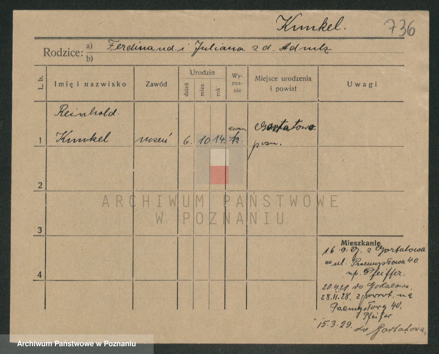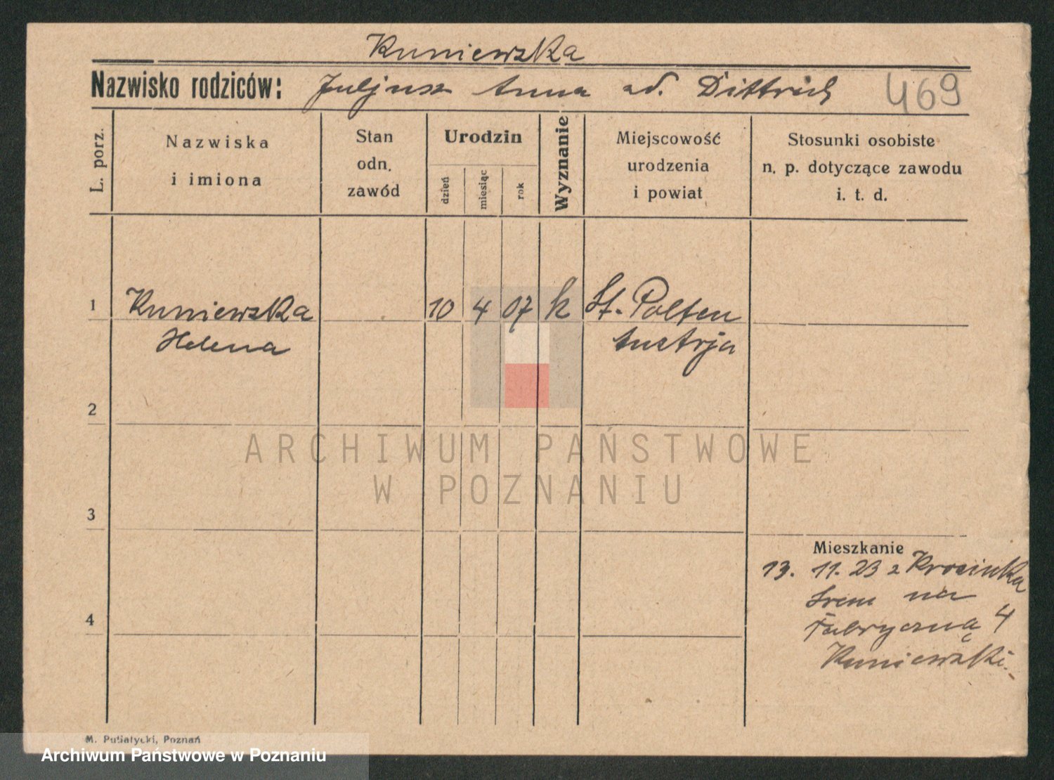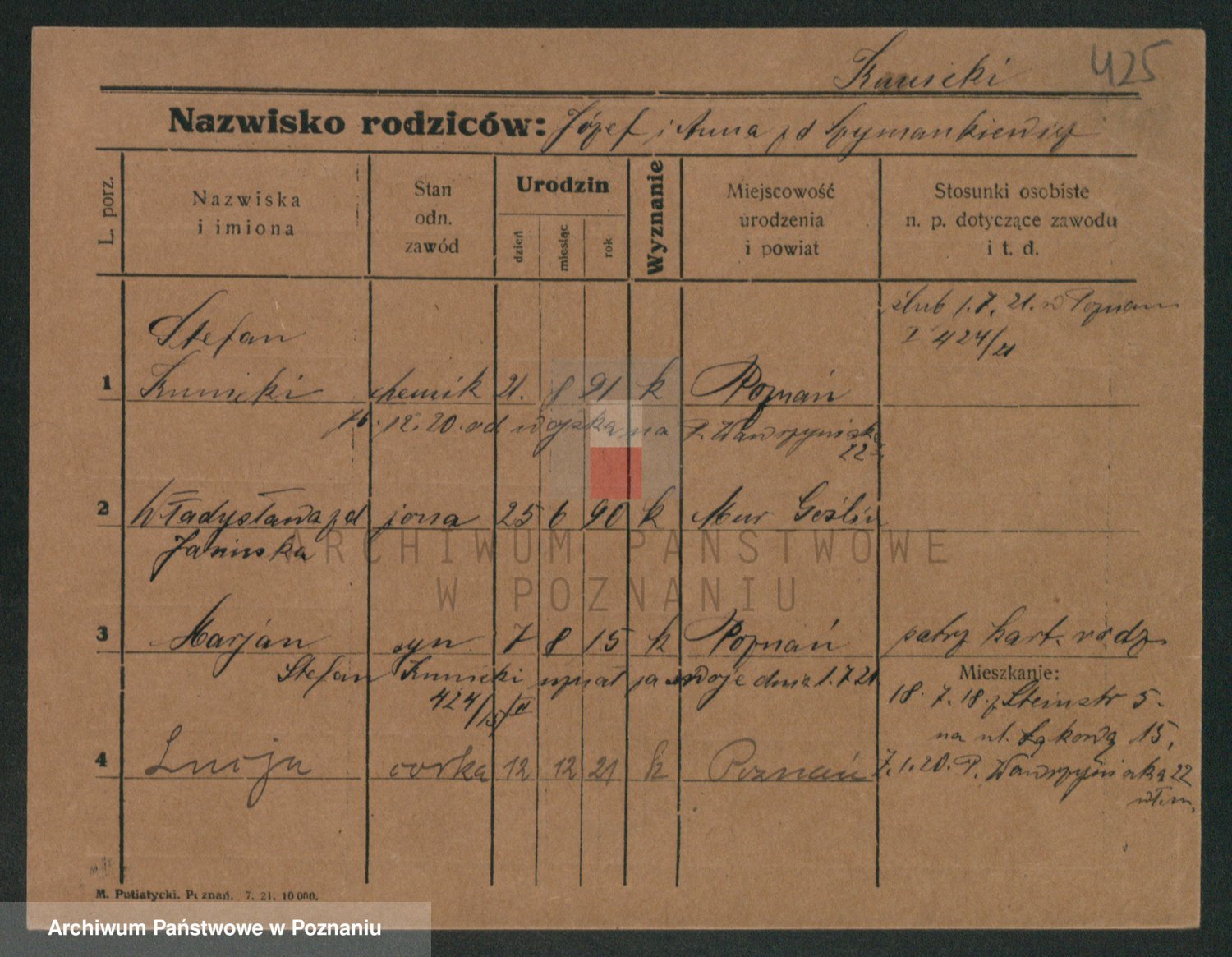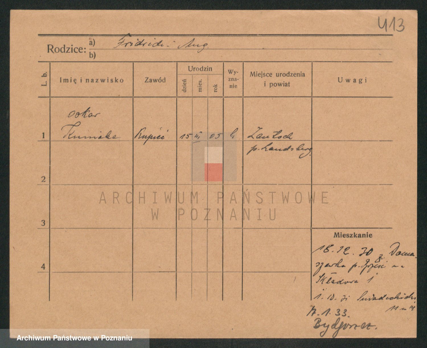 Podgląd karty osobowej dostępny jest po kliknięciu na nazwisko lub ikonkę karty. Można dokonywać powiększenia (ikony na górze) lub przechodzić między kolejnymi skanami (strzałki po bokach).