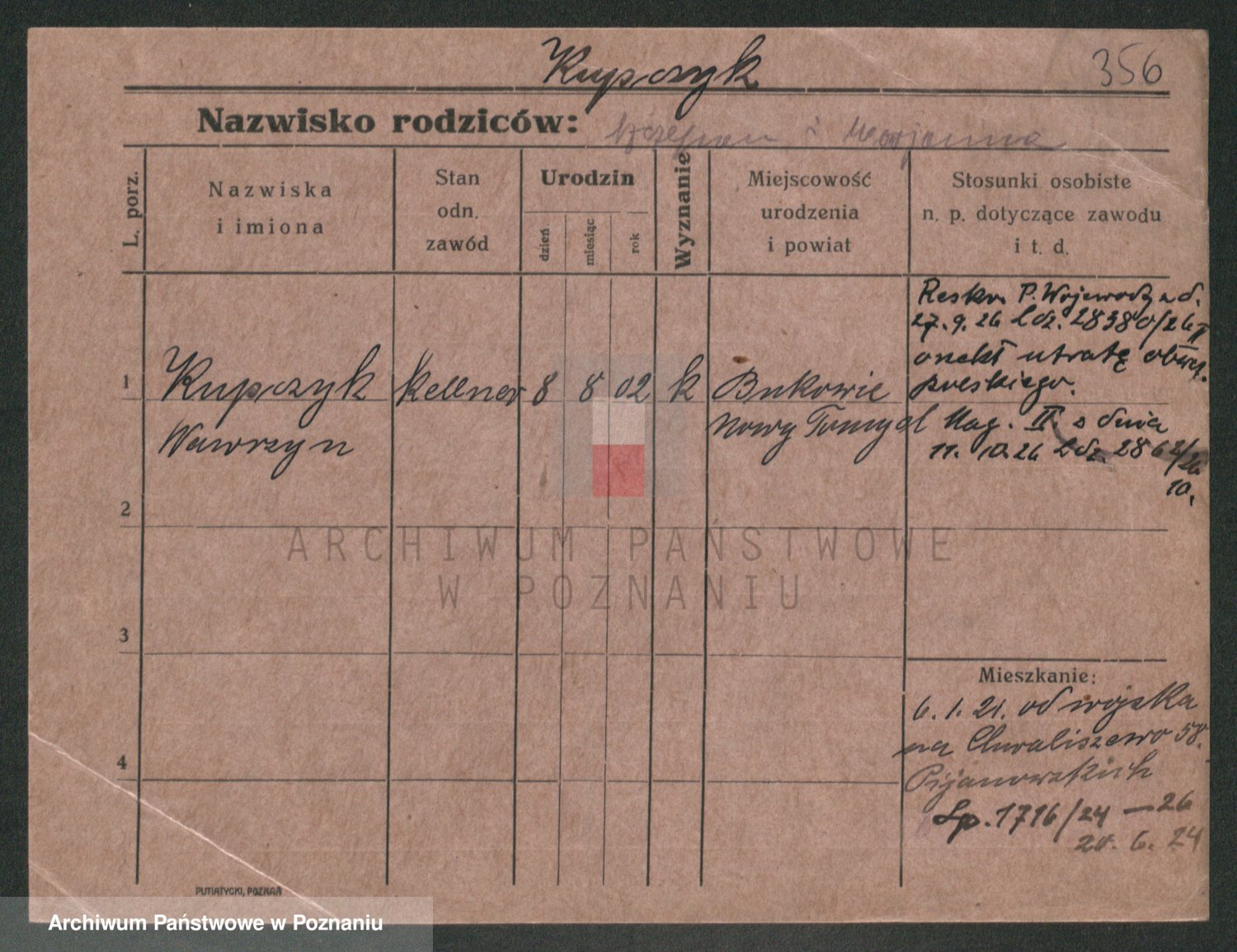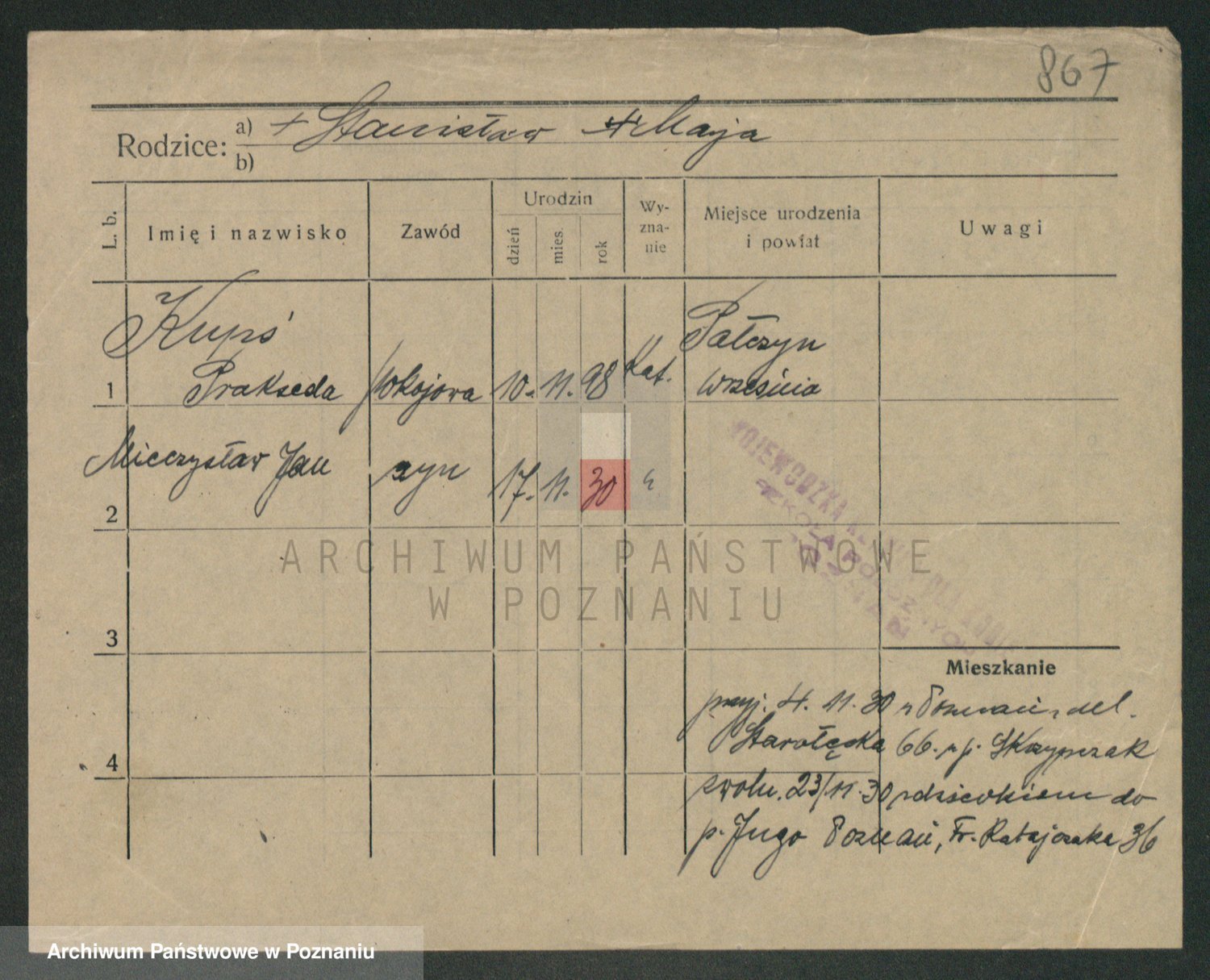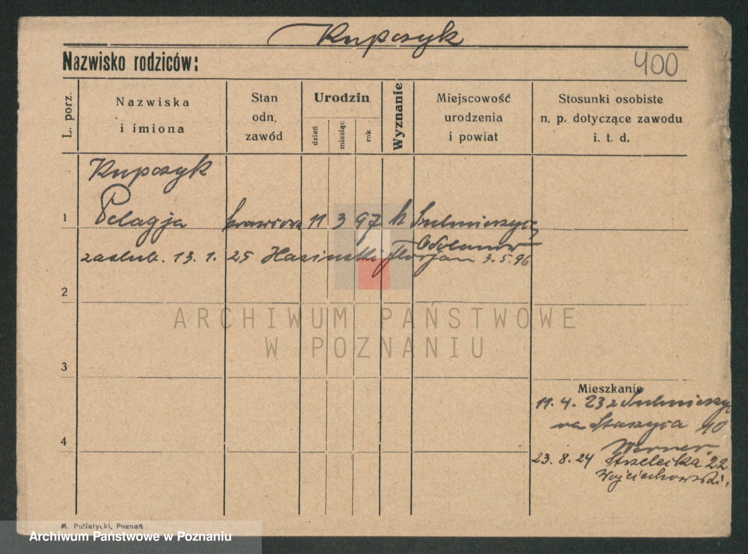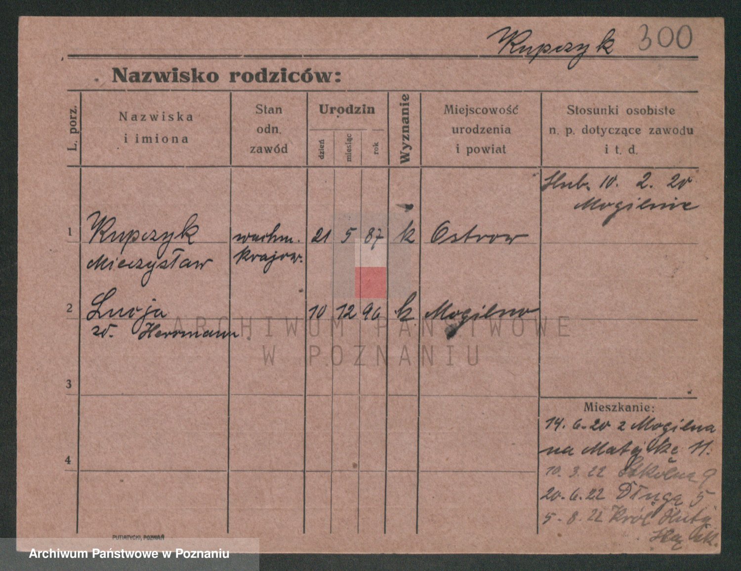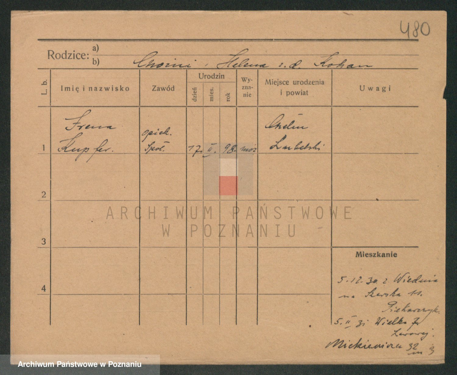 Podgląd karty osobowej dostępny jest po kliknięciu na nazwisko lub ikonkę karty. Można dokonywać powiększenia (ikony na górze) lub przechodzić między kolejnymi skanami (strzałki po bokach).