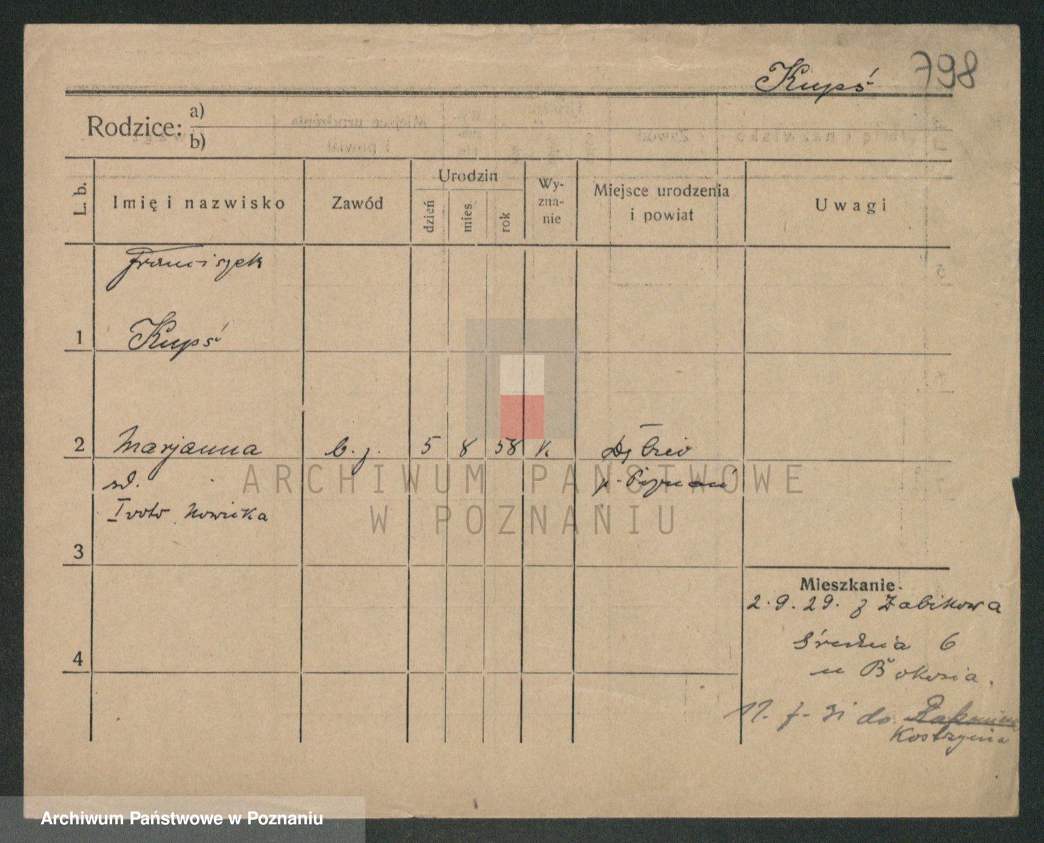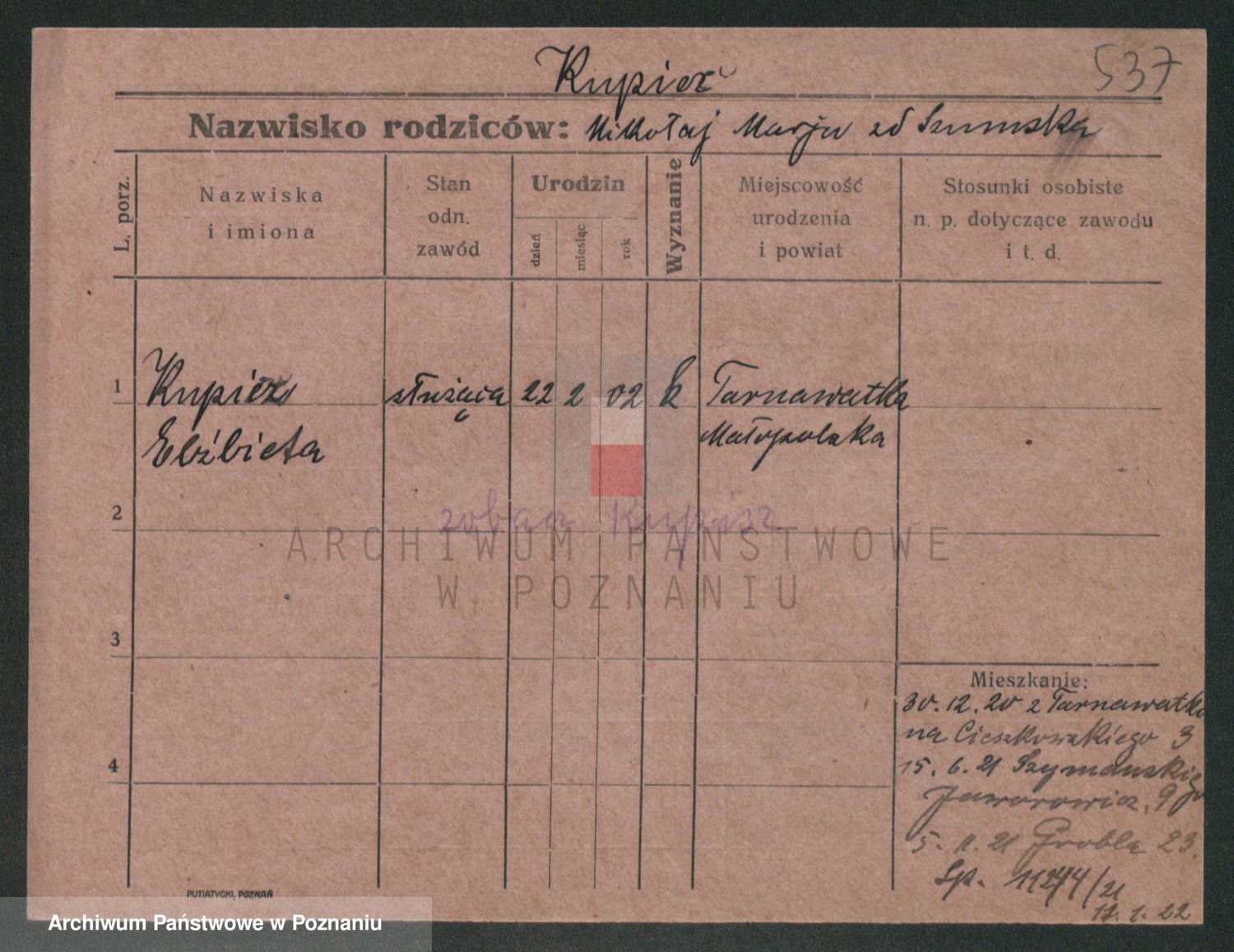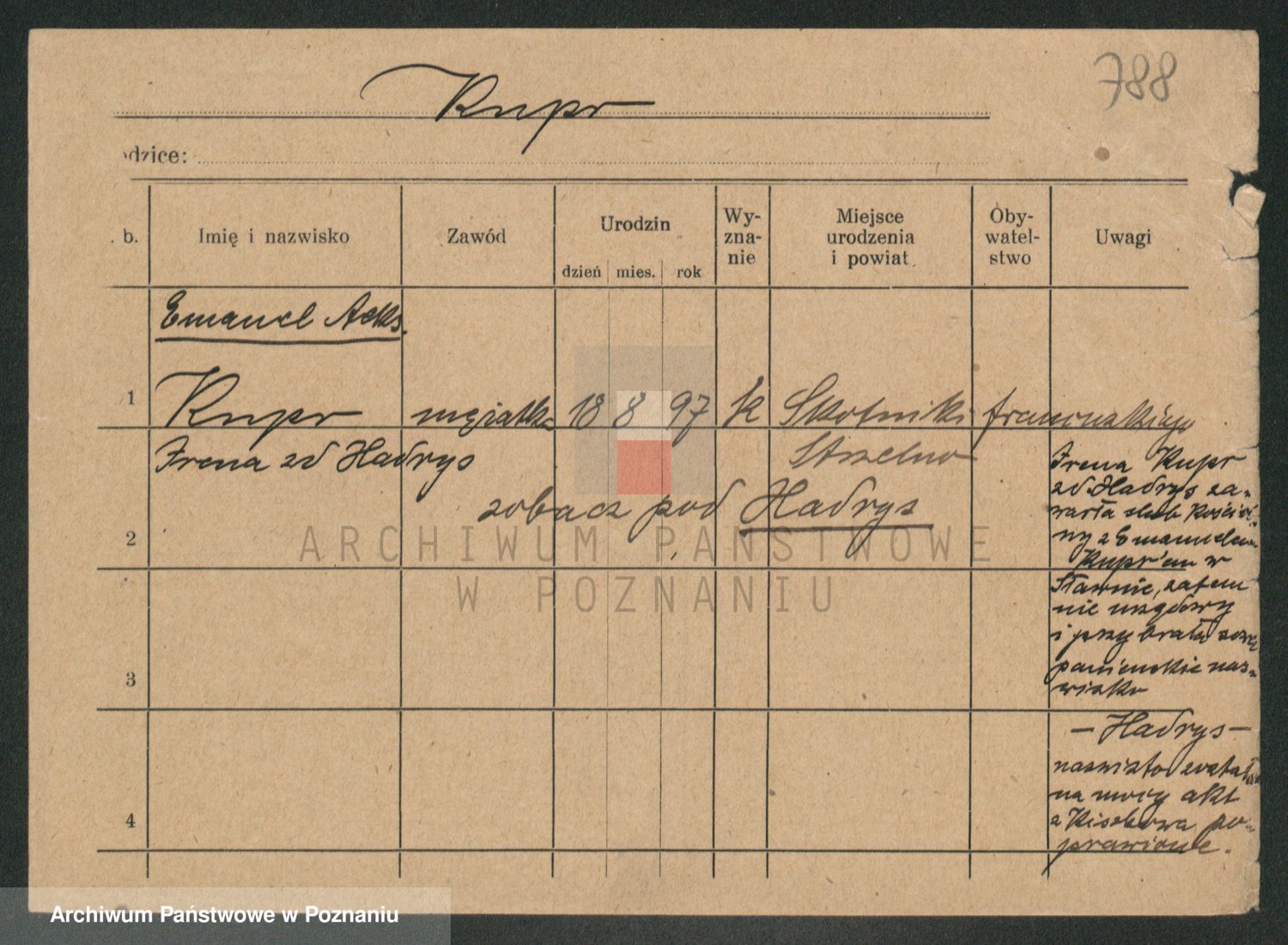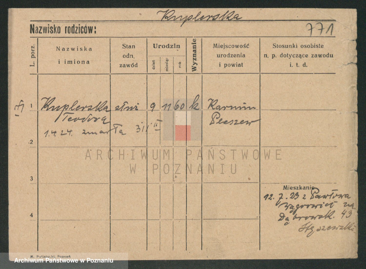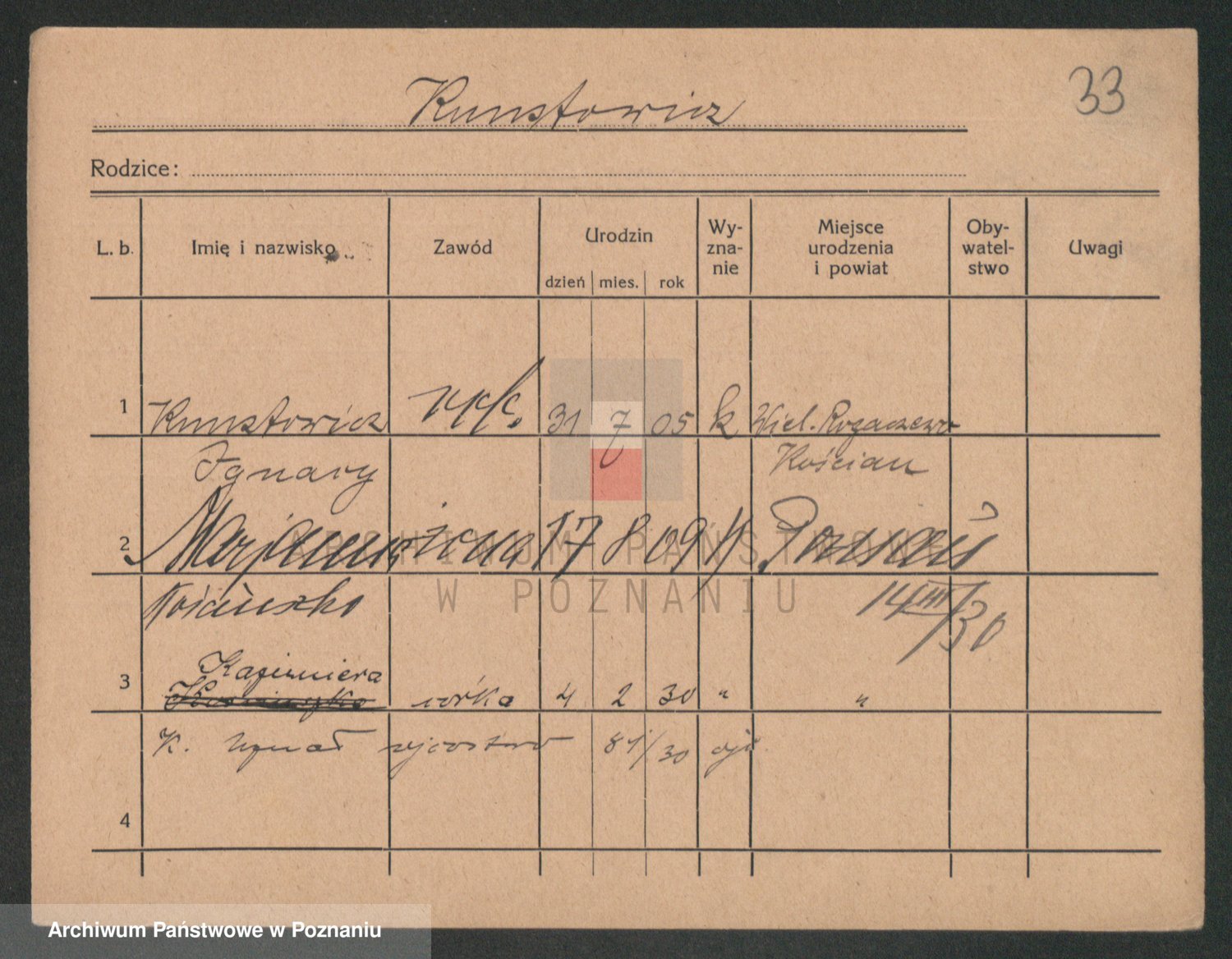 Podgląd karty osobowej dostępny jest po kliknięciu na nazwisko lub ikonkę karty. Można dokonywać powiększenia (ikony na górze) lub przechodzić między kolejnymi skanami (strzałki po bokach).