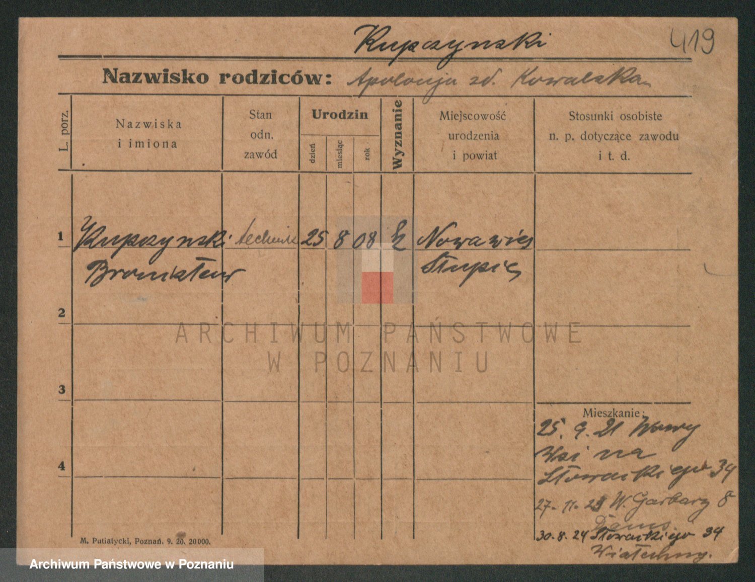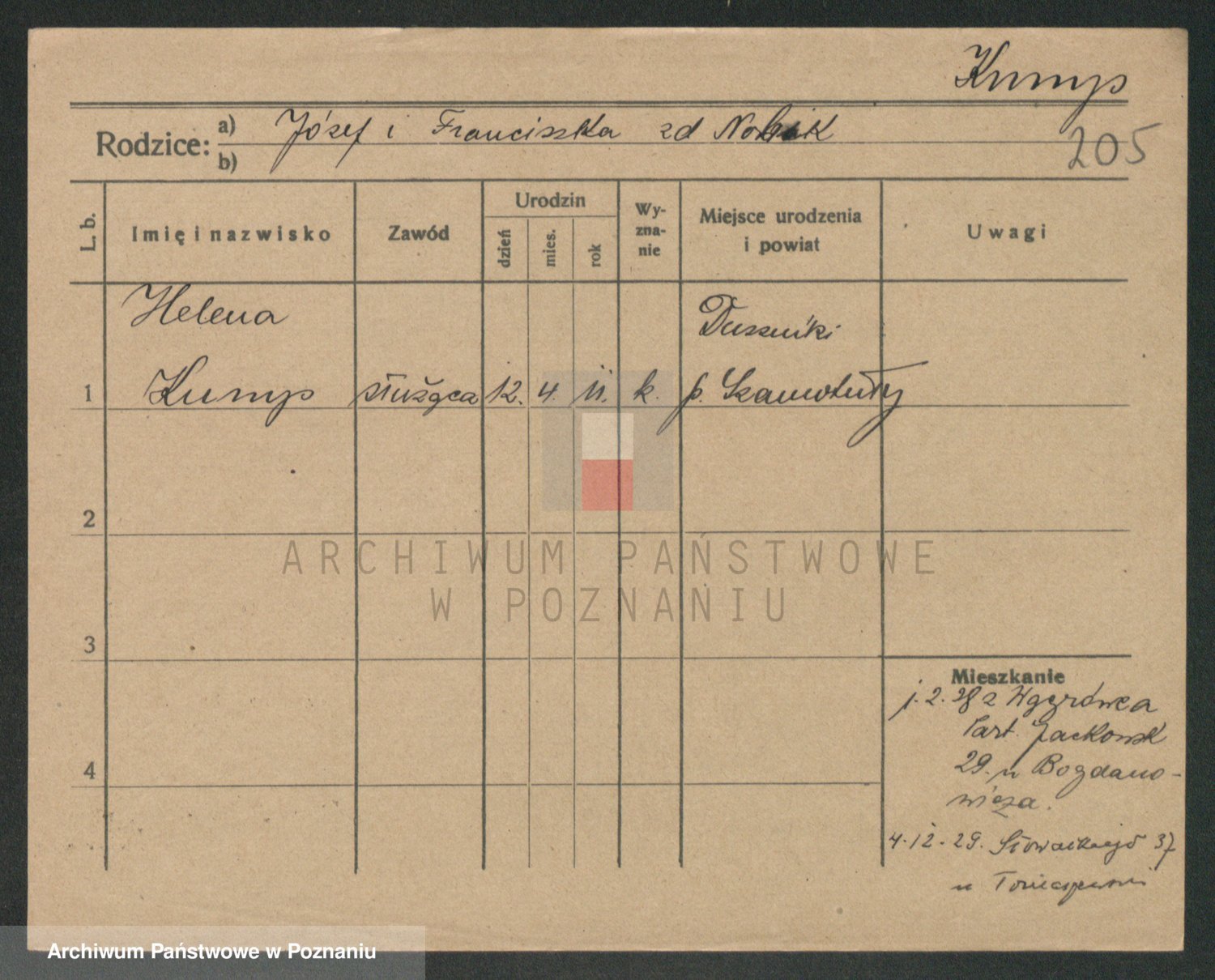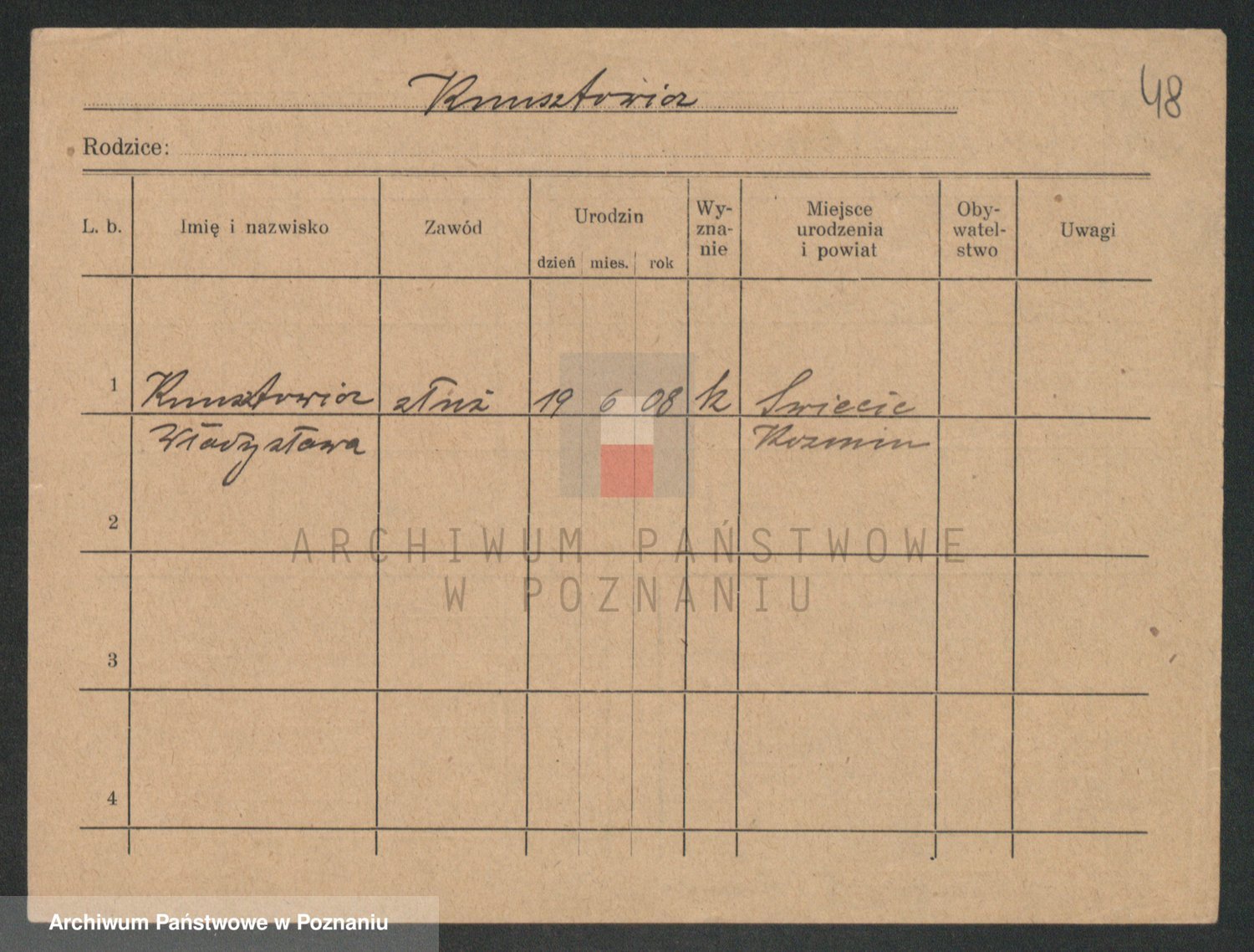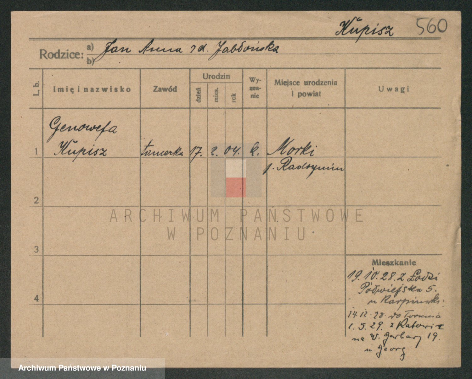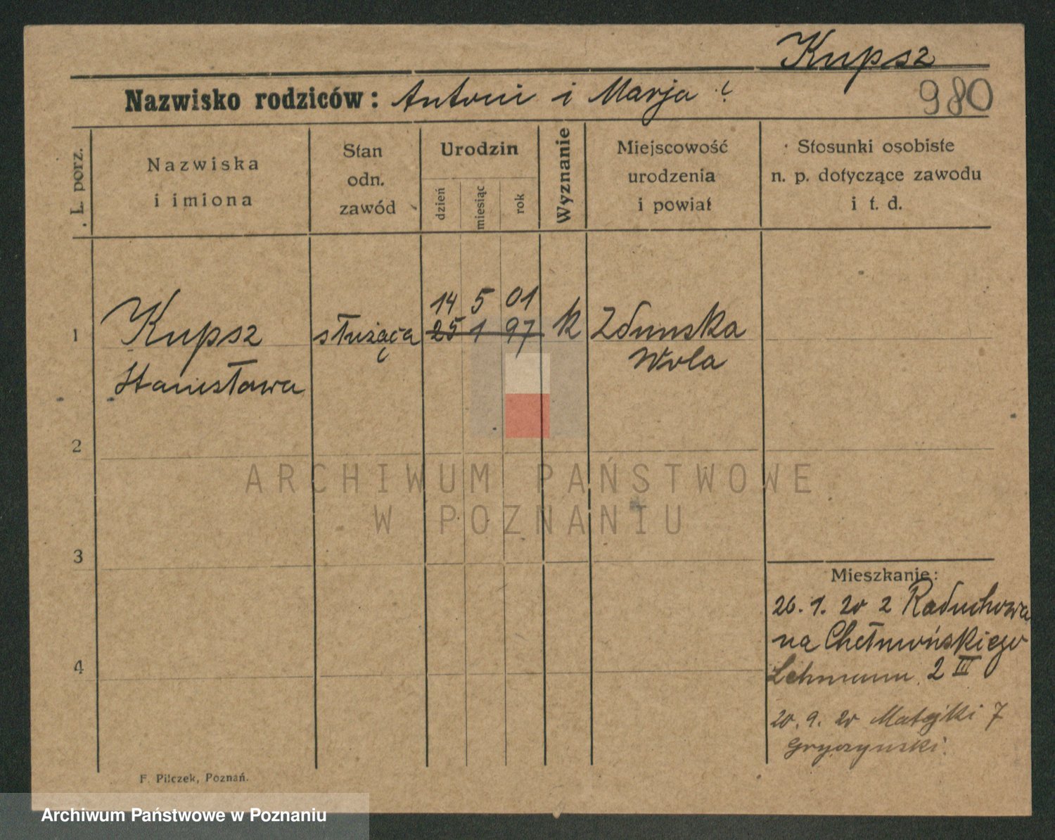 Podgląd karty osobowej dostępny jest po kliknięciu na nazwisko lub ikonkę karty. Można dokonywać powiększenia (ikony na górze) lub przechodzić między kolejnymi skanami (strzałki po bokach).