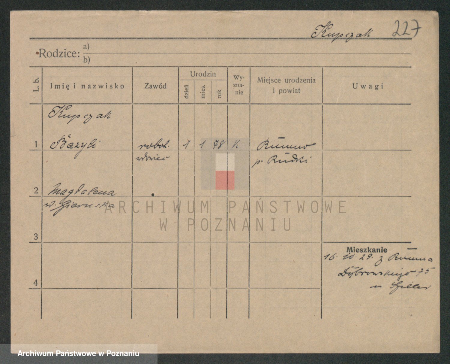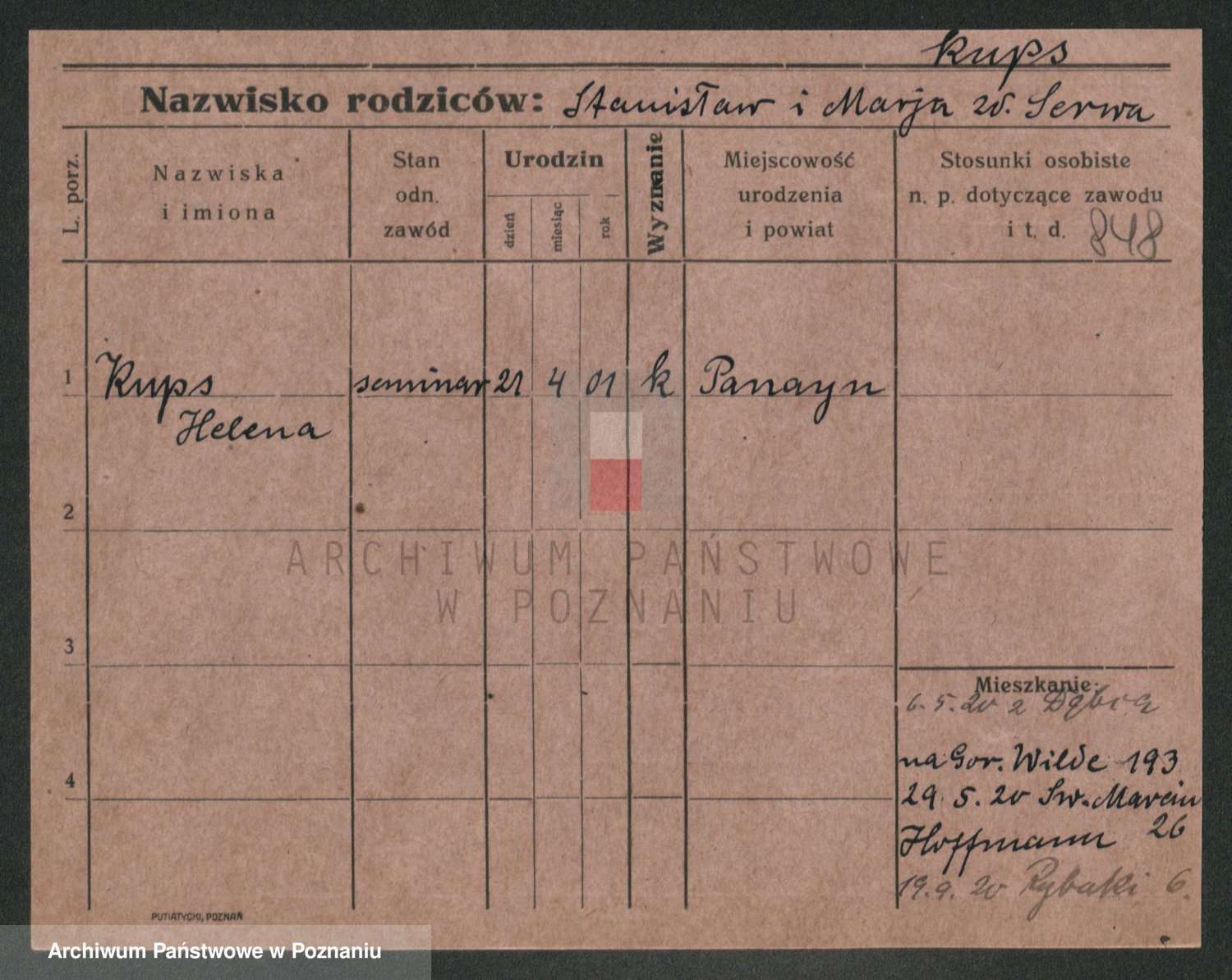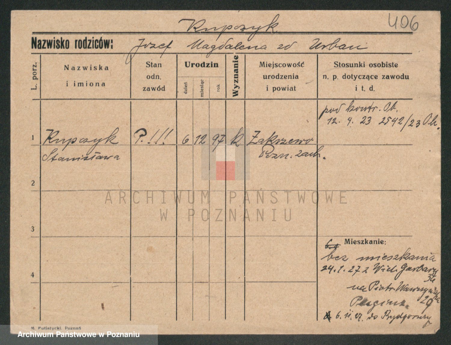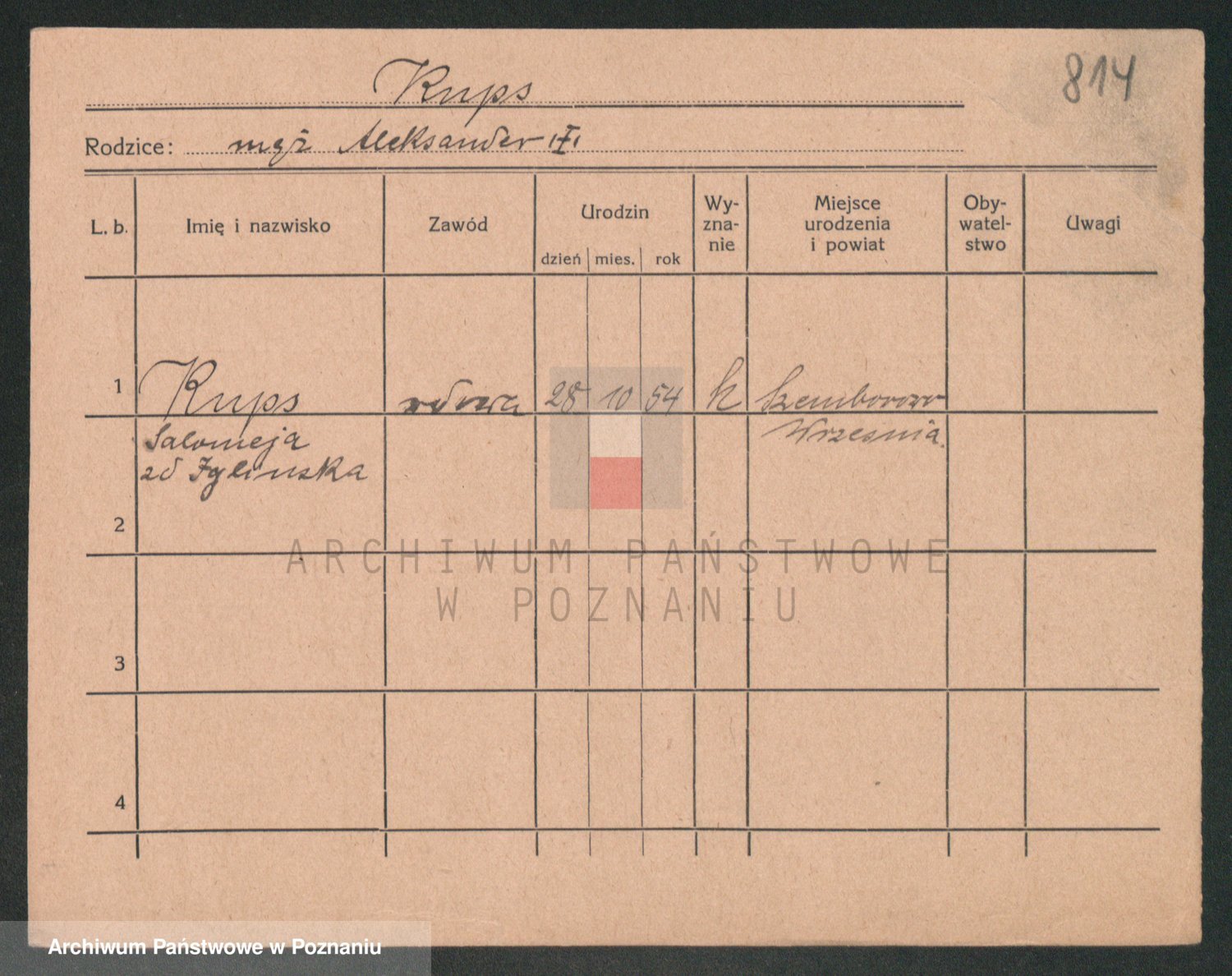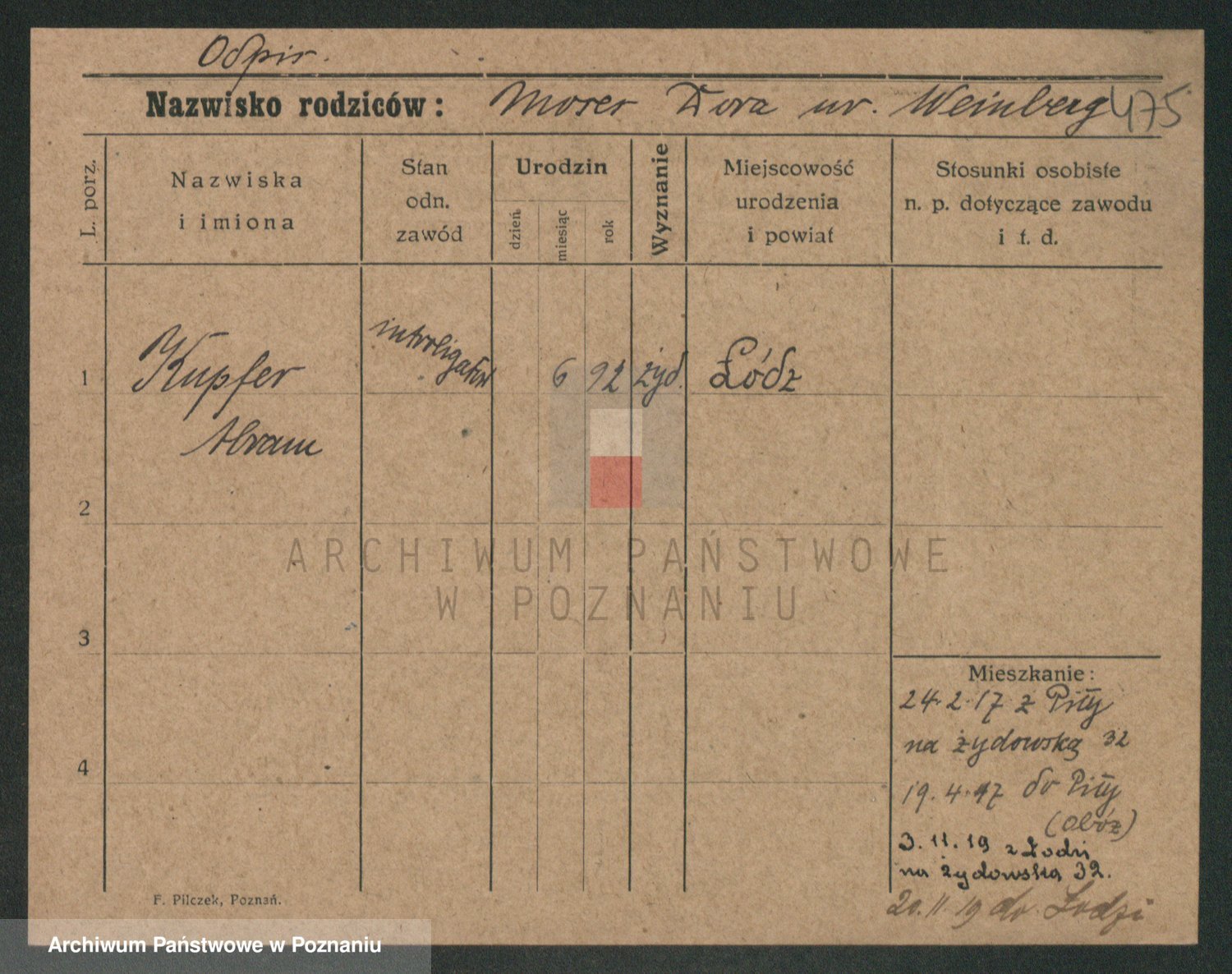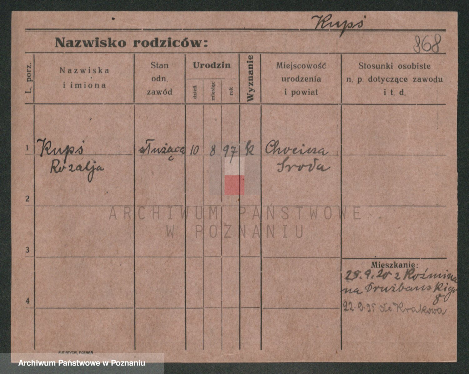 Podgląd karty osobowej dostępny jest po kliknięciu na nazwisko lub ikonkę karty. Można dokonywać powiększenia (ikony na górze) lub przechodzić między kolejnymi skanami (strzałki po bokach).