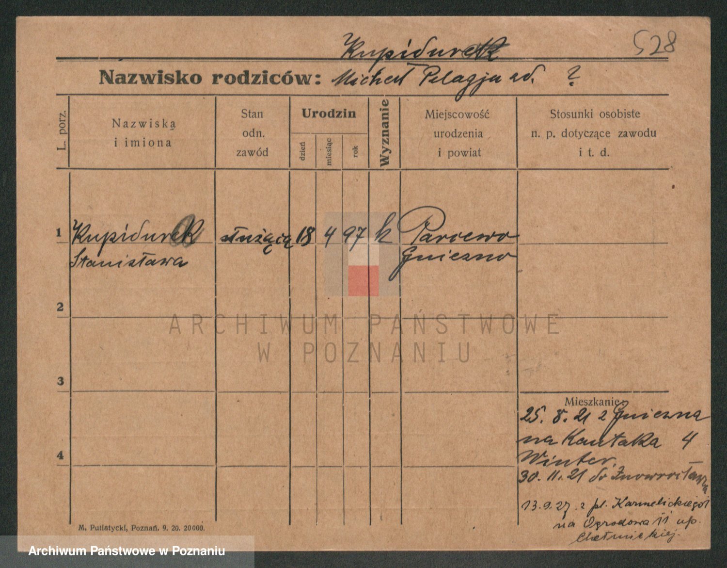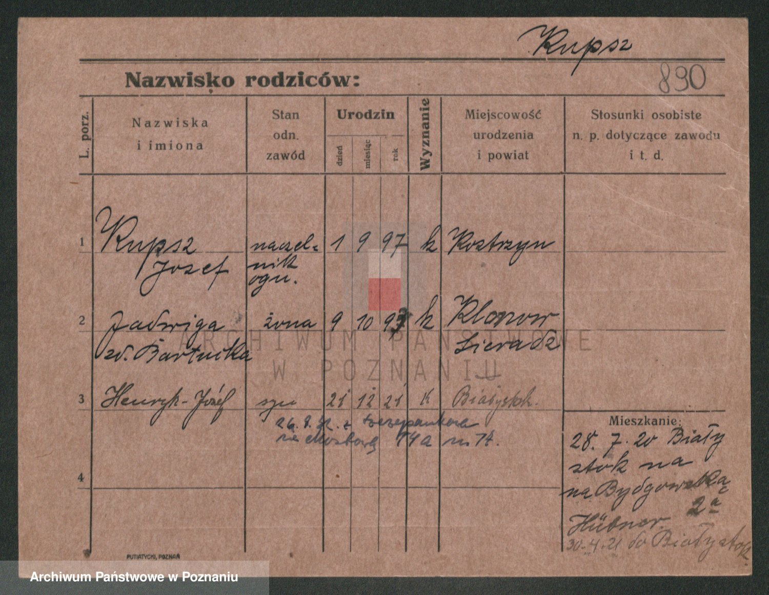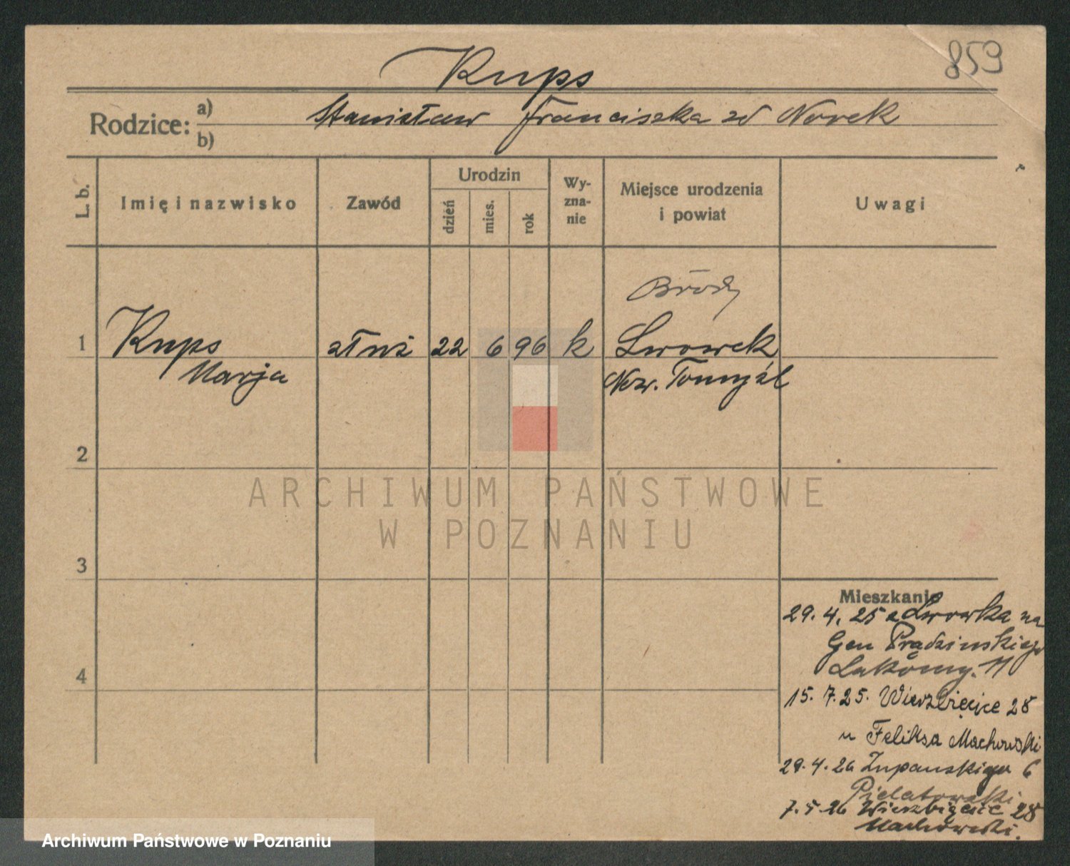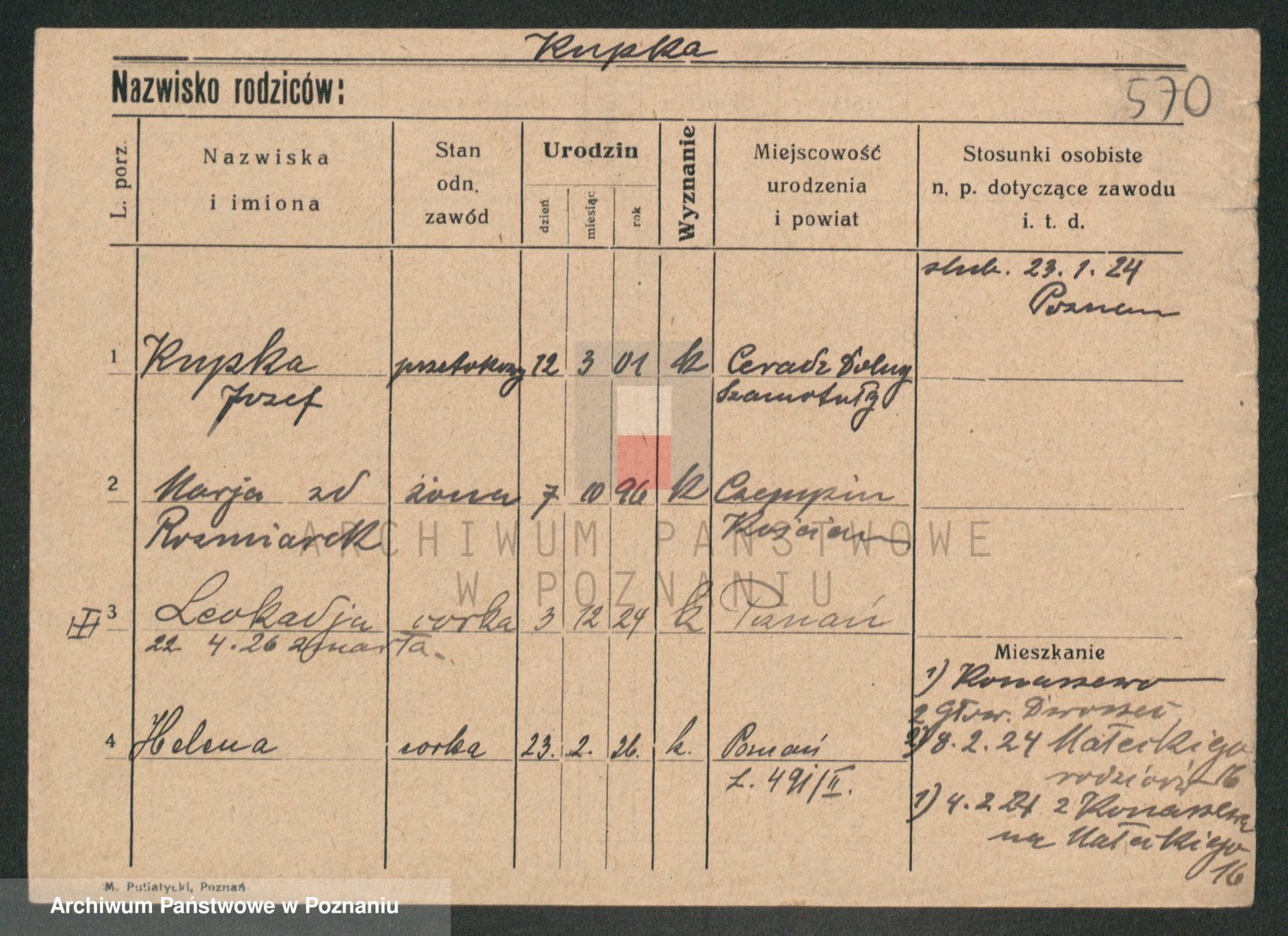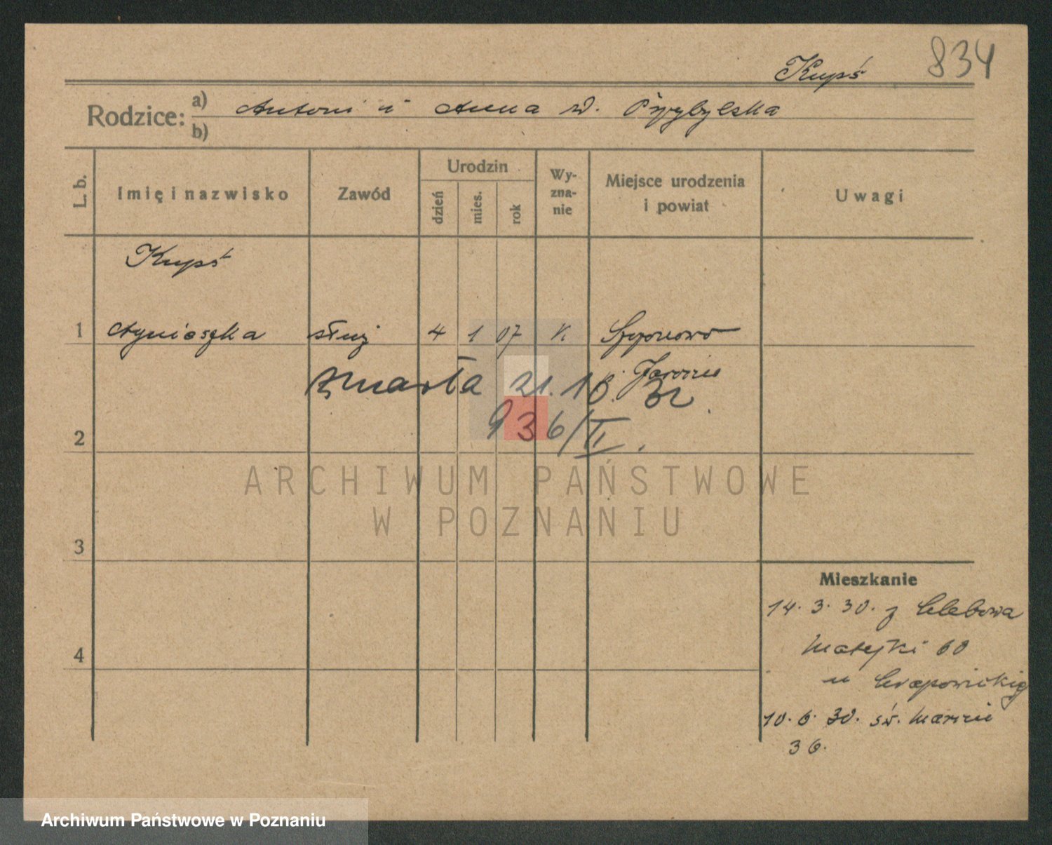 Podgląd karty osobowej dostępny jest po kliknięciu na nazwisko lub ikonkę karty. Można dokonywać powiększenia (ikony na górze) lub przechodzić między kolejnymi skanami (strzałki po bokach).