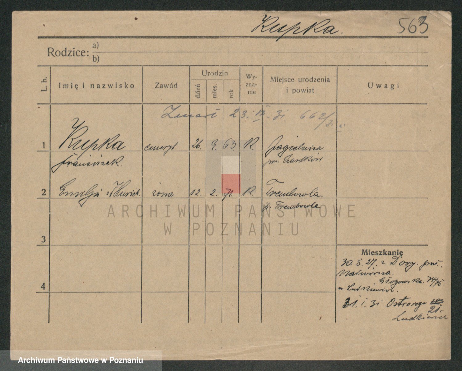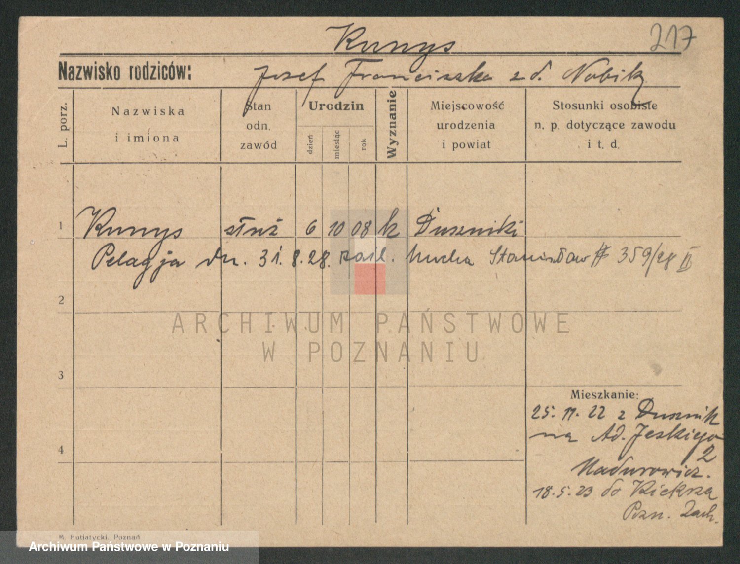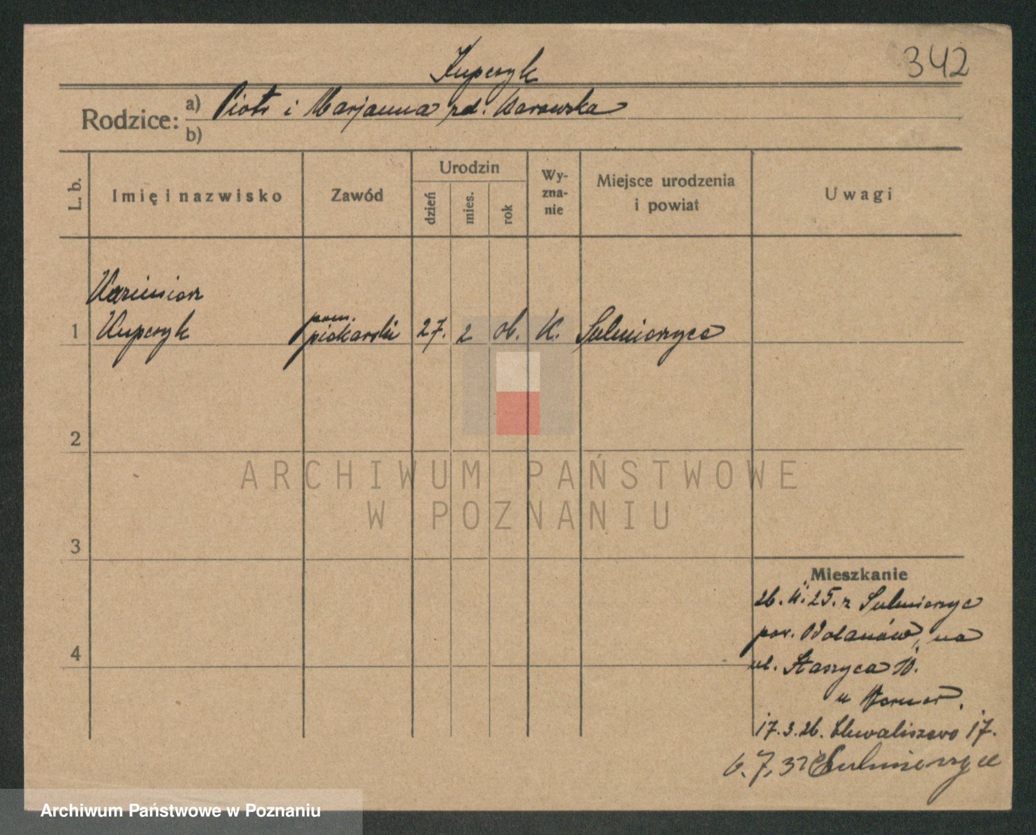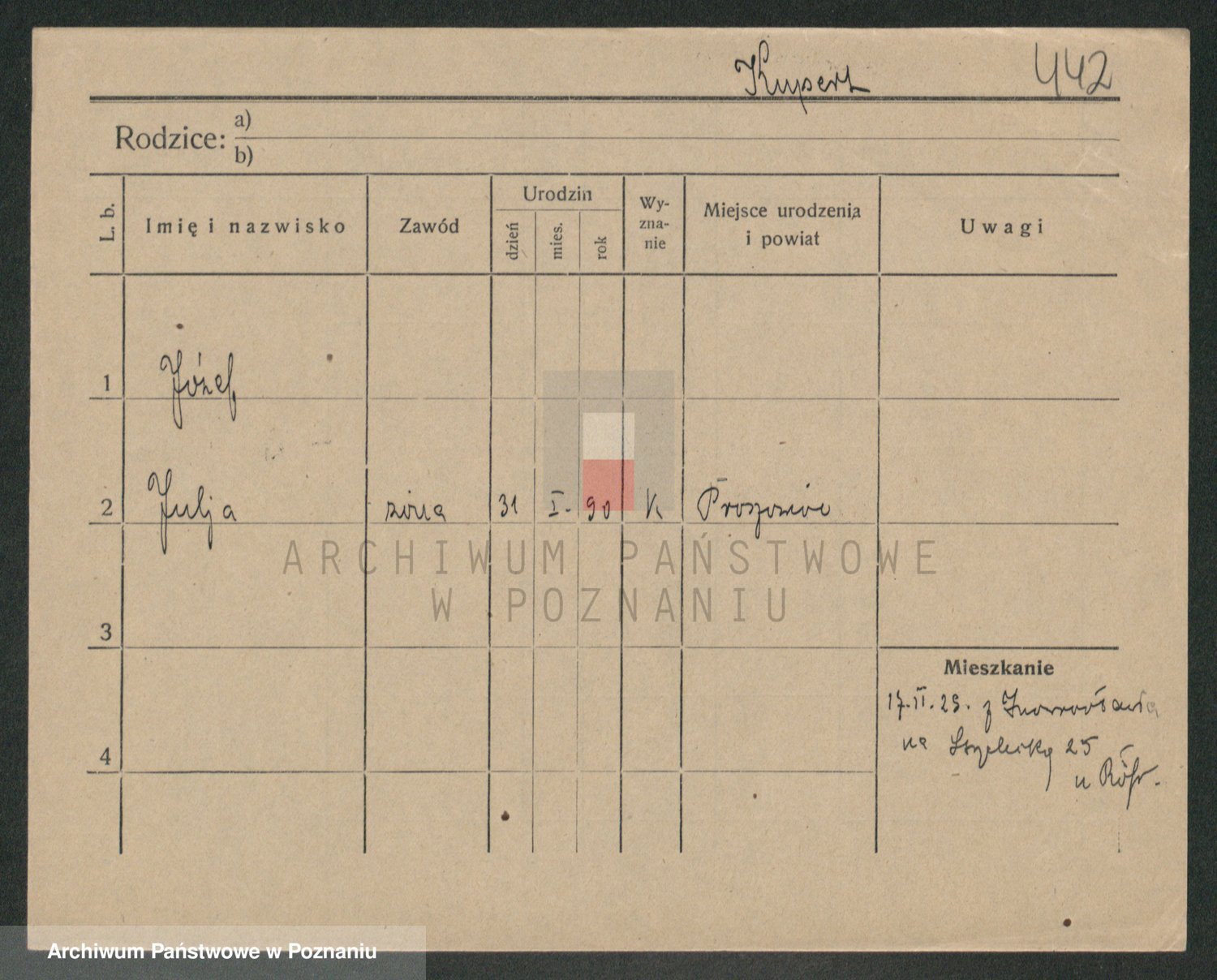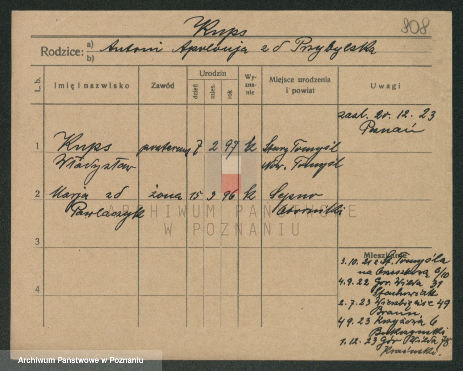 Podgląd karty osobowej dostępny jest po kliknięciu na nazwisko lub ikonkę karty. Można dokonywać powiększenia (ikony na górze) lub przechodzić między kolejnymi skanami (strzałki po bokach).