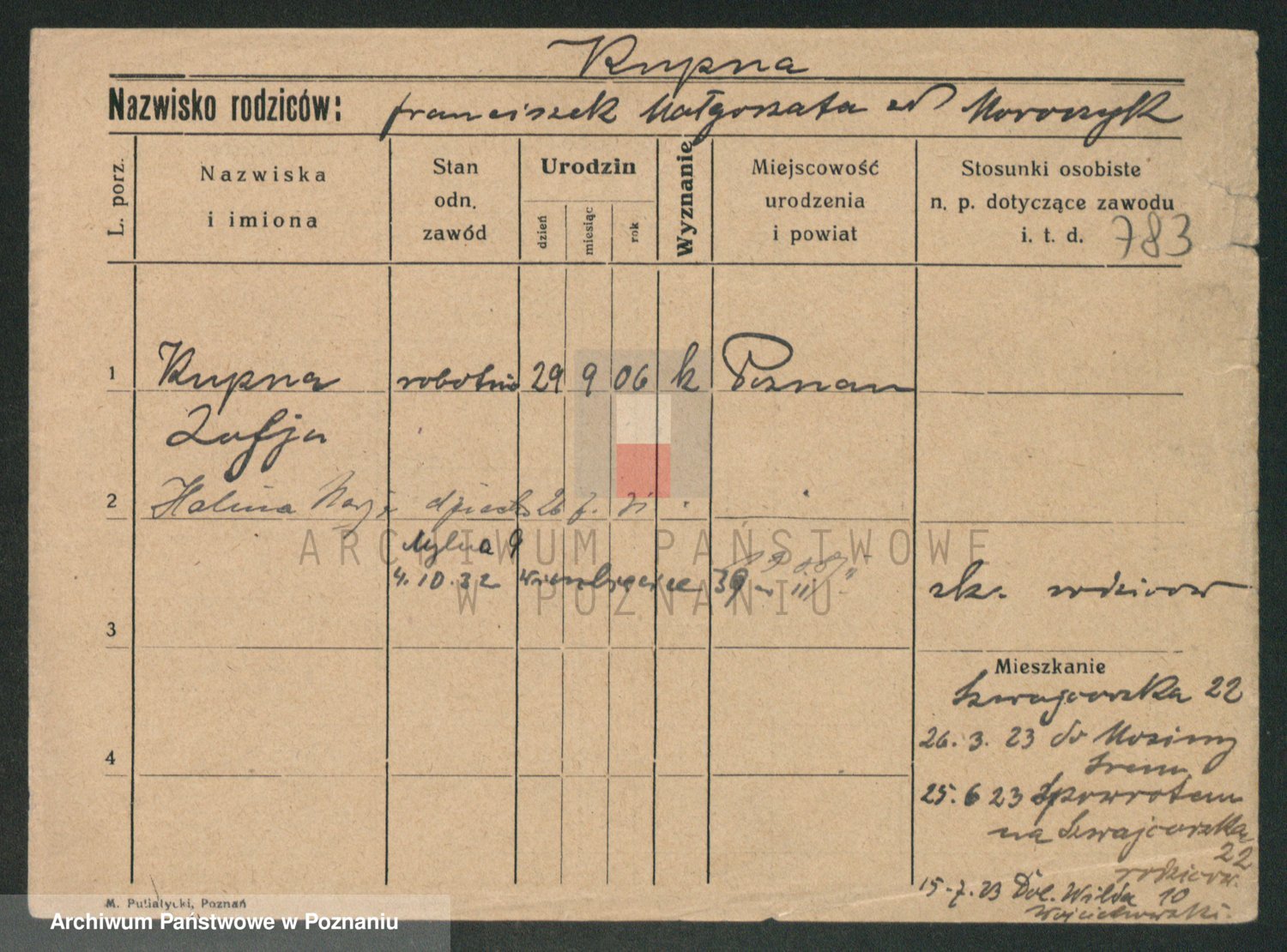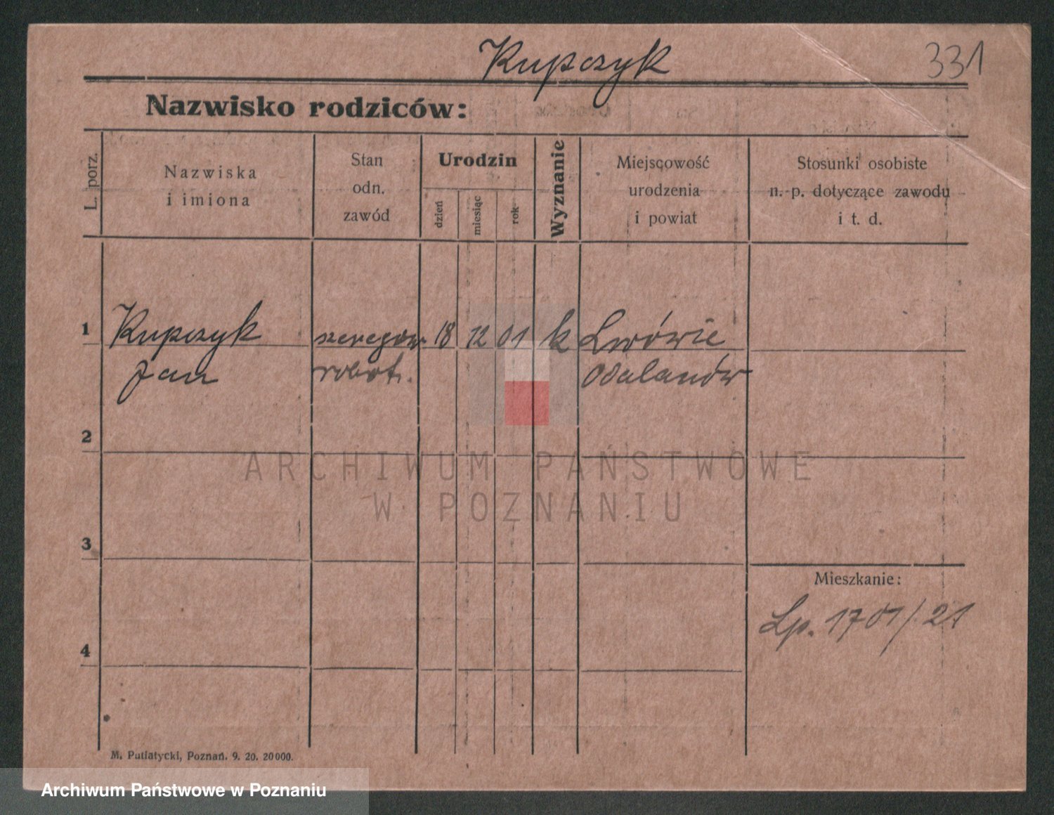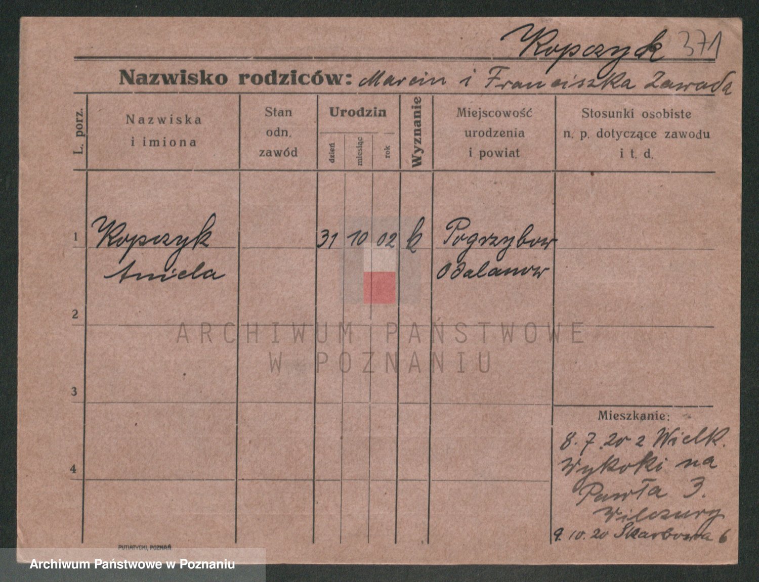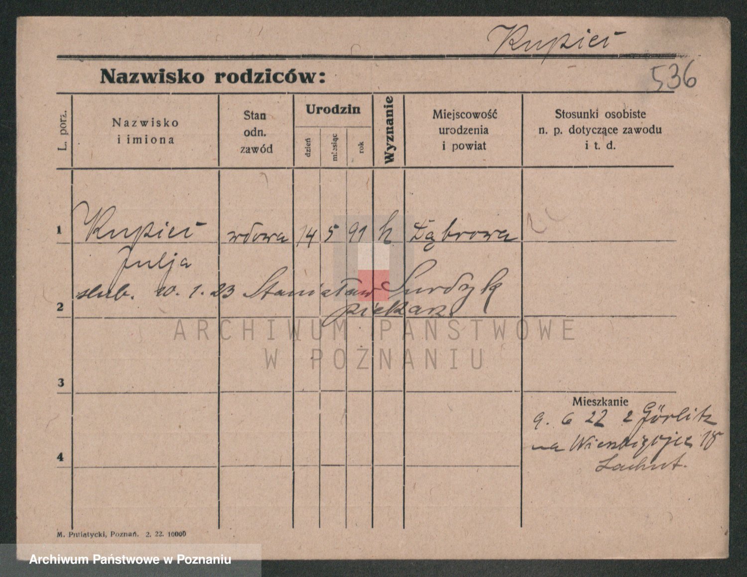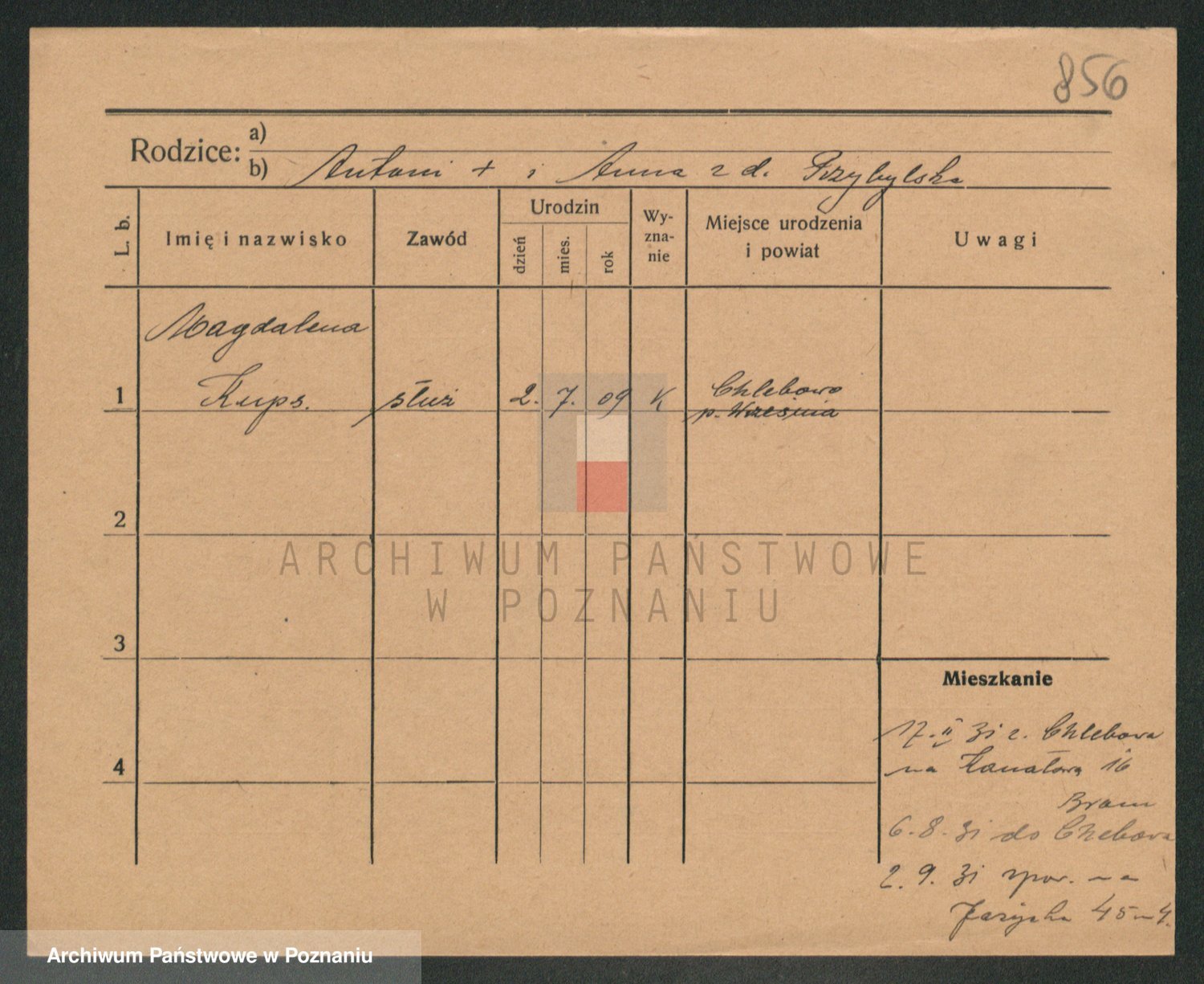 Podgląd karty osobowej dostępny jest po kliknięciu na nazwisko lub ikonkę karty. Można dokonywać powiększenia (ikony na górze) lub przechodzić między kolejnymi skanami (strzałki po bokach).