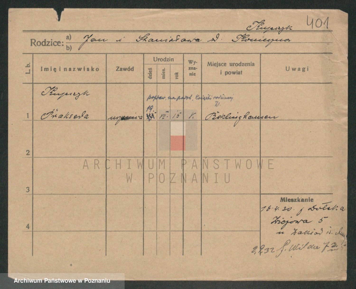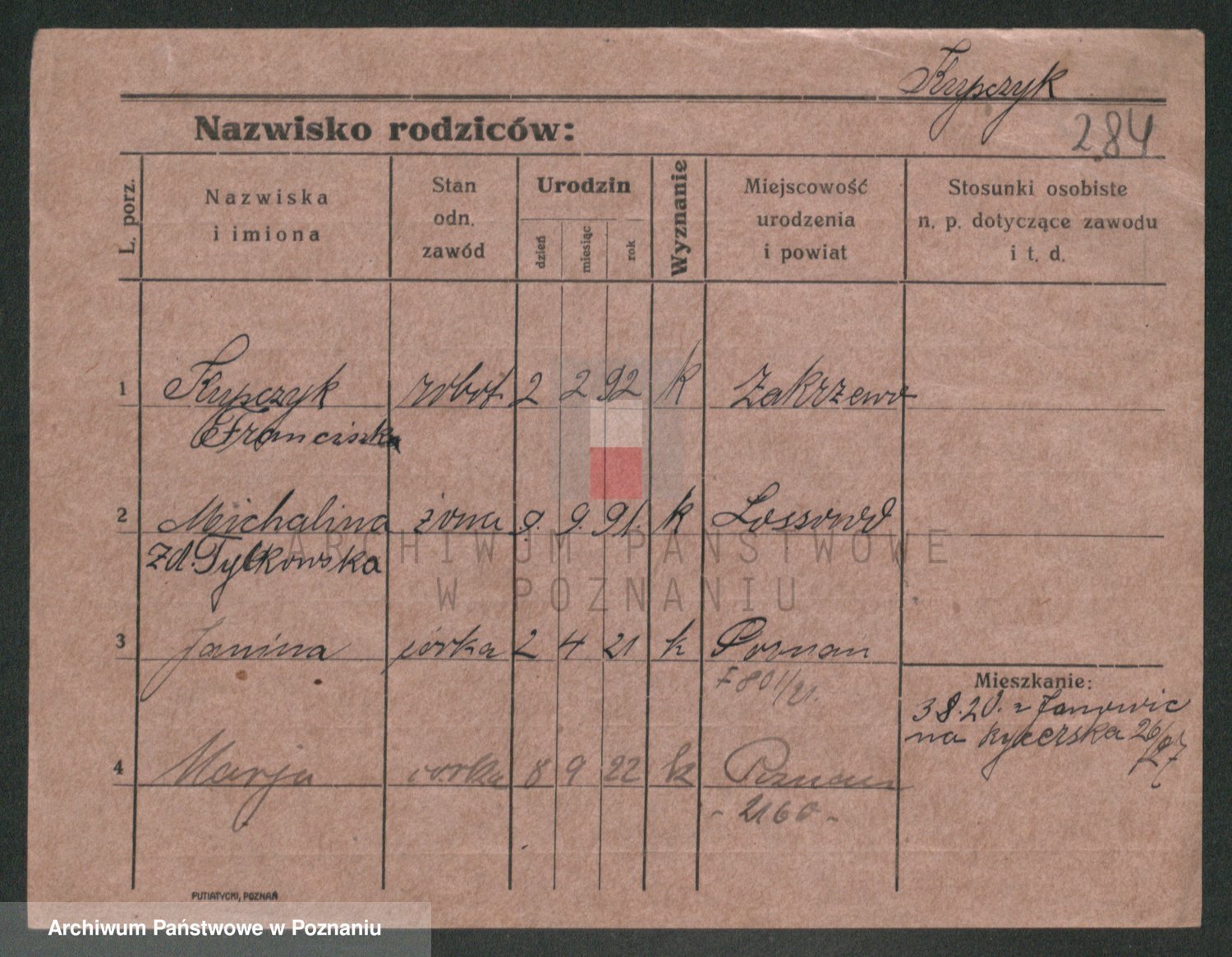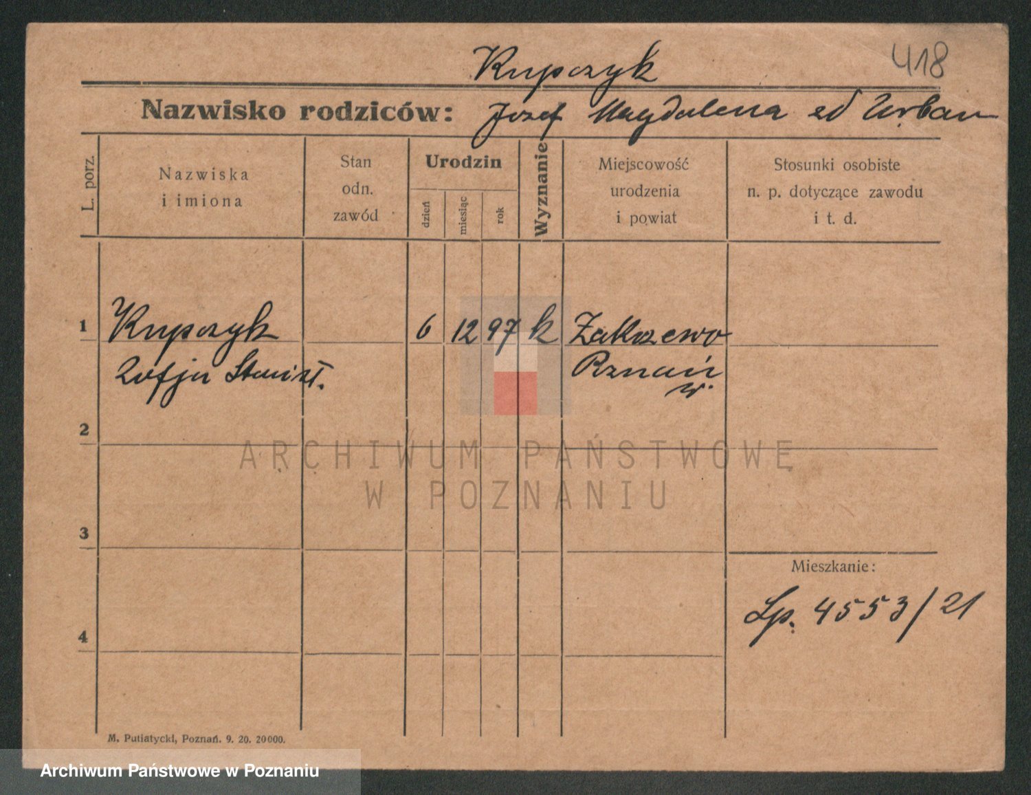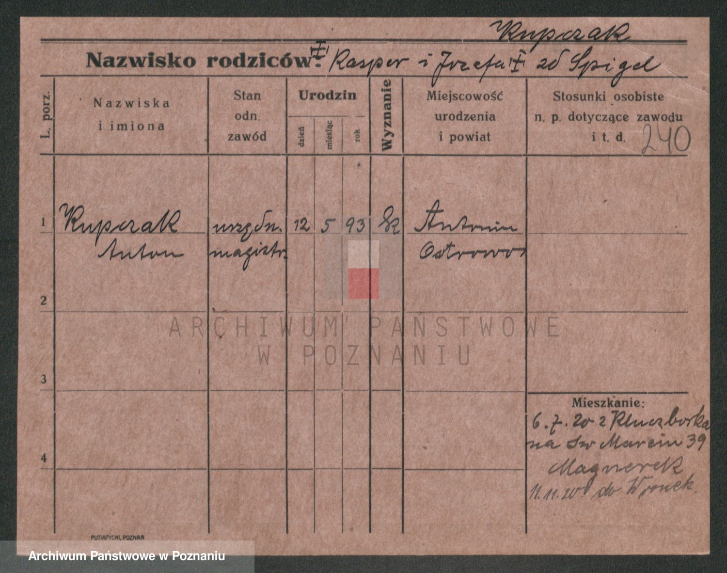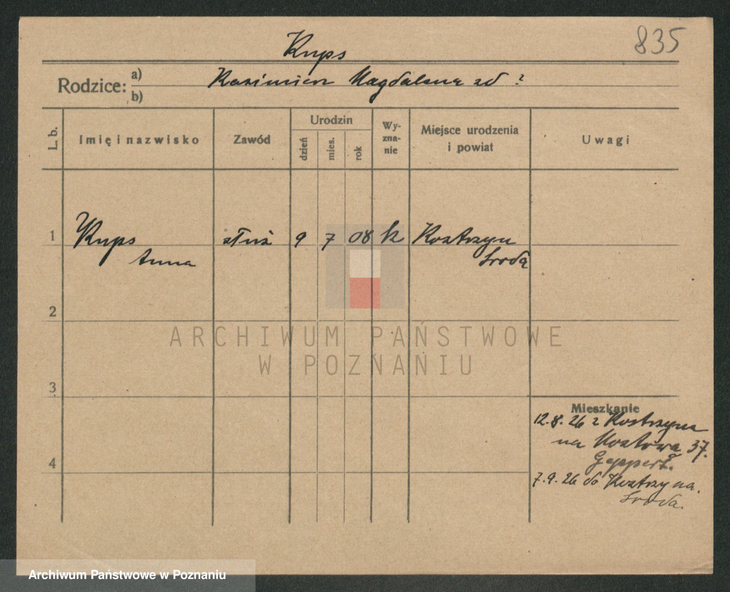 Podgląd karty osobowej dostępny jest po kliknięciu na nazwisko lub ikonkę karty. Można dokonywać powiększenia (ikony na górze) lub przechodzić między kolejnymi skanami (strzałki po bokach).