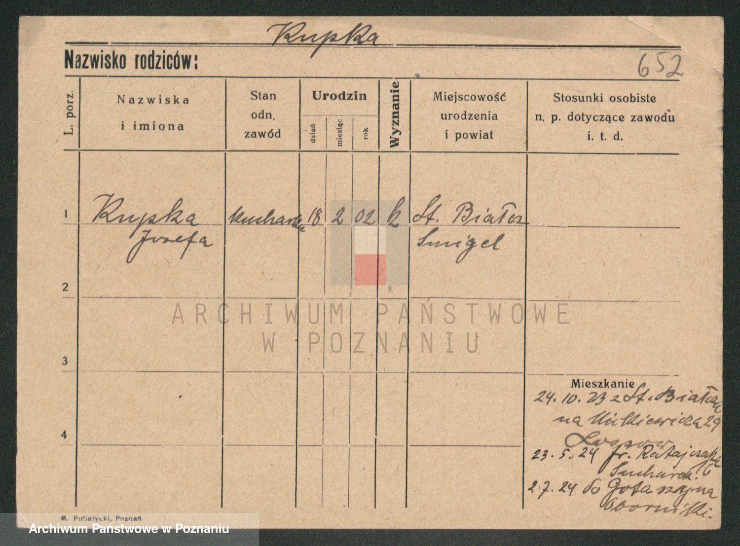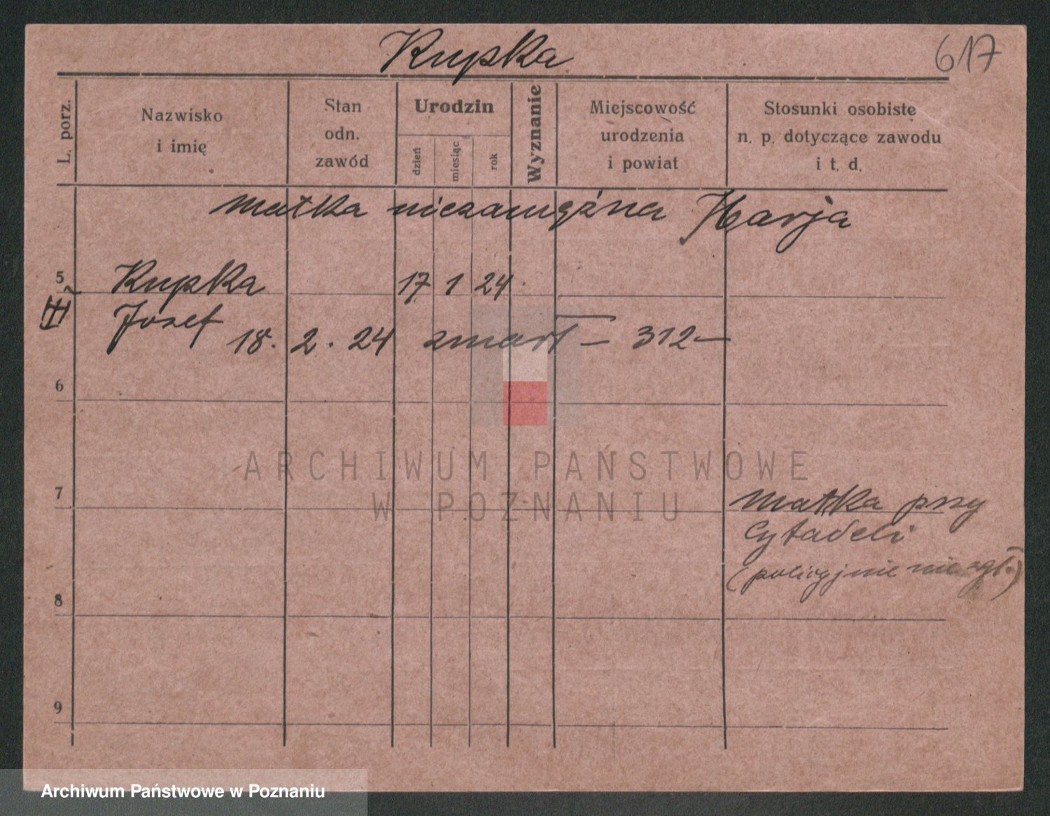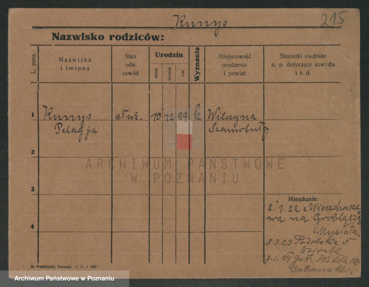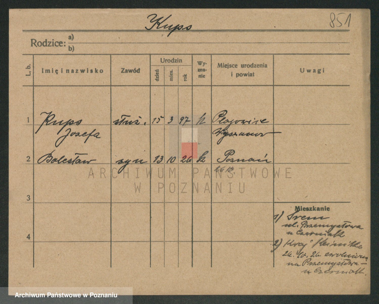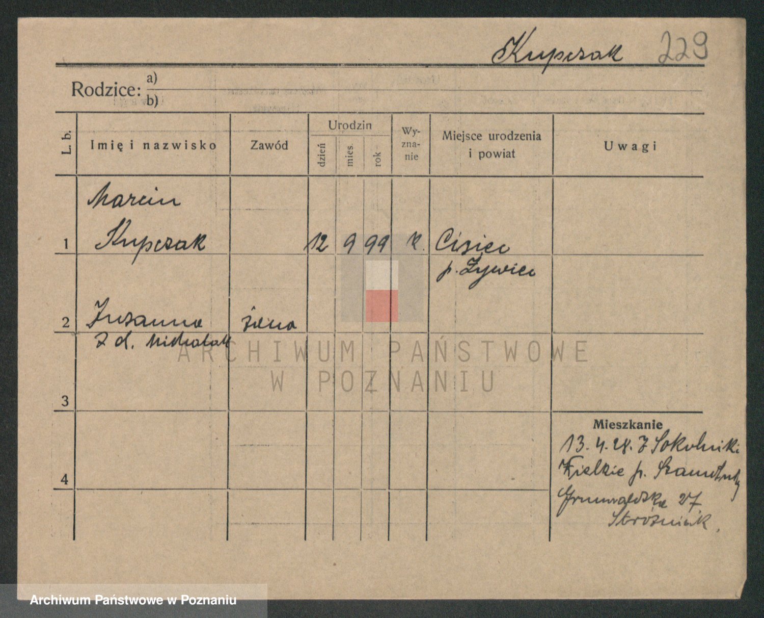 Podgląd karty osobowej dostępny jest po kliknięciu na nazwisko lub ikonkę karty. Można dokonywać powiększenia (ikony na górze) lub przechodzić między kolejnymi skanami (strzałki po bokach).